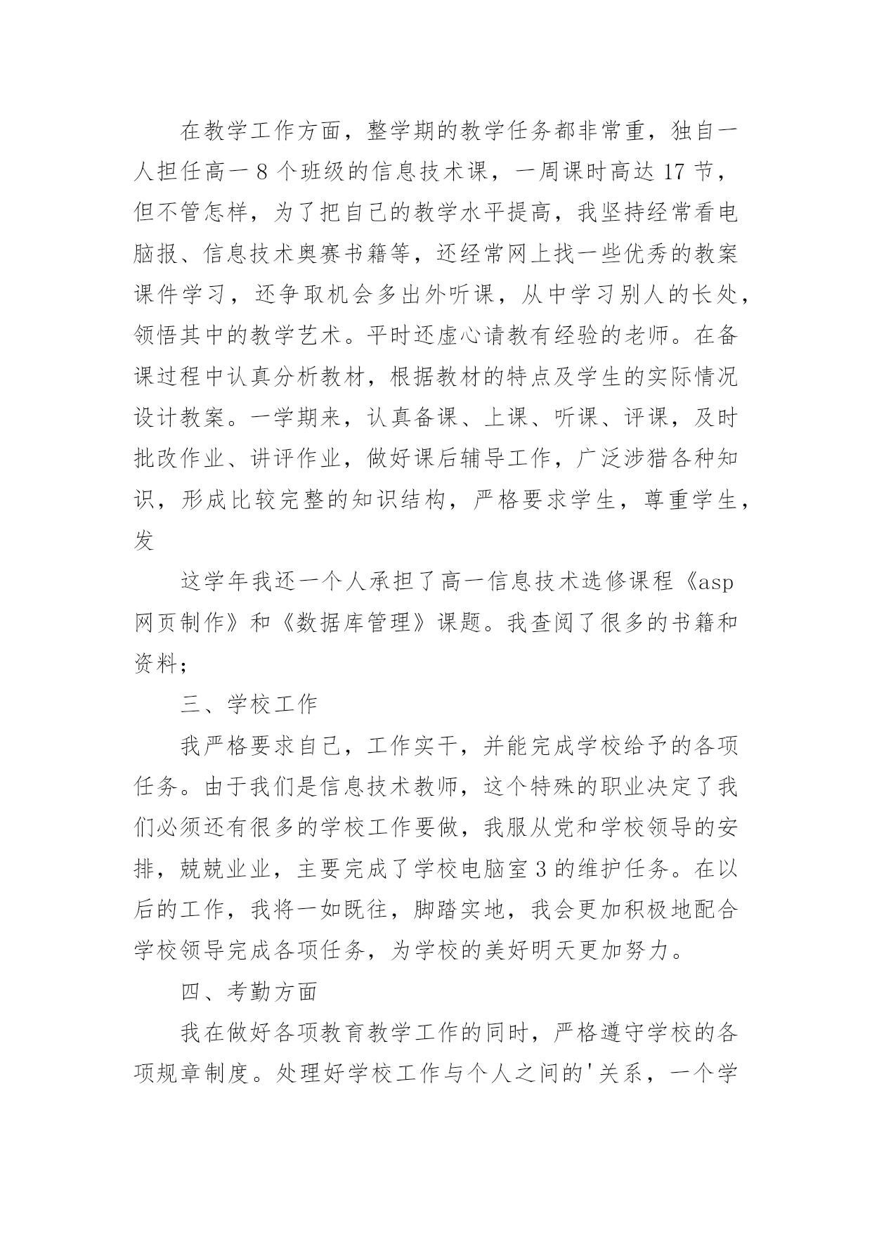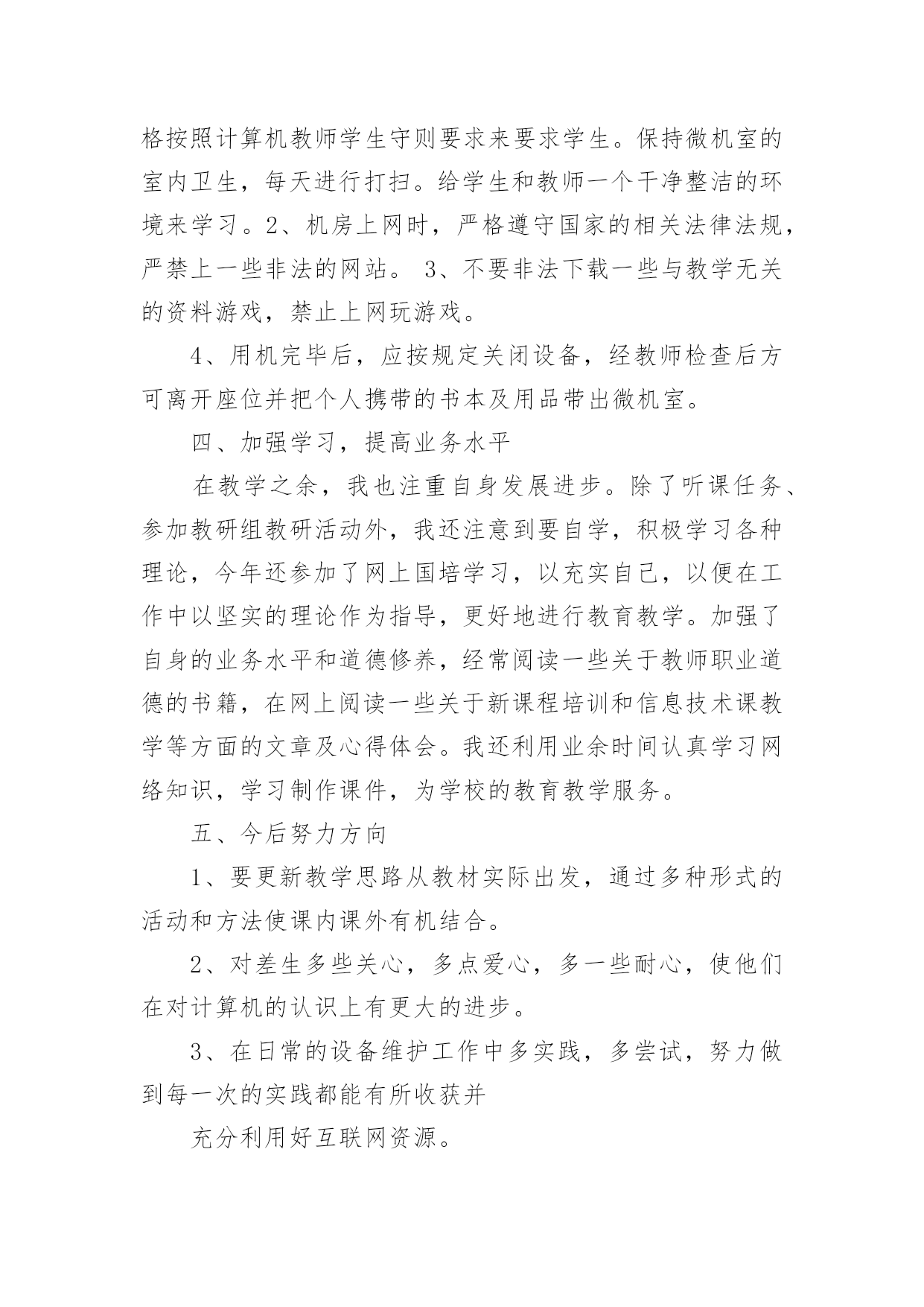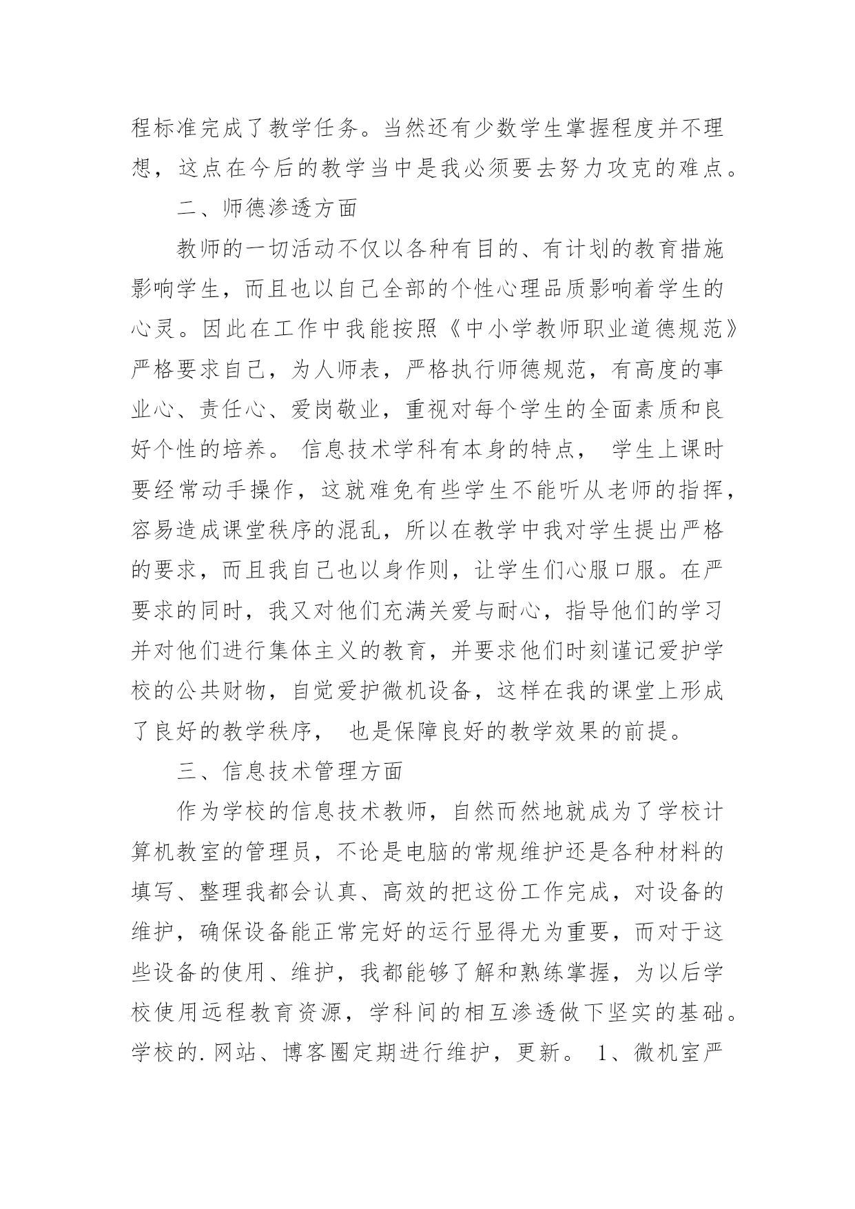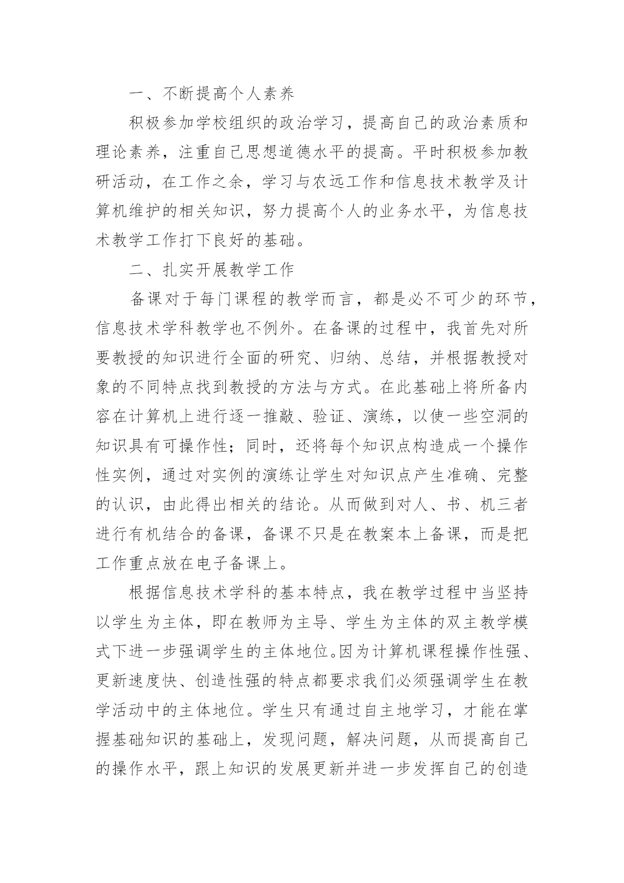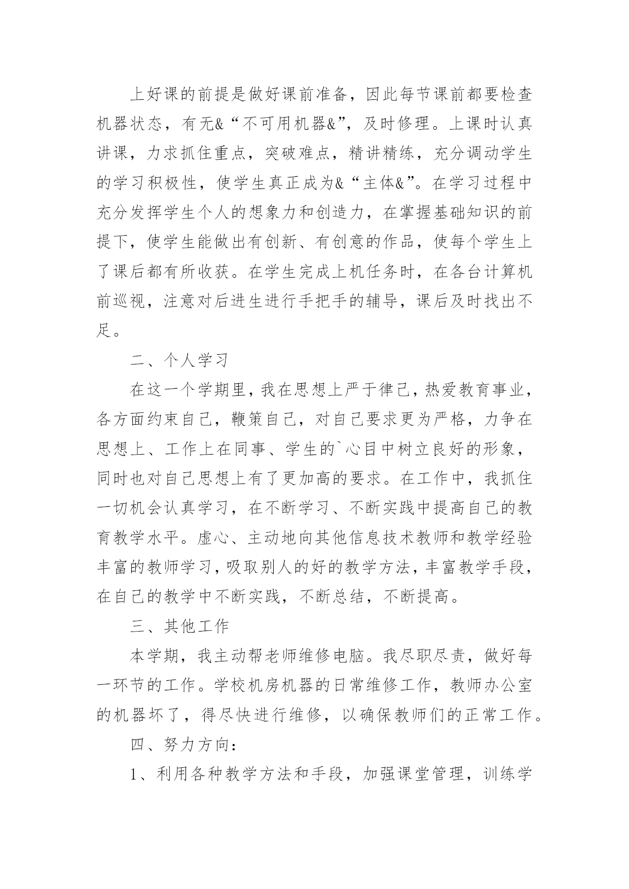信息技术教学工作总结信息技术教学工作总结模板合集10篇总结是把一定阶段内的有关情况分析研究,做出有指导性结论的书面材料,它能够给人努力工作的动力,快快来写一份总结吧。总结怎么写才不会千篇一律呢?下面是小编精心整理的信息技术教学工作总结10篇,欢迎阅读,希望大家能够喜欢。信息技术教学工作总结篇1一、思想认识我在思想上严于律己,热爱党的教育事业,全面贯彻党的教育方针,以党员的要求严格要求自己,鞭策自己,力争思想上和工作上在同事、学生的心目中都树立起榜样的作用。积极参加学校组织的各项政治活动,如学校的党员冬训活动。一学期来,我服从学校的工作安排,配合领导和老师们做好校内外的各项工作。我相信在以后的工作学习中,我会在党组织的关怀下,在同事们的帮助下,通过自己的努力,克服缺点,取得更大的进步。新学期即将来临,我将更加努力工作,勤学苦练,使自己真正成为一个经受得起任何考验的人民教师。二、教学工作在教学工作方面,整学期的教学任务都非常重,独自一人担任高一8个班级的信息技术课,一周课时高达17节,但不管怎样,为了把自己的教学水平提高,我坚持经常看电脑报、信息技术奥赛书籍等,还经常网上找一些优秀的教案课件学习,还争取机会多出外听课,从中学习别人的长处,领悟其中的教学艺术。平时还虚心请教有经验的老师。在备课过程中认真分析教材,根据教材的特点及学生的实际情况设计教案。一学期来,认真备课、上课、听课、评课,及时批改作业、讲评作业,做好课后辅导工作,广泛涉猎各种知识,形成比较完整的知识结构,严格要求学生,尊重学生,发这学年我还一个人承担了高一信息技术选修课程《asp网页制作》和《数据库管理》课题。我查阅了很多的书籍和资料;三、学校工作我严格要求自己,工作实干,并能完成学校给予的各项任务。由于我们是信息技术教师,这个特殊的职业决定了我们必须还有很多的学校工作要做,我服从党和学校领导的安排,兢兢业业,主要完成了学校电脑室3的维护任务。在以后的工作,我将一如既往,脚踏实地,我会更加积极地配合学校领导完成各项任务,为学校的美好明天更加努力。四、考勤方面我在做好各项教育教学工作的同时,严格遵守学校的各项规章制度。处理好学校工作与个人之间的'关系,一个学年里没有缺席过一次,一边完成学校的各项任务,一边准备教材和学习自己的专业知识。在新学期中,我将更加勤恳,为学校作更多的事,自己更加努力学习专业知识,使自己的业务水平更上一层楼。五、主要成绩在这一学期里,成功的完成高一信息技术这门科目的会考教书育人是塑造灵魂的综合性艺术。在课程改革推进的今天,社会对教师的素质要求更高,在今后的教育教学工作中,我将立足实际,认真分析和研究好教材、大纲,研究好学生,争取学校领导、师生的支持,创造性地搞好信息技术课的教学,使我们的工作有所开拓,有所进取,更加严格要求自己,努力工作,发扬优点,改正缺点,开拓前进,为美好的明天奉献自己的力量。信息技术教学工作总结篇2本学期我担任高X年级信息技术教学工作。现阶段信息技术课的教学目标是主要培养学生掌握计算机操作技能,着眼于使学生掌握信息科学、信息技术的基本知识,注重培养学生信息采集、加工、发布等信息处理的基本技能,促进和提高学生主动利用信息技术和信息资源解决实际问题的能力,并用于学习和生活,当然最重要的还在于高中的信息技术学业水平测试,完成相关的教学任务及教学要求。本学期教学内容包括信息技术基储办公软件的操作。一、不断提高个人素养积极参加学校组织的政治学习,提高自己的政治素质和理论素养,注重自己思想道德水平的提高。平时积极参加教研活动,在工作之余,学习与农远工作和信息技术教学及计算机维护的相关知识,努力提高个人的业务水平,为信息技术教学工作打下良好的基础。二、扎实开展教学工作备课对于每门课程的教学而言,都是必不可少的环节,信息技术学科教学也不例外。在备课的过程中,我首先对所要教授的知识进行全面的研究、归纳、总结,并根据教授对象的不同特点找到教授的方法与方式。在此基础上将所备内容在计算机上进行逐一推敲、验证、演练,以使一些空洞的知识具有可操作性;同时,还将每个知识点构造成一个操作性实例,通过对实例的演练让学生对知识点产生准确、完整的认识,由此得出相关的结论。从而做到对人、书、机三者进行有机结合的备课,备课不只是在教案本上备课,而是把工作重点放在电子备课上。根据信息技术学科的基本特点,我在教学过程中当坚持以学生为主体,即在教师为主导、学生为主体的双主教学模式下进一步强调学生的主体地位。因为计算机课程操作性强、更新速度快、创造性强的特点都要求我们必须强调学生在教学活动中的主体地位。学生只有通过自主地学习,才能在掌握基础知识的基础上,发现问题,解决问题,从而提高自己的操作水平,跟上知识的发展更新并进一步发挥自己的创造力。如果单纯地依靠老师的教授,他们所