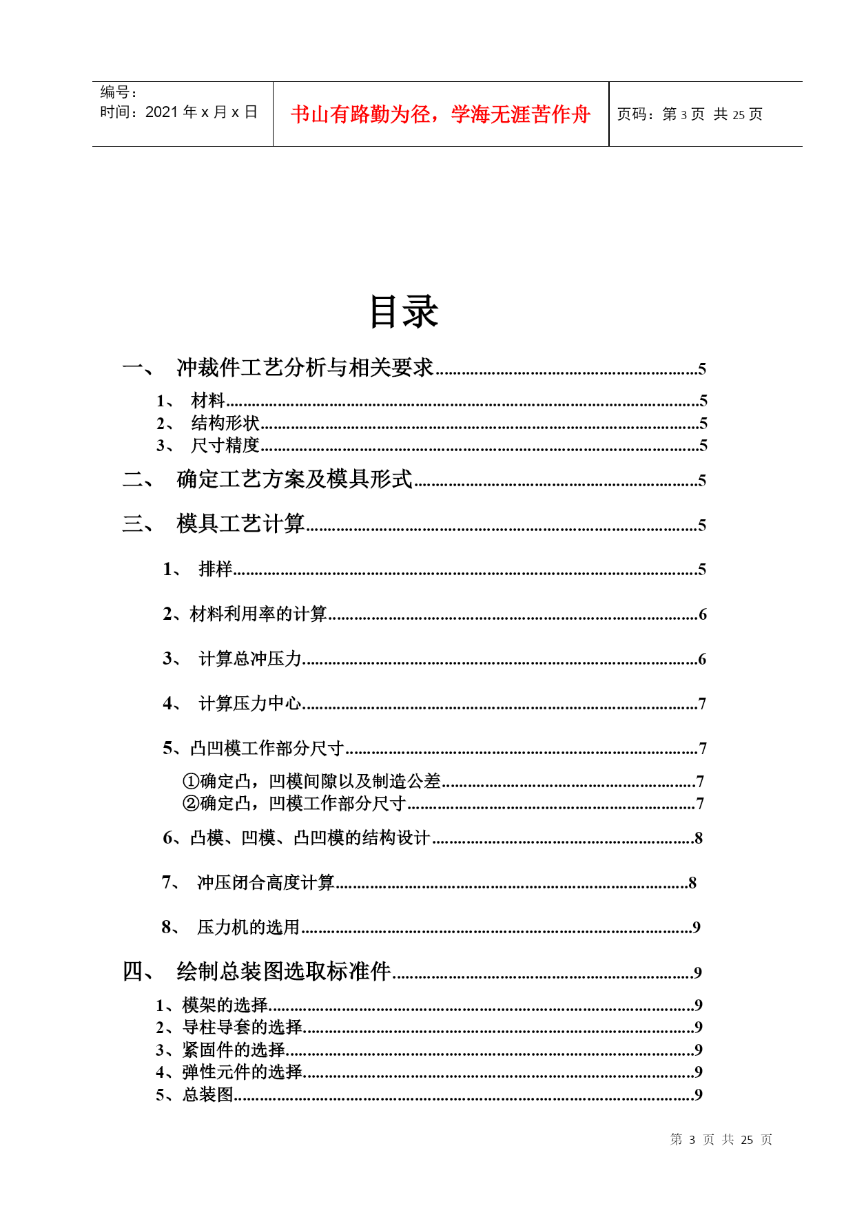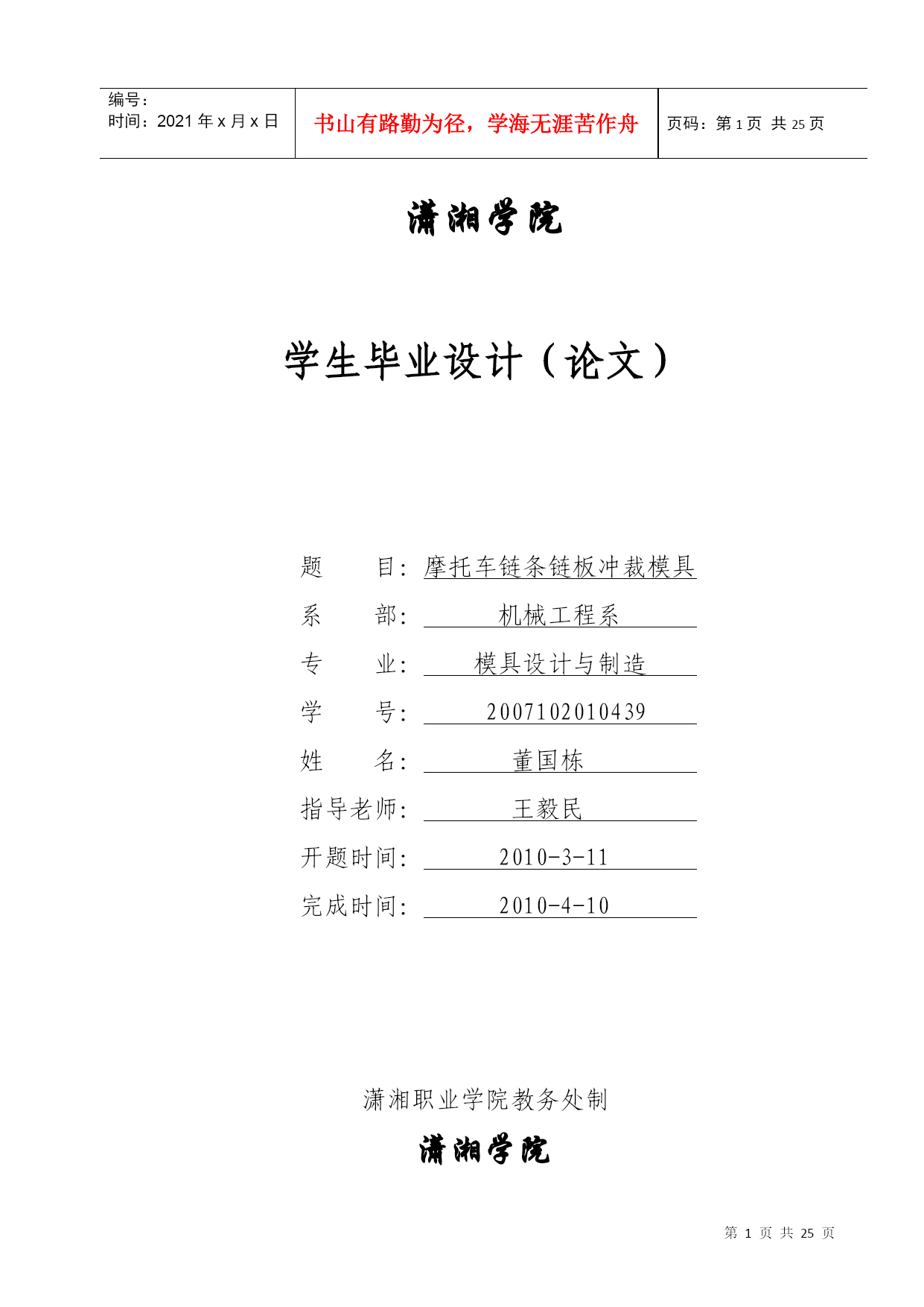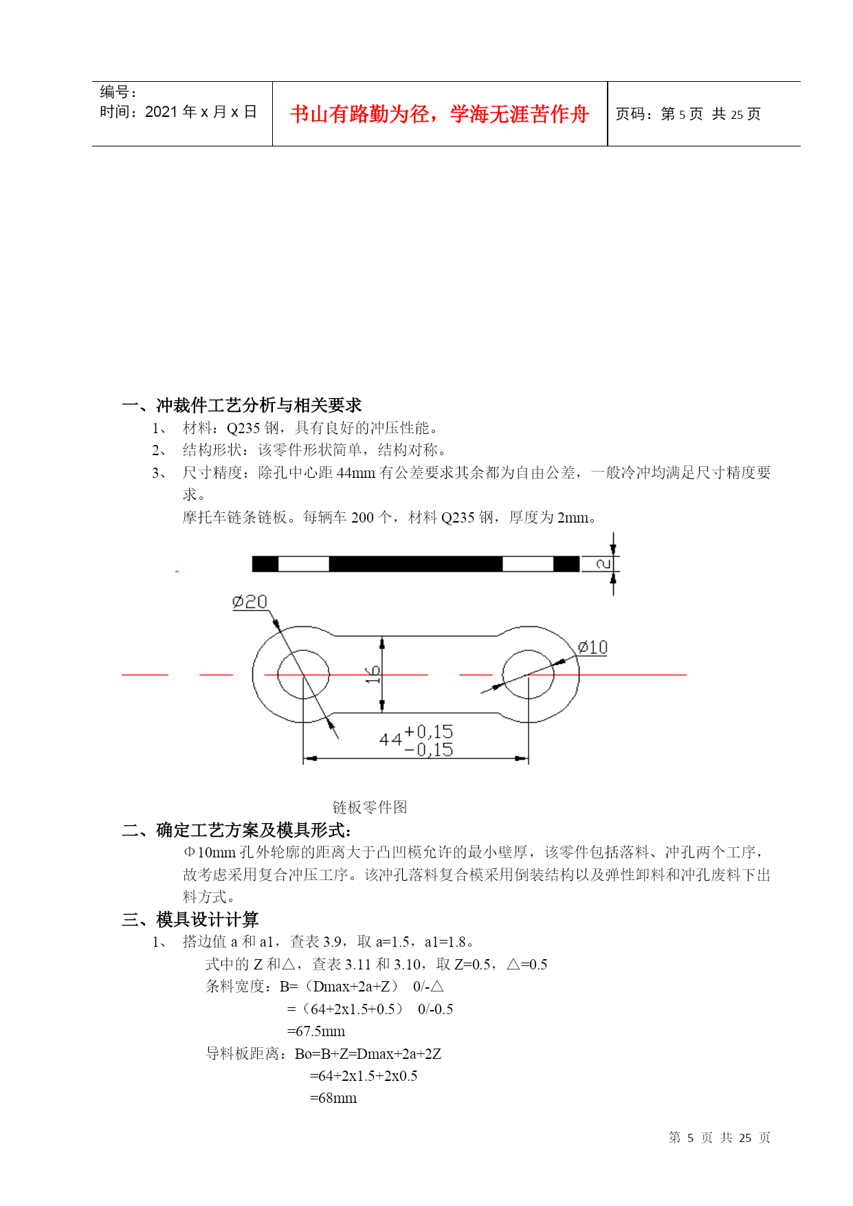 编号:时间:2021年x月x日书山有路勤为径,学海无涯苦作舟页码:第PAGE25页共NUMPAGES25页第PAGE\*MERGEFORMAT25页共NUMPAGES\*MERGEFORMAT25页潇湘学院学生毕业设计(论文)题目:摩托车链条链板冲裁模具系部:机械工程系专业:模具设计与制造学号:2007102010439姓名:董国栋指导老师:王毅民开题时间:2010-3-11完成时间:2010-4-10潇湘职业学院教务处制潇湘学院内容摘要摘要:本文对盖板冲压工艺对材料的技术要求和冲压件工艺结构进行了分析,确定了冲压件的工艺方案及模具形式。而且对盖板复合冲裁模进行了相关数据的分析与计算,根据分析结果选冲压件复合冲裁模具工艺,从而确定盖板复合冲裁模设计思路及方案,还对盖板冲裁模具的其它各方面的设计,最后在设计过程中运用Pro/E、AutoCAD软件进行冷冲压冲裁模结构设计与计算并绘制出模具总装图以及部分非标准零件图形。从而得出完整的理论设计结果,为今后工程设计打下了基础。关键词:穿线板复合冲裁模,冷冲压冲裁模,设计,凸模,凹模。ContentssummaryTakeofftowant:Thistexttothetechniquerequestthatwearsthelineplanktohurtletopressacrafttothematerialwithhurtledtopressacraftstructuretocarryonanalysis,makesuretohurtlethecraftprojectandmoldingtoolformofpressthepiece.Andtotheanalysisandcalculationthatworethelineplankcompoundtohurtletocutamoldtocarryonarelateddata,choosetohurtletopressacompoundtohurtletocutthemoldingtoolcraftaccordingtotheanalysisresult,makesurethuswearingthelineplankcompoundhurtlestocutthemolddesignwayofthinkingandproject,returningtothedesignthatwearsthelineplanktohurtleothereveryone'snoodlesofcutthemoldingtool,endtheusagePro/E,thesoftwareofAutoCADcarriesonduringtheperiodofdesigncoldhurtletopresstohurtletocutthemoldstructuredesignandcalculationtodrawamoldingtooltoalwayspacknot-standardsparepartssketchofthediagramandpartalso.Getthetheoriesdesignresultoftheintegritythus,willbeattodescendfoundationfromnowonfortheengineeringdesign.Keyword:Wearthelineplankcompoundhurtlestocutamold,coldhurtletopresstohurtletocutamold,design,convexmold,cavemold目录一、冲裁件工艺分析与相关要求.............................................................51、材料..............................................................................................................52、结构形状......................................................................................................53、尺寸精度......................................................................................................5二、确定工艺方案及模具形式............