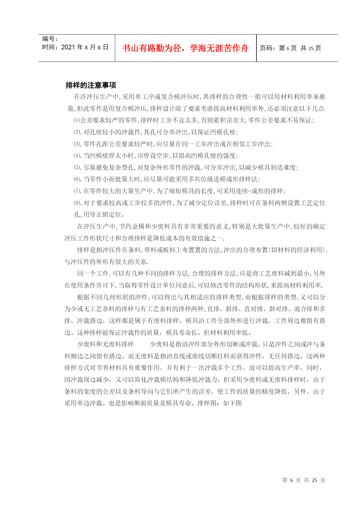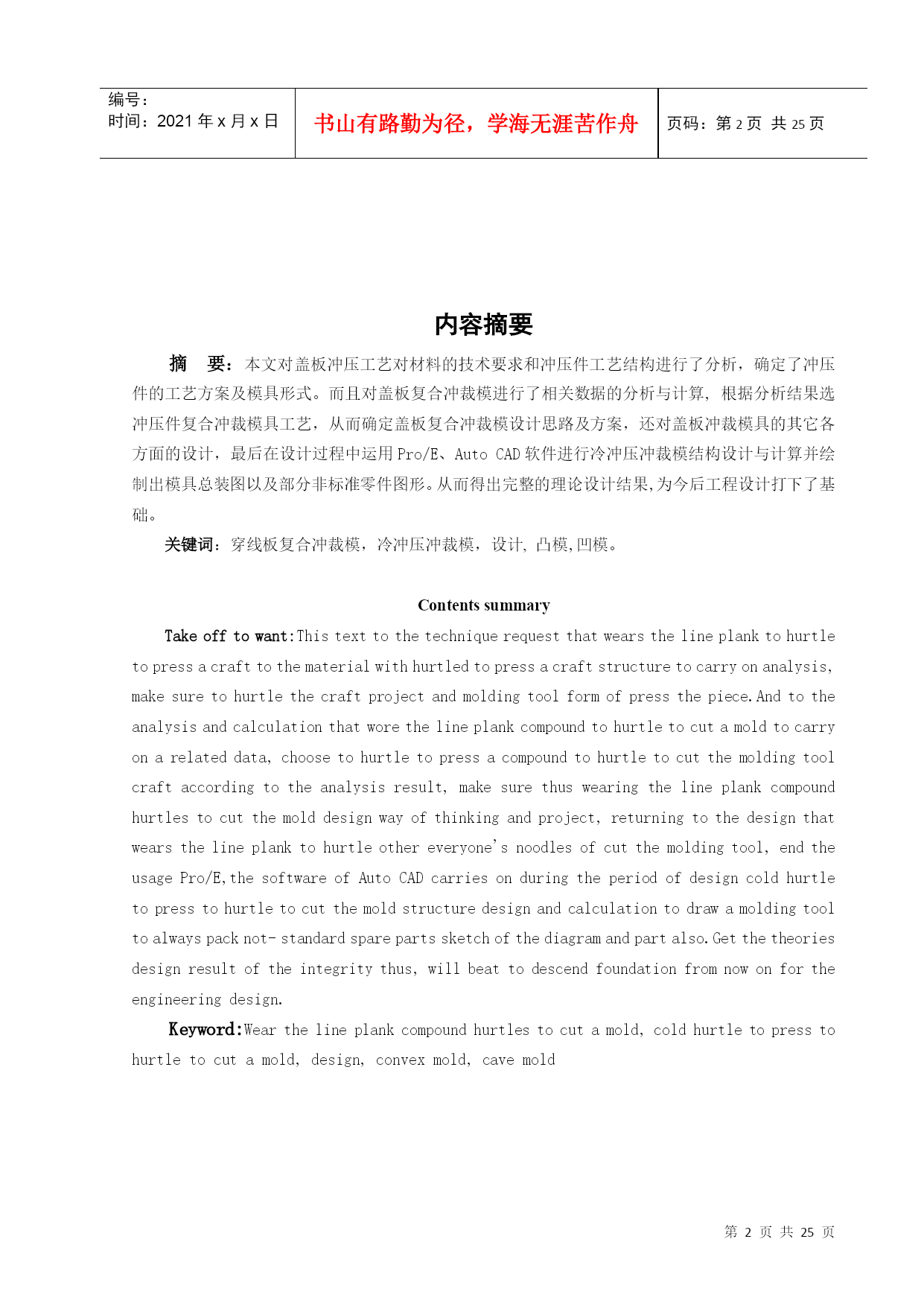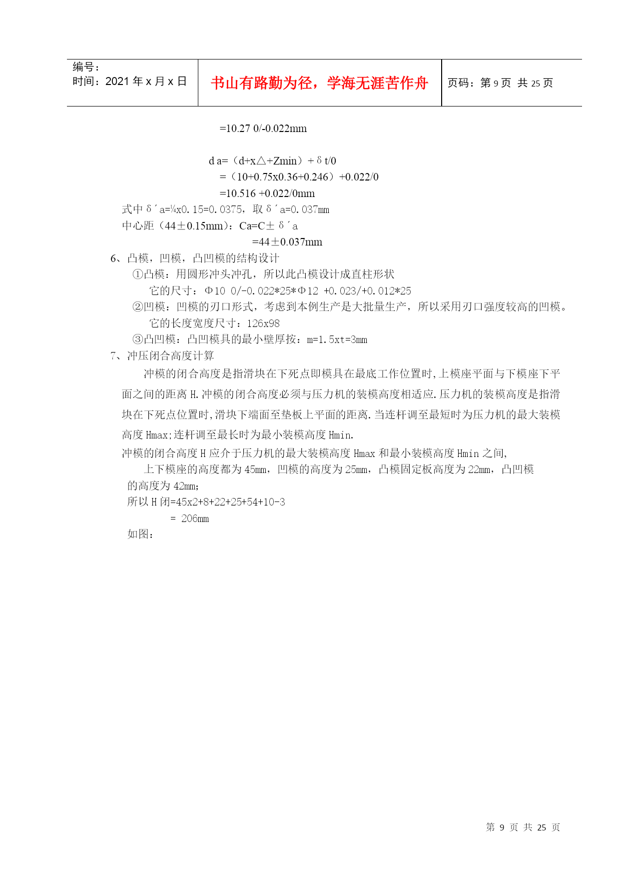 编号:时间:2021年x月x日书山有路勤为径,学海无涯苦作舟页码:第PAGE25页共NUMPAGES25页第PAGE\*MERGEFORMAT25页共NUMPAGES\*MERGEFORMAT25页潇湘学院学生毕业设计(论文)题目:摩托车链条链板冲裁模具系部:机械工程系专业:模具设计与制造学号:2007102010439姓名:董国栋指导老师:王毅民开题时间:2010-3-11完成时间:2010-4-10潇湘职业学院教务处制潇湘学院内容摘要摘要:本文对盖板冲压工艺对材料的技术要求和冲压件工艺结构进行了分析,确定了冲压件的工艺方案及模具形式。而且对盖板复合冲裁模进行了相关数据的分析与计算,根据分析结果选冲压件复合冲裁模具工艺,从而确定盖板复合冲裁模设计思路及方案,还对盖板冲裁模具的其它各方面的设计,最后在设计过程中运用Pro/E、AutoCAD软件进行冷冲压冲裁模结构设计与计算并绘制出模具总装图以及部分非标准零件图形。从而得出完整的理论设计结果,为今后工程设计打下了基础。关键词:穿线板复合冲裁模,冷冲压冲裁模,设计,凸模,凹模。ContentssummaryTakeofftowant:Thistexttothetechniquerequestthatwearsthelineplanktohurtletopressacrafttothematerialwithhurtledtopressacraftstructuretocarryonanalysis,makesuretohurtlethecraftprojectandmoldingtoolformofpressthepiece.Andtotheanalysisandcalculationthatworethelineplankcompoundtohurtletocutamoldtocarryonarelateddata,choosetohurtletopressacompoundtohurtletocutthemoldingtoolcraftaccordingtotheanalysisresult,makesurethuswearingthelineplankcompoundhurtlestocutthemolddesignwayofthinkingandproject,returningtothedesignthatwearsthelineplanktohurtleothereveryone'snoodlesofcutthemoldingtool,endtheusagePro/E,thesoftwareofAutoCADcarriesonduringtheperiodofdesigncoldhurtletopresstohurtletocutthemoldstructuredesignandcalculationtodrawamoldingtooltoalwayspacknot-standardsparepartssketchofthediagramandpartalso.Getthetheoriesdesignresultoftheintegritythus,willbeattodescendfoundationfromnowonfortheengineeringdesign.Keyword:Wearthelineplankcompoundhurtlestocutamold,coldhurtletopresstohurtletocutamold,design,convexmold,cavemold目录一、冲裁件工艺分析与相关要求.............................................................51、材料..............................................................................................................52、结构形状......................................................................................................53、尺寸精度......................................................................................................5二、确定工艺方案及模具形式............