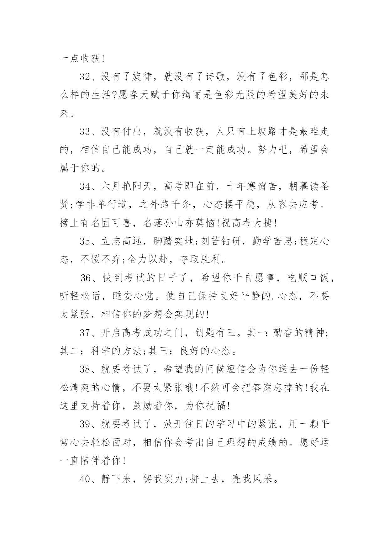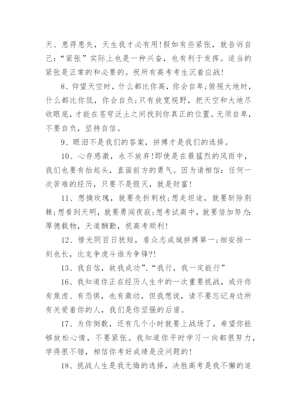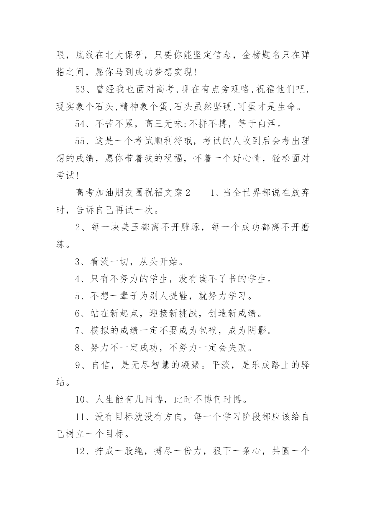 高考加油朋友圈祝福文案高考加油朋友圈祝福文案(精选95句)在现实生活或工作学习中,越来越多人钟情于发布文案,文案用以分享自己对生活的思考,表达自己的喜怒哀乐。你还在找寻优秀经典的文案吗?下面是小编精心整理的高考加油朋友圈祝福文案(精选95句),希望能够帮助到大家。高考加油朋友圈祝福文案11、昨日撒下勤奋种,今朝一搏必成功。鲤鱼一跃便成龙,大鹏展翅震长空。前程似锦圆美梦,锦衣凯旋沐春风。寒窗不负苦心人,金榜有你祝高中。高考顺利,愿你成功!2、祝愿所有的学子们:金榜题名!!!相信自己,你们是最棒的。3、祝愿试卷网的考生都能考出理想的成绩,进入自己理想的大学。4、这两天的考试过程中,要调整好自己的情绪,考过一门,就不要再想了,重要的是吃好,喝好,休息好,营造一种良好的应考氛围,祝愿你考试顺利!5、愿全国所有的考生都能以平常的心态参加高考,发挥自己的水平,考上理想的学校。我真心地祝福你们。6、有时候,洒脱一点,眼前便柳暗花明;宽容一点,心中便海阔天空。身边的世界往往比我们想象的要睿智与宽容。7、一份耕耘,一份收获,上苍从来不会忘记努力学习的人!尽量去考,因为天道酬勤。大胆去考,没必要杞人忧天、患得患失,天生我才必有用!假如有些紧张,就告诉自己:“紧张”实际上也是一种兴奋,也有利于发挥。适当的紧张是正常的和必要的。祝所有高考考生沉着应战!8、仰望天空时,什么都比你高,你会自卑;俯视大地时,什么都比你低,你会自负;只有放宽视野,把天空和大地尽收眼底,才能在苍穹泛土之间找到你真正的位置。无须自卑,不要自负,坚持自信。9、眼泪不是我们的答案,拼搏才是我们的选择。10、心存感激,永不放弃!即使是在最猛烈的风雨中,我们也要有抬起头,直面前方的勇气。因为请相信:任何一次苦难的经历,只要不是毁灭,就是财富!11、想摘玫瑰,就要先折刺枝;想走坦途,就要斩除荆棘;想看到天明,就要勇闯夜寂;想考试高中,就要倍加努力:厚德载物,天道酬勤,祝高考顺利!12、惜光阴百日犹短,看众志成城拼搏第一;细安排一刻也长,比龙争虎斗谁为争锋?!13、我自信,故我成功”、“我行,我一定能行”16、我知道你正在经历人生中的一次重要挑战,或许你有焦虑、有恐惧,也有激动,但我想说,请不要忘记身边所有关爱着你的人,我们是你坚强的后盾。17、为你倒数,还有几个小时就要上战场了,希望你能够放松心情,不要紧张。我知道你平时学习一向都很努力,学得很不错,相信你考好成绩是没问题的!18、挑战人生是我无悔的选择,决胜高考是我不懈的追求;19、天再热,热不过心;有信心,一切皆有可能。祝高考顺利,前程似锦。21、天道酬勤,曾经的每一分付出,必将收到百倍回报。不管揭晓的答案是什么,只要努力过、奋斗过,就不会后悔。22、送走了五月花丛的芬芳,迎来六月桃李的时光。高考在即,给你发条短信:你可以不用理我,但不能失去自我;你可以不看短信,但不能没有自信,预祝高考顺利!23、十年寒窗苦读日,只盼金榜题名时,祝你高考拿高分,鲤鱼跳龙门!加油!25、十二年苦读,十二年付出,十二年挥洒自如,十二年寒窗无数。睡个好觉,做个好梦,让信心更加充足,你一定会取得锦绣前途。26、努力的苦读,就为这一刻啰!把你的实力全部发挥,所有关爱着你的人,都会为你祝福、祈祷,相信你会考出满意的成绩,榜上有名喔!27、十年寒窗今破壁,锦绣前程自此辟。挥毫烟云落笔疾,马到成功身名立!29、你就要高考了,我在百度搜出千百条祝福语,在搜狗找到无数句吉祥话,但我觉得都太俗。我只想真诚地对你说:得心应手高考顺利,十年努力今日成功!30、你笔下拥有一个色彩绚丽的世界:愿你,也相信你,拥有另一个笔下灿烂的图景。31、每天都是一个起点,每天都有一点进步,每天都有一点收获!32、没有了旋律,就没有了诗歌,没有了色彩,那是怎么样的生活?愿春天赋于你绚丽是色彩无限的希望美好的未来。33、没有付出,就没有收获,人只有上坡路才是最难走的,相信自己能成功,自己就一定能成功。努力吧,希望会属于你的。34、六月艳阳天,高考即在前,十年寒窗苦,朝暮读圣贤;学非单行道,之外路千条,心态摆平稳,从容去应考。榜上有名固可喜,名落孙山亦莫恼!祝高考大捷!35、立志高远,脚踏实地;刻苦钻研,勤学苦思;稳定心态,不馁不弃;全力以赴,夺取胜利。36、快到考试的日子了,希望你干自愿事,吃顺口饭,听轻松话,睡安心觉。使自己保持良好平静的.心态,不要太紧张,相信你的梦想会实现的!37、开启高考成功之门,钥匙有三。其一:勤奋的精神;其二:科学的方法;其三:良好的心态。38、就要考试了,希望我的问候短信会为你送去一份轻松清爽的心情,不要太紧张哦!不然可会把答案忘掉的!我在这里支持着你,鼓励着你,为你祝福!39、就要考试了,放开往日的学习中的紧张,用一颗平常心去轻松面对,相信你会考出自己理想的成绩