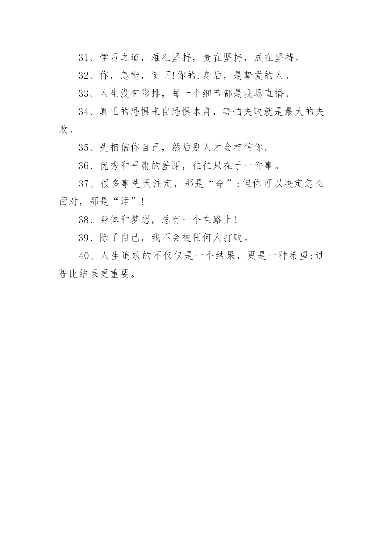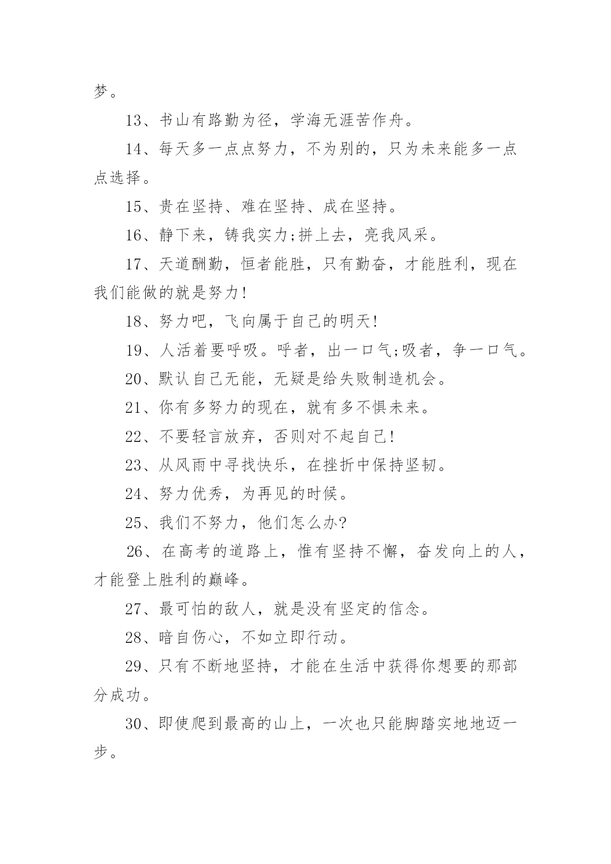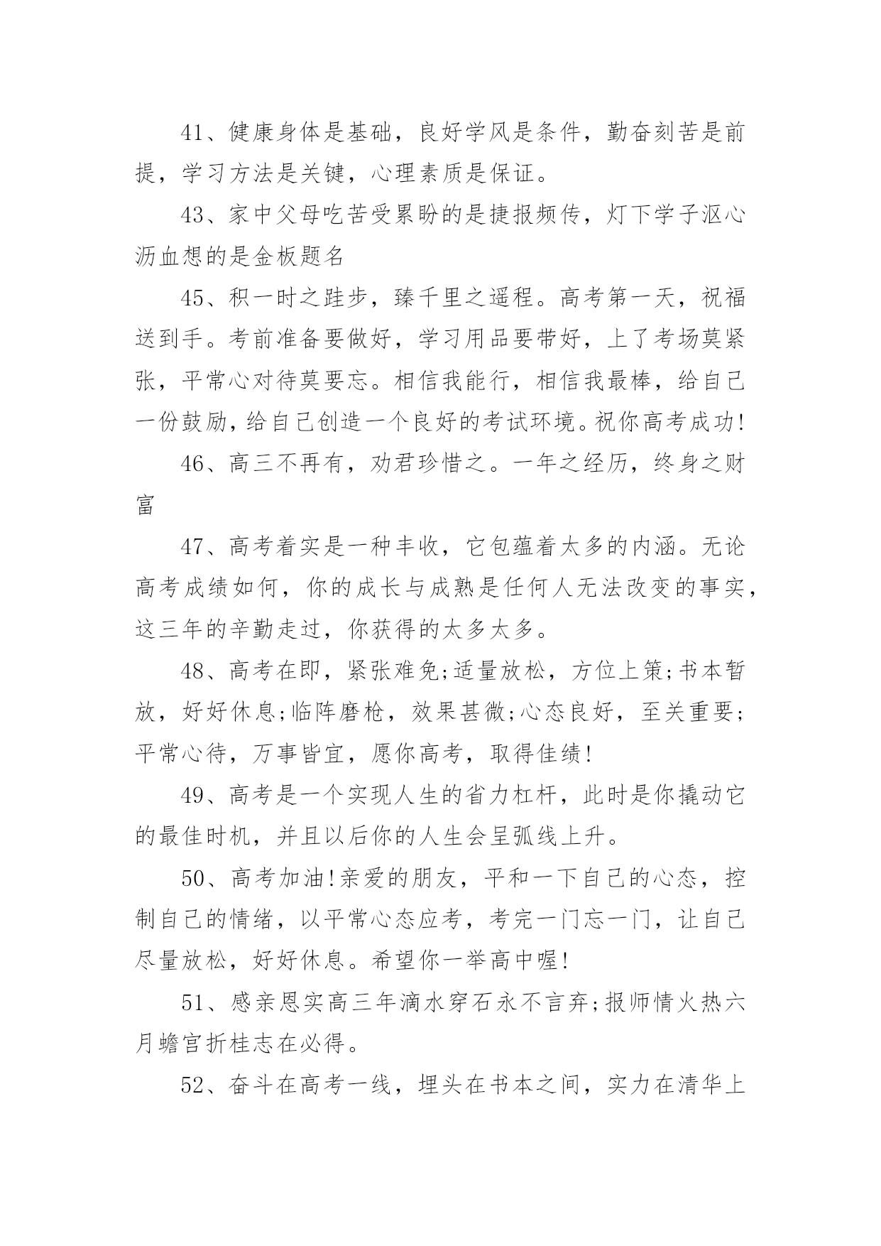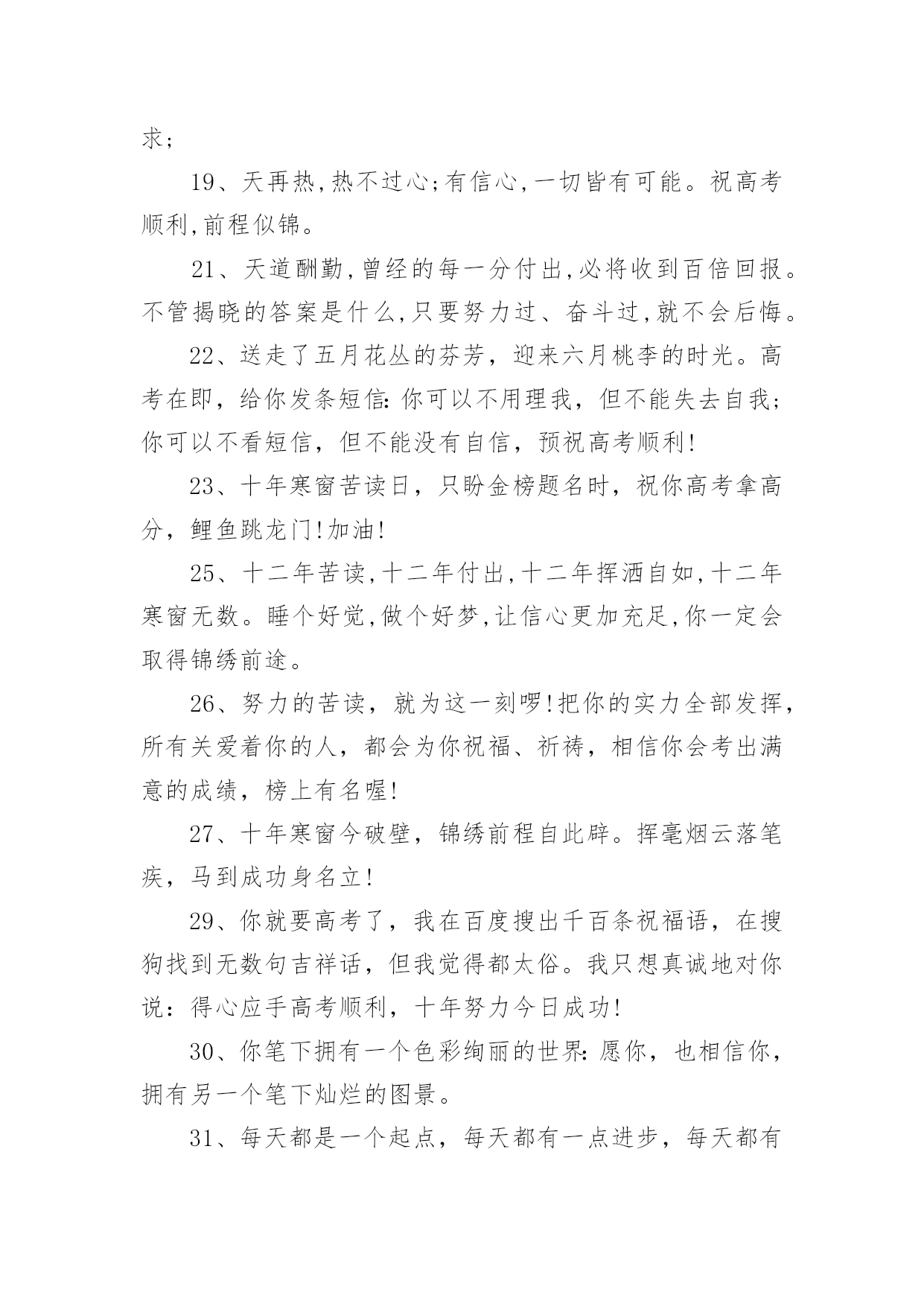高考加油朋友圈祝福文案高考加油朋友圈祝福文案(精选95句)在现实生活或工作学习中,越来越多人钟情于发布文案,文案用以分享自己对生活的思考,表达自己的喜怒哀乐。你还在找寻优秀经典的文案吗?下面是小编精心整理的高考加油朋友圈祝福文案(精选95句),希望能够帮助到大家。高考加油朋友圈祝福文案11、昨日撒下勤奋种,今朝一搏必成功。鲤鱼一跃便成龙,大鹏展翅震长空。前程似锦圆美梦,锦衣凯旋沐春风。寒窗不负苦心人,金榜有你祝高中。高考顺利,愿你成功!2、祝愿所有的学子们:金榜题名!!!相信自己,你们是最棒的。3、祝愿试卷网的考生都能考出理想的成绩,进入自己理想的大学。4、这两天的考试过程中,要调整好自己的情绪,考过一门,就不要再想了,重要的是吃好,喝好,休息好,营造一种良好的应考氛围,祝愿你考试顺利!5、愿全国所有的考生都能以平常的心态参加高考,发挥自己的水平,考上理想的学校。我真心地祝福你们。6、有时候,洒脱一点,眼前便柳暗花明;宽容一点,心中便海阔天空。身边的世界往往比我们想象的要睿智与宽容。7、一份耕耘,一份收获,上苍从来不会忘记努力学习的人!尽量去考,因为天道酬勤。大胆去考,没必要杞人忧天、患得患失,天生我才必有用!假如有些紧张,就告诉自己:“紧张”实际上也是一种兴奋,也有利于发挥。适当的紧张是正常的和必要的。祝所有高考考生沉着应战!8、仰望天空时,什么都比你高,你会自卑;俯视大地时,什么都比你低,你会自负;只有放宽视野,把天空和大地尽收眼底,才能在苍穹泛土之间找到你真正的位置。无须自卑,不要自负,坚持自信。9、眼泪不是我们的答案,拼搏才是我们的选择。10、心存感激,永不放弃!即使是在最猛烈的风雨中,我们也要有抬起头,直面前方的勇气。因为请相信:任何一次苦难的经历,只要不是毁灭,就是财富!11、想摘玫瑰,就要先折刺枝;想走坦途,就要斩除荆棘;想看到天明,就要勇闯夜寂;想考试高中,就要倍加努力:厚德载物,天道酬勤,祝高考顺利!12、惜光阴百日犹短,看众志成城拼搏第一;细安排一刻也长,比龙争虎斗谁为争锋?!13、我自信,故我成功”、“我行,我一定能行”16、我知道你正在经历人生中的一次重要挑战,或许你有焦虑、有恐惧,也有激动,但我想说,请不要忘记身边所有关爱着你的人,我们是你坚强的后盾。17、为你倒数,还有几个小时就要上战场了,希望你能够放松心情,不要紧张。我知道你平时学习一向都很努力,学得很不错,相信你考好成绩是没问题的!18、挑战人生是我无悔的选择,决胜高考是我不懈的追求;19、天再热,热不过心;有信心,一切皆有可能。祝高考顺利,前程似锦。21、天道酬勤,曾经的每一分付出,必将收到百倍回报。不管揭晓的答案是什么,只要努力过、奋斗过,就不会后悔。22、送走了五月花丛的芬芳,迎来六月桃李的时光。高考在即,给你发条短信:你可以不用理我,但不能失去自我;你可以不看短信,但不能没有自信,预祝高考顺利!23、十年寒窗苦读日,只盼金榜题名时,祝你高考拿高分,鲤鱼跳龙门!加油!25、十二年苦读,十二年付出,十二年挥洒自如,十二年寒窗无数。睡个好觉,做个好梦,让信心更加充足,你一定会取得锦绣前途。26、努力的苦读,就为这一刻啰!把你的实力全部发挥,所有关爱着你的人,都会为你祝福、祈祷,相信你会考出满意的成绩,榜上有名喔!27、十年寒窗今破壁,锦绣前程自此辟。挥毫烟云落笔疾,马到成功身名立!29、你就要高考了,我在百度搜出千百条祝福语,在搜狗找到无数句吉祥话,但我觉得都太俗。我只想真诚地对你说:得心应手高考顺利,十年努力今日成功!30、你笔下拥有一个色彩绚丽的世界:愿你,也相信你,拥有另一个笔下灿烂的图景。31、每天都是一个起点,每天都有一点进步,每天都有一点收获!32、没有了旋律,就没有了诗歌,没有了色彩,那是怎么样的生活?愿春天赋于你绚丽是色彩无限的希望美好的未来。33、没有付出,就没有收获,人只有上坡路才是最难走的,相信自己能成功,自己就一定能成功。努力吧,希望会属于你的。34、六月艳阳天,高考即在前,十年寒窗苦,朝暮读圣贤;学非单行道,之外路千条,心态摆平稳,从容去应考。榜上有名固可喜,名落孙山亦莫恼!祝高考大捷!35、立志高远,脚踏实地;刻苦钻研,勤学苦思;稳定心态,不馁不弃;全力以赴,夺取胜利。36、快到考试的日子了,希望你干自愿事,吃顺口饭,听轻松话,睡安心觉。使自己保持良好平静的.心态,不要太紧张,相信你的梦想会实现的!37、开启高考成功之门,钥匙有三。其一:勤奋的精神;其二:科学的方法;其三:良好的心态。38、就要考试了,希望我的问候短信会为你送去一份轻松清爽的心情,不要太紧张哦!不然可会把答案忘掉的!我在这里支持着你,鼓励着你,为你祝福!39、就要考试了,放开往日的学习中的紧张,用一颗平常心去轻松面对,相信你会考出自己理想的成绩