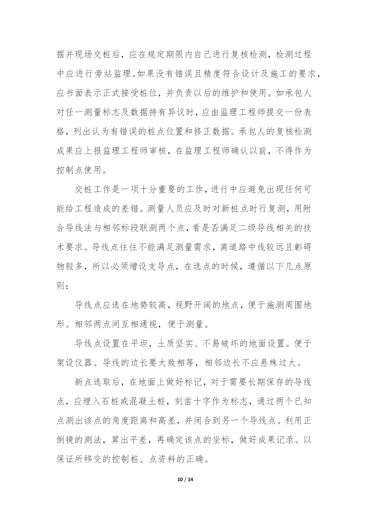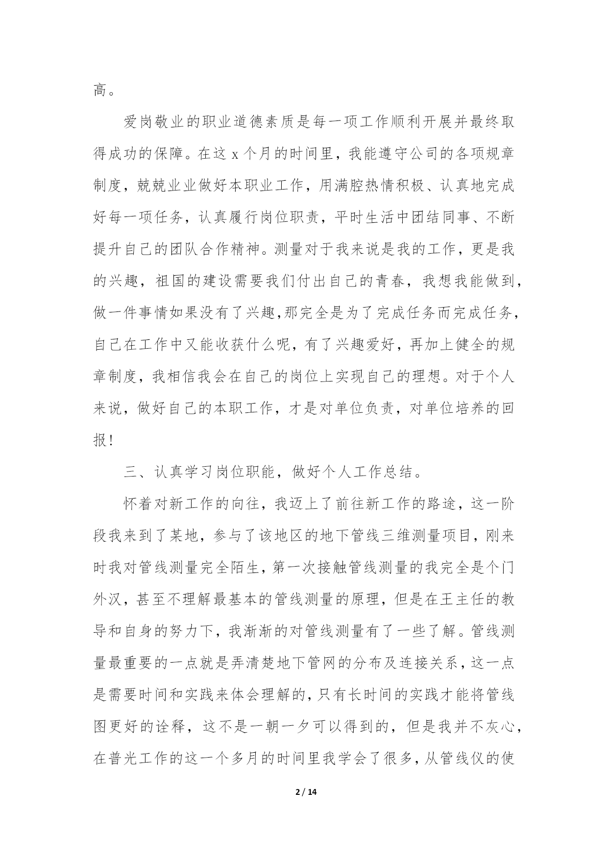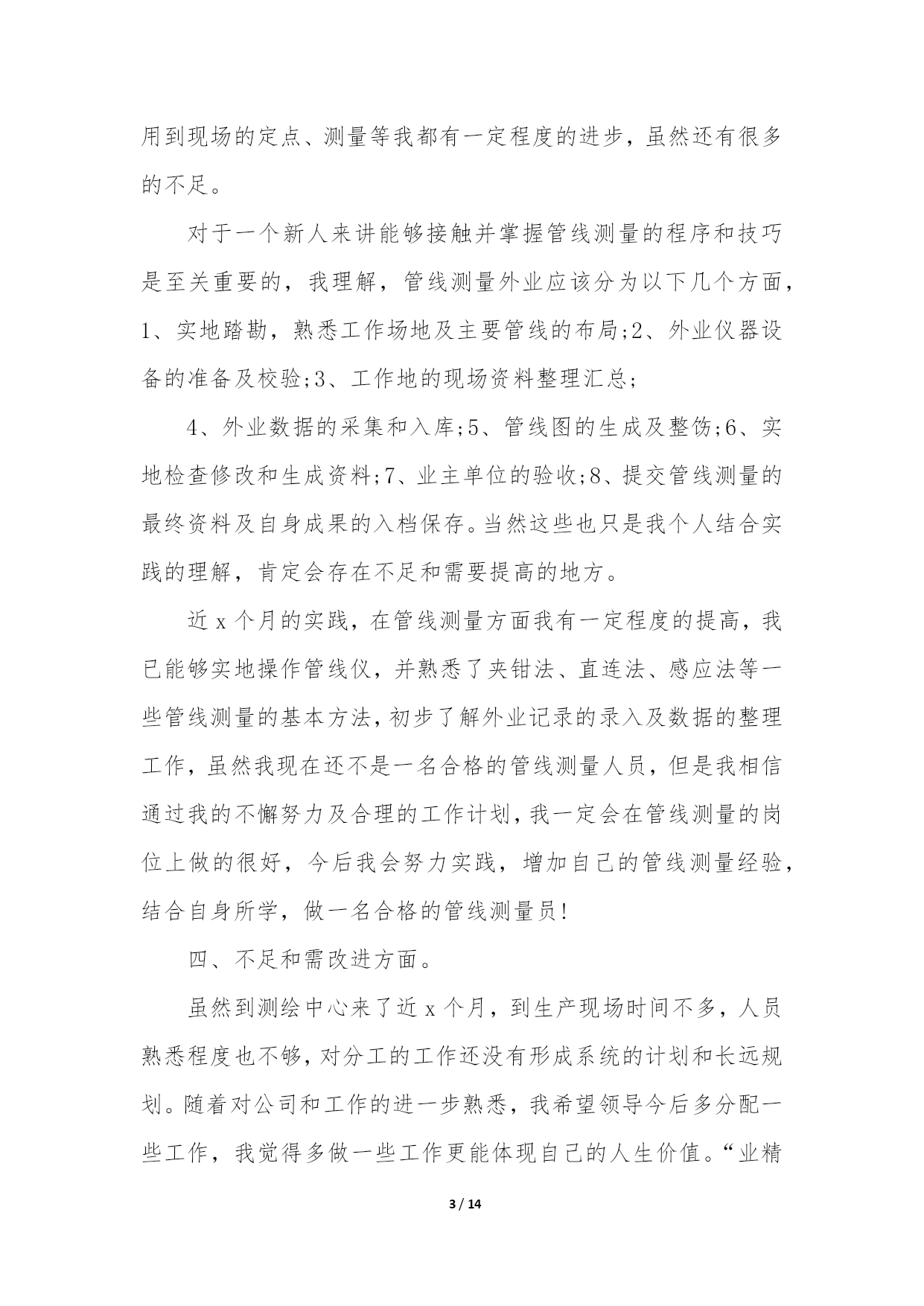 PAGE14/NUMPAGES14测绘工程专业技术工作总结(合集3篇)在这一年的时间里,在领导和同事们的悉心关怀和指导下,通过自身的努力,各方面均取得了一定的进步,现将这段时间我的实习工作总结一、通过实践学习和日常工作积累使我对公司有了全新的认识。我公司具有全国甲级测绘资质证书的单位,经多年的发展创新,单位已成为一个仪器装备精良、专业技术全面、人才结构合理、具有多种竞争优势的测绘单位,拥有齐全的测绘仪器、全数字摄影测量工作站、遥感和物探仪器设备,具备工程测量、地籍测绘、航空摄影测量与遥感测绘、地理信息系统、房产测绘、遥感地质、物探及管线探测等综合生产科研能力,可承担各种大型、特殊、复杂的测绘工程及提供地图数字化,建立数据库、信息系统和GPS技术服务。很高兴我能有幸成为公司的一员,测绘专业毕业的我现在正是需要积累的阶段,而这样的单位无疑给我的成长加了助力,会使我在以后的工作生活中避免走很多的弯路,尽早的成为一名合格的测量技术人员。有这样的平台可以施展自身所学,我想我的人生将会变得越来越精彩!二、遵守各项规章制度,认真工作,使自己素养不断得到提高。爱岗敬业的职业道德素质是每一项工作顺利开展并最终取得成功的保障。在这x个月的时间里,我能遵守公司的各项规章制度,兢兢业业做好本职业工作,用满腔热情积极、认真地完成好每一项任务,认真履行岗位职责,平时生活中团结同事、不断提升自己的团队合作精神。测量对于我来说是我的工作,更是我的兴趣,祖国的建设需要我们付出自己的青春,我想我能做到,做一件事情如果没有了兴趣,那完全是为了完成任务而完成任务,自己在工作中又能收获什么呢,有了兴趣爱好,再加上健全的规章制度,我相信我会在自己的岗位上实现自己的理想。对于个人来说,做好自己的本职工作,才是对单位负责,对单位培养的回报!三、认真学习岗位职能,做好个人工作总结。怀着对新工作的向往,我迈上了前往新工作的路途,这一阶段我来到了某地,参与了该地区的地下管线三维测量项目,刚来时我对管线测量完全陌生,第一次接触管线测量的我完全是个门外汉,甚至不理解最基本的管线测量的原理,但是在王主任的教导和自身的努力下,我渐渐的对管线测量有了一些了解。管线测量最重要的一点就是弄清楚地下管网的分布及连接关系,这一点是需要时间和实践来体会理解的,只有长时间的实践才能将管线图更好的诠释,这不是一朝一夕可以得到的,但是我并不灰心,在普光工作的这一个多月的时间里我学会了很多,从管线仪的使用到现场的定点、测量等我都有一定程度的进步,虽然还有很多的不足。对于一个新人来讲能够接触并掌握管线测量的程序和技巧是至关重要的,我理解,管线测量外业应该分为以下几个方面,1、实地踏勘,熟悉工作场地及主要管线的布局;2、外业仪器设备的准备及校验;3、工作地的现场资料整理汇总;4、外业数据的采集和入库;5、管线图的生成及整饬;6、实地检查修改和生成资料;7、业主单位的验收;8、提交管线测量的最终资料及自身成果的入档保存。当然这些也只是我个人结合实践的理解,肯定会存在不足和需要提高的地方。近x个月的实践,在管线测量方面我有一定程度的提高,我已能够实地操作管线仪,并熟悉了夹钳法、直连法、感应法等一些管线测量的基本方法,初步了解外业记录的录入及数据的整理工作,虽然我现在还不是一名合格的管线测量人员,但是我相信通过我的不懈努力及合理的工作计划,我一定会在管线测量的岗位上做的很好,今后我会努力实践,增加自己的管线测量经验,结合自身所学,做一名合格的管线测量员!四、不足和需改进方面。虽然到测绘中心来了近x个月,到生产现场时间不多,人员熟悉程度也不够,对分工的工作还没有形成系统的计划和长远规划。随着对公司和工作的进一步熟悉,我希望领导今后多分配一些工作,我觉得多做一些工作更能体现自己的人生价值。“业精于勤而荒于嬉”,在以后的工作中我要不断学习专业知识,通过多看、多问、多学、多练来不断的提高自己的各项技能。在这一段时间的工作中,我总结了自己的不足,人无完人,金无足赤,有缺点不足并不可怕,重要的是能克服困难、迎难而上。首先、工作经验不足,对工作的理解比较片面;其次、工作不踏实,对工作缺乏系统的认识;最后、缺少专业知识的积累和专业技能的培养。虽然有这些的不足,但是我并不气馁,经验的不足可以通过继续实践来加强,在以后的工作中我会一步一个脚印的努力,认真学习专业知识、培养自身的技能,不断的适应新的工作环境,在自己的岗位上积极进取!学无止境,时代的发展瞬息万变,各种学科知识日新月异。我将坚持不懈地努力学习各种知识,并用于指导实践。在今后工作中,把自己的工作创造性做好做扎实,为公司的发展贡献自己的力量。20X年已经过去,虽然这个项目还没有正式完成,但收获也不少。特别是公司领导塌实的工作作风以及认真负责的工作态度给我树立了