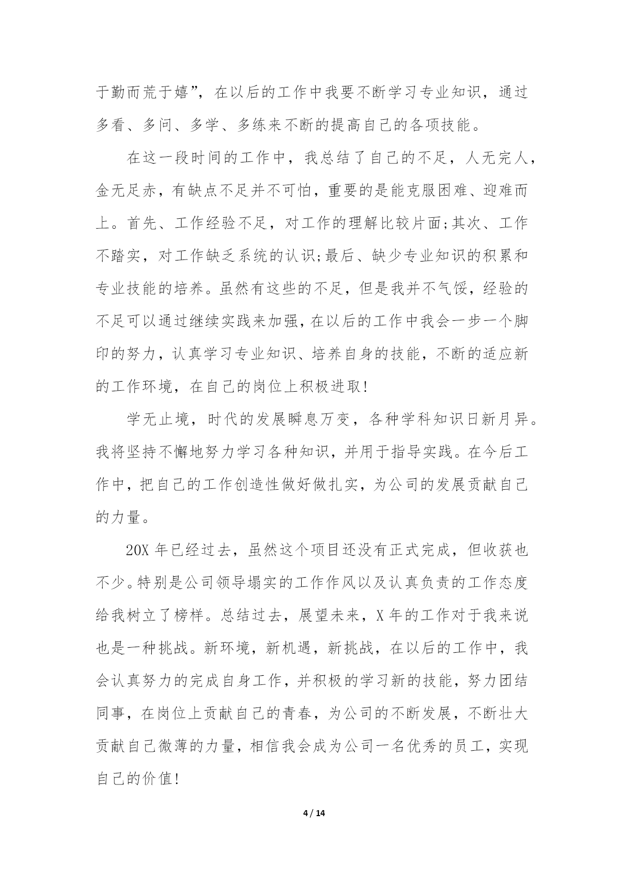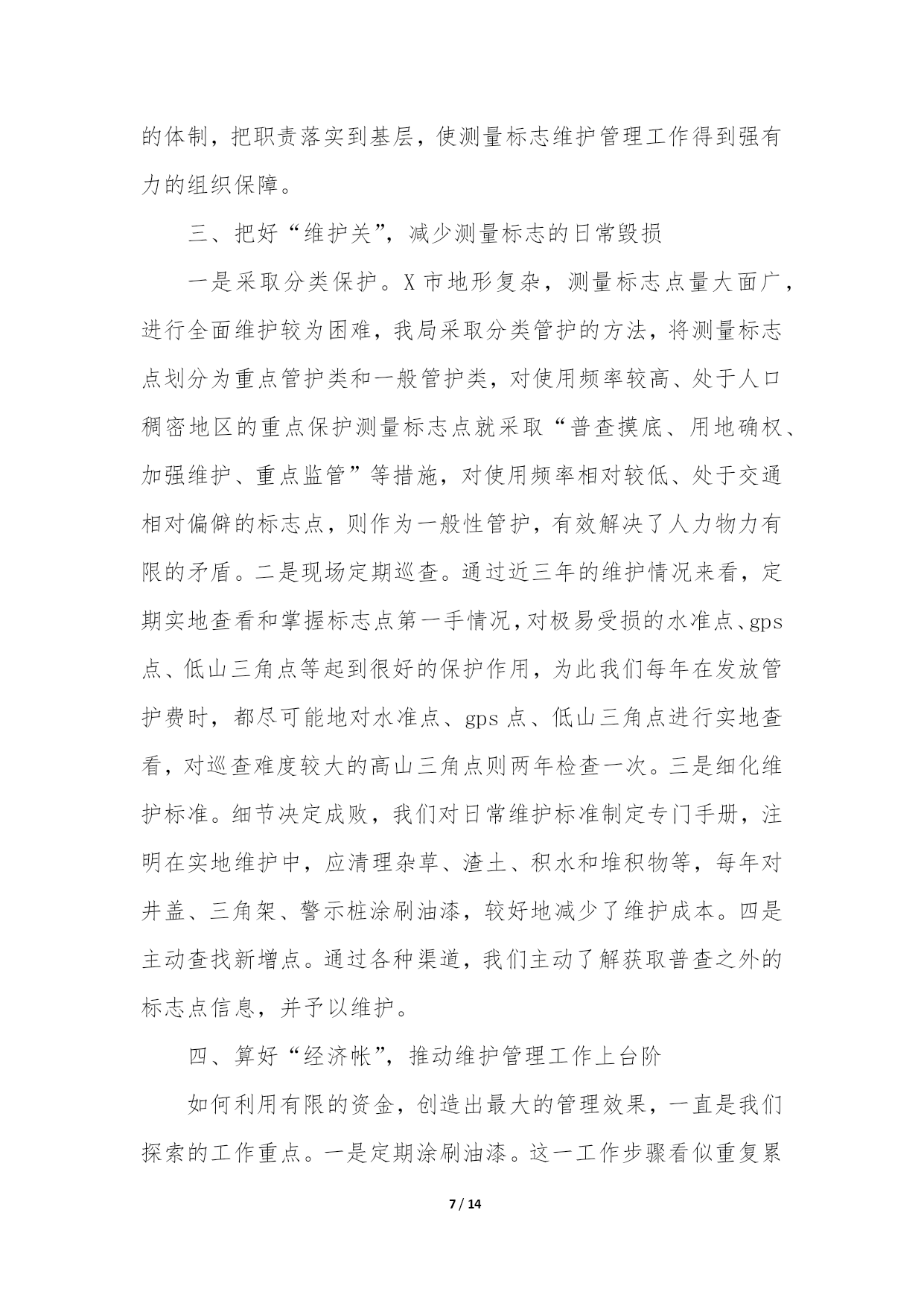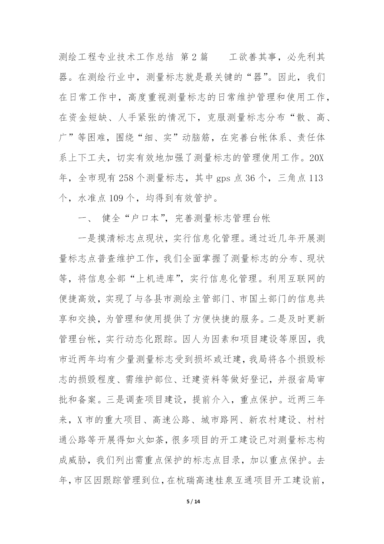 PAGE14/NUMPAGES14测绘工程专业技术工作总结(合集3篇)在这一年的时间里,在领导和同事们的悉心关怀和指导下,通过自身的努力,各方面均取得了一定的进步,现将这段时间我的实习工作总结一、通过实践学习和日常工作积累使我对公司有了全新的认识。我公司具有全国甲级测绘资质证书的单位,经多年的发展创新,单位已成为一个仪器装备精良、专业技术全面、人才结构合理、具有多种竞争优势的测绘单位,拥有齐全的测绘仪器、全数字摄影测量工作站、遥感和物探仪器设备,具备工程测量、地籍测绘、航空摄影测量与遥感测绘、地理信息系统、房产测绘、遥感地质、物探及管线探测等综合生产科研能力,可承担各种大型、特殊、复杂的测绘工程及提供地图数字化,建立数据库、信息系统和GPS技术服务。很高兴我能有幸成为公司的一员,测绘专业毕业的我现在正是需要积累的阶段,而这样的单位无疑给我的成长加了助力,会使我在以后的工作生活中避免走很多的弯路,尽早的成为一名合格的测量技术人员。有这样的平台可以施展自身所学,我想我的人生将会变得越来越精彩!二、遵守各项规章制度,认真工作,使自己素养不断得到提高。爱岗敬业的职业道德素质是每一项工作顺利开展并最终取得成功的保障。在这x个月的时间里,我能遵守公司的各项规章制度,兢兢业业做好本职业工作,用满腔热情积极、认真地完成好每一项任务,认真履行岗位职责,平时生活中团结同事、不断提升自己的团队合作精神。测量对于我来说是我的工作,更是我的兴趣,祖国的建设需要我们付出自己的青春,我想我能做到,做一件事情如果没有了兴趣,那完全是为了完成任务而完成任务,自己在工作中又能收获什么呢,有了兴趣爱好,再加上健全的规章制度,我相信我会在自己的岗位上实现自己的理想。对于个人来说,做好自己的本职工作,才是对单位负责,对单位培养的回报!三、认真学习岗位职能,做好个人工作总结。怀着对新工作的向往,我迈上了前往新工作的路途,这一阶段我来到了某地,参与了该地区的地下管线三维测量项目,刚来时我对管线测量完全陌生,第一次接触管线测量的我完全是个门外汉,甚至不理解最基本的管线测量的原理,但是在王主任的教导和自身的努力下,我渐渐的对管线测量有了一些了解。管线测量最重要的一点就是弄清楚地下管网的分布及连接关系,这一点是需要时间和实践来体会理解的,只有长时间的实践才能将管线图更好的诠释,这不是一朝一夕可以得到的,但是我并不灰心,在普光工作的这一个多月的时间里我学会了很多,从管线仪的使用到现场的定点、测量等我都有一定程度的进步,虽然还有很多的不足。对于一个新人来讲能够接触并掌握管线测量的程序和技巧是至关重要的,我理解,管线测量外业应该分为以下几个方面,1、实地踏勘,熟悉工作场地及主要管线的布局;2、外业仪器设备的准备及校验;3、工作地的现场资料整理汇总;4、外业数据的采集和入库;5、管线图的生成及整饬;6、实地检查修改和生成资料;7、业主单位的验收;8、提交管线测量的最终资料及自身成果的入档保存。当然这些也只是我个人结合实践的理解,肯定会存在不足和需要提高的地方。近x个月的实践,在管线测量方面我有一定程度的提高,我已能够实地操作管线仪,并熟悉了夹钳法、直连法、感应法等一些管线测量的基本方法,初步了解外业记录的录入及数据的整理工作,虽然我现在还不是一名合格的管线测量人员,但是我相信通过我的不懈努力及合理的工作计划,我一定会在管线测量的岗位上做的很好,今后我会努力实践,增加自己的管线测量经验,结合自身所学,做一名合格的管线测量员!四、不足和需改进方面。虽然到测绘中心来了近x个月,到生产现场时间不多,人员熟悉程度也不够,对分工的工作还没有形成系统的计划和长远规划。随着对公司和工作的进一步熟悉,我希望领导今后多分配一些工作,我觉得多做一些工作更能体现自己的人生价值。“业精于勤而荒于嬉”,在以后的工作中我要不断学习专业知识,通过多看、多问、多学、多练来不断的提高自己的各项技能。在这一段时间的工作中,我总结了自己的不足,人无完人,金无足赤,有缺点不足并不可怕,重要的是能克服困难、迎难而上。首先、工作经验不足,对工作的理解比较片面;其次、工作不踏实,对工作缺乏系统的认识;最后、缺少专业知识的积累和专业技能的培养。虽然有这些的不足,但是我并不气馁,经验的不足可以通过继续实践来加强,在以后的工作中我会一步一个脚印的努力,认真学习专业知识、培养自身的技能,不断的适应新的工作环境,在自己的岗位上积极进取!学无止境,时代的发展瞬息万变,各种学科知识日新月异。我将坚持不懈地努力学习各种知识,并用于指导实践。在今后工作中,把自己的工作创造性做好做扎实,为公司的发展贡献自己的力量。20X年已经过去,虽然这个项目还没有正式完成,但收获也不少。特别是公司领导塌实的工作作风以及认真负责的工作态度给我树立了
