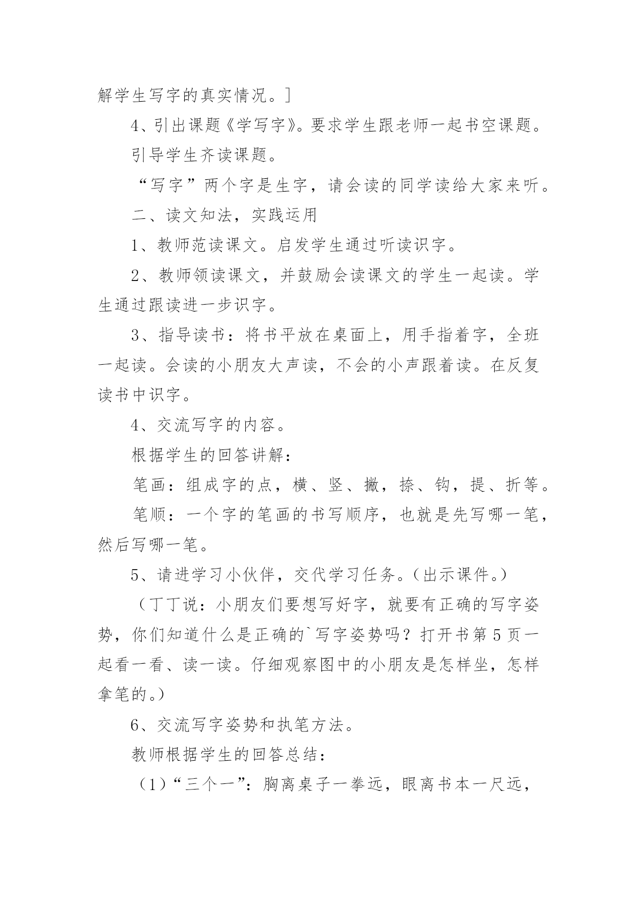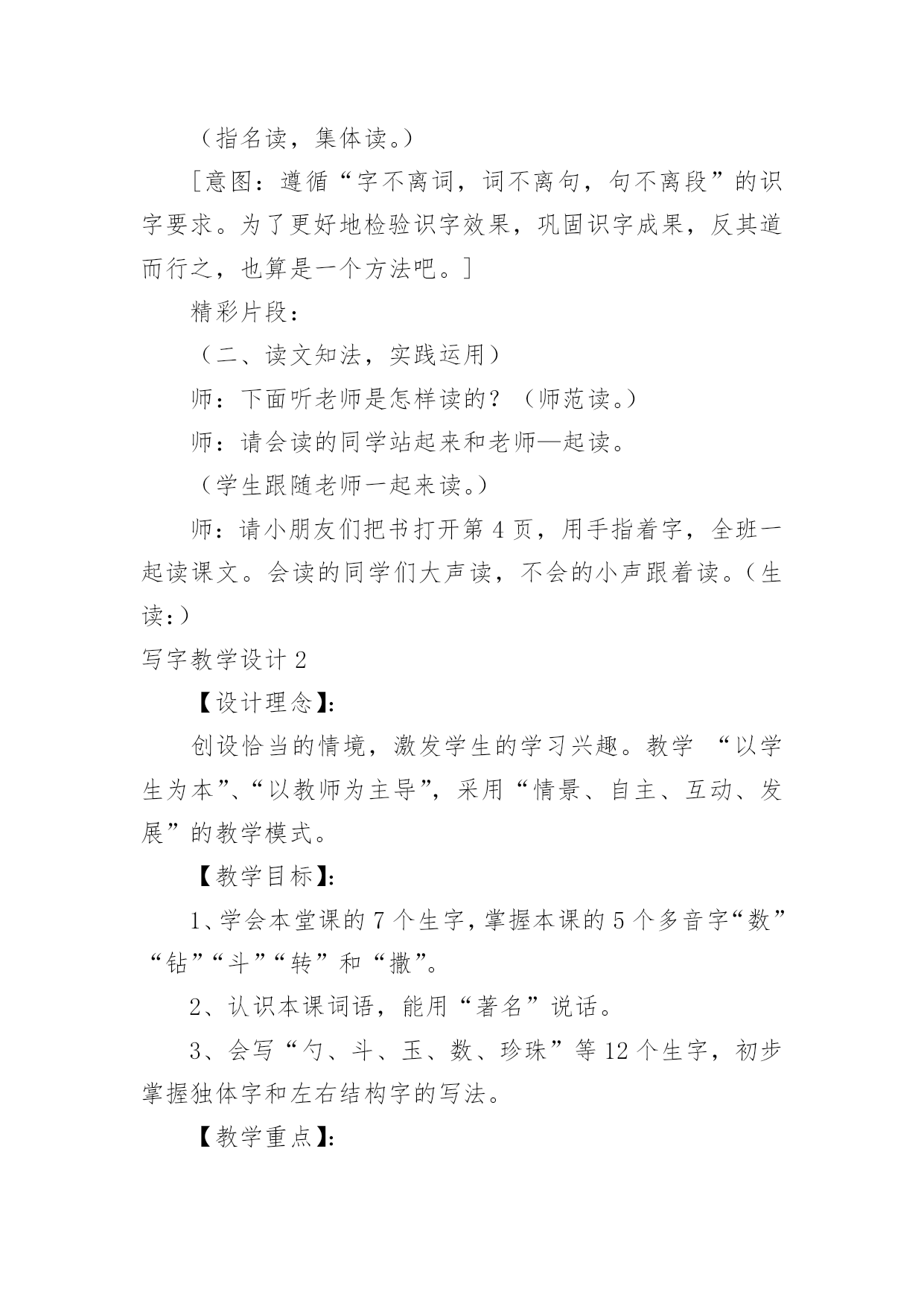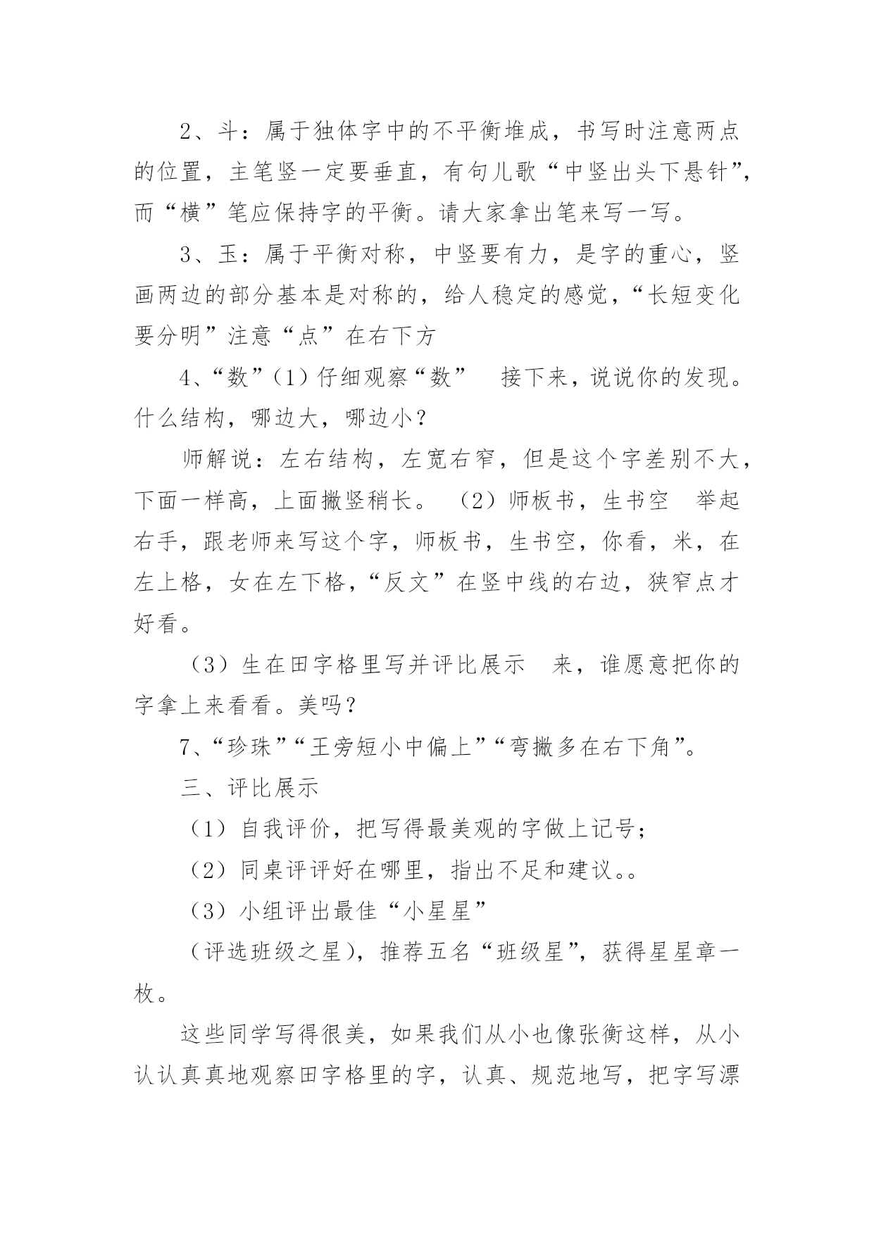 写字教学设计写字教学设计作为一位优秀的人民教师,就难以避免地要准备教学设计,教学设计是对学业业绩问题的解决措施进行策划的过程。那要怎么写好教学设计呢?以下是小编收集整理的写字教学设计,仅供参考,希望能够帮助到大家。写字教学设计1一、创设情境,激趣导入1、根据学生爱听故事的特点,用多媒体课件播放一个有趣的童话故事。(课件播放由蚂蚁和蜜蜂为主角的动画,背景是草地,配上《写字很有用》这首儿童诗。在课件播放完时,屏幕上出现几个字:“赶快学写字,写字很有用”?)[意图:上课伊始以动画故事来吸引学生的注意力,让他们在漂亮的画面和动听的故事中开始学习。这样的设计尊重学生的心理、年龄特点,让他们在轻松愉快的氛围中进入良好的学习状态。]2、启发学生根据故事说说写字有什么用。[意图:发散学生思维,激发学生想表达的欲望。]3、调查学生学前写字情况:谁会写字,你写过什么字?请4名学生写在黑板上。[意图:激发学生想写字、想表现自己的欲望,进而了解学生写字的真实情况。]4、引出课题《学写字》。要求学生跟老师一起书空课题。引导学生齐读课题。“写字”两个字是生字,请会读的同学读给大家来听。二、读文知法,实践运用1、教师范读课文。启发学生通过听读识字。2、教师领读课文,并鼓励会读课文的学生一起读。学生通过跟读进一步识字。3、指导读书:将书平放在桌面上,用手指着字,全班一起读。会读的小朋友大声读,不会的小声跟着读。在反复读书中识字。4、交流写字的内容。根据学生的回答讲解:笔画:组成字的点,横、竖、撇,捺、钩,提、折等。笔顺:一个字的笔画的书写顺序,也就是先写哪一笔,然后写哪一笔。5、请进学习小伙伴,交代学习任务。(出示课件。)(丁丁说:小朋友们要想写好字,就要有正确的写字姿势,你们知道什么是正确的`写字姿势吗?打开书一起看一看、读一读。仔细观察图中的小朋友是怎样坐,怎样拿笔的。)6、交流写字姿势和执笔方法。教师根据学生的回答总结:(1)“三个一”:胸离桌子一拳远,眼离书本一尺远,手离笔尖一寸远。(2)头正身脚放平,两臂张开桌上放,左手按住右手写。7、教师示范,学生模仿。请学生轻轻地拿出铅笔,做出正确的写字姿势。同桌互相看看对不对,做对了互相点头微笑,做错了互相帮助纠正过来。(教师巡视,纠正学生姿势。)8、巩固练习:请学生描一描的两幅图和五个基本笔画。(学生练习的过程中,教师继续巡视,纠正姿势。)你们觉得自己描得怎么样?如果你认为描得好就奖励自己一个笑脸吧,画在书上。[意图:这个环节的主要任务是让学生运用听读识字的方法认字和掌握正确的写字姿势。运用生动有趣的课件和学生喜欢的实践活动帮助他们理解课文,使他们在轻松愉快中掌握了写字方法。教师启发、引导学生主动地去发现、探究新知,使学生的主动性得以充分地发挥,个性得以尽情地张扬。]三、学词认字1、初读生字(课件出示词语:语文课、我们、写字、笔画),指名学生当小老师带着大家读。2、复读生字。(课件出示生字,字从词中分离,打乱顺序。)(指名读,集体读。)[意图:遵循“字不离词,词不离句,句不离段”的识字要求。为了更好地检验识字效果,巩固识字成果,反其道而行之,也算是一个方法吧。]精彩片段:(二、读文知法,实践运用)师:下面听老师是怎样读的?(师范读。)师:请会读的同学站起来和老师—起读。(学生跟随老师一起来读。)师:请小朋友们把书打开,用手指着字,全班一起读课文。会读的同学们大声读,不会的小声跟着读。(生读:)写字教学设计2【设计理念】:创设恰当的情境,激发学生的学习兴趣。教学“以学生为本”、“以教师为主导”,采用“情景、自主、互动、发展”的教学模式。【教学目标】:1、学会本堂课的7个生字,掌握本课的5个多音字“数”“钻”“斗”“转”和“撒”。2、认识本课词语,能用“著名”说话。3、会写“勺、斗、玉、数、珍珠”等12个生字,初步掌握独体字和左右结构字的写法。【教学重点】:学会生字、新词,并能口头组词【教学难点】:规范、美观地写字,初步掌握独体字和左右结构字的写法。【教学准备】:课件、生字卡片【教学过程】:一、谈话导入1.小朋友们,夏夜的天空你会发现什么?(有好多星星,都很美)2、是啊,晴朗的夜空,我们一抬头,就看见天上有许许多多的星星,这么多的星星你数过吗?数得清么?(数不清)这节课我们来学习第29课《数星星的孩子》第一课时。二、学习生字请小朋友们翻开书本,自己朗读课文。这么美的夏夜萤火虫姑娘也来和星星玩耍了,你想跟他们一起玩么?那你准备好,可是有条件的,必须能闯过她设置的关卡哟,有信心吗?第一关:“你会认吗”1、出示本课生字:yùsǎyǎngshǎjùzch玉撒仰傻距组楚hénghànshuìzuānyánzhēnzhū衡汉睡钻研珍珠2、快读给同桌听听3、4人一小组,交流交流你是怎样记住这些生字的?谁愿意来说说?谁愿意