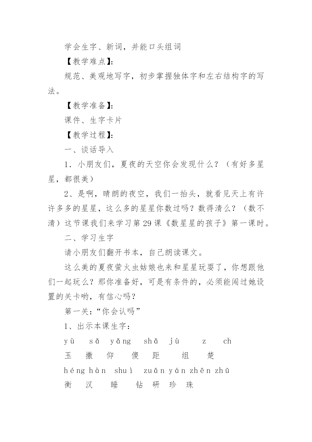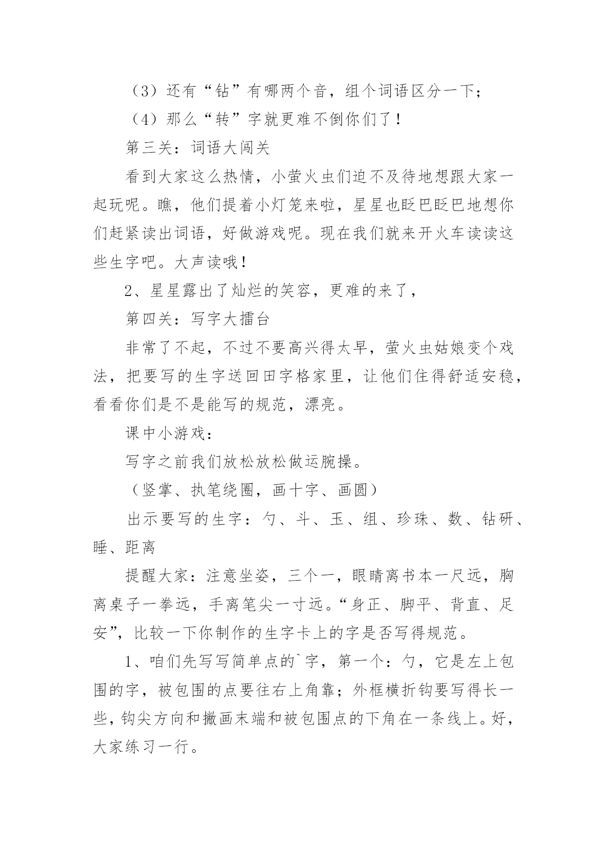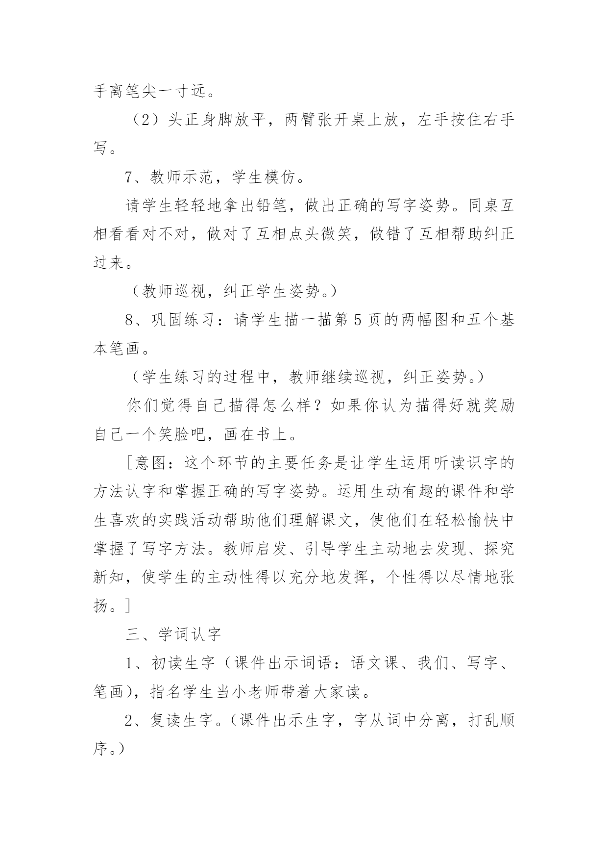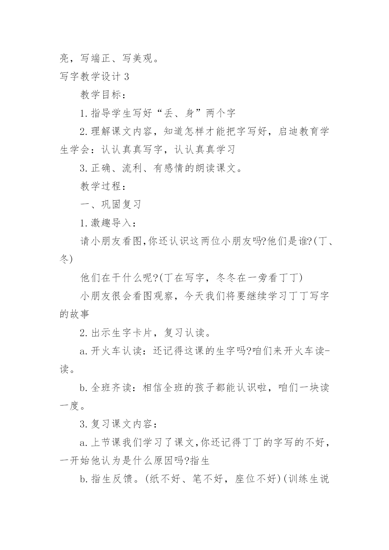 写字教学设计写字教学设计作为一位优秀的人民教师,就难以避免地要准备教学设计,教学设计是对学业业绩问题的解决措施进行策划的过程。那要怎么写好教学设计呢?以下是小编收集整理的写字教学设计,仅供参考,希望能够帮助到大家。写字教学设计1一、创设情境,激趣导入1、根据学生爱听故事的特点,用多媒体课件播放一个有趣的童话故事。(课件播放由蚂蚁和蜜蜂为主角的动画,背景是草地,配上《写字很有用》这首儿童诗。在课件播放完时,屏幕上出现几个字:“赶快学写字,写字很有用”?)[意图:上课伊始以动画故事来吸引学生的注意力,让他们在漂亮的画面和动听的故事中开始学习。这样的设计尊重学生的心理、年龄特点,让他们在轻松愉快的氛围中进入良好的学习状态。]2、启发学生根据故事说说写字有什么用。[意图:发散学生思维,激发学生想表达的欲望。]3、调查学生学前写字情况:谁会写字,你写过什么字?请4名学生写在黑板上。[意图:激发学生想写字、想表现自己的欲望,进而了解学生写字的真实情况。]4、引出课题《学写字》。要求学生跟老师一起书空课题。引导学生齐读课题。“写字”两个字是生字,请会读的同学读给大家来听。二、读文知法,实践运用1、教师范读课文。启发学生通过听读识字。2、教师领读课文,并鼓励会读课文的学生一起读。学生通过跟读进一步识字。3、指导读书:将书平放在桌面上,用手指着字,全班一起读。会读的小朋友大声读,不会的小声跟着读。在反复读书中识字。4、交流写字的内容。根据学生的回答讲解:笔画:组成字的点,横、竖、撇,捺、钩,提、折等。笔顺:一个字的笔画的书写顺序,也就是先写哪一笔,然后写哪一笔。5、请进学习小伙伴,交代学习任务。(出示课件。)(丁丁说:小朋友们要想写好字,就要有正确的写字姿势,你们知道什么是正确的`写字姿势吗?打开书一起看一看、读一读。仔细观察图中的小朋友是怎样坐,怎样拿笔的。)6、交流写字姿势和执笔方法。教师根据学生的回答总结:(1)“三个一”:胸离桌子一拳远,眼离书本一尺远,手离笔尖一寸远。(2)头正身脚放平,两臂张开桌上放,左手按住右手写。7、教师示范,学生模仿。请学生轻轻地拿出铅笔,做出正确的写字姿势。同桌互相看看对不对,做对了互相点头微笑,做错了互相帮助纠正过来。(教师巡视,纠正学生姿势。)8、巩固练习:请学生描一描的两幅图和五个基本笔画。(学生练习的过程中,教师继续巡视,纠正姿势。)你们觉得自己描得怎么样?如果你认为描得好就奖励自己一个笑脸吧,画在书上。[意图:这个环节的主要任务是让学生运用听读识字的方法认字和掌握正确的写字姿势。运用生动有趣的课件和学生喜欢的实践活动帮助他们理解课文,使他们在轻松愉快中掌握了写字方法。教师启发、引导学生主动地去发现、探究新知,使学生的主动性得以充分地发挥,个性得以尽情地张扬。]三、学词认字1、初读生字(课件出示词语:语文课、我们、写字、笔画),指名学生当小老师带着大家读。2、复读生字。(课件出示生字,字从词中分离,打乱顺序。)(指名读,集体读。)[意图:遵循“字不离词,词不离句,句不离段”的识字要求。为了更好地检验识字效果,巩固识字成果,反其道而行之,也算是一个方法吧。]精彩片段:(二、读文知法,实践运用)师:下面听老师是怎样读的?(师范读。)师:请会读的同学站起来和老师—起读。(学生跟随老师一起来读。)师:请小朋友们把书打开,用手指着字,全班一起读课文。会读的同学们大声读,不会的小声跟着读。(生读:)写字教学设计2【设计理念】:创设恰当的情境,激发学生的学习兴趣。教学“以学生为本”、“以教师为主导”,采用“情景、自主、互动、发展”的教学模式。【教学目标】:1、学会本堂课的7个生字,掌握本课的5个多音字“数”“钻”“斗”“转”和“撒”。2、认识本课词语,能用“著名”说话。3、会写“勺、斗、玉、数、珍珠”等12个生字,初步掌握独体字和左右结构字的写法。【教学重点】:学会生字、新词,并能口头组词【教学难点】:规范、美观地写字,初步掌握独体字和左右结构字的写法。【教学准备】:课件、生字卡片【教学过程】:一、谈话导入1.小朋友们,夏夜的天空你会发现什么?(有好多星星,都很美)2、是啊,晴朗的夜空,我们一抬头,就看见天上有许许多多的星星,这么多的星星你数过吗?数得清么?(数不清)这节课我们来学习第29课《数星星的孩子》第一课时。二、学习生字请小朋友们翻开书本,自己朗读课文。这么美的夏夜萤火虫姑娘也来和星星玩耍了,你想跟他们一起玩么?那你准备好,可是有条件的,必须能闯过她设置的关卡哟,有信心吗?第一关:“你会认吗”1、出示本课生字:yùsǎyǎngshǎjùzch玉撒仰傻距组楚hénghànshuìzuānyánzhēnzhū衡汉睡钻研珍珠2、快读给同桌听听3、4人一小组,交流交流你是怎样记住这些生字的?谁愿意来说说?谁愿意