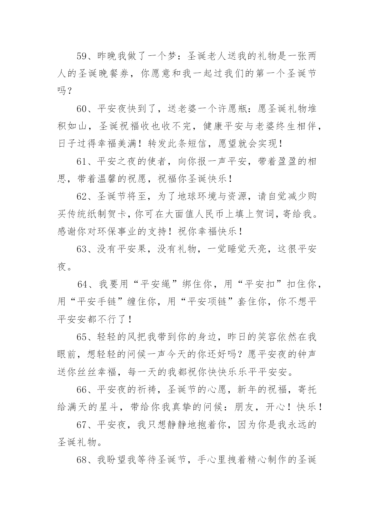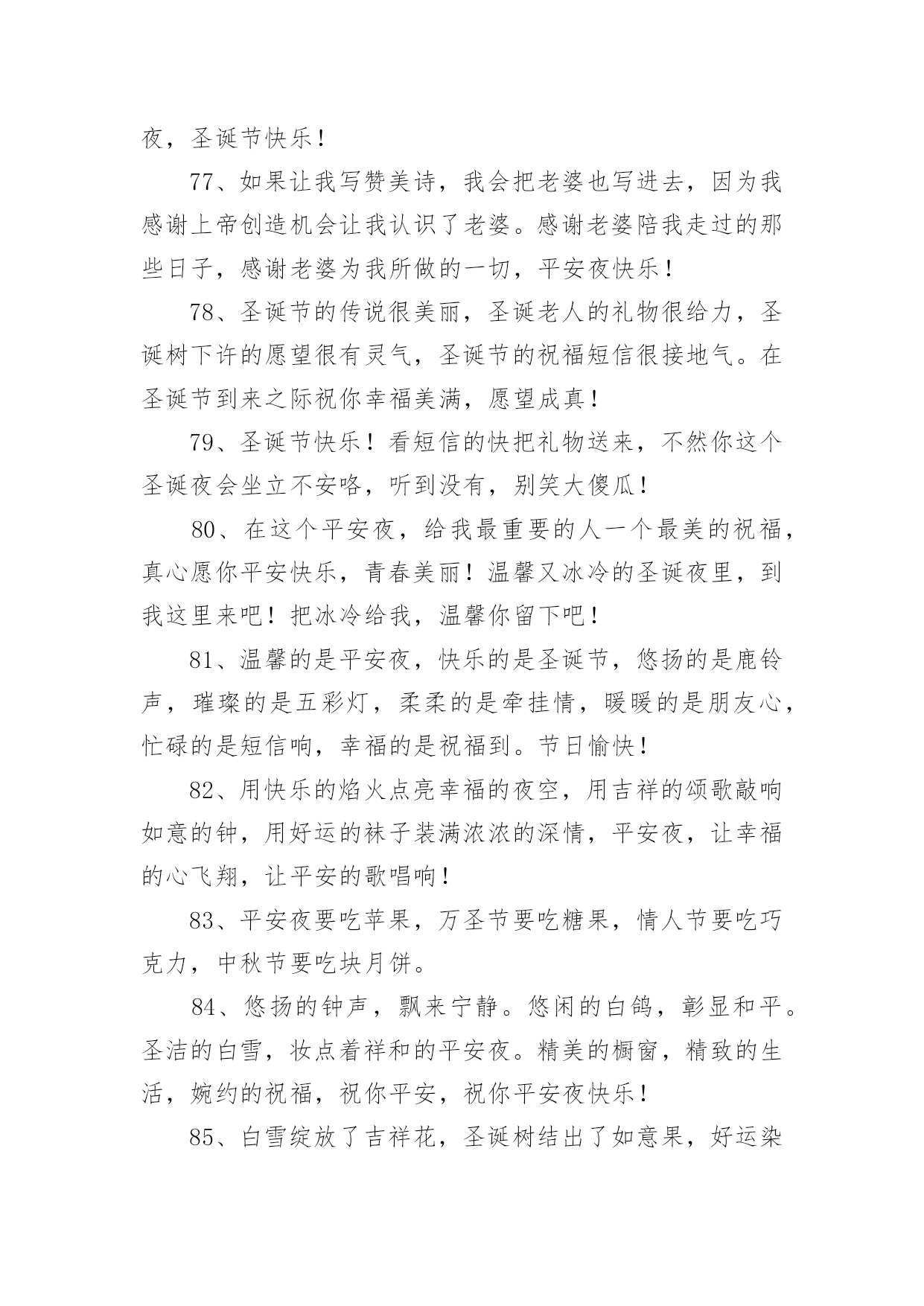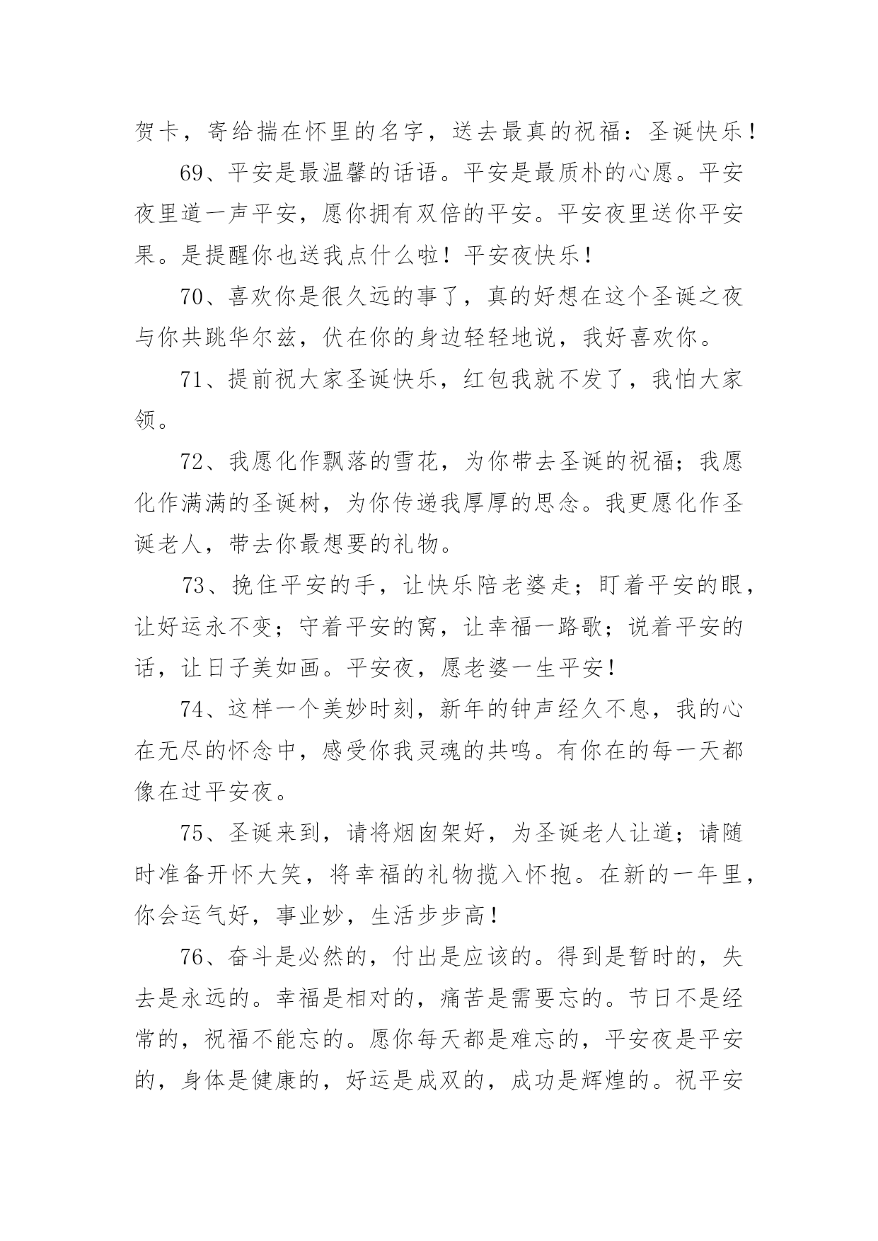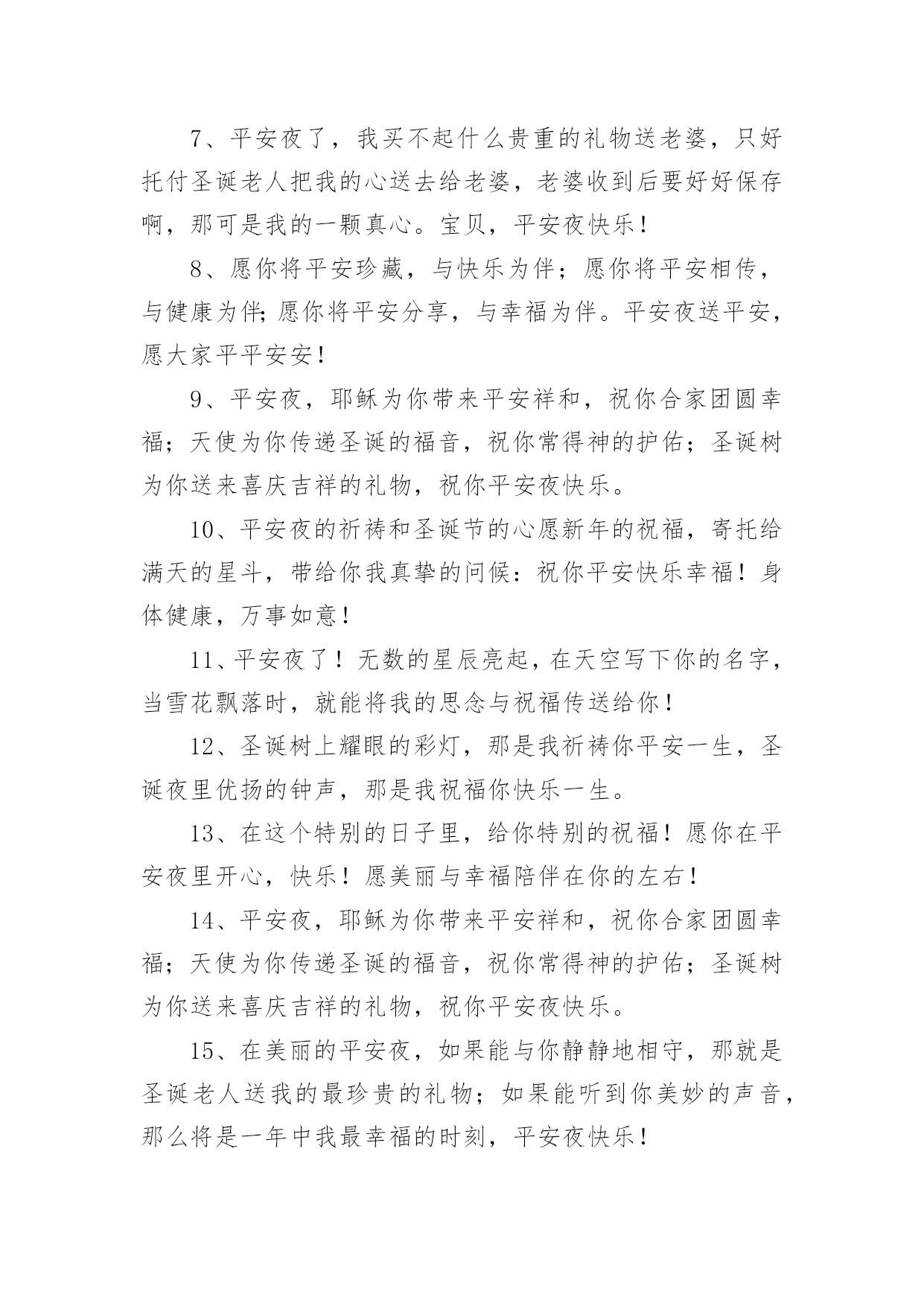 平安夜圣诞节文案在学习、工作、生活中,越来越多人青睐于在社交平台上发表文案,文案用以分享生活日常和自己的感悟。那么什么样的文案才是好的文案呢?以下是小编精心整理的平安夜圣诞节文案,欢迎大家分享。1、平安夜将至,我对你的祝福伴随着圣诞老人的脚步,走遍世界的每个角落,祝你在平安夜平平安安!2、海上升明月天涯共此时,平安夜让天各一方的我们静静坐在圣诞树下,彼此深深地思念吧,我相信定会有心灵感应,把浓浓的爱意传到老婆我心田。3、平安之夜大家忙,祝福收发累得慌。我用诚心攒祝福,一共三百六十五,今夜全部转给你,愿你平安每一天;我用爱心发短信,所有情谊和祝愿,融入此条短信中,平安夜里发给你,愿你幸福快乐!4、平安夜,我祝你平平安安;圣诞夜,我愿你幸福快乐;狂欢夜让你和那一位一起狂欢记住一定要点!5、千言万语,无法表述博大的母爱。千字万句,无法描写宽广的母恩。让我用短信祝福老妈,愿您健康长寿,幸福享受人生,祝您平安夜快乐,圣诞节更快乐!6、我向圣诞老人许了愿,我希望不管你的脚多臭,在明早当你穿起袜子时,等收到我托圣诞老人带给你的满满的祝福,暖暖你的心和脚丫子。7、平安夜了,我买不起什么贵重的礼物送老婆,只好托付圣诞老人把我的心送去给老婆,老婆收到后要好好保存啊,那可是我的一颗真心。宝贝,平安夜快乐!8、愿你将平安珍藏,与快乐为伴;愿你将平安相传,与健康为伴;愿你将平安分享,与幸福为伴。平安夜送平安,愿大家平平安安!9、平安夜,耶稣为你带来平安祥和,祝你合家团圆幸福;天使为你传递圣诞的福音,祝你常得神的护佑;圣诞树为你送来喜庆吉祥的礼物,祝你平安夜快乐。10、平安夜的祈祷和圣诞节的心愿新年的祝福,寄托给满天的星斗,带给你我真挚的问候:祝你平安快乐幸福!身体健康,万事如意!11、平安夜了!无数的星辰亮起,在天空写下你的名字,当雪花飘落时,就能将我的思念与祝福传送给你!12、圣诞树上耀眼的彩灯,那是我祈祷你平安一生,圣诞夜里优扬的钟声,那是我祝福你快乐一生。13、在这个特别的日子里,给你特别的祝福!愿你在平安夜里开心,快乐!愿美丽与幸福陪伴在你的左右!14、平安夜,耶稣为你带来平安祥和,祝你合家团圆幸福;天使为你传递圣诞的福音,祝你常得神的护佑;圣诞树为你送来喜庆吉祥的礼物,祝你平安夜快乐。15、在美丽的平安夜,如果能与你静静地相守,那就是圣诞老人送我的最珍贵的礼物;如果能听到你美妙的声音,那么将是一年中我最幸福的时刻,平安夜快乐!16、在这24号的晚上,煮两个鸡蛋,我吃一个,送给你的就是一个圣诞,祝你节日快乐!17、知道你会被铺天盖地的短信包围,英明的我一早就让祝福跨过高山越过高楼大厦穿过大街小巷,闪过卖茶叶蛋的老太太,钻进你的耳朵:圣诞快乐!18、在这美妙的时刻,愿你的心像乐园,盛开出娇艳的花朵;愿你的口像温泉,流淌出快乐的歌声;愿你的眼像画面,描绘出绚丽的色彩。圣诞快乐!19、爱是雪,情是花,变成雪花飘你家,铃儿响,鹿儿跑,把我的心儿带给你,平安夜,狂欢夜有你有我才精彩!20、收一收,心情愉悦;读一读,幸福蜜甜;存一存,好运连连;转一转,财富源源;一条短信贺平安,夜色浪漫在眼前。提前祝你平安夜快乐,身体康健。21、我总是发誓平安夜不睡觉,我想听屋顶上驯鹿奔跑的舞步,想在烟囱根那儿与圣诞老人握手。而这个圣诞节,在我看来,似乎没有什么比保持清醒更容易做到的事情了。22、不寻常的一夜即将在今夜,送老婆个苹果打发平安夜,保老婆平平安安日日夜夜,再送老婆百事可乐当琼浆玉液,一切惊喜都将在今夜,我先祝老婆有个快乐的平安夜。23、平安夜里祷告为你求平安,平安夜送上我最美的祝福;圣诞节里栽棵圣诞树,圣诞树摇曳你四季的幸福。平安夜、圣诞节祝你福禧双至,一生都有好运的眷顾!24、鹿儿走四方,欢歌乐飞扬;彩灯耀眼亮,闪闪暖心房;短信祝福长,身体永安康,好运一大筐,一生钱满仓!祝老婆平安夜吉祥,圣诞节快乐!25、你还没收到礼物吗?那就快去睡吧!你的饱嗝声吓着圣诞老人了。26、这一年的平安夜,又是自己一个人过,什么时候我才能有个人一起陪着过!27、我愿寒冬为你嘘寒问暖,让你温暖如春天;我愿平安夜与你相伴,寂寞如烟;我愿一年有365个圣诞,天天有礼物藏在你的袜间,不信熏不晕你!圣诞快乐!28、幸福与平安相关,开心与平安相连,美好与平安相接,健康与平安相映,平安夜到了,送出的是平安,收到的是幸福的相伴,开心的相随,美好相拥,健康的相依。愿你平安夜快乐。29、十二月里来喜事多,冬至团圆平安夜,圣诞快乐元旦欢。饺子汤圆包和谐,平安烛火照吉祥;烤鸡烤鸭藏学问,琴声炮声奏凯歌;玉树长袜存好运,一生福气享不完。30、圣诞老人说所谓幸福是一个有健康的身体,有深爱你的人,一帮可依赖的朋友,当你收到此信息时,一切随之拥有。31、尽管岁月悠悠,尽管生活碌碌,我还是愿意为老婆停下脚步,用