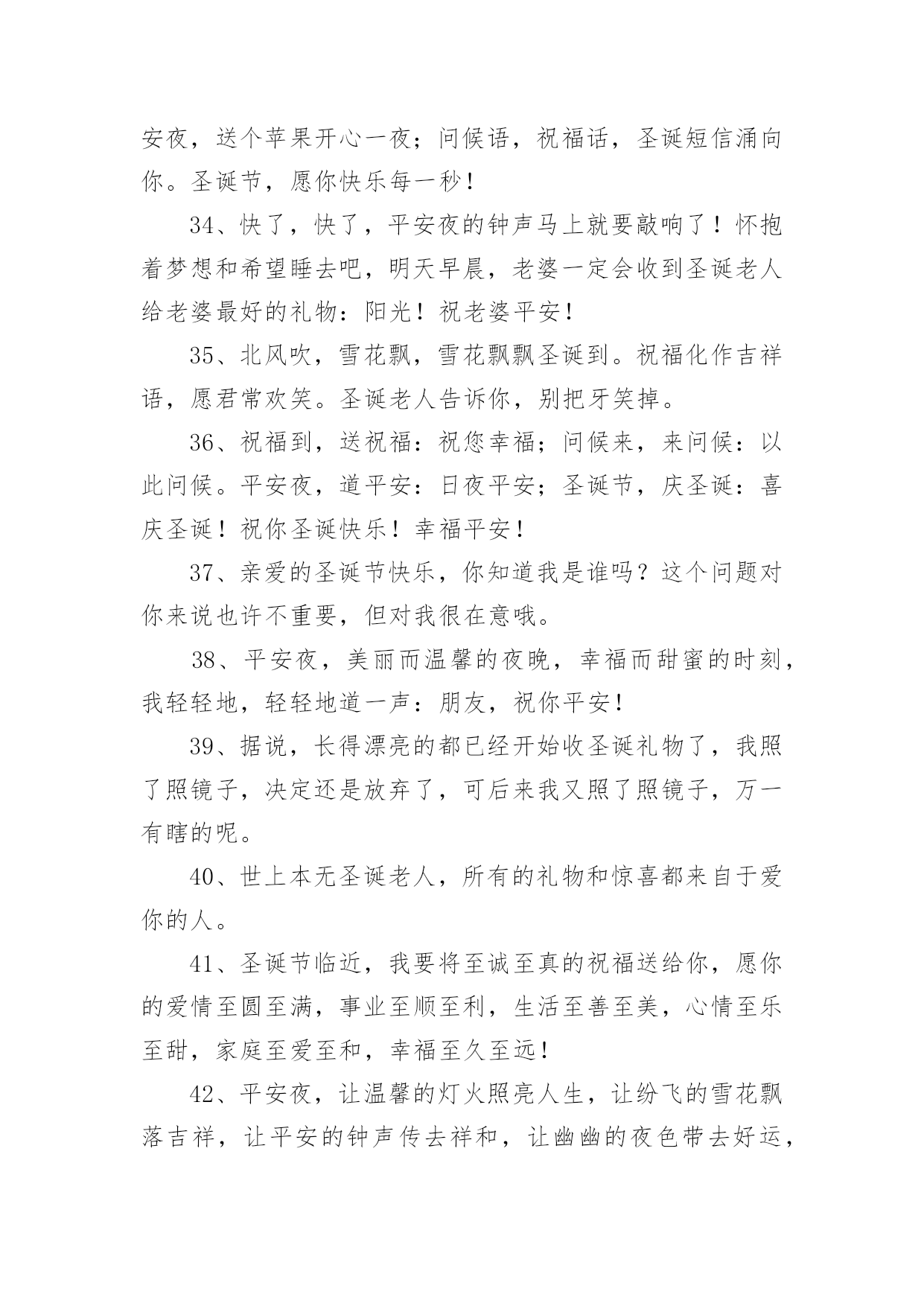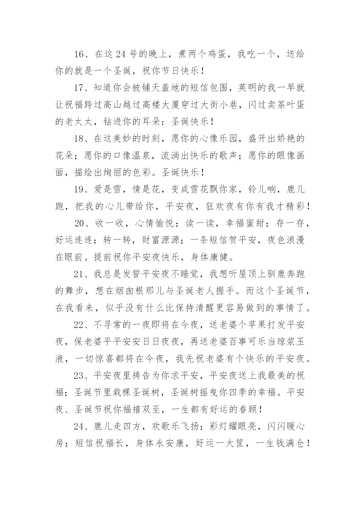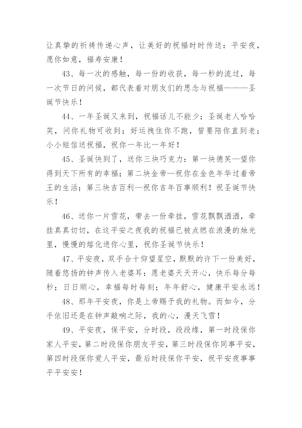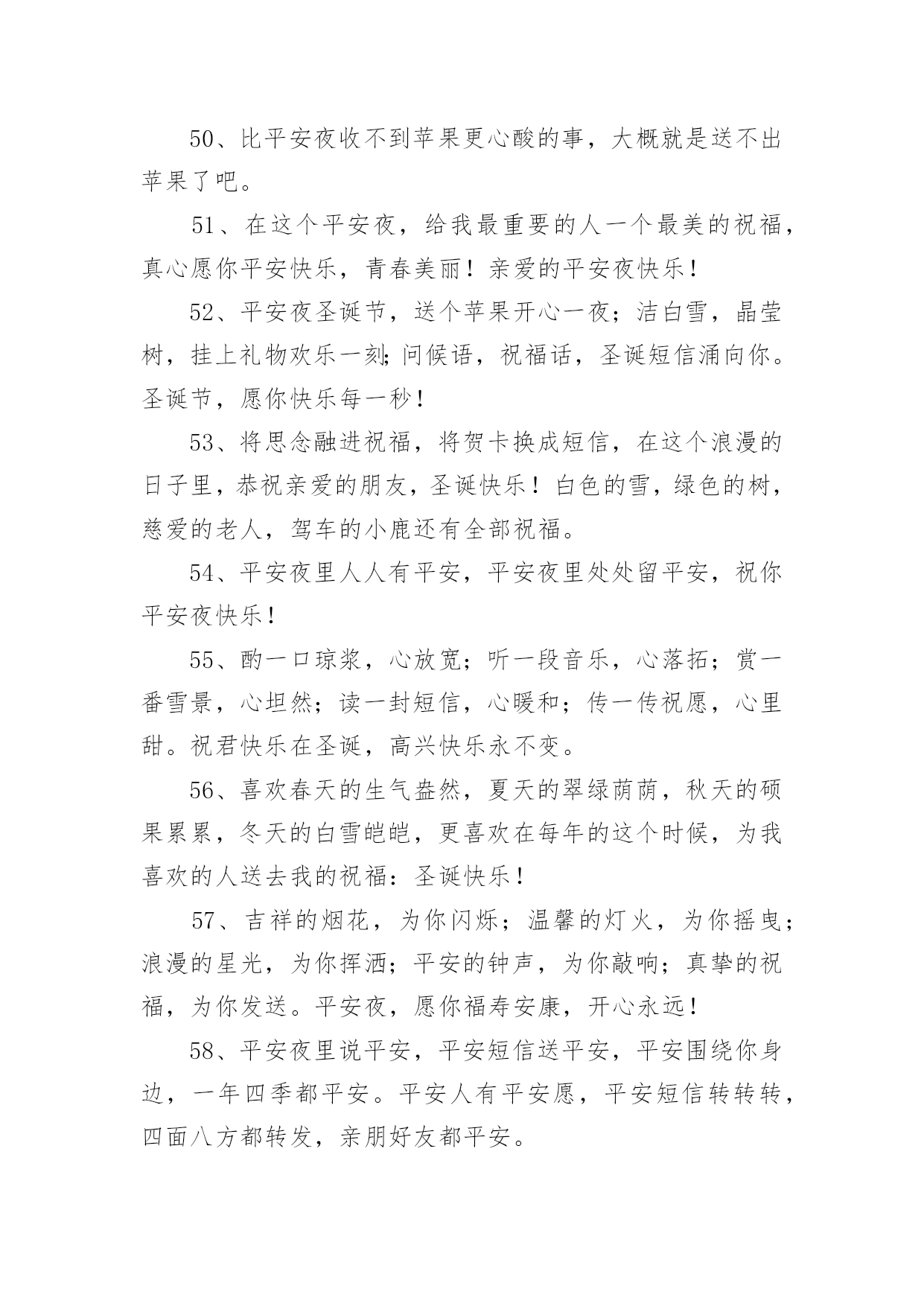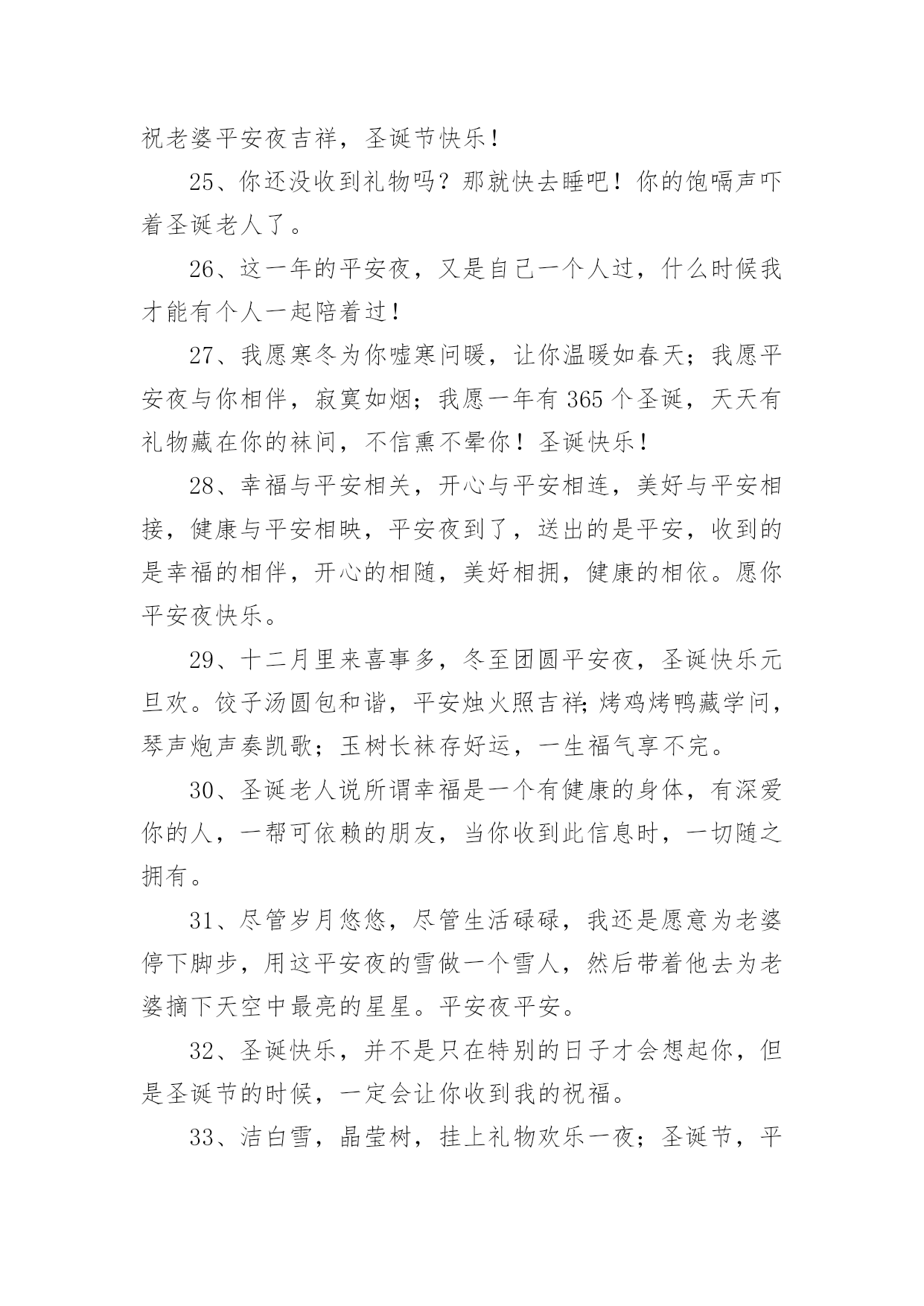 平安夜圣诞节文案在学习、工作、生活中,越来越多人青睐于在社交平台上发表文案,文案用以分享生活日常和自己的感悟。那么什么样的文案才是好的文案呢?以下是小编精心整理的平安夜圣诞节文案,欢迎大家分享。1、平安夜将至,我对你的祝福伴随着圣诞老人的脚步,走遍世界的每个角落,祝你在平安夜平平安安!2、海上升明月天涯共此时,平安夜让天各一方的我们静静坐在圣诞树下,彼此深深地思念吧,我相信定会有心灵感应,把浓浓的爱意传到老婆我心田。3、平安之夜大家忙,祝福收发累得慌。我用诚心攒祝福,一共三百六十五,今夜全部转给你,愿你平安每一天;我用爱心发短信,所有情谊和祝愿,融入此条短信中,平安夜里发给你,愿你幸福快乐!4、平安夜,我祝你平平安安;圣诞夜,我愿你幸福快乐;狂欢夜让你和那一位一起狂欢记住一定要点!5、千言万语,无法表述博大的母爱。千字万句,无法描写宽广的母恩。让我用短信祝福老妈,愿您健康长寿,幸福享受人生,祝您平安夜快乐,圣诞节更快乐!6、我向圣诞老人许了愿,我希望不管你的脚多臭,在明早当你穿起袜子时,等收到我托圣诞老人带给你的满满的祝福,暖暖你的心和脚丫子。7、平安夜了,我买不起什么贵重的礼物送老婆,只好托付圣诞老人把我的心送去给老婆,老婆收到后要好好保存啊,那可是我的一颗真心。宝贝,平安夜快乐!8、愿你将平安珍藏,与快乐为伴;愿你将平安相传,与健康为伴;愿你将平安分享,与幸福为伴。平安夜送平安,愿大家平平安安!9、平安夜,耶稣为你带来平安祥和,祝你合家团圆幸福;天使为你传递圣诞的福音,祝你常得神的护佑;圣诞树为你送来喜庆吉祥的礼物,祝你平安夜快乐。10、平安夜的祈祷和圣诞节的心愿新年的祝福,寄托给满天的星斗,带给你我真挚的问候:祝你平安快乐幸福!身体健康,万事如意!11、平安夜了!无数的星辰亮起,在天空写下你的名字,当雪花飘落时,就能将我的思念与祝福传送给你!12、圣诞树上耀眼的彩灯,那是我祈祷你平安一生,圣诞夜里优扬的钟声,那是我祝福你快乐一生。13、在这个特别的日子里,给你特别的祝福!愿你在平安夜里开心,快乐!愿美丽与幸福陪伴在你的左右!14、平安夜,耶稣为你带来平安祥和,祝你合家团圆幸福;天使为你传递圣诞的福音,祝你常得神的护佑;圣诞树为你送来喜庆吉祥的礼物,祝你平安夜快乐。15、在美丽的平安夜,如果能与你静静地相守,那就是圣诞老人送我的最珍贵的礼物;如果能听到你美妙的声音,那么将是一年中我最幸福的时刻,平安夜快乐!16、在这24号的晚上,煮两个鸡蛋,我吃一个,送给你的就是一个圣诞,祝你节日快乐!17、知道你会被铺天盖地的短信包围,英明的我一早就让祝福跨过高山越过高楼大厦穿过大街小巷,闪过卖茶叶蛋的老太太,钻进你的耳朵:圣诞快乐!18、在这美妙的时刻,愿你的心像乐园,盛开出娇艳的花朵;愿你的口像温泉,流淌出快乐的歌声;愿你的眼像画面,描绘出绚丽的色彩。圣诞快乐!19、爱是雪,情是花,变成雪花飘你家,铃儿响,鹿儿跑,把我的心儿带给你,平安夜,狂欢夜有你有我才精彩!20、收一收,心情愉悦;读一读,幸福蜜甜;存一存,好运连连;转一转,财富源源;一条短信贺平安,夜色浪漫在眼前。提前祝你平安夜快乐,身体康健。21、我总是发誓平安夜不睡觉,我想听屋顶上驯鹿奔跑的舞步,想在烟囱根那儿与圣诞老人握手。而这个圣诞节,在我看来,似乎没有什么比保持清醒更容易做到的事情了。22、不寻常的一夜即将在今夜,送老婆个苹果打发平安夜,保老婆平平安安日日夜夜,再送老婆百事可乐当琼浆玉液,一切惊喜都将在今夜,我先祝老婆有个快乐的平安夜。23、平安夜里祷告为你求平安,平安夜送上我最美的祝福;圣诞节里栽棵圣诞树,圣诞树摇曳你四季的幸福。平安夜、圣诞节祝你福禧双至,一生都有好运的眷顾!24、鹿儿走四方,欢歌乐飞扬;彩灯耀眼亮,闪闪暖心房;短信祝福长,身体永安康,好运一大筐,一生钱满仓!祝老婆平安夜吉祥,圣诞节快乐!25、你还没收到礼物吗?那就快去睡吧!你的饱嗝声吓着圣诞老人了。26、这一年的平安夜,又是自己一个人过,什么时候我才能有个人一起陪着过!27、我愿寒冬为你嘘寒问暖,让你温暖如春天;我愿平安夜与你相伴,寂寞如烟;我愿一年有365个圣诞,天天有礼物藏在你的袜间,不信熏不晕你!圣诞快乐!28、幸福与平安相关,开心与平安相连,美好与平安相接,健康与平安相映,平安夜到了,送出的是平安,收到的是幸福的相伴,开心的相随,美好相拥,健康的相依。愿你平安夜快乐。29、十二月里来喜事多,冬至团圆平安夜,圣诞快乐元旦欢。饺子汤圆包和谐,平安烛火照吉祥;烤鸡烤鸭藏学问,琴声炮声奏凯歌;玉树长袜存好运,一生福气享不完。30、圣诞老人说所谓幸福是一个有健康的身体,有深爱你的人,一帮可依赖的朋友,当你收到此信息时,一切随之拥有。31、尽管岁月悠悠,尽管生活碌碌,我还是愿意为老婆停下脚步,用