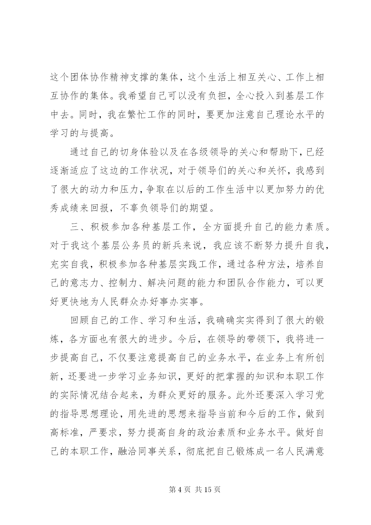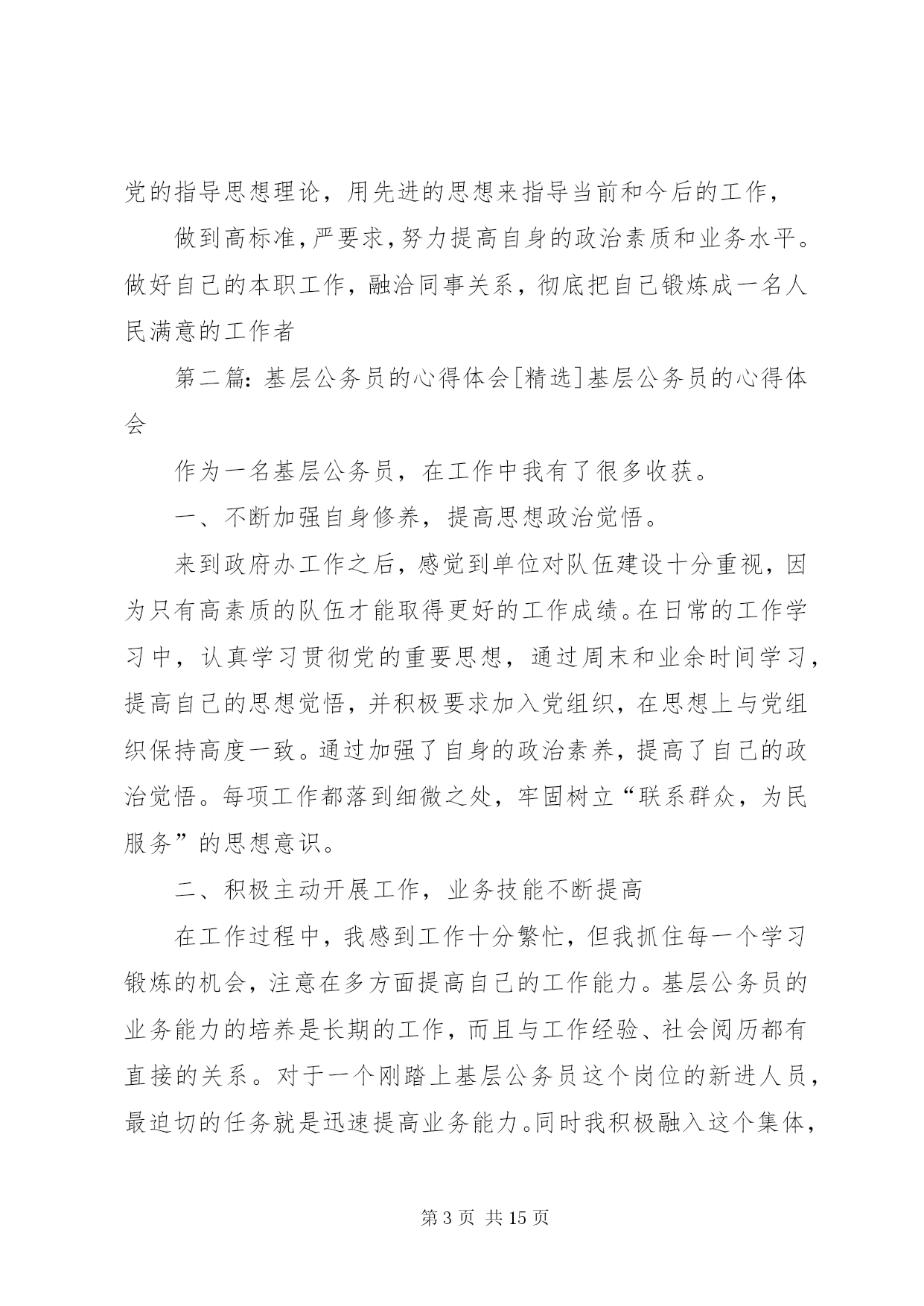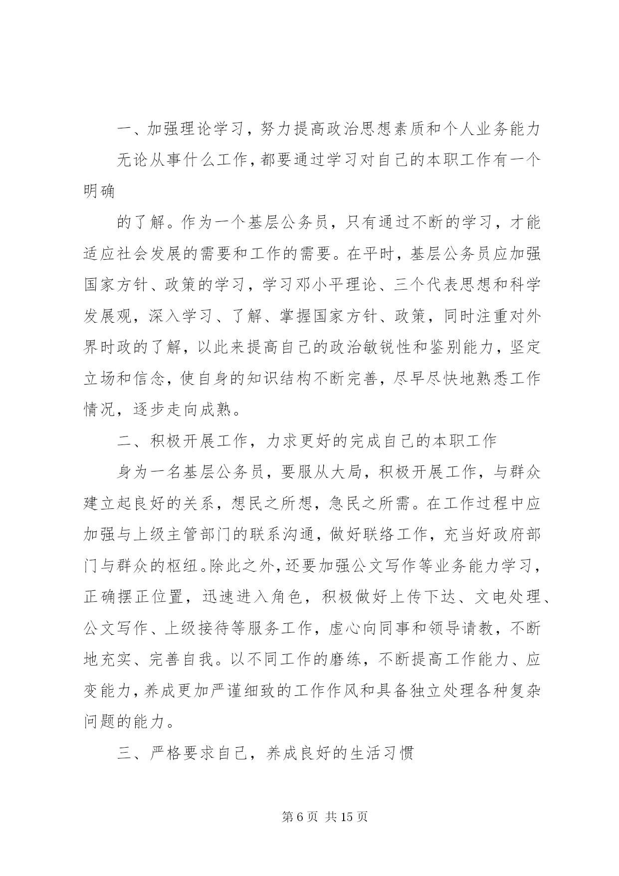 第PAGE\*Arabic\*MERGEFORMAT15页共NUMPAGES\*MERGEFORMAT15页基层公务员的心得体会通过2012年的省级联考,我成为乡政府的一名基层公务员,在忙碌中,为期一年的实习阶段马上快过去了,在这段时间里,我有了很多收获。一、不断加强自身修养,提高思想政治觉悟。来到乡政府工作之后,我分配到了办公室,在这里感觉单位对队伍建设十分重视,因为只有高素质的队伍才能取得更好的工作成绩。在日常的工作学习中,认真学习贯彻党的重要思想,通过周六和业余时间学习,提高自己的思想觉悟,并积极要求加入党组织,在思想上与党组织保持高度一致。其次,我还参加了国家公务员初任培训,加强了自身的政治素养,提高了自己的政治觉悟。在乡办公室的工作中,我认真做好督查、会议贯彻落实情况汇报等上报工作,做好综治、上传下达文件、计算机管理等工作。每项工作都落到细微之处,牢固树立“联系群众,为民服务”的思想意识。在过去的一年里,我参加了乡里每一次政治学习,每次我都用心领会、认真讨论、积极发言,做好会议记录和学习总结。二、积极主动开展工作,业务技能不断提高实习的一年中,我感到工作十分繁忙,但我抓住每一个学习锻炼的机会,注意在多方面提高自己的工作能力。基层公务员的业务能力的培养是长期的工作,而且与工作经验、社会阅历都有直接的关系。对于一个刚踏上基层公务员这个岗位的新进人员,最迫切的任务就是迅速提高业务能力。由于离家较远,而且加之对生活习惯一直不适应,造成工作学习上的一度耽误。但现在我已融入这个集体,这个团体协作精神支撑的集体,这个生活上相互关心、工作上相互协作的集体。我希望自己可以没有负担,全心投入到基层工作中去。同时,我在繁忙工作的同时,要更加注意自己理论水平的学习的与提高。通过近一年的体验以及在各级领导的关心和帮助下,已经逐渐适应了这边的工作状况,对于领导们的关心和关怀,我感到了很大的动力和压力,争取在以后的工作生活中以更加努力的优秀成绩来回报,不辜负领导们的期望。三、积极参加各种基层工作,全方面提升自己的能力素质。对于我这个基层公务员的新兵来说,我应该不断努力提升自我,充实自我,积极参加各种基层实践工作,通过各种方法,培养自己的意志力、控制力、解决问题的能力和团队合作能力,可以更好更快地为人民群众办好事办实事。回顾近一年的工作、学习和生活,我确确实实得到了很大的锻炼,各方面也有很大的进步。今后,在领导的带领下,我将进一步提高自己,不仅要注意提高自己的业务水平,在业务上有所创新,还要进一步学习业务知识,更好的把掌握的知识和本职工作的实际情况结合起来,为群众更好的服务。此外还要深入学习党的指导思想理论,用先进的思想来指导当前和今后的工作,做到高标准,严要求,努力提高自身的政治素质和业务水平。做好自己的本职工作,融洽同事关系,彻底把自己锻炼成一名人民满意的工作者第二篇:基层公务员的心得体会[精选]基层公务员的心得体会作为一名基层公务员,在工作中我有了很多收获。一、不断加强自身修养,提高思想政治觉悟。来到政府办工作之后,感觉到单位对队伍建设十分重视,因为只有高素质的队伍才能取得更好的工作成绩。在日常的工作学习中,认真学习贯彻党的重要思想,通过周末和业余时间学习,提高自己的思想觉悟,并积极要求加入党组织,在思想上与党组织保持高度一致。通过加强了自身的政治素养,提高了自己的政治觉悟。每项工作都落到细微之处,牢固树立“联系群众,为民服务”的思想意识。二、积极主动开展工作,业务技能不断提高在工作过程中,我感到工作十分繁忙,但我抓住每一个学习锻炼的机会,注意在多方面提高自己的工作能力。基层公务员的业务能力的培养是长期的工作,而且与工作经验、社会阅历都有直接的关系。对于一个刚踏上基层公务员这个岗位的新进人员,最迫切的任务就是迅速提高业务能力。同时我积极融入这个集体,这个团体协作精神支撑的集体,这个生活上相互关心、工作上相互协作的集体。我希望自己可以没有负担,全心投入到基层工作中去。同时,我在繁忙工作的同时,要更加注意自己理论水平的学习的与提高。通过自己的切身体验以及在各级领导的关心和帮助下,已经逐渐适应了这边的工作状况,对于领导们的关心和关怀,我感到了很大的动力和压力,争取在以后的工作生活中以更加努力的优秀成绩来回报,不辜负领导们的期望。三、积极参加各种基层工作,全方面提升自己的能力素质。对于我这个基层公务员的新兵来说,我应该不断努力提升自我,充实自我,积极参加各种基层实践工作,通过各种方法,培养自己的意志力、控制力、解决问题的能力和团队合作能力,可以更好更快地为人民群众办好事办实事。回顾自己的工作、学习和生活,我确确实实得到了很大的锻炼,各方面也有很大的进步。今后,在领导的带领下,我将进一步提高自己,不仅要注意提高自己的业务水平,