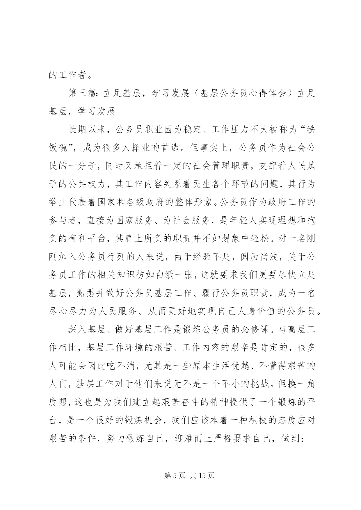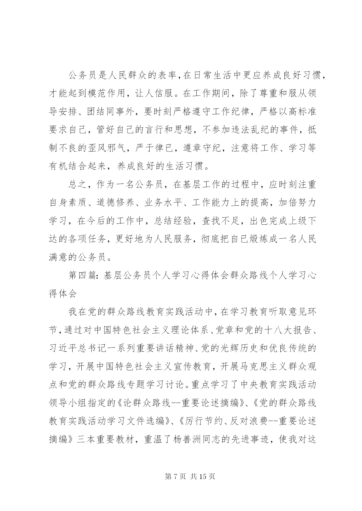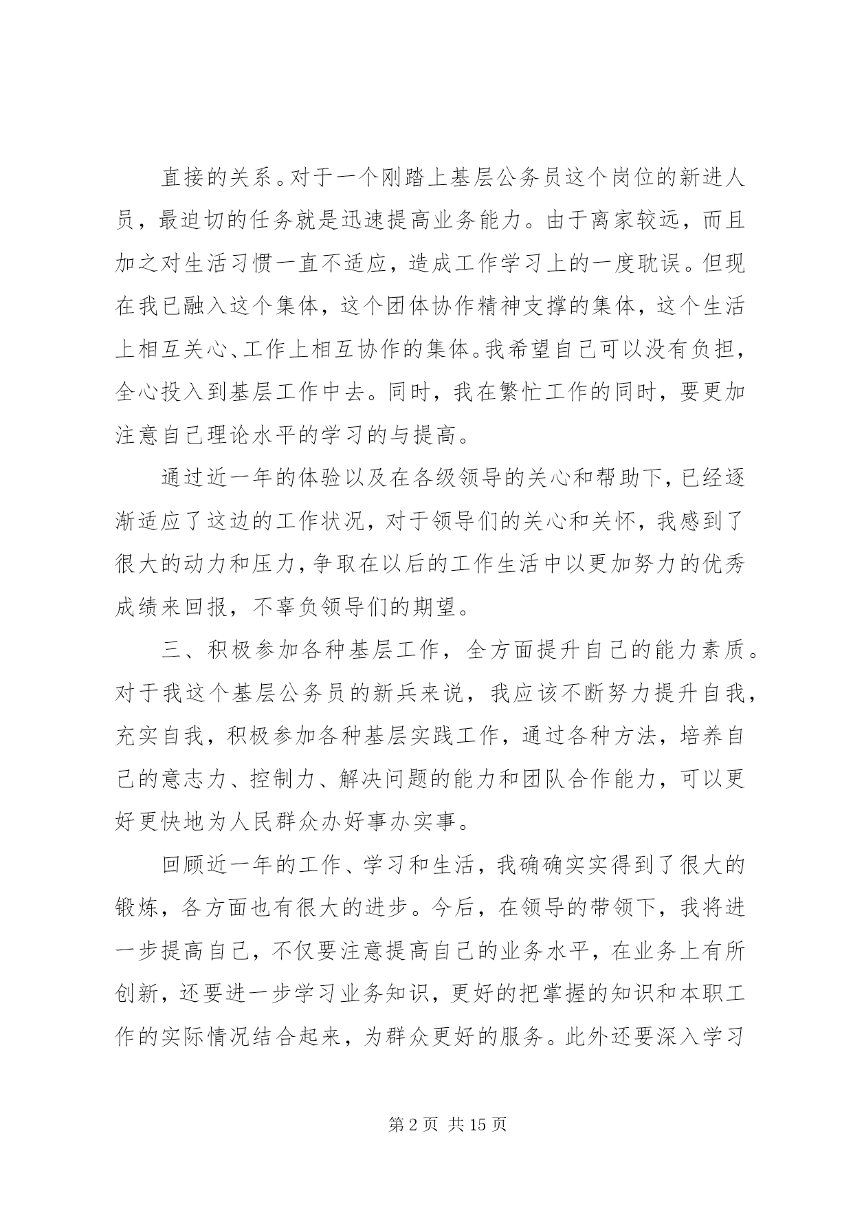 第PAGE\*Arabic\*MERGEFORMAT15页共NUMPAGES\*MERGEFORMAT15页基层公务员的心得体会通过2012年的省级联考,我成为乡政府的一名基层公务员,在忙碌中,为期一年的实习阶段马上快过去了,在这段时间里,我有了很多收获。一、不断加强自身修养,提高思想政治觉悟。来到乡政府工作之后,我分配到了办公室,在这里感觉单位对队伍建设十分重视,因为只有高素质的队伍才能取得更好的工作成绩。在日常的工作学习中,认真学习贯彻党的重要思想,通过周六和业余时间学习,提高自己的思想觉悟,并积极要求加入党组织,在思想上与党组织保持高度一致。其次,我还参加了国家公务员初任培训,加强了自身的政治素养,提高了自己的政治觉悟。在乡办公室的工作中,我认真做好督查、会议贯彻落实情况汇报等上报工作,做好综治、上传下达文件、计算机管理等工作。每项工作都落到细微之处,牢固树立“联系群众,为民服务”的思想意识。在过去的一年里,我参加了乡里每一次政治学习,每次我都用心领会、认真讨论、积极发言,做好会议记录和学习总结。二、积极主动开展工作,业务技能不断提高实习的一年中,我感到工作十分繁忙,但我抓住每一个学习锻炼的机会,注意在多方面提高自己的工作能力。基层公务员的业务能力的培养是长期的工作,而且与工作经验、社会阅历都有直接的关系。对于一个刚踏上基层公务员这个岗位的新进人员,最迫切的任务就是迅速提高业务能力。由于离家较远,而且加之对生活习惯一直不适应,造成工作学习上的一度耽误。但现在我已融入这个集体,这个团体协作精神支撑的集体,这个生活上相互关心、工作上相互协作的集体。我希望自己可以没有负担,全心投入到基层工作中去。同时,我在繁忙工作的同时,要更加注意自己理论水平的学习的与提高。通过近一年的体验以及在各级领导的关心和帮助下,已经逐渐适应了这边的工作状况,对于领导们的关心和关怀,我感到了很大的动力和压力,争取在以后的工作生活中以更加努力的优秀成绩来回报,不辜负领导们的期望。三、积极参加各种基层工作,全方面提升自己的能力素质。对于我这个基层公务员的新兵来说,我应该不断努力提升自我,充实自我,积极参加各种基层实践工作,通过各种方法,培养自己的意志力、控制力、解决问题的能力和团队合作能力,可以更好更快地为人民群众办好事办实事。回顾近一年的工作、学习和生活,我确确实实得到了很大的锻炼,各方面也有很大的进步。今后,在领导的带领下,我将进一步提高自己,不仅要注意提高自己的业务水平,在业务上有所创新,还要进一步学习业务知识,更好的把掌握的知识和本职工作的实际情况结合起来,为群众更好的服务。此外还要深入学习党的指导思想理论,用先进的思想来指导当前和今后的工作,做到高标准,严要求,努力提高自身的政治素质和业务水平。做好自己的本职工作,融洽同事关系,彻底把自己锻炼成一名人民满意的工作者第二篇:基层公务员的心得体会[精选]基层公务员的心得体会作为一名基层公务员,在工作中我有了很多收获。一、不断加强自身修养,提高思想政治觉悟。来到政府办工作之后,感觉到单位对队伍建设十分重视,因为只有高素质的队伍才能取得更好的工作成绩。在日常的工作学习中,认真学习贯彻党的重要思想,通过周末和业余时间学习,提高自己的思想觉悟,并积极要求加入党组织,在思想上与党组织保持高度一致。通过加强了自身的政治素养,提高了自己的政治觉悟。每项工作都落到细微之处,牢固树立“联系群众,为民服务”的思想意识。二、积极主动开展工作,业务技能不断提高在工作过程中,我感到工作十分繁忙,但我抓住每一个学习锻炼的机会,注意在多方面提高自己的工作能力。基层公务员的业务能力的培养是长期的工作,而且与工作经验、社会阅历都有直接的关系。对于一个刚踏上基层公务员这个岗位的新进人员,最迫切的任务就是迅速提高业务能力。同时我积极融入这个集体,这个团体协作精神支撑的集体,这个生活上相互关心、工作上相互协作的集体。我希望自己可以没有负担,全心投入到基层工作中去。同时,我在繁忙工作的同时,要更加注意自己理论水平的学习的与提高。通过自己的切身体验以及在各级领导的关心和帮助下,已经逐渐适应了这边的工作状况,对于领导们的关心和关怀,我感到了很大的动力和压力,争取在以后的工作生活中以更加努力的优秀成绩来回报,不辜负领导们的期望。三、积极参加各种基层工作,全方面提升自己的能力素质。对于我这个基层公务员的新兵来说,我应该不断努力提升自我,充实自我,积极参加各种基层实践工作,通过各种方法,培养自己的意志力、控制力、解决问题的能力和团队合作能力,可以更好更快地为人民群众办好事办实事。回顾自己的工作、学习和生活,我确确实实得到了很大的锻炼,各方面也有很大的进步。今后,在领导的带领下,我将进一步提高自己,不仅要注意提高自己的业务水平,
