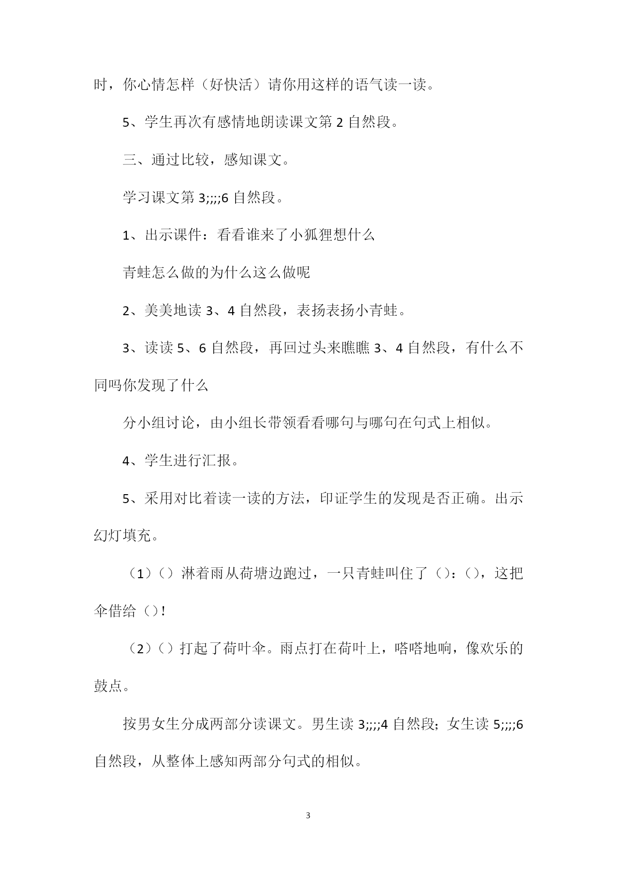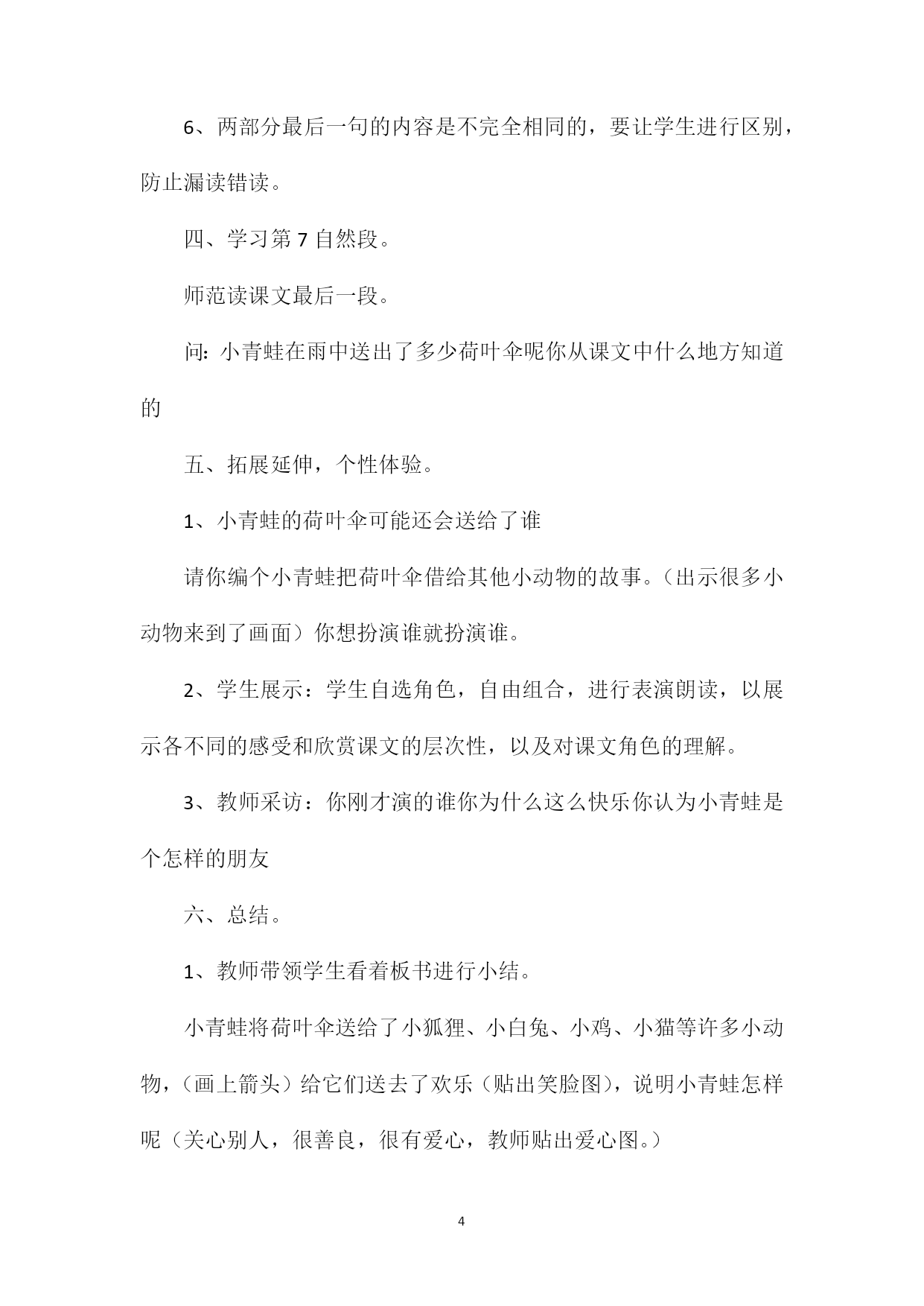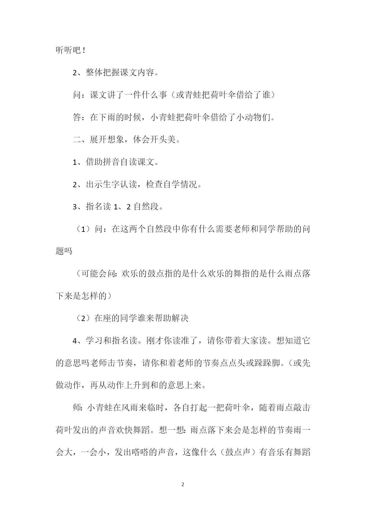 PAGEPAGE5《荷叶伞》教学设计朗读感悟课教案教学目标:1、正确、流利、有感情地朗读课文。2、喜爱童话故事,能借助课文续编、演青蛙借伞的故事。3、感悟人与人之间要热心、互助、友爱相处的交际情感。教学重点、难点:1、正确、流利、有感情地朗读课文。2、乐于续编故事,懂得互相关心。教具准备:课件、配乐朗读录音。教学过程:一、创设情景,引发情感。1、激趣导入。(1)课件出示荷叶图。师:你们知道这是什么吗你在哪里见过它吗你觉得它像什么(教师相机板书课题:10、荷叶伞)(2)看画面,听课文配乐朗读,整体感知课文。在美丽的荷花塘边,一场欢乐的音乐会正在进行,让我们一起去听听吧!2、整体把握课文内容。问:课文讲了一件什么事(或青蛙把荷叶伞借给了谁)答:在下雨的时候,小青蛙把荷叶伞借给了小动物们。二、展开想象,体会开头美。1、借助拼音自读课文。2、出示生字认读,检查自学情况。3、指名读1、2自然段。(1)问:在这两个自然段中你有什么需要老师和同学帮助的问题吗(可能会问:欢乐的鼓点指的是什么欢乐的舞指的是什么雨点落下来是怎样的)(2)在座的同学谁来帮助解决4、学习和指名读。刚才你读准了,请你带着大家读。想知道它的意思吗老师击节奏,请你和着老师的节奏点点头或跺跺脚。(或先做动作,再从动作上升到和的意思上来。师:小青蛙在风雨来临时,各自打起一把荷叶伞,随着雨点敲击荷叶发出的声音欢快舞蹈。想一想:雨点落下来会是怎样的节奏雨一会大,一会小,发出嗒嗒的声音,这像什么(鼓点声)有音乐有舞蹈时,你心情怎样(好快活)请你用这样的语气读一读。5、学生再次有感情地朗读课文第2自然段。三、通过比较,感知课文。学习课文第3;;;;6自然段。1、出示课件:看看谁来了小狐狸想什么青蛙怎么做的为什么这么做呢2、美美地读3、4自然段,表扬表扬小青蛙。3、读读5、6自然段,再回过头来瞧瞧3、4自然段,有什么不同吗你发现了什么分小组讨论,由小组长带领看看哪句与哪句在句式上相似。4、学生进行汇报。5、采用对比着读一读的方法,印证学生的发现是否正确。出示幻灯填充。(1)()淋着雨从荷塘边跑过,一只青蛙叫住了():(),这把伞借给()!(2)()打起了荷叶伞。雨点打在荷叶上,嗒嗒地响,像欢乐的鼓点。按男女生分成两部分读课文。男生读3;;;;4自然段;女生读5;;;;6自然段,从整体上感知两部分句式的相似。6、两部分最后一句的内容是不完全相同的,要让学生进行区别,防止漏读错读。四、学习第7自然段。师范读课文最后一段。问:小青蛙在雨中送出了多少荷叶伞呢你从课文中什么地方知道的五、拓展延伸,个性体验。1、小青蛙的荷叶伞可能还会送给了谁请你编个小青蛙把荷叶伞借给其他小动物的故事。(出示很多小动物来到了画面)你想扮演谁就扮演谁。2、学生展示:学生自选角色,自由组合,进行表演朗读,以展示各不同的感受和欣赏课文的层次性,以及对课文角色的理解。3、教师采访:你刚才演的谁你为什么这么快乐你认为小青蛙是个怎样的朋友六、总结。1、教师带领学生看着板书进行小结。小青蛙将荷叶伞送给了小狐狸、小白兔、小鸡、小猫等许多小动物,(画上箭头)给它们送去了欢乐(贴出笑脸图),说明小青蛙怎样呢(关心别人,很善良,很有爱心,教师贴出爱心图。)2、背诵你喜欢的自然段。板书设计: