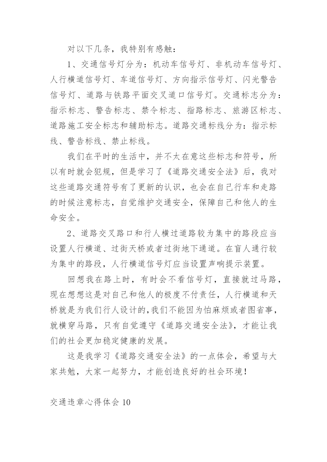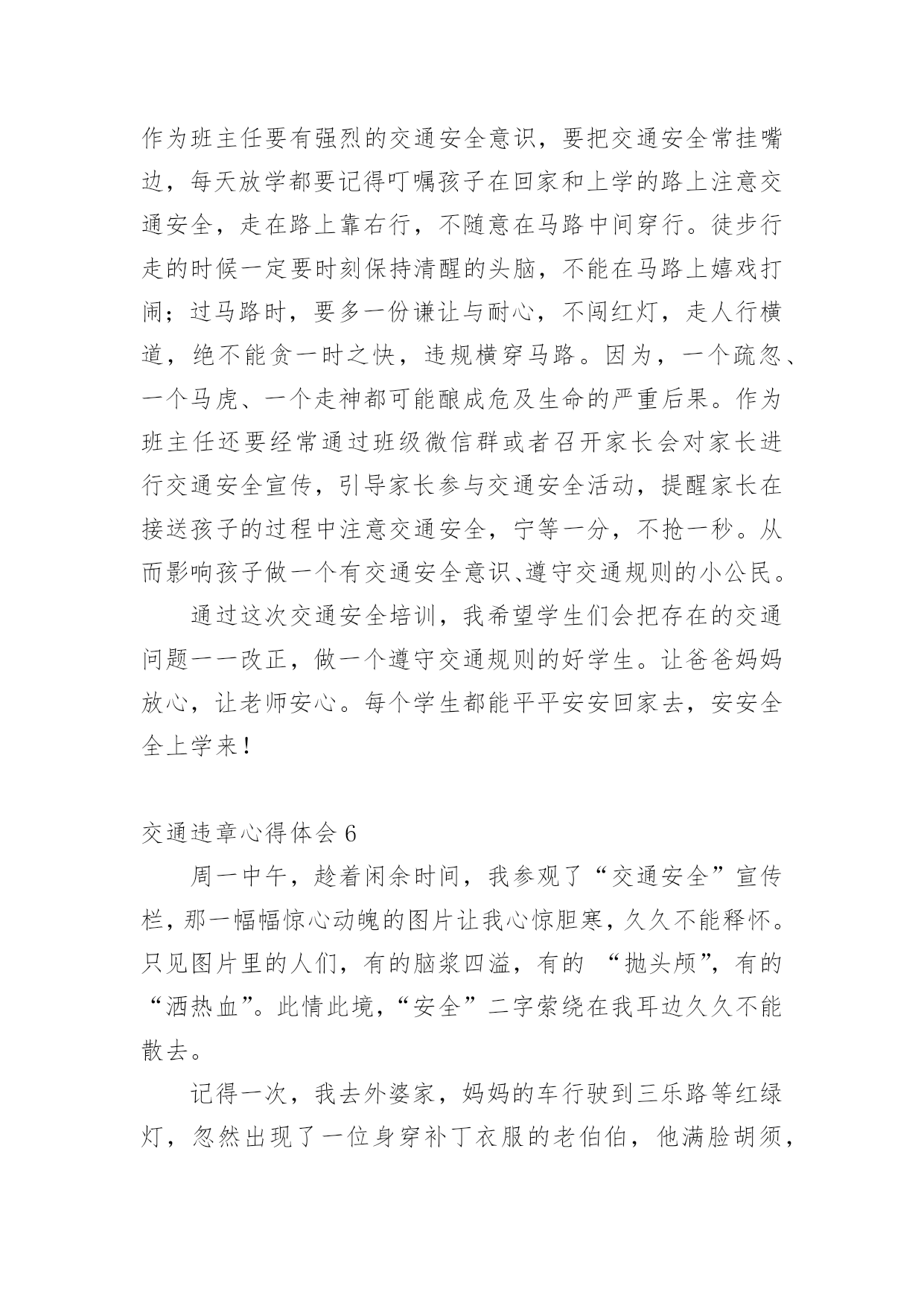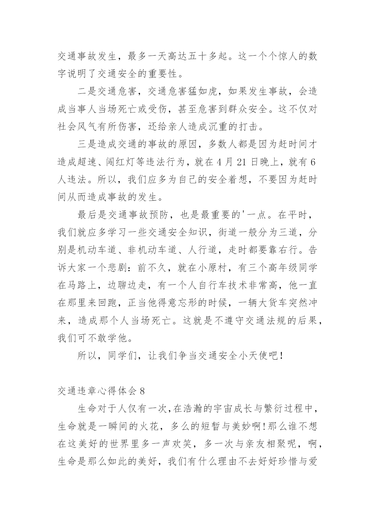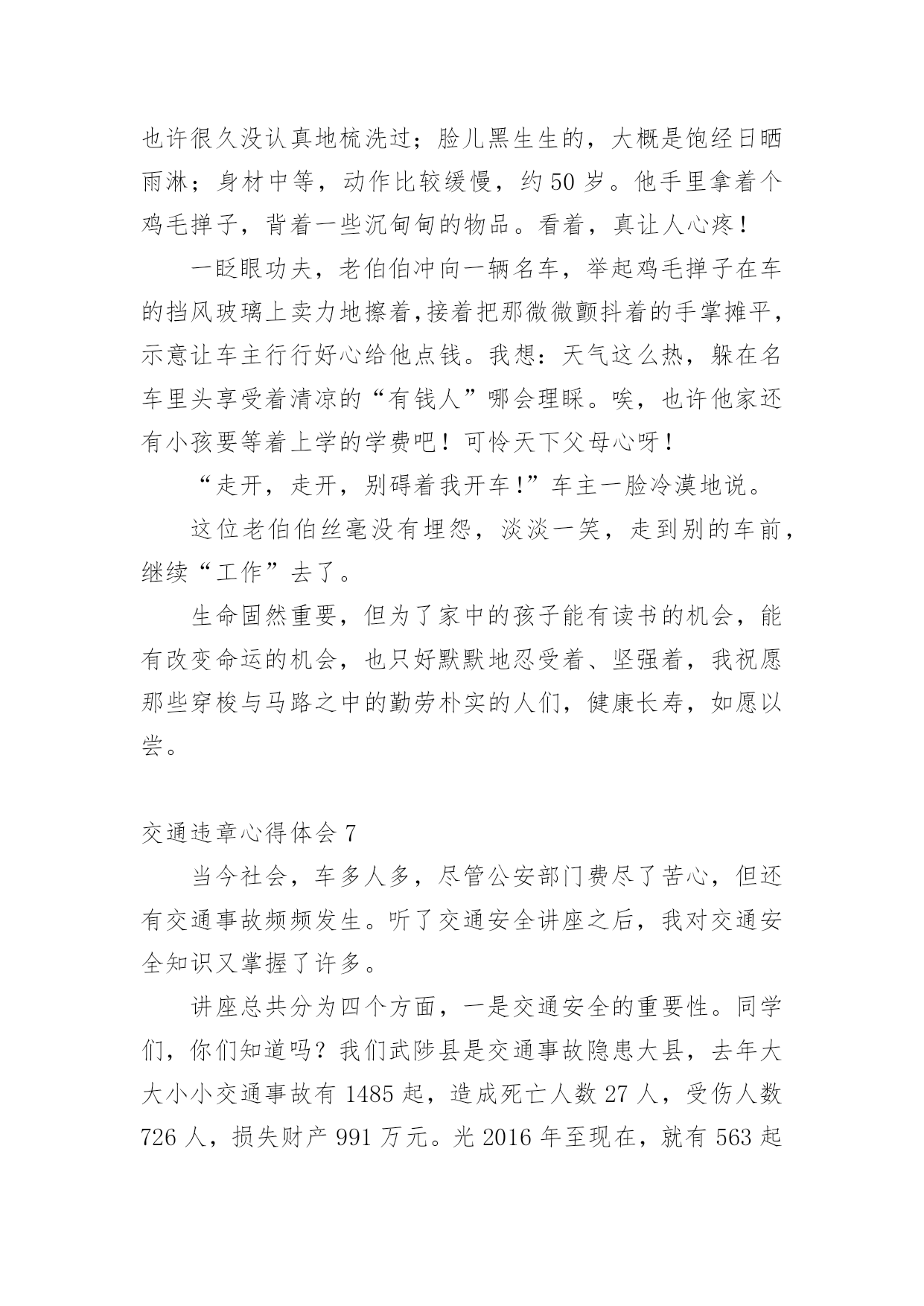 交通违章心得体会交通违章心得体会500字(通用12篇)我们得到了一些心得体会以后,常常可以将它们写成一篇心得体会,这样能够给人努力向前的动力。那么问题来了,应该如何写心得体会呢?下面是小编帮大家整理的交通违章心得体会500字(通用12篇),欢迎大家分享。交通违章心得体会1当汽车不断穿梭在拥挤的道路上,当红绿灯闪烁交替,交通安全司空见惯,人们再也不能平凡的平凡意识逐渐淡化或加深。当红色指示灯亮起时,仍然有轰鸣的车辆。为什么呢?为什么呢?难道他们不知道,有了这样的放纵,可能会有一个鲜活的生命在一瞬间消失,他们可能是自己,也可能是同车的伙伴,也可能是无辜的路人,为了争夺这短短的几秒钟,他们已经在脑海里想过了吗?几秒钟的价格是多少?他不会是唯一一个会流泪的人,他的父母、孩子、亲人、朋友,还有陪伴他一生的人。他想过吗?当然,这种悲剧有时涉及不止一个家庭,可能涉及几个甚至更多的家庭。闯红灯的成本是巨大的。酒后开车怎么办?喝醉了请不要开门发动汽车。当你迷迷糊糊的在路上跑的时候,酒精刺激的油门会失控,方向盘会漂移,你的车随时会变成可怕的死神,会把你经过的路塞满,还会紧紧的勒住喉咙,让你喘不过气来,让你极度疲惫。交通法规之所以这么多,是因为有那么多的血泪。它以多种形式出现在你我身边,如文字、符号、图片、信号等。这样我们无论走到哪里都能看到,每个人都可以谈论遵守交通法规到极致。但现实中呢?请克制这种言语上的满足,多使用自己的行动。当我们走在路上发动汽车时,我们认真地对自己说:请遵守交通规则!让我们携起手来,把交通安全刻在我们最深处,永远为我们的行动买单。交通安全——你的心和我的心,让我们停止呻吟和痛苦,建设一个交通安全的美丽星球,最美的星球。交通违章心得体会2交通文明是现代文明的一种,也在一定程度上反映了一座城市的文明程度,同时也是人民素质的一种体现。在当下的日常生活中,我们经常能看到一些不文明的交通行为。比如行人闯红灯、驾驶人不礼让斑马线、开车打手机等等。对于我们学生来说在马路上追逐打闹、骑自行车上机动车道、翻越交通围栏等都是不文明行为的表现。近期,学校组织开展的交通安全学习中的一些案例就给我上了生动的一课。案例中的那些触目惊心的交通事故真的让人看了害怕。印象最深的就是骑车佩戴安全头盔的两个例子,是否佩戴这个小小的安全头盔在事故发生时真的决定了两个人不同的命运。佩戴头盔的男子在事故发生后由于头盔的保护侥幸脱险,而另外一个没有佩戴头盔的人却抢救无效死亡。由此可见,骑车佩戴安全头盔是多么的重要。一些不文明的驾驶习惯也是导致交通事故发生的主要因素。比如:不系安全带,开车打手机,不正确使用灯光等,其中最严重的就是我们经常说的“开车不喝酒,喝酒不开车”,据数据统计全国每天因酒后驾驶发生的交通事故高达196起,这些血淋淋的数字无时无刻不在提醒着我们“交通事故猛如虎”。看着这些偶然发生的交通事故,其实背后都有其必然性。正确、文明的交通行为是保证我们自身安全的重要手段。最后,我想说“创建文明城市,我们都是参与者,每一个人都是文明的主角。遵守交通规则,安全文明出行,是我们每一个人都可以做到的事情,也是我们为创建文明城市做出的贡献”。交通违章心得体会3生命对于人仅有一次,在浩瀚的宇宙成长与繁衍过程中,生命就是一瞬间的火花,多么的短暂与美妙啊!那么谁不想在这美好的世界里多一声欢笑,多一次与亲友相聚呢,啊,生命是那么如此的美好,我们有什么理由不去好好珍惜与爱护呢?因为生命只有一次,我们更应该珍惜生命,拥抱健康!3月29日,是全国中小学“安全教育日”,我们学校来了一批特殊的客人——交警队叔叔。他们是来给我们讲关于安全方面的知识的,目的是要让我们这些小学生遵守交通规则,爱惜自己的生命。当今社会有许多人不遵守交通法规,不注意交通安全,最终在无情的车祸中丧生,对此,我们感到惋惜、悲痛。是啊,日常生活中违反交通规则的人随处可见:手上提满东西的妈妈带着孩子匆匆忙忙地跑过十字路口;随处乱停的小汽车;放学铃声一响后,急急忙忙地跑出教室去乘公共汽车……可见,人们都没有意识到交通安全的重要性。我想:如果人人都遵守交通规则,“红灯停,绿灯行,不要闯红灯”、“走路要走人行道”、“车辆临近时不要突然横穿马路”、“横穿马路时,要一停,二看,三通过,车辆行驶时不将头,手伸出窗外”……很多车祸是完全可以避免的。一个人的生命只有一次,我们要珍惜自己的生命,去做更多美好的事情。灿烂而美丽的人生中,平安就是财富。愿世界上的每一个人都平平安安!交通违章心得体会4我们每一个人的生命都是如此脆弱,但是,只要我们做到这两个字“安全”,我们的生命就会强大起来。我们讲的安全,五分之一可能都是道路交通安全问题。道路交通安全,要养成良好的交通习惯,走文明路,骑、乘文明车,做文明人。有人却会想:车祸离我们很远。其实,并