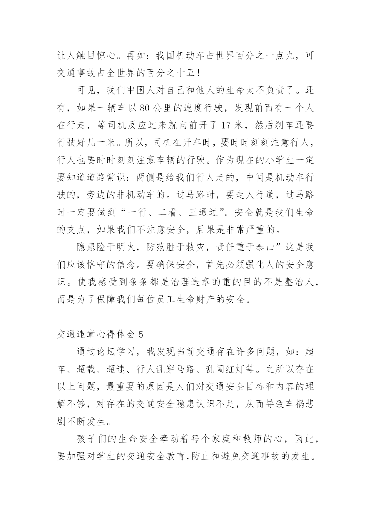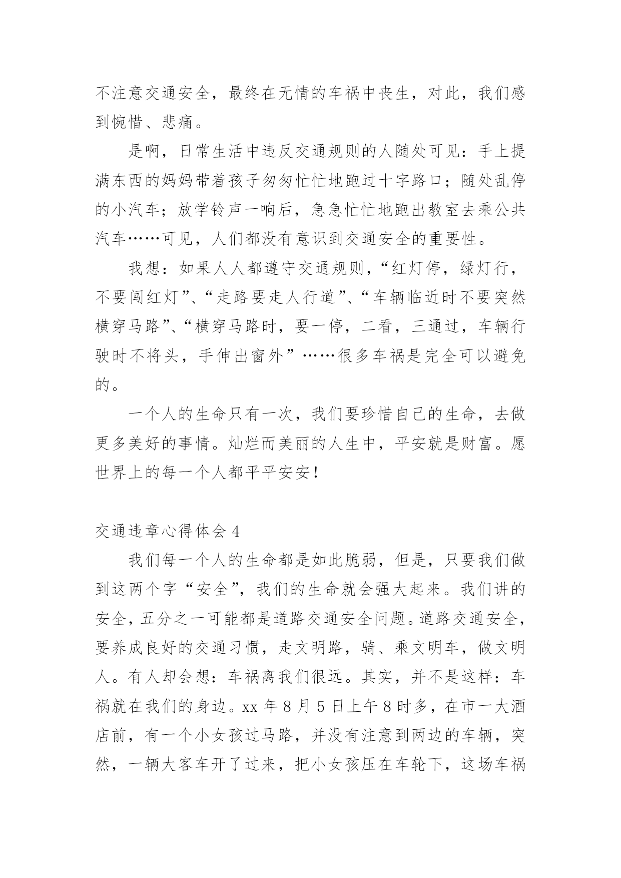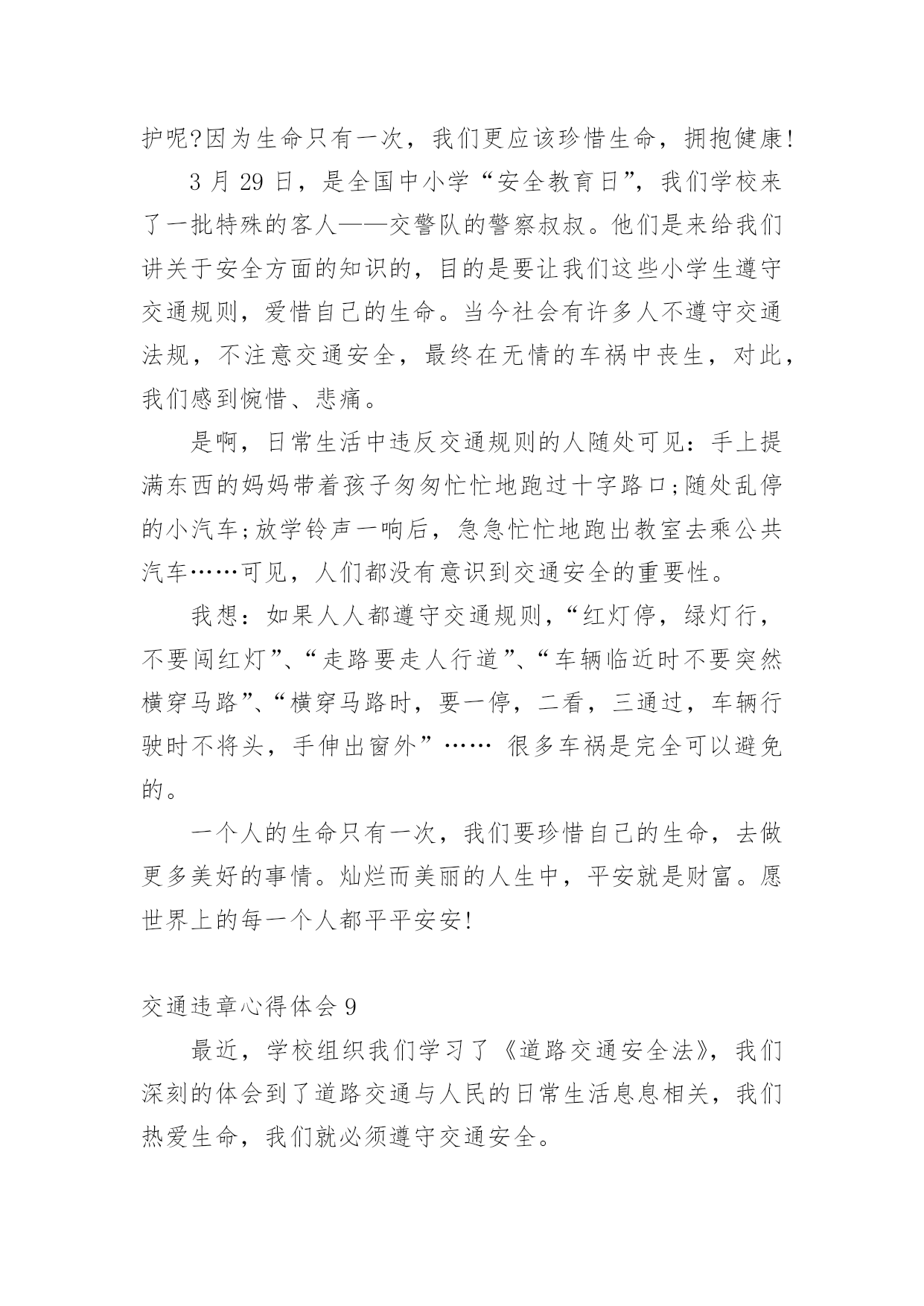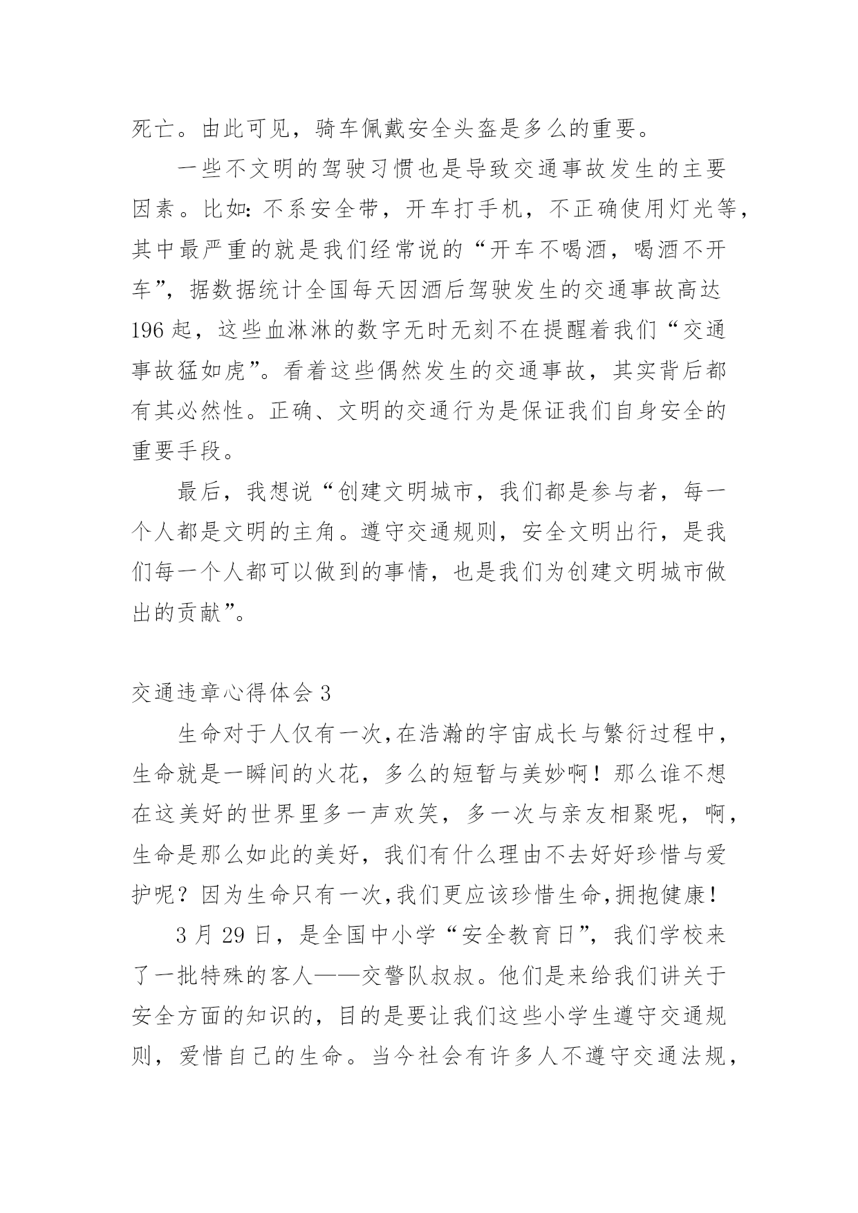 交通违章心得体会交通违章心得体会500字(通用12篇)我们得到了一些心得体会以后,常常可以将它们写成一篇心得体会,这样能够给人努力向前的动力。那么问题来了,应该如何写心得体会呢?下面是小编帮大家整理的交通违章心得体会500字(通用12篇),欢迎大家分享。交通违章心得体会1当汽车不断穿梭在拥挤的道路上,当红绿灯闪烁交替,交通安全司空见惯,人们再也不能平凡的平凡意识逐渐淡化或加深。当红色指示灯亮起时,仍然有轰鸣的车辆。为什么呢?为什么呢?难道他们不知道,有了这样的放纵,可能会有一个鲜活的生命在一瞬间消失,他们可能是自己,也可能是同车的伙伴,也可能是无辜的路人,为了争夺这短短的几秒钟,他们已经在脑海里想过了吗?几秒钟的价格是多少?他不会是唯一一个会流泪的人,他的父母、孩子、亲人、朋友,还有陪伴他一生的人。他想过吗?当然,这种悲剧有时涉及不止一个家庭,可能涉及几个甚至更多的家庭。闯红灯的成本是巨大的。酒后开车怎么办?喝醉了请不要开门发动汽车。当你迷迷糊糊的在路上跑的时候,酒精刺激的油门会失控,方向盘会漂移,你的车随时会变成可怕的死神,会把你经过的路塞满,还会紧紧的勒住喉咙,让你喘不过气来,让你极度疲惫。交通法规之所以这么多,是因为有那么多的血泪。它以多种形式出现在你我身边,如文字、符号、图片、信号等。这样我们无论走到哪里都能看到,每个人都可以谈论遵守交通法规到极致。但现实中呢?请克制这种言语上的满足,多使用自己的行动。当我们走在路上发动汽车时,我们认真地对自己说:请遵守交通规则!让我们携起手来,把交通安全刻在我们最深处,永远为我们的行动买单。交通安全——你的心和我的心,让我们停止呻吟和痛苦,建设一个交通安全的美丽星球,最美的星球。交通违章心得体会2交通文明是现代文明的一种,也在一定程度上反映了一座城市的文明程度,同时也是人民素质的一种体现。在当下的日常生活中,我们经常能看到一些不文明的交通行为。比如行人闯红灯、驾驶人不礼让斑马线、开车打手机等等。对于我们学生来说在马路上追逐打闹、骑自行车上机动车道、翻越交通围栏等都是不文明行为的表现。近期,学校组织开展的交通安全学习中的一些案例就给我上了生动的一课。案例中的那些触目惊心的交通事故真的让人看了害怕。印象最深的就是骑车佩戴安全头盔的两个例子,是否佩戴这个小小的安全头盔在事故发生时真的决定了两个人不同的命运。佩戴头盔的男子在事故发生后由于头盔的保护侥幸脱险,而另外一个没有佩戴头盔的人却抢救无效死亡。由此可见,骑车佩戴安全头盔是多么的重要。一些不文明的驾驶习惯也是导致交通事故发生的主要因素。比如:不系安全带,开车打手机,不正确使用灯光等,其中最严重的就是我们经常说的“开车不喝酒,喝酒不开车”,据数据统计全国每天因酒后驾驶发生的交通事故高达196起,这些血淋淋的数字无时无刻不在提醒着我们“交通事故猛如虎”。看着这些偶然发生的交通事故,其实背后都有其必然性。正确、文明的交通行为是保证我们自身安全的重要手段。最后,我想说“创建文明城市,我们都是参与者,每一个人都是文明的主角。遵守交通规则,安全文明出行,是我们每一个人都可以做到的事情,也是我们为创建文明城市做出的贡献”。交通违章心得体会3生命对于人仅有一次,在浩瀚的宇宙成长与繁衍过程中,生命就是一瞬间的火花,多么的短暂与美妙啊!那么谁不想在这美好的世界里多一声欢笑,多一次与亲友相聚呢,啊,生命是那么如此的美好,我们有什么理由不去好好珍惜与爱护呢?因为生命只有一次,我们更应该珍惜生命,拥抱健康!3月29日,是全国中小学“安全教育日”,我们学校来了一批特殊的客人——交警队叔叔。他们是来给我们讲关于安全方面的知识的,目的是要让我们这些小学生遵守交通规则,爱惜自己的生命。当今社会有许多人不遵守交通法规,不注意交通安全,最终在无情的车祸中丧生,对此,我们感到惋惜、悲痛。是啊,日常生活中违反交通规则的人随处可见:手上提满东西的妈妈带着孩子匆匆忙忙地跑过十字路口;随处乱停的小汽车;放学铃声一响后,急急忙忙地跑出教室去乘公共汽车……可见,人们都没有意识到交通安全的重要性。我想:如果人人都遵守交通规则,“红灯停,绿灯行,不要闯红灯”、“走路要走人行道”、“车辆临近时不要突然横穿马路”、“横穿马路时,要一停,二看,三通过,车辆行驶时不将头,手伸出窗外”……很多车祸是完全可以避免的。一个人的生命只有一次,我们要珍惜自己的生命,去做更多美好的事情。灿烂而美丽的人生中,平安就是财富。愿世界上的每一个人都平平安安!交通违章心得体会4我们每一个人的生命都是如此脆弱,但是,只要我们做到这两个字“安全”,我们的生命就会强大起来。我们讲的安全,五分之一可能都是道路交通安全问题。道路交通安全,要养成良好的交通习惯,走文明路,骑、乘文明车,做文明人。有人却会想:车祸离我们很远。其实,并