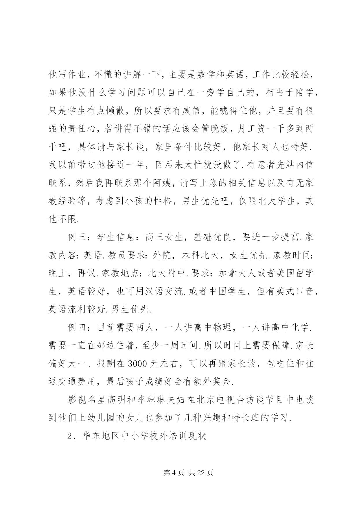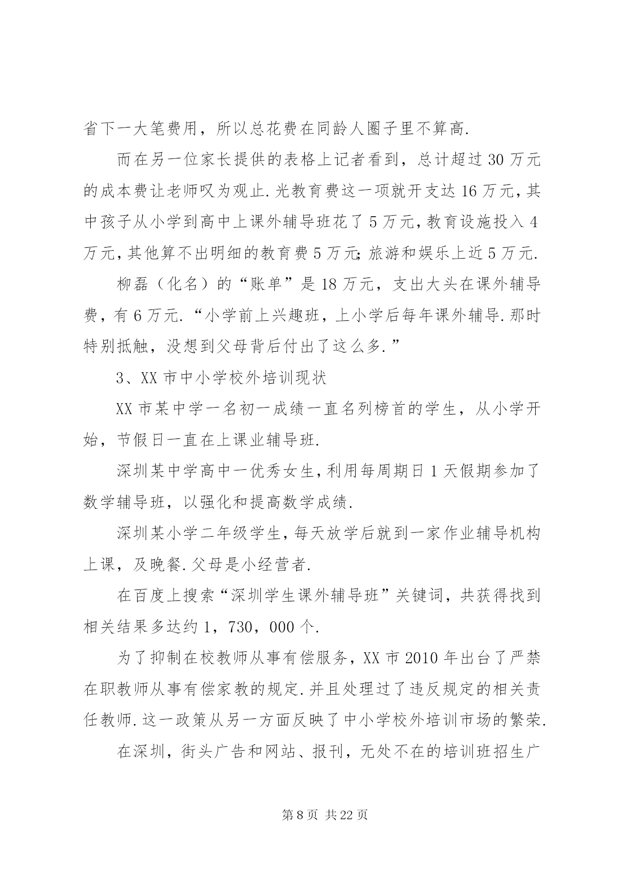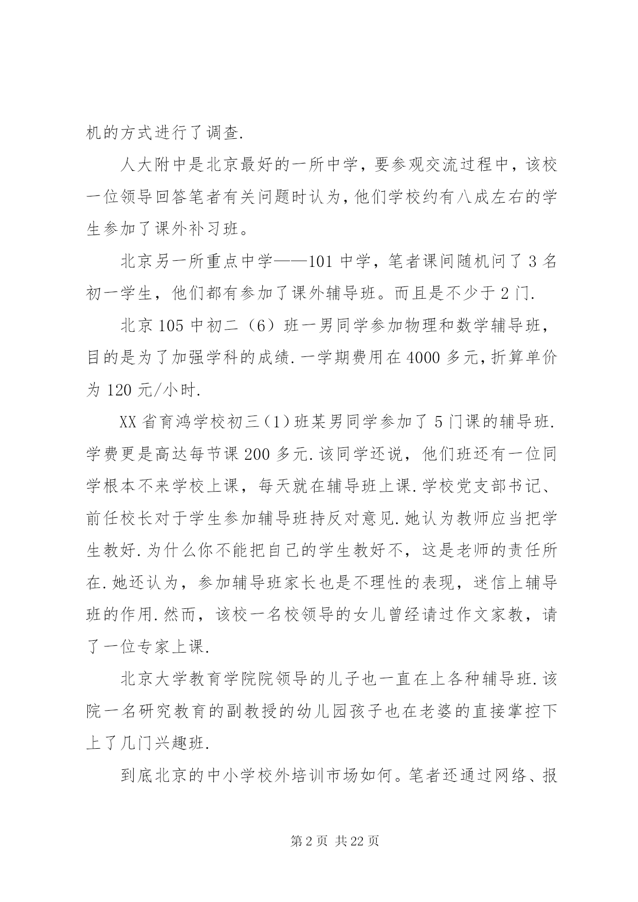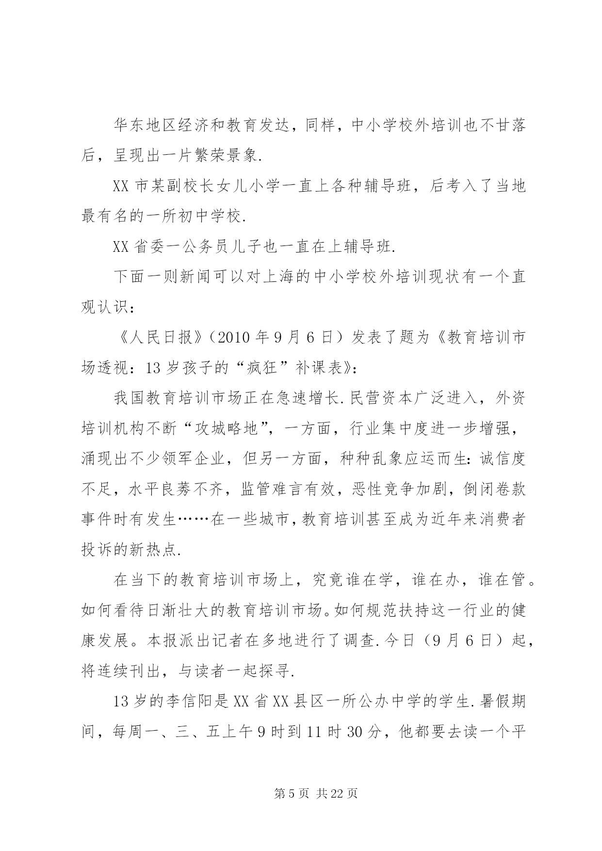 第PAGE\*Arabic\*MERGEFORMAT22页共NUMPAGES\*MERGEFORMAT22页学校外培训现状分析及对策文章摘要:中小学校外培训现状分析对策教育事业总是和社会一样,不断有新的现象出现.如果说这几年与教育有关的现象最集中是什么,中小学校外培训算得上是一个明显的现象.一、中小学校外培训的现状(一)国内中小学校外培训现状1……中小学校外培训现状分析及对策《广东教育综合版》2013年第11期摘要:中小学校外培训成明显扩张之势.这一现象的发生,反映了民众对教育有着十分强烈的需要.这种现象事实上改变了许多人的命运,这是教育工作者必须正视的一个问题.通过这个问题的分析,可以让我们明确学校教育的职责所在,为教育工作提供新的思路.关键词:中小学校外培训现状分析对策教育事业总是和社会一样,不断有新的现象出现.如果说这几年与教育有关的现象最集中是什么,中小学校外培训算得上是一个明显的现象.一、中小学校外培训的现状(一)国内中小学校外培训现状1、北京中小学校外培训现状为了了解北京基础教育的中小学校外培训现状,笔者通过随机的方式进行了调查.人大附中是北京最好的一所中学,要参观交流过程中,该校一位领导回答笔者有关问题时认为,他们学校约有八成左右的学生参加了课外补习班。北京另一所重点中学——101中学,笔者课间随机问了3名初一学生,他们都有参加了课外辅导班。而且是不少于2门.北京105中初二(6)班一男同学参加物理和数学辅导班,目的是为了加强学科的成绩.一学期费用在4000多元,折算单价为120元/小时.XX省育鸿学校初三(1)班某男同学参加了5门课的辅导班.学费更是高达每节课200多元.该同学还说,他们班还有一位同学根本不来学校上课,每天就在辅导班上课.学校党支部书记、前任校长对于学生参加辅导班持反对意见.她认为教师应当把学生教好.为什么你不能把自己的学生教好不,这是老师的责任所在.她还认为,参加辅导班家长也是不理性的表现,迷信上辅导班的作用.然而,该校一名校领导的女儿曾经请过作文家教,请了一位专家上课.北京大学教育学院院领导的儿子也一直在上各种辅导班.该院一名研究教育的副教授的幼儿园孩子也在老婆的直接掌控下上了几门兴趣班.到底北京的中小学校外培训市场如何。笔者还通过网络、报刊等媒体进行了了解.在北京大学校园,公告栏里到处都有家教信息.学校的信息平台——北大bbs同样有专门的家教栏目.摘抄几则如下:例一:这个女孩是人大附中的,现在初二、她排名100左右的学生,算是很优秀的.家里比较望女成凤,计划以后送她出国.她家长担心人大附中竞争太激烈,就请北大各科的优秀生来给她做家教,提前讲授各科高中内容.据说她现在在学校还没有学化学课,她的母亲只是希望能先通过实践来引导她的学习兴趣.因此初期的授课内容应当包括领孩子进实验室实地讲解化学实验知识,日后的授课内容可以再议.因此招募一位化学家教,要求:1、本科生或研究生不限,但研究生本科需也在北大;2、能够方便的将孩子领进实验室,参观一下各种瓶瓶罐罐、各种仪器和试剂.如果有规矩约束不动手碰也可以;3、最好是女生;4、富有责任心,靠谱,学业优秀,对初中、高中化学玩的足够转.这个家庭非常重视孩子的教育,因而对做家教的学生非常kind、非常热情.她们家就在几乎紧邻北大的一个社区,骑车出门不到十分钟就到.待遇当是不成问题的,应会高于平均水准.具体的到时候可以由您和家长直接商议.例二:帮人找家教,初二男生,家住安定门附近,地铁四号线到西直门后转二号线三站即到,周一到周四晚上以及周日监督他写作业,不懂的讲解一下,主要是数学和英语,工作比较轻松,如果他没什么学习问题可以自己在一旁学自己的,相当于陪学,只是学生有点懒散,所以要求有威信,能唬得住他,并且要有很强的责任心,若讲得不错的话应该会管晚饭,月工资一千多到两千吧,具体请与家长谈,家里条件比较好,他家长对人也特好.我以前带过他接近一年,因后来太忙就没做了.有意者先站内信联系,然后我再联系那个阿姨,请写上您的相关信息以及有无家教经验等,考虑到小孩的性格,男生优先吧,仅限北大学生,其他不限.例三:学生信息:高三女生,基础优良,要进一步提高.家教内容:英语.教员要求:外院,本科北大,女生优先.家教时间:晚上,再议.家教地点:北大附中.要求:加拿大人或者美国留学生,英语较好,也可用汉语交流.或者中国学生,但有美式口音,英语流利较好.男生优先.例四:目前需要两人,一人讲高中物理,一人讲高中化学.需要一直在那边住着,至少一周时间.所以时间上需要保障.家长偏好大一、报酬在3000元左右,可以再跟家长谈,包吃住和往返交通费用,最后孩子成绩好会有额外奖金.影视名星高明和李琳琳夫妇在北京电视台访谈节目中也谈到他们上幼儿园的女儿也参加了几种兴趣和特长班的