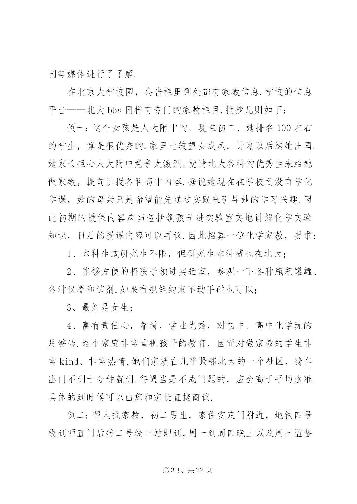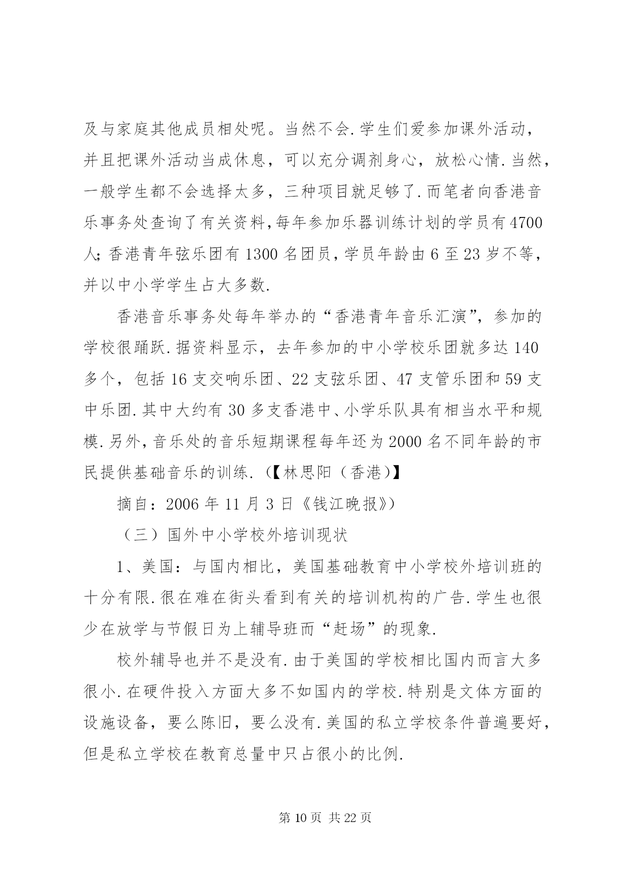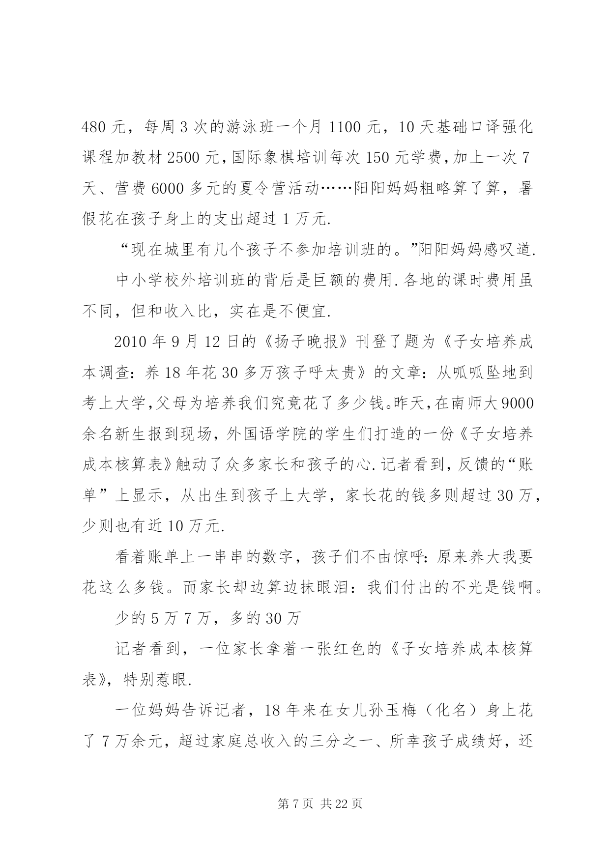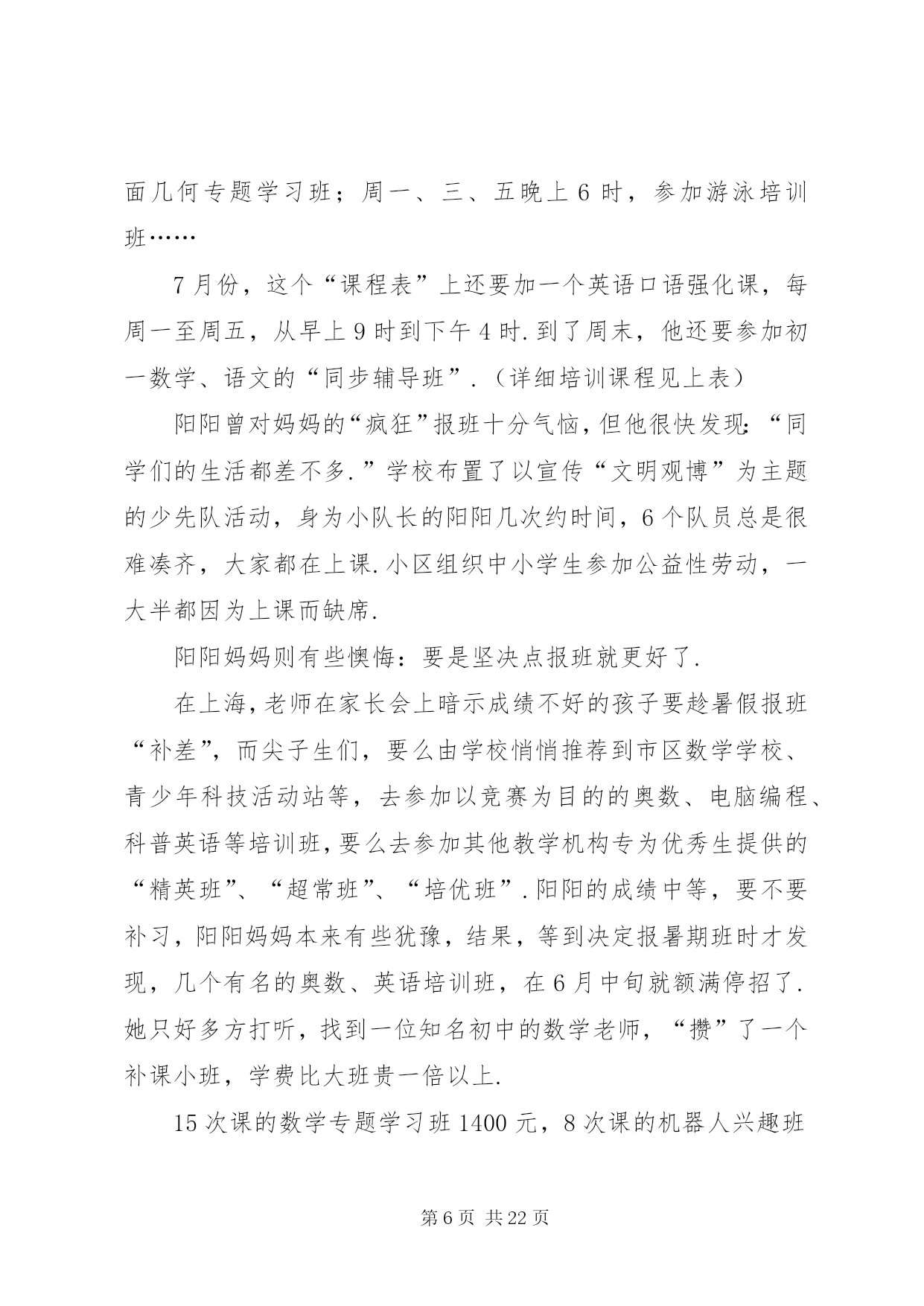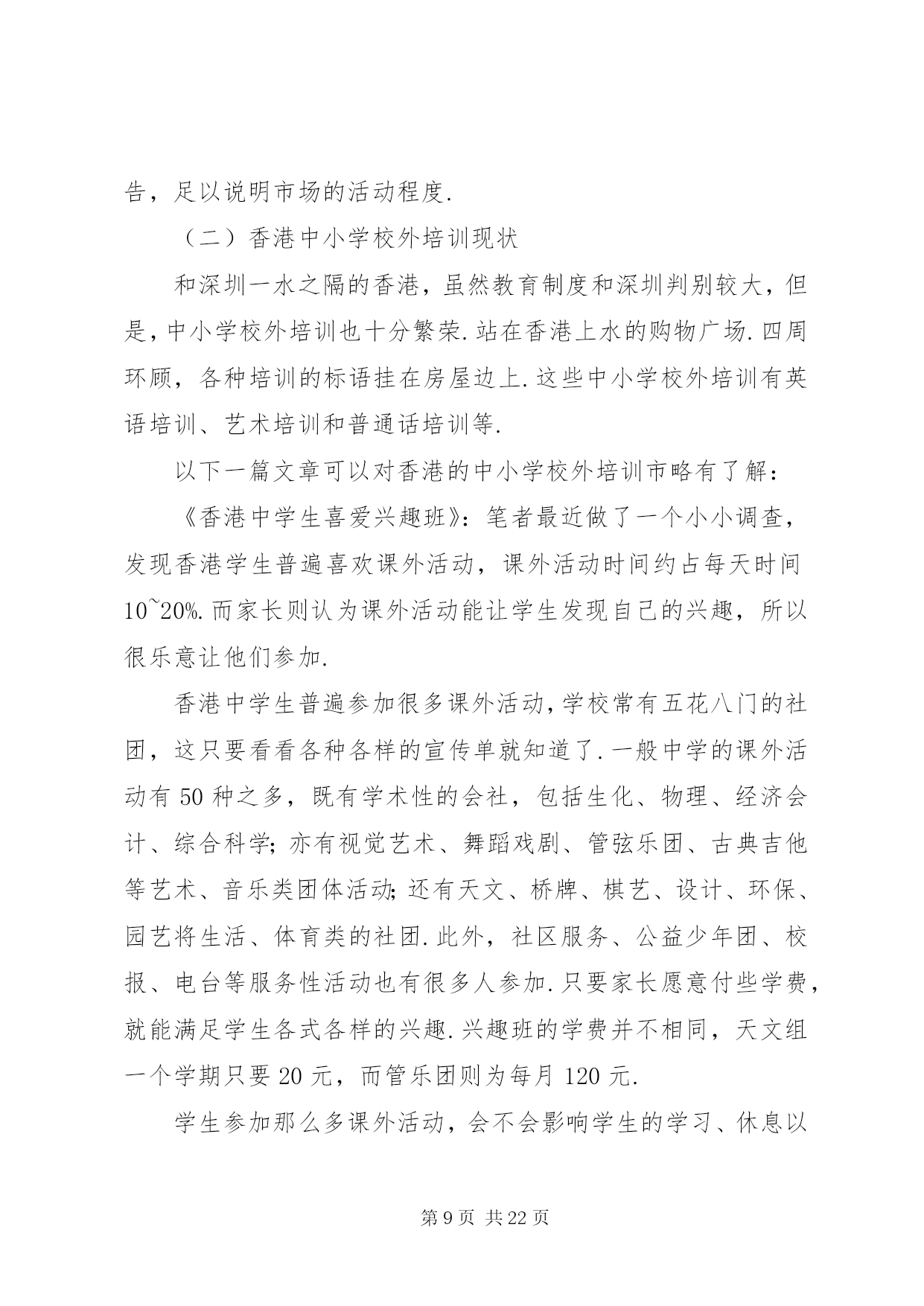 第PAGE\*Arabic\*MERGEFORMAT22页共NUMPAGES\*MERGEFORMAT22页学校外培训现状分析及对策文章摘要:中小学校外培训现状分析对策教育事业总是和社会一样,不断有新的现象出现.如果说这几年与教育有关的现象最集中是什么,中小学校外培训算得上是一个明显的现象.一、中小学校外培训的现状(一)国内中小学校外培训现状1……中小学校外培训现状分析及对策《广东教育综合版》2013年第11期摘要:中小学校外培训成明显扩张之势.这一现象的发生,反映了民众对教育有着十分强烈的需要.这种现象事实上改变了许多人的命运,这是教育工作者必须正视的一个问题.通过这个问题的分析,可以让我们明确学校教育的职责所在,为教育工作提供新的思路.关键词:中小学校外培训现状分析对策教育事业总是和社会一样,不断有新的现象出现.如果说这几年与教育有关的现象最集中是什么,中小学校外培训算得上是一个明显的现象.一、中小学校外培训的现状(一)国内中小学校外培训现状1、北京中小学校外培训现状为了了解北京基础教育的中小学校外培训现状,笔者通过随机的方式进行了调查.人大附中是北京最好的一所中学,要参观交流过程中,该校一位领导回答笔者有关问题时认为,他们学校约有八成左右的学生参加了课外补习班。北京另一所重点中学——101中学,笔者课间随机问了3名初一学生,他们都有参加了课外辅导班。而且是不少于2门.北京105中初二(6)班一男同学参加物理和数学辅导班,目的是为了加强学科的成绩.一学期费用在4000多元,折算单价为120元/小时.XX省育鸿学校初三(1)班某男同学参加了5门课的辅导班.学费更是高达每节课200多元.该同学还说,他们班还有一位同学根本不来学校上课,每天就在辅导班上课.学校党支部书记、前任校长对于学生参加辅导班持反对意见.她认为教师应当把学生教好.为什么你不能把自己的学生教好不,这是老师的责任所在.她还认为,参加辅导班家长也是不理性的表现,迷信上辅导班的作用.然而,该校一名校领导的女儿曾经请过作文家教,请了一位专家上课.北京大学教育学院院领导的儿子也一直在上各种辅导班.该院一名研究教育的副教授的幼儿园孩子也在老婆的直接掌控下上了几门兴趣班.到底北京的中小学校外培训市场如何。笔者还通过网络、报刊等媒体进行了了解.在北京大学校园,公告栏里到处都有家教信息.学校的信息平台——北大bbs同样有专门的家教栏目.摘抄几则如下:例一:这个女孩是人大附中的,现在初二、她排名100左右的学生,算是很优秀的.家里比较望女成凤,计划以后送她出国.她家长担心人大附中竞争太激烈,就请北大各科的优秀生来给她做家教,提前讲授各科高中内容.据说她现在在学校还没有学化学课,她的母亲只是希望能先通过实践来引导她的学习兴趣.因此初期的授课内容应当包括领孩子进实验室实地讲解化学实验知识,日后的授课内容可以再议.因此招募一位化学家教,要求:1、本科生或研究生不限,但研究生本科需也在北大;2、能够方便的将孩子领进实验室,参观一下各种瓶瓶罐罐、各种仪器和试剂.如果有规矩约束不动手碰也可以;3、最好是女生;4、富有责任心,靠谱,学业优秀,对初中、高中化学玩的足够转.这个家庭非常重视孩子的教育,因而对做家教的学生非常kind、非常热情.她们家就在几乎紧邻北大的一个社区,骑车出门不到十分钟就到.待遇当是不成问题的,应会高于平均水准.具体的到时候可以由您和家长直接商议.例二:帮人找家教,初二男生,家住安定门附近,地铁四号线到西直门后转二号线三站即到,周一到周四晚上以及周日监督他写作业,不懂的讲解一下,主要是数学和英语,工作比较轻松,如果他没什么学习问题可以自己在一旁学自己的,相当于陪学,只是学生有点懒散,所以要求有威信,能唬得住他,并且要有很强的责任心,若讲得不错的话应该会管晚饭,月工资一千多到两千吧,具体请与家长谈,家里条件比较好,他家长对人也特好.我以前带过他接近一年,因后来太忙就没做了.有意者先站内信联系,然后我再联系那个阿姨,请写上您的相关信息以及有无家教经验等,考虑到小孩的性格,男生优先吧,仅限北大学生,其他不限.例三:学生信息:高三女生,基础优良,要进一步提高.家教内容:英语.教员要求:外院,本科北大,女生优先.家教时间:晚上,再议.家教地点:北大附中.要求:加拿大人或者美国留学生,英语较好,也可用汉语交流.或者中国学生,但有美式口音,英语流利较好.男生优先.例四:目前需要两人,一人讲高中物理,一人讲高中化学.需要一直在那边住着,至少一周时间.所以时间上需要保障.家长偏好大一、报酬在3000元左右,可以再跟家长谈,包吃住和往返交通费用,最后孩子成绩好会有额外奖金.影视名星高明和李琳琳夫妇在北京电视台访谈节目中也谈到他们上幼儿园的女儿也参加了几种兴趣和特长班的