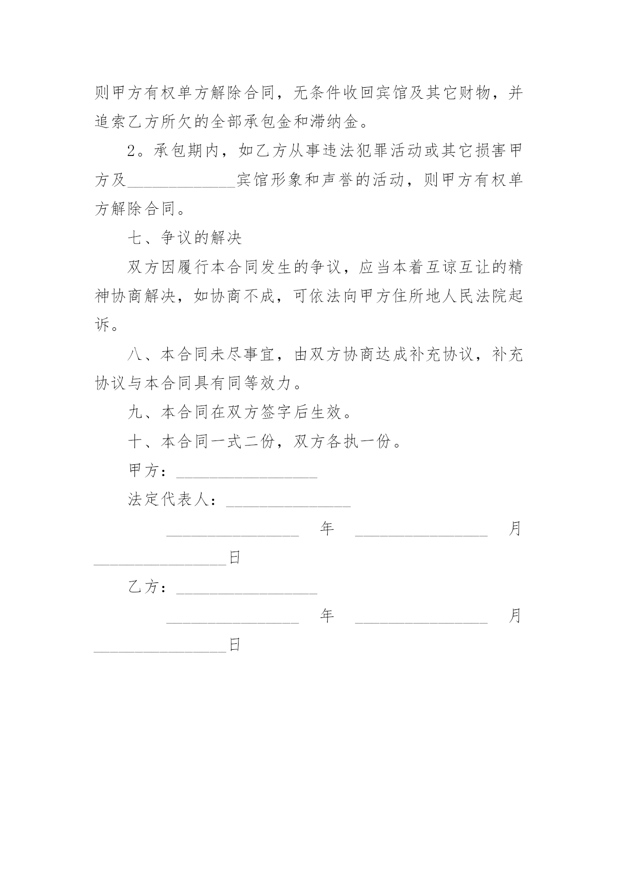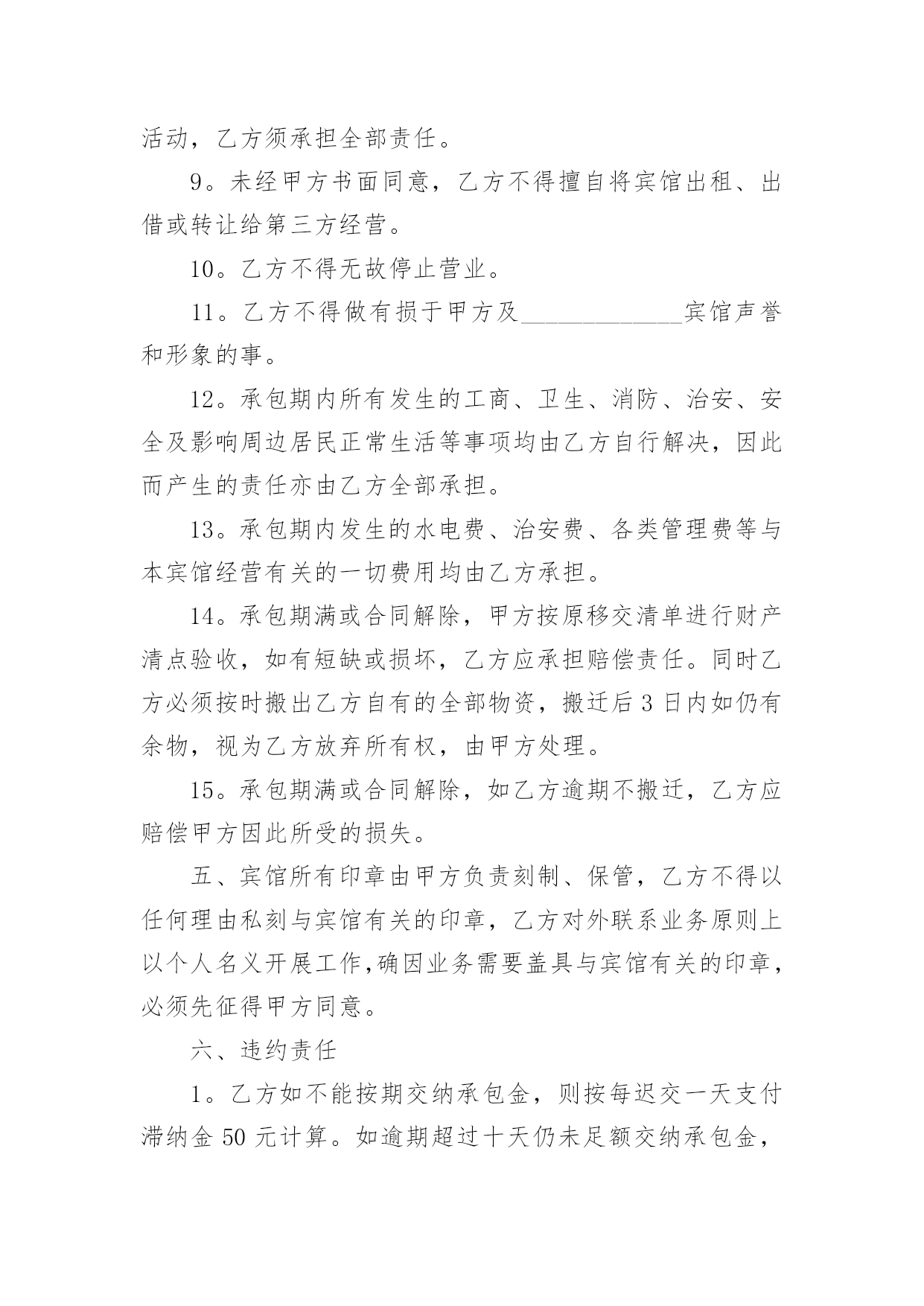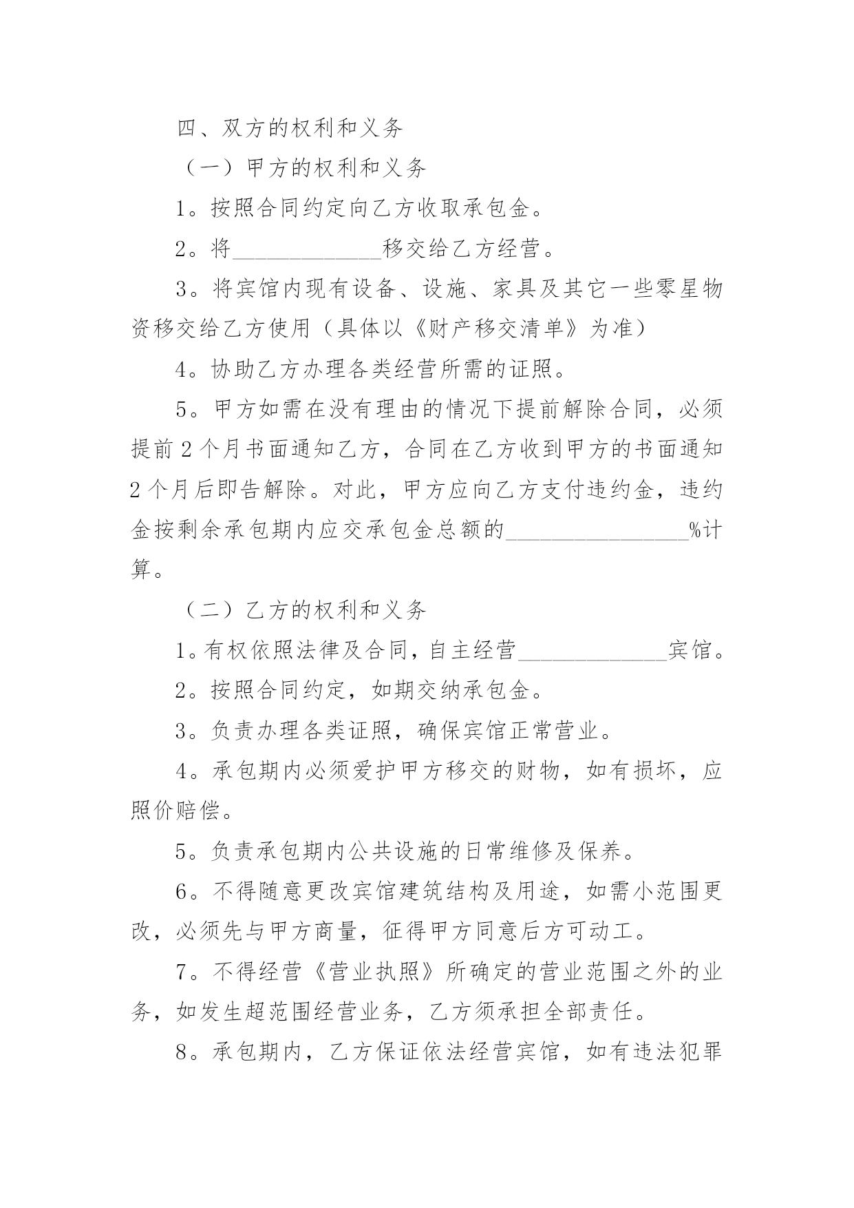 宾馆经营权质押合同最新宾馆经营权质押合同最新范本在人们越来越相信法律的社会中,合同出现的次数越来越多,签订合同能够较为有效的约束违约行为。知道吗,写合同可是有方法的哦,下面是小编帮大家整理的宾馆经营权质押合同最新范本,欢迎大家分享。发包方:______________(以下简称甲方)住所:_______________法定代表人:___________承包方:______________(以下简称乙方)甲、乙双方经友好协商,甲方将位于_____________承包给乙方经营,为明确双方权利、义务,在合法自愿的基础上特签订本合同。一、承包内容:___________。二、承包期限:_______________暂定________________年零________________个月,自________________年________________月________________日至________________年________________月________________日止。三、承包金及支付方式:_______________承包金每年________________万元,乙方必须于每年________________月________________日前向甲方支付当年度的承包金。四、双方的权利和义务(一)甲方的权利和义务1。按照合同约定向乙方收取承包金。2。将_____________移交给乙方经营。3。将宾馆内现有设备、设施、家具及其它一些零星物资移交给乙方使用(具体以《财产移交清单》为准)4。协助乙方办理各类经营所需的证照。5。甲方如需在没有理由的情况下提前解除合同,必须提前2个月书面通知乙方,合同在乙方收到甲方的书面通知2个月后即告解除。对此,甲方应向乙方支付违约金,违约金按剩余承包期内应交承包金总额的________________%计算。(二)乙方的权利和义务1。有权依照法律及合同,自主经营_____________宾馆。2。按照合同约定,如期交纳承包金。3。负责办理各类证照,确保宾馆正常营业。4。承包期内必须爱护甲方移交的财物,如有损坏,应照价赔偿。5。负责承包期内公共设施的日常维修及保养。6。不得随意更改宾馆建筑结构及用途,如需小范围更改,必须先与甲方商量,征得甲方同意后方可动工。7。不得经营《营业执照》所确定的营业范围之外的业务,如发生超范围经营业务,乙方须承担全部责任。8。承包期内,乙方保证依法经营宾馆,如有违法犯罪活动,乙方须承担全部责任。9。未经甲方书面同意,乙方不得擅自将宾馆出租、出借或转让给第三方经营。10。乙方不得无故停止营业。11。乙方不得做有损于甲方及_____________宾馆声誉和形象的事。12。承包期内所有发生的工商、卫生、消防、治安、安全及影响周边居民正常生活等事项均由乙方自行解决,因此而产生的责任亦由乙方全部承担。13。承包期内发生的水电费、治安费、各类管理费等与本宾馆经营有关的一切费用均由乙方承担。14。承包期满或合同解除,甲方按原移交清单进行财产清点验收,如有短缺或损坏,乙方应承担赔偿责任。同时乙方必须按时搬出乙方自有的全部物资,搬迁后3日内如仍有余物,视为乙方放弃所有权,由甲方处理。15。承包期满或合同解除,如乙方逾期不搬迁,乙方应赔偿甲方因此所受的损失。五、宾馆所有印章由甲方负责刻制、保管,乙方不得以任何理由私刻与宾馆有关的印章,乙方对外联系业务原则上以个人名义开展工作,确因业务需要盖具与宾馆有关的印章,必须先征得甲方同意。六、违约责任1。乙方如不能按期交纳承包金,则按每迟交一天支付滞纳金50元计算。如逾期超过十天仍未足额交纳承包金,则甲方有权单方解除合同,无条件收回宾馆及其它财物,并追索乙方所欠的全部承包金和滞纳金。2。承包期内,如乙方从事违法犯罪活动或其它损害甲方及_____________宾馆形象和声誉的活动,则甲方有权单方解除合同。七、争议的解决双方因履行本合同发生的争议,应当本着互谅互让的精神协商解决,如协商不成,可依法向甲方住所地人民法院起诉。八、本合同未尽事宜,由双方协商达成补充协议,补充协议与本合同具有同等效力。九、本合同在双方签字后生效。十、本合同一式二份,双方各执一份。甲方:_________________法定代表人:_______________________________年________________月________________日乙方:_________________________________年________________月________________日