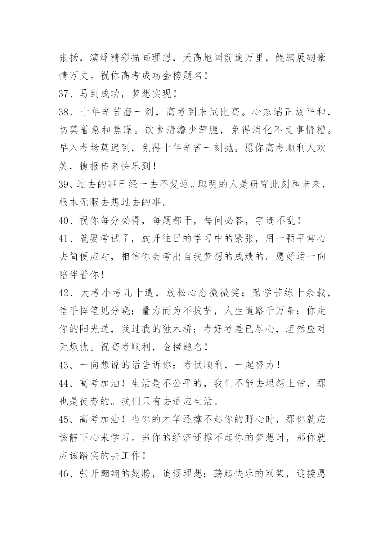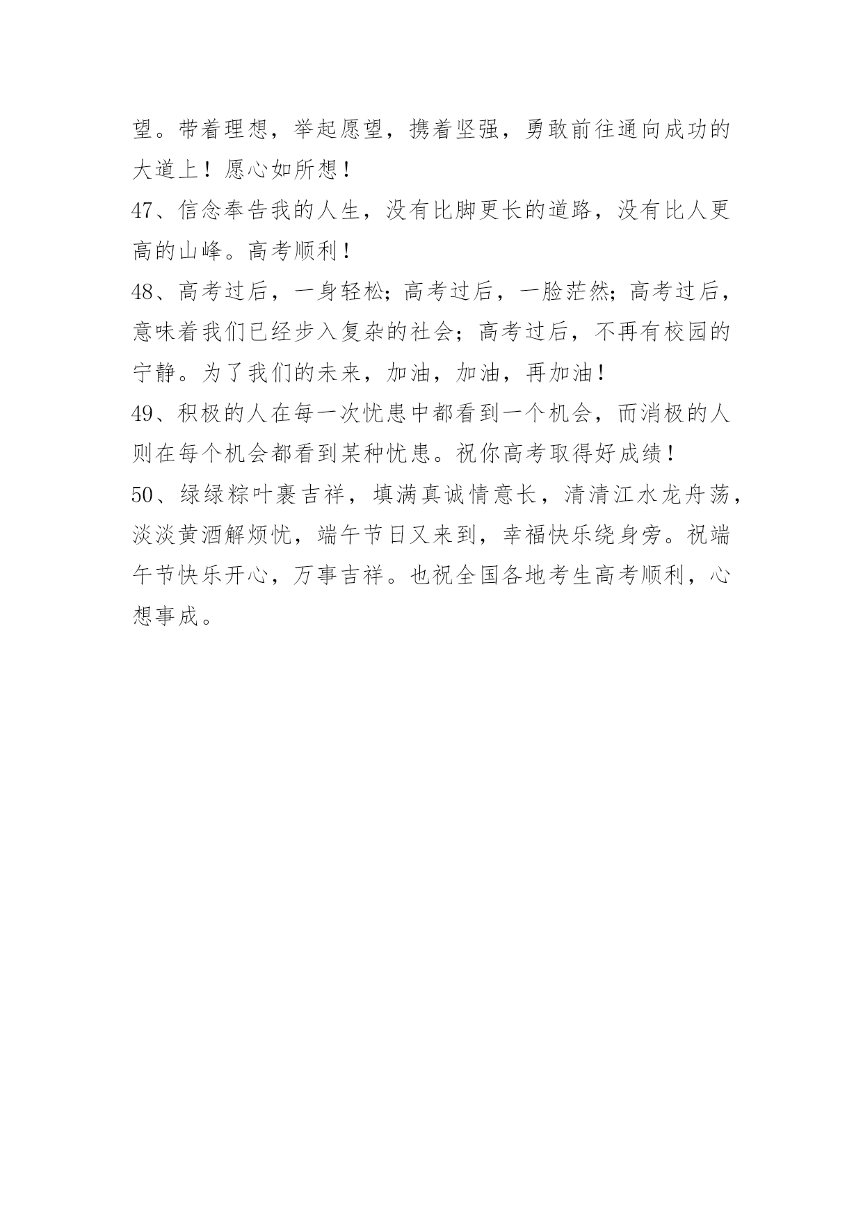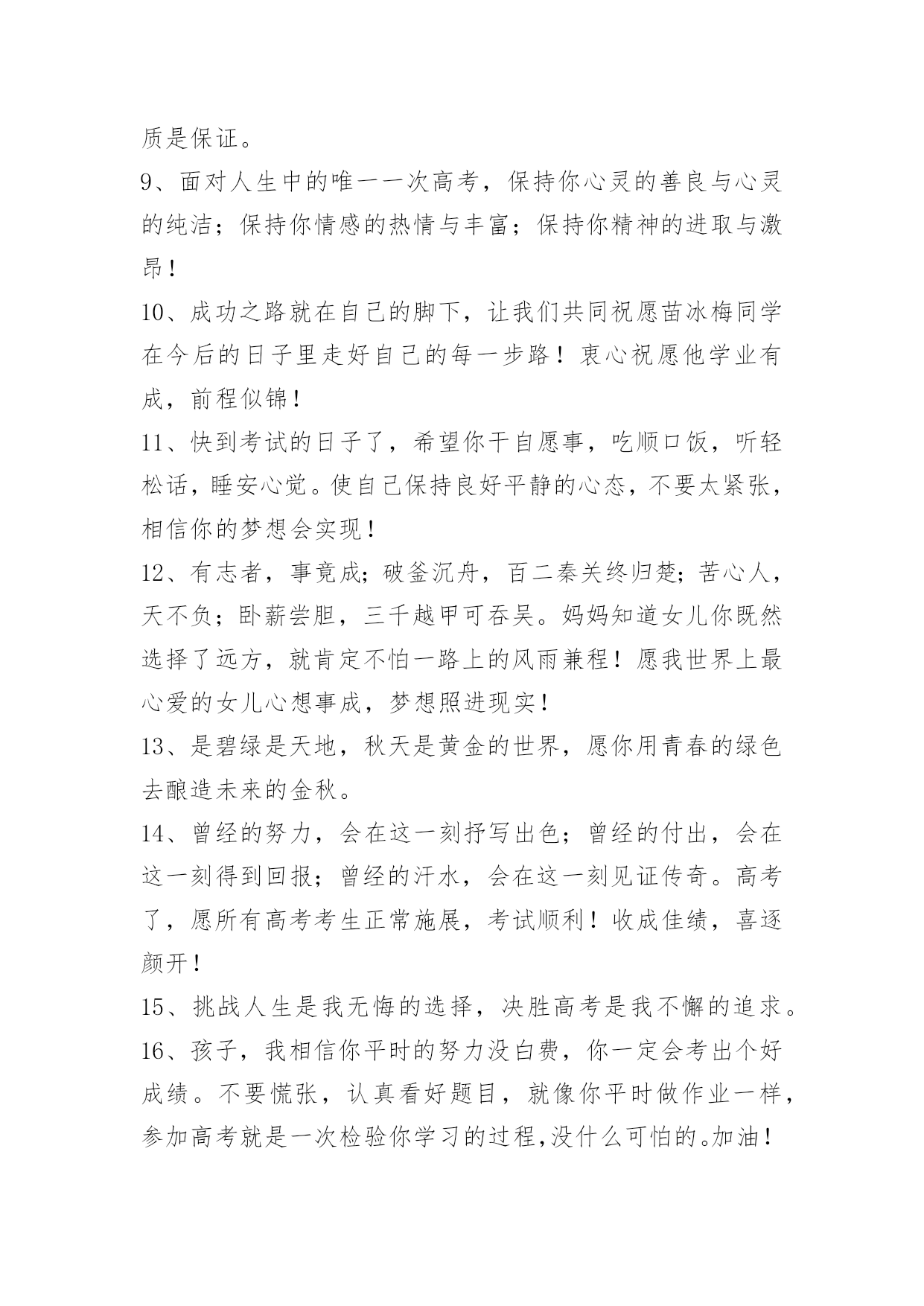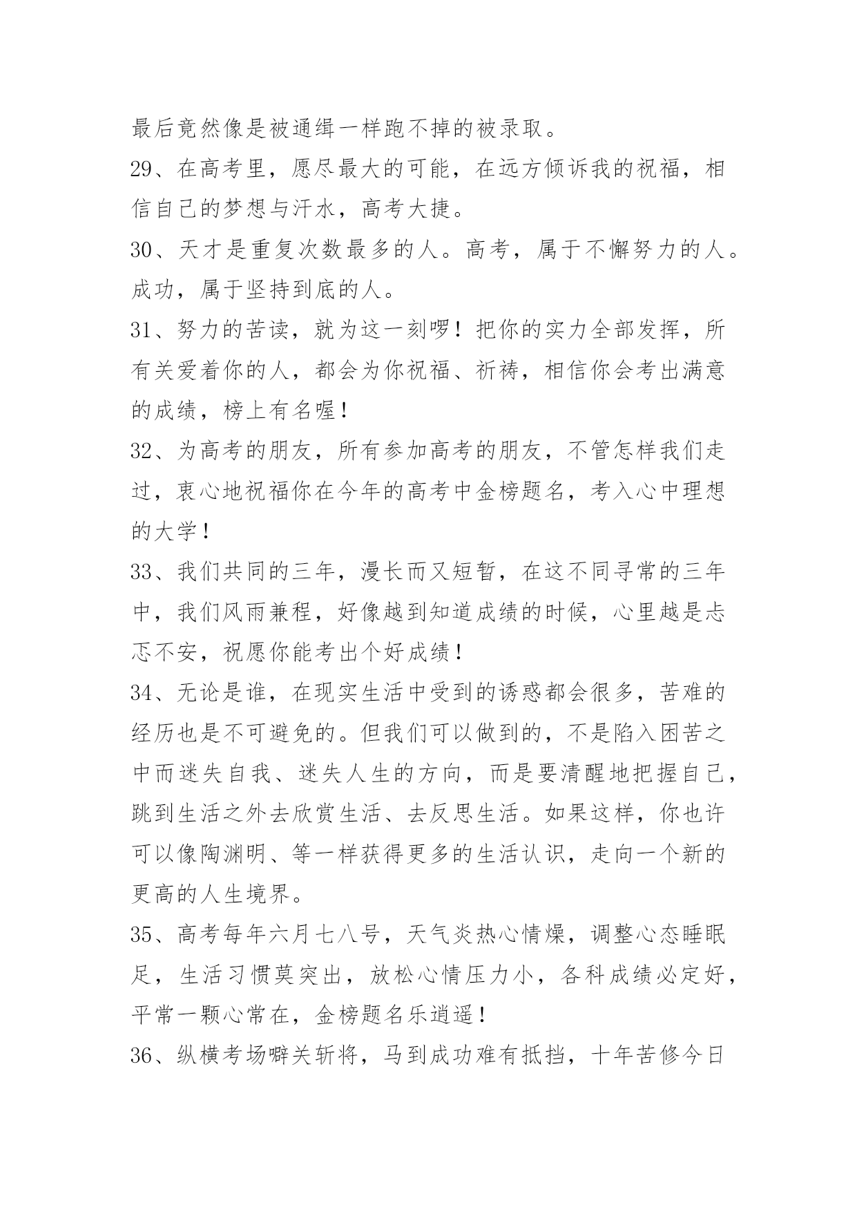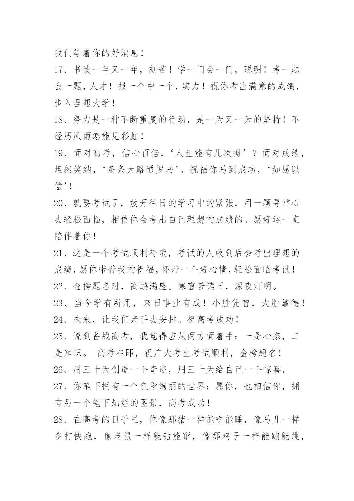 最新高考祝福短信最新高考祝福短信(通用50句)六月鲜花芬芳艳,捷报频传格外香。父母亲人心欢畅,十年辛苦愿得偿。学海无涯再奋斗,学府深造知识丰。今日状元成栋梁,为国贡献扬帆航。祝前程似锦!我坚信,我们付出了汗水,经受了考验,理想中大学殿堂的大门就一定会为我们而敞开,让我们继续艰辛却快乐的求学之路!本篇文章是小编收集的关于高考祝福短信的内容,供各位参考。1、人的精神一旦被唤起,将会产生无穷无尽的威力。2、哈哈,三年的老同学,你身上一定有门捷列夫没有发现的元素!否则,语言怎么在我最需要的时候无影无踪了呢?3、书山有路勤以为径,始临顶峰,一览众山小。高考加油!4、生命之中最快乐的是拼搏,而非成功,生命之中最痛苦的是懒散,而非失败。祝你考试顺利啊。5、大考小考几十遭,放松心态微微笑;勤学苦练十余载,信手挥笔见分晓;量力而为不拔苗,人生道路千万条;你走你的阳光道,我过我的独木桥;考好考差已尽心,坦然面对无烦扰。祝高考顺利,金榜题名!6、寒窗苦读十余载,快乐辛酸不间断。7、提高一分,干掉千人!没有高考,你拼得过"富二代"吗?考过高富帅,战胜"官二代"!8、要想高考成功,须记住以下话语:健康身体是基础,良好学风是条件,勤奋刻苦是前提,学习方法是截键,心理素质是保证。9、面对人生中的唯一一次高考,保持你心灵的善良与心灵的纯洁;保持你情感的热情与丰富;保持你精神的进取与激昂!10、成功之路就在自己的脚下,让我们共同祝愿苗冰梅同学在今后的日子里走好自己的每一步路!衷心祝愿他学业有成,前程似锦!11、快到考试的日子了,希望你干自愿事,吃顺口饭,听轻松话,睡安心觉。使自己保持良好平静的心态,不要太紧张,相信你的梦想会实现!12、有志者,事竟成;破釜沉舟,百二秦关终归楚;苦心人,天不负;卧薪尝胆,三千越甲可吞吴。妈妈知道女儿你既然选择了远方,就肯定不怕一路上的风雨兼程!愿我世界上最心爱的女儿心想事成,梦想照进现实!13、是碧绿是天地,秋天是黄金的世界,愿你用青春的绿色去酿造未来的金秋。14、曾经的努力,会在这一刻抒写出色;曾经的付出,会在这一刻得到回报;曾经的汗水,会在这一刻见证传奇。高考了,愿所有高考考生正常施展,考试顺利!收成佳绩,喜逐颜开!15、挑战人生是我无悔的选择,决胜高考是我不懈的追求。16、孩子,我相信你平时的努力没白费,你一定会考出个好成绩。不要慌张,认真看好题目,就像你平时做作业一样,参加高考就是一次检验你学习的过程,没什么可怕的。加油!我们等着你的好消息!17、书读一年又一年,刻苦!学一门会一门,聪明!考一题会一题,人才!报一个中一个,实力!祝你考出满意的成绩,步入理想大学!18、努力是一种不断重复的行动,是一天又一天的坚持!不经历风雨怎能见彩虹!19、面对高考,信心百倍,‘人生能有几次搏’?面对成绩,坦然笑纳,‘条条大路通罗马’。祝福你马到成功,‘如愿以偿’!20、就要考试了,放开往日的学习中的紧张,用一颗寻常心去轻松面临,相信你会考出自己理想的成绩的。愿好运一直陪伴着你!21、这是一个考试顺利符哦,考试的人收到后会考出理想的成绩,愿你带着我的祝福,怀着一个好心情,轻松面临考试!22、金榜题名时,高鹏满座。寒窗苦读日,深夜灯明。23、当今学有所用,来日事业有成!小胜凭智,大胜靠德!24、未来,让我们亲手去安排。祝高考成功!25、说到备战高考,我觉得应从两方面着手:一是心态,二是知识。高考在即,祝广大考生考试顺利,金榜题名!26、用三十天创造一个奇迹,用三十天给自己一个惊喜。27、你笔下拥有一个色彩绚丽的世界:愿你,也相信你,拥有另一个笔下灿烂的图景,高考成功!28、在高考的日子里,你像那猪一样能吃能睡,像马儿一样多打快跑,像老鼠一样能钻能窜,像那鸡子一样能蹦能跳,最后竟然像是被通缉一样跑不掉的被录取。29、在高考里,愿尽最大的可能,在远方倾诉我的祝福,相信自己的梦想与汗水,高考大捷。30、天才是重复次数最多的人。高考,属于不懈努力的人。成功,属于坚持到底的人。31、努力的苦读,就为这一刻啰!把你的实力全部发挥,所有关爱着你的人,都会为你祝福、祈祷,相信你会考出满意的成绩,榜上有名喔!32、为高考的朋友,所有参加高考的朋友,不管怎样我们走过,衷心地祝福你在今年的高考中金榜题名,考入心中理想的大学!33、我们共同的三年,漫长而又短暂,在这不同寻常的三年中,我们风雨兼程,好像越到知道成绩的时候,心里越是忐忑不安,祝愿你能考出个好成绩!34、无论是谁,在现实生活中受到的诱惑都会很多,苦难的经历也是不可避免的。但我们可以做到的,不是陷入困苦之中而迷失自我、迷失人生的方向,而是要清醒地把握自己,跳到生活之外去欣赏生活、去反思生活。如果这样,你也许可以像陶渊明、等一样获得更多的生活认识,走向一个新的更高的人生境界。35、高考每年六月七八号,天