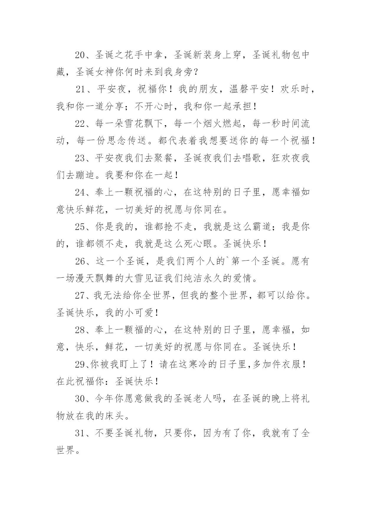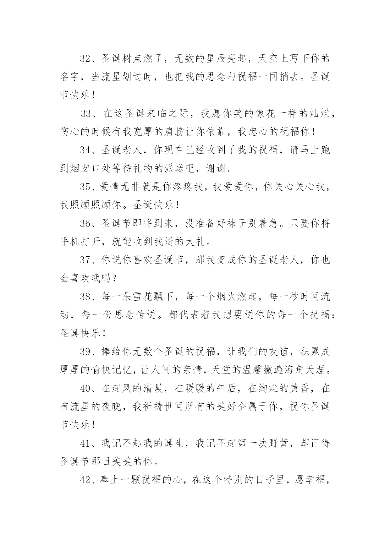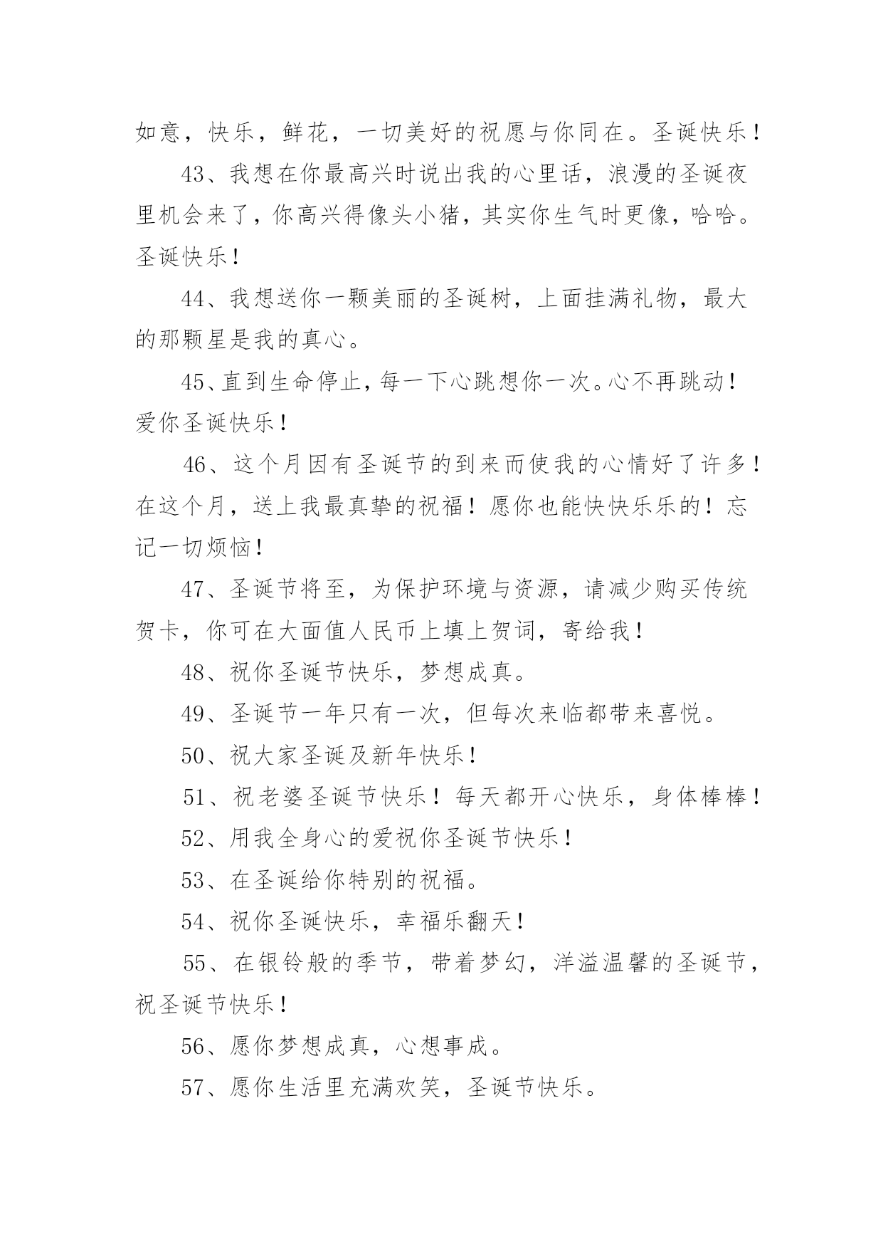 圣诞节圣诞树上的文案在平时的学习、工作或生活中,越来越多人喜欢在朋友圈上发布文案,文案对人们的思维是有一定的感性作用的。究竟什么样的文案才是特别的呢?下面是小编为大家收集的圣诞节圣诞树上的文案,仅供参考,欢迎大家阅读。1、圣诞节觉得好寂寞,因为没你在身边;其实我真的想你了,好想好想有你陪我渡过这个浪漫的平安夜。2、圣诞快乐,并不是只在特别的日子才会想起你,但是圣诞节的时候,一定会让你收到我的祝福。3、麻烦你把前置摄像头打开,你看到了吗,里面是我最想要的圣诞礼物。4、好久没有听到你的声音,好久没有人和我谈心,在雪花飞舞的日子里,真的好想你,祝圣诞节快乐!5、所有祝福揉成巧克力,要把一切喜庆变成奶油。永远快乐做成蛋糕,向你然后说声:圣诞快乐!6、圣诞节,让我深情的祝福化成雪花,轻轻地飘落在你的身上,慢慢地浸透融入到你的心里。7、有句话每年圣诞我都想说,可是苦于没有机会。现在我实在憋不住了,请把你留在我沙发上的袜子拿走!8、我盼望我等待圣诞节,手心里拽着精心制作的圣诞贺卡,寄给揣在怀里的名字,送去最真的祝福:圣诞快乐!9、圣诞,有圣诞老人,有你也有我,在这日子里,我想对你说,世上你最美,在今生我最爱你!圣诞快乐!10、往年,我祈求上天赐我幸福。现在有你在我身边。我知道,幸福,我已经得到了。亲爱的,平安夜快乐!11、你以为放手可以成全我的幸福,可你不知道,我最大的幸福就是能和你手牵手。亲爱的,平安夜快乐!12、圣诞老人说,今年他要把礼物放在我们两个人的袜子里。所以,平安夜你要陪在我身边。13、圣诞节快乐,希望以后的每一个圣诞节都是我陪你。14、我在圣诞树旁静静的许愿,希望这宁静的夜的我的思念能随着飘絮的心情飞到你的身边,一个你我美好的圣诞夜!15、如果我是太阳,我会永远沐浴你;如果我是上帝,我会派天使保护你。可我什么也不是,所以我只会用心来爱你!16、又是一年圣诞节,最美的祝福,送给最幸福的人儿。当雪花飘落,当圣诞树立起,那在风中传递的温馨祝福,全部送给你。17、献上我无限的祝福之意,祝福您不论何时何地,不论在何处,我都愿意让您知道,我深深地为您祝福,圣诞快乐!18、彩色的雪花,白色的冬天,红色的圣诞,暖色的季节。在这宁静的时刻,衷心祝你圣诞快乐,有个美好的新年!19、在这时髦的大好日子里,我有万千祝福而无从说起,只想很老土的向你说四个字:圣诞快乐!20、圣诞之花手中拿,圣诞新装身上穿,圣诞礼物包中藏,圣诞女神你何时来到我身旁?21、平安夜,祝福你!我的朋友,温磬平安!欢乐时,我和你一道分享;不开心时,我和你一起承担!22、每一朵雪花飘下,每一个烟火燃起,每一秒时间流动,每一份思念传送。都代表着我想要送你的每一个祝福!23、平安夜我们去聚餐,圣诞夜我们去唱歌,狂欢夜我们去蹦迪。我要和你在一起!24、奉上一颗祝福的心,在这特别的日子里,愿幸福如意快乐鲜花,一切美好的祝愿与你同在。25、你是我的,谁都抢不走,我就是这么霸道;我是你的,谁都领不走,我就是这么死心眼。圣诞快乐!26、这一个圣诞,是我们两个人的`第一个圣诞。愿有一场漫天飘舞的大雪见证我们纯洁永久的爱情。27、我无法给你全世界,但我的整个世界,都可以给你。圣诞快乐,我的小可爱!28、奉上一颗福的心,在这特别的日子里,愿幸福,如意,快乐,鲜花,一切美好的祝愿与你同在。圣诞快乐!29、你被我盯上了!请在这寒冷的日子里,多加件衣服!在此祝福你:圣诞快乐!30、今年你愿意做我的圣诞老人吗,在圣诞的晚上将礼物放在我的床头。31、不要圣诞礼物,只要你,因为有了你,我就有了全世界。32、圣诞树点燃了,无数的星辰亮起,天空上写下你的名字,当流星划过时,也把我的思念与祝福一同捎去。圣诞节快乐!33、在这圣诞来临之际,我愿你笑的像花一样的灿烂,伤心的时候有我宽厚的肩膀让你依靠,我忠心的祝福你!34、圣诞老人,你现在已经收到了我的祝福,请马上跑到烟囱口处等待礼物的派送吧,谢谢。35、爱情无非就是你疼疼我,我爱爱你,你关心关心我,我照顾照顾你。圣诞快乐!36、圣诞节即将到来,没准备好袜子别着急。只要你将手机打开,就能收到我送的大礼。37、你说你喜欢圣诞节,那我变成你的圣诞老人,你也会喜欢我吗?38、每一朵雪花飘下,每一个烟火燃起,每一秒时间流动,每一份思念传送。都代表着我想要送你的每一个祝福:圣诞快乐!39、捧给你无数个圣诞的祝福,让我们的友谊,积累成厚厚的愉快记忆,让人间的亲情,天堂的温馨撒遍海角天涯。40、在起风的清晨,在暖暖的午后,在绚烂的黄昏,在有流星的夜晚,我祈祷世间所有的美好全属于你,祝你圣诞节快乐!41、我记不起我的诞生,我记不起第一次野营,却记得圣诞节那日美美的你。42、奉上一颗祝福的心,在这个特别的日子里,愿幸福,如意,快乐,鲜花,一切美好的祝愿与你同在。圣诞快乐!43、我想在你最