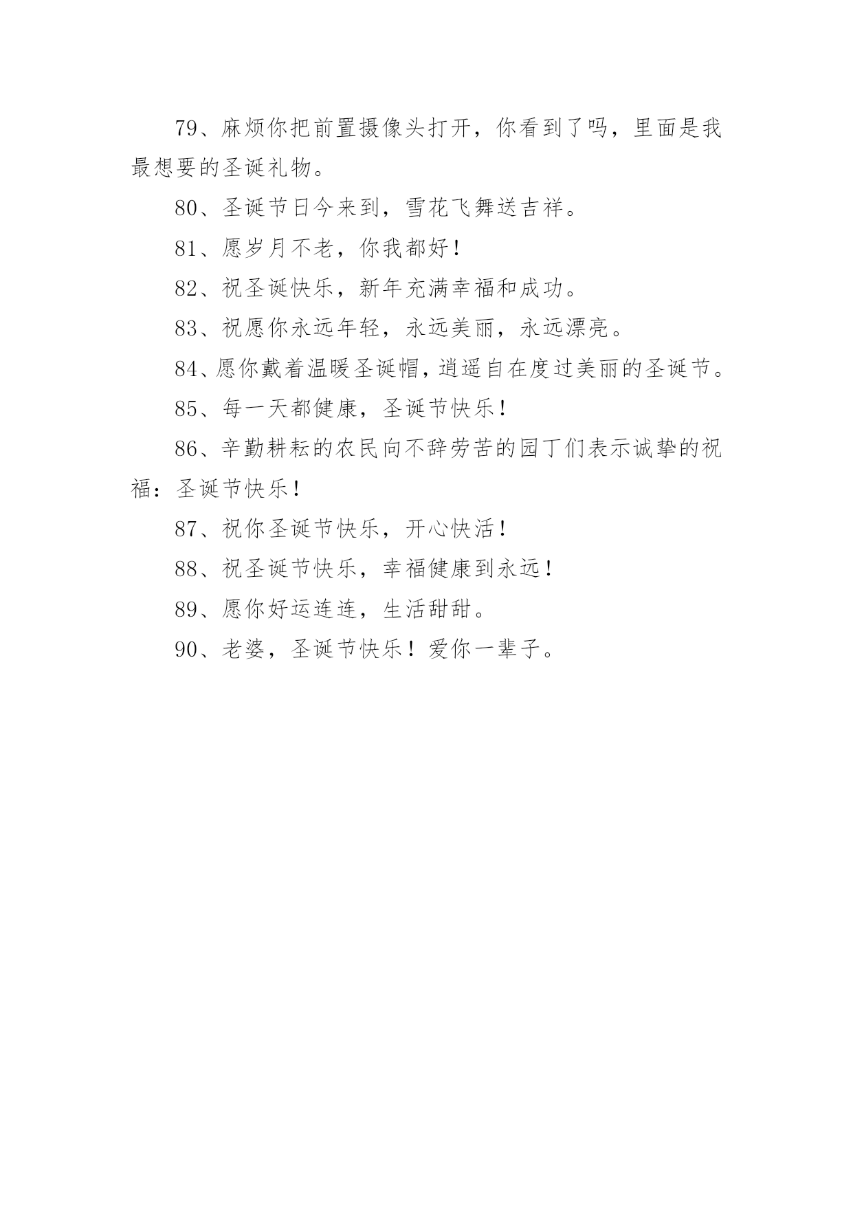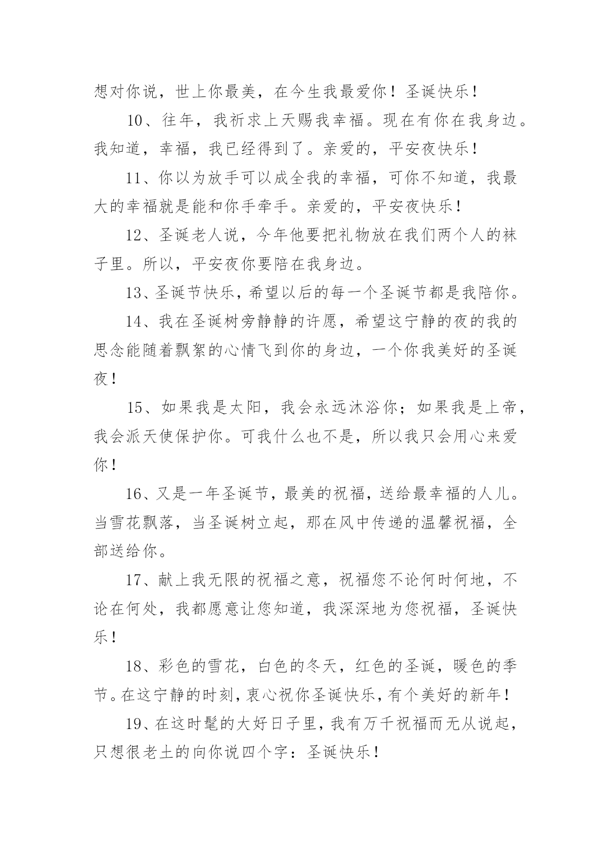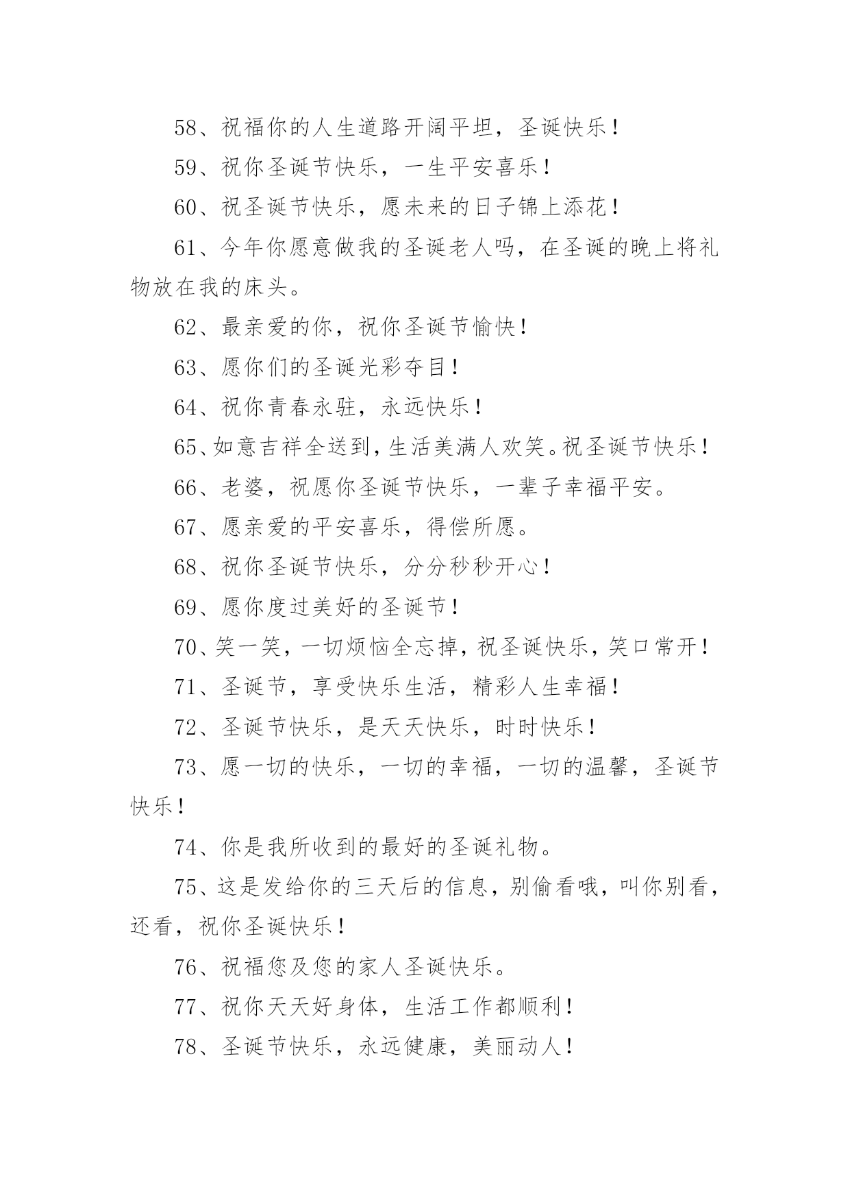 圣诞节圣诞树上的文案在平时的学习、工作或生活中,越来越多人喜欢在朋友圈上发布文案,文案对人们的思维是有一定的感性作用的。究竟什么样的文案才是特别的呢?下面是小编为大家收集的圣诞节圣诞树上的文案,仅供参考,欢迎大家阅读。1、圣诞节觉得好寂寞,因为没你在身边;其实我真的想你了,好想好想有你陪我渡过这个浪漫的平安夜。2、圣诞快乐,并不是只在特别的日子才会想起你,但是圣诞节的时候,一定会让你收到我的祝福。3、麻烦你把前置摄像头打开,你看到了吗,里面是我最想要的圣诞礼物。4、好久没有听到你的声音,好久没有人和我谈心,在雪花飞舞的日子里,真的好想你,祝圣诞节快乐!5、所有祝福揉成巧克力,要把一切喜庆变成奶油。永远快乐做成蛋糕,向你然后说声:圣诞快乐!6、圣诞节,让我深情的祝福化成雪花,轻轻地飘落在你的身上,慢慢地浸透融入到你的心里。7、有句话每年圣诞我都想说,可是苦于没有机会。现在我实在憋不住了,请把你留在我沙发上的袜子拿走!8、我盼望我等待圣诞节,手心里拽着精心制作的圣诞贺卡,寄给揣在怀里的名字,送去最真的祝福:圣诞快乐!9、圣诞,有圣诞老人,有你也有我,在这日子里,我想对你说,世上你最美,在今生我最爱你!圣诞快乐!10、往年,我祈求上天赐我幸福。现在有你在我身边。我知道,幸福,我已经得到了。亲爱的,平安夜快乐!11、你以为放手可以成全我的幸福,可你不知道,我最大的幸福就是能和你手牵手。亲爱的,平安夜快乐!12、圣诞老人说,今年他要把礼物放在我们两个人的袜子里。所以,平安夜你要陪在我身边。13、圣诞节快乐,希望以后的每一个圣诞节都是我陪你。14、我在圣诞树旁静静的许愿,希望这宁静的夜的我的思念能随着飘絮的心情飞到你的身边,一个你我美好的圣诞夜!15、如果我是太阳,我会永远沐浴你;如果我是上帝,我会派天使保护你。可我什么也不是,所以我只会用心来爱你!16、又是一年圣诞节,最美的祝福,送给最幸福的人儿。当雪花飘落,当圣诞树立起,那在风中传递的温馨祝福,全部送给你。17、献上我无限的祝福之意,祝福您不论何时何地,不论在何处,我都愿意让您知道,我深深地为您祝福,圣诞快乐!18、彩色的雪花,白色的冬天,红色的圣诞,暖色的季节。在这宁静的时刻,衷心祝你圣诞快乐,有个美好的新年!19、在这时髦的大好日子里,我有万千祝福而无从说起,只想很老土的向你说四个字:圣诞快乐!20、圣诞之花手中拿,圣诞新装身上穿,圣诞礼物包中藏,圣诞女神你何时来到我身旁?21、平安夜,祝福你!我的朋友,温磬平安!欢乐时,我和你一道分享;不开心时,我和你一起承担!22、每一朵雪花飘下,每一个烟火燃起,每一秒时间流动,每一份思念传送。都代表着我想要送你的每一个祝福!23、平安夜我们去聚餐,圣诞夜我们去唱歌,狂欢夜我们去蹦迪。我要和你在一起!24、奉上一颗祝福的心,在这特别的日子里,愿幸福如意快乐鲜花,一切美好的祝愿与你同在。25、你是我的,谁都抢不走,我就是这么霸道;我是你的,谁都领不走,我就是这么死心眼。圣诞快乐!26、这一个圣诞,是我们两个人的`第一个圣诞。愿有一场漫天飘舞的大雪见证我们纯洁永久的爱情。27、我无法给你全世界,但我的整个世界,都可以给你。圣诞快乐,我的小可爱!28、奉上一颗福的心,在这特别的日子里,愿幸福,如意,快乐,鲜花,一切美好的祝愿与你同在。圣诞快乐!29、你被我盯上了!请在这寒冷的日子里,多加件衣服!在此祝福你:圣诞快乐!30、今年你愿意做我的圣诞老人吗,在圣诞的晚上将礼物放在我的床头。31、不要圣诞礼物,只要你,因为有了你,我就有了全世界。32、圣诞树点燃了,无数的星辰亮起,天空上写下你的名字,当流星划过时,也把我的思念与祝福一同捎去。圣诞节快乐!33、在这圣诞来临之际,我愿你笑的像花一样的灿烂,伤心的时候有我宽厚的肩膀让你依靠,我忠心的祝福你!34、圣诞老人,你现在已经收到了我的祝福,请马上跑到烟囱口处等待礼物的派送吧,谢谢。35、爱情无非就是你疼疼我,我爱爱你,你关心关心我,我照顾照顾你。圣诞快乐!36、圣诞节即将到来,没准备好袜子别着急。只要你将手机打开,就能收到我送的大礼。37、你说你喜欢圣诞节,那我变成你的圣诞老人,你也会喜欢我吗?38、每一朵雪花飘下,每一个烟火燃起,每一秒时间流动,每一份思念传送。都代表着我想要送你的每一个祝福:圣诞快乐!39、捧给你无数个圣诞的祝福,让我们的友谊,积累成厚厚的愉快记忆,让人间的亲情,天堂的温馨撒遍海角天涯。40、在起风的清晨,在暖暖的午后,在绚烂的黄昏,在有流星的夜晚,我祈祷世间所有的美好全属于你,祝你圣诞节快乐!41、我记不起我的诞生,我记不起第一次野营,却记得圣诞节那日美美的你。42、奉上一颗祝福的心,在这个特别的日子里,愿幸福,如意,快乐,鲜花,一切美好的祝愿与你同在。圣诞快乐!43、我想在你最