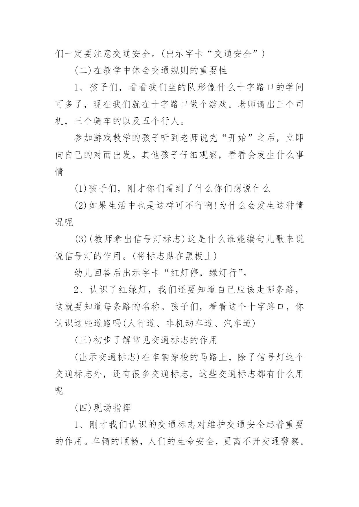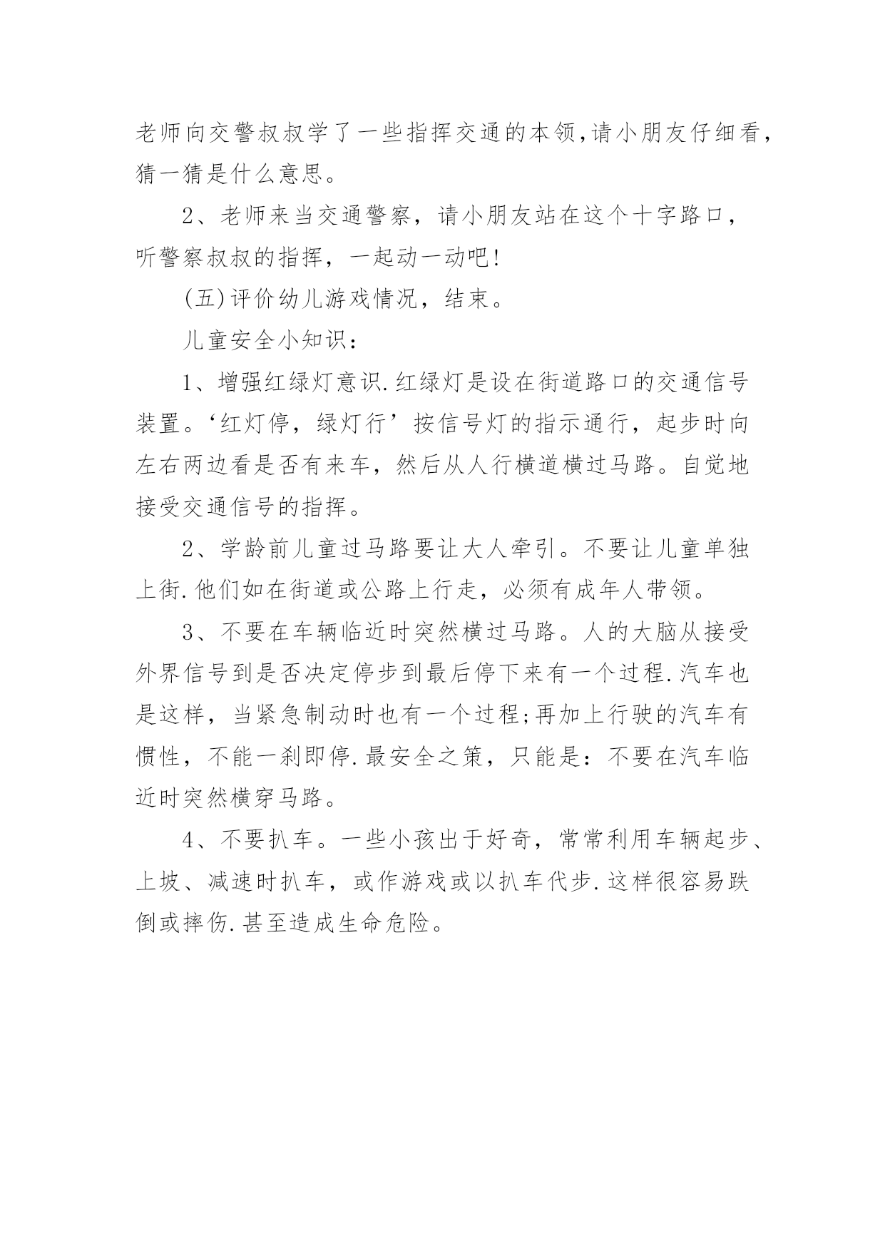 交通安全主题教案交通安全主题教案作为一名人民教师,就难以避免地要准备教案,借助教案可以让教学工作更科学化。写教案需要注意哪些格式呢?以下是小编为大家整理的交通安全主题教案,希望能够帮助到大家。一、教学目标:1、让幼儿在交流教学中认识一些常见的交通标志。2、让幼儿在游戏教学中体验交通规则的重要性,从而自觉地遵守交通规则。3、让幼儿在合作学习中学得一些基本的学习方法。二、教学准备:1、精心布置教学场景。2、收集各种交通标志(照片或图片)。3、字卡:交通安全、红灯停,绿灯行、人行道、非机动车道、汽车道。三、教学过程:(一)展开联想,揭示教学主题1、出示交通事故图片,请幼儿仔细观察。提问:孩子们,刚才你们看到了什么想到了什么2、多么可怕的车祸,为了不让这样的事情再发生,我们一定要注意交通安全。(出示字卡“交通安全”)(二)在教学中体会交通规则的重要性1、孩子们,看看我们坐的队形像什么十字路口的学问可多了,现在我们就在十字路口做个游戏。老师请出三个司机,三个骑车的以及五个行人。参加游戏教学的孩子听到老师说完“开始”之后,立即向自己的对面出发。其他孩子仔细观察,看看会发生什么事情(1)孩子们,刚才你们看到了什么你们想说什么(2)如果生活中也是这样可不行啊!为什么会发生这种情况呢(3)(教师拿出信号灯标志)这是什么谁能编句儿歌来说说信号灯的作用。(将标志贴在黑板上)幼儿回答后出示字卡“红灯停,绿灯行”。2、认识了红绿灯,我们还要知道自己应该走哪条路,这就要知道每条路的名称。孩子们,看看这个十字路口,你认识这些道路吗(人行道、非机动车道、汽车道)(三)初步了解常见交通标志的作用(出示交通标志)在车辆穿梭的马路上,除了信号灯这个交通标志外,还有很多交通标志,这些交通标志都有什么用呢(四)现场指挥1、刚才我们认识的交通标志对维护交通安全起着重要的作用。车辆的顺畅,人们的生命安全,更离不开交通警察。老师向交警叔叔学了一些指挥交通的本领,请小朋友仔细看,猜一猜是什么意思。2、老师来当交通警察,请小朋友站在这个十字路口,听警察叔叔的指挥,一起动一动吧!(五)评价幼儿游戏情况,结束。儿童安全小知识:1、增强红绿灯意识.红绿灯是设在街道路口的交通信号装置。‘红灯停,绿灯行’按信号灯的指示通行,起步时向左右两边看是否有来车,然后从人行横道横过马路。自觉地接受交通信号的指挥。2、学龄前儿童过马路要让大人牵引。不要让儿童单独上街.他们如在街道或公路上行走,必须有成年人带领。3、不要在车辆临近时突然横过马路。人的大脑从接受外界信号到是否决定停步到最后停下来有一个过程.汽车也是这样,当紧急制动时也有一个过程;再加上行驶的汽车有惯性,不能一刹即停.最安全之策,只能是:不要在汽车临近时突然横穿马路。4、不要扒车。一些小孩出于好奇,常常利用车辆起步、上坡、减速时扒车,或作游戏或以扒车代步.这样很容易跌倒或摔伤.甚至造成生命危险。