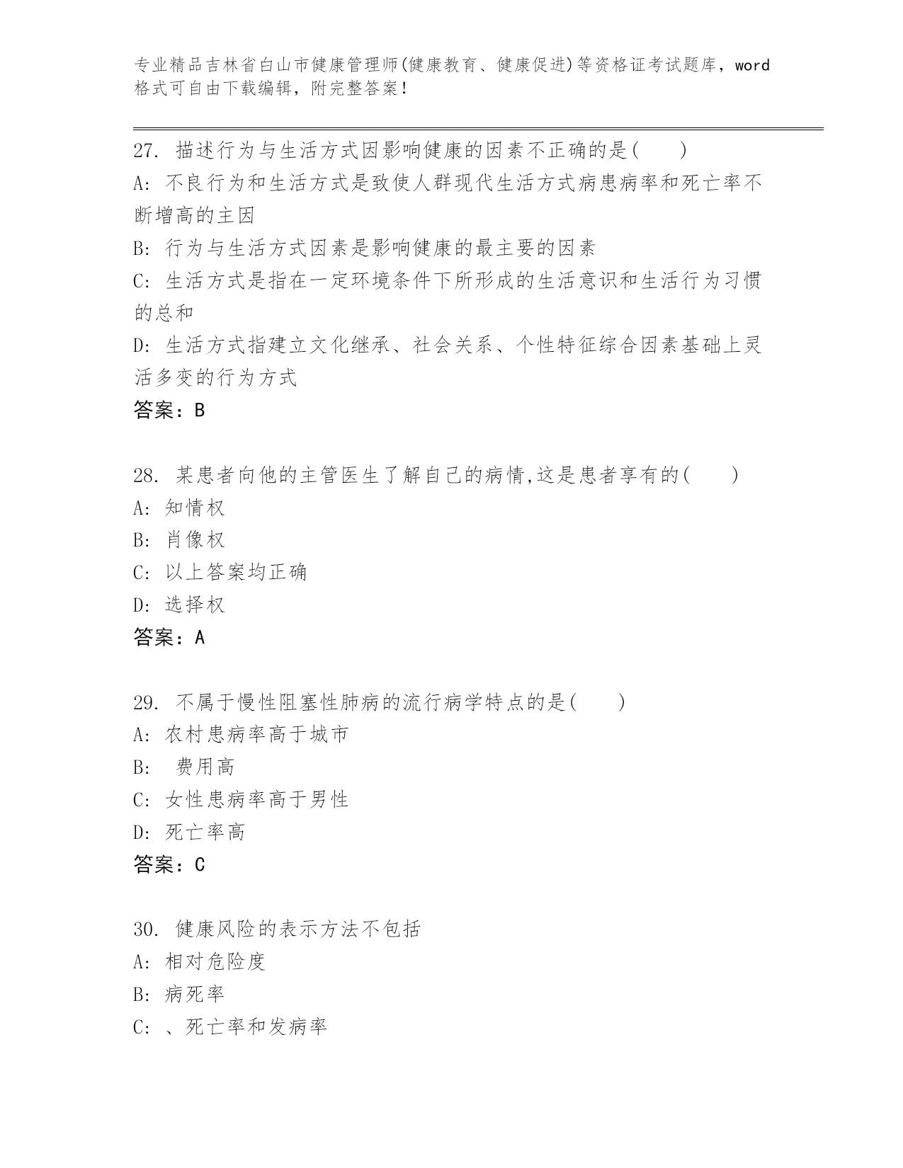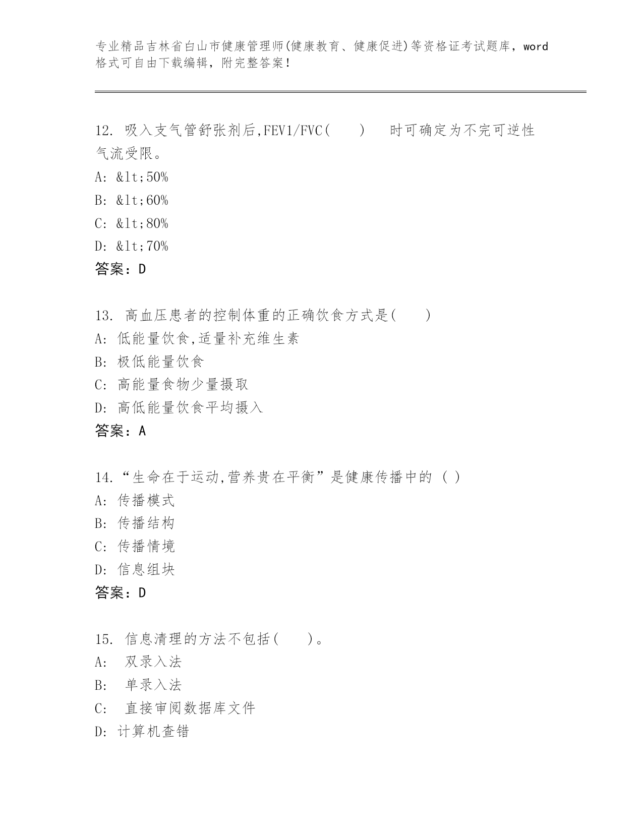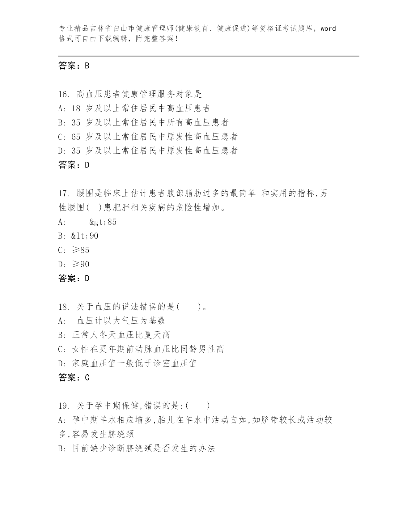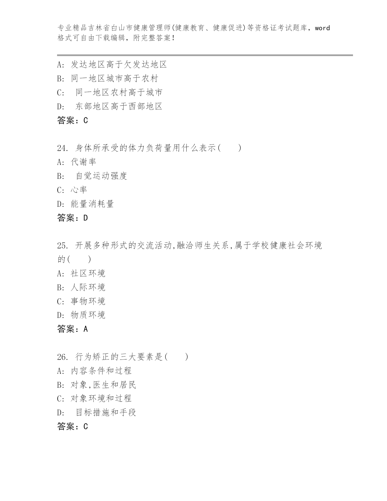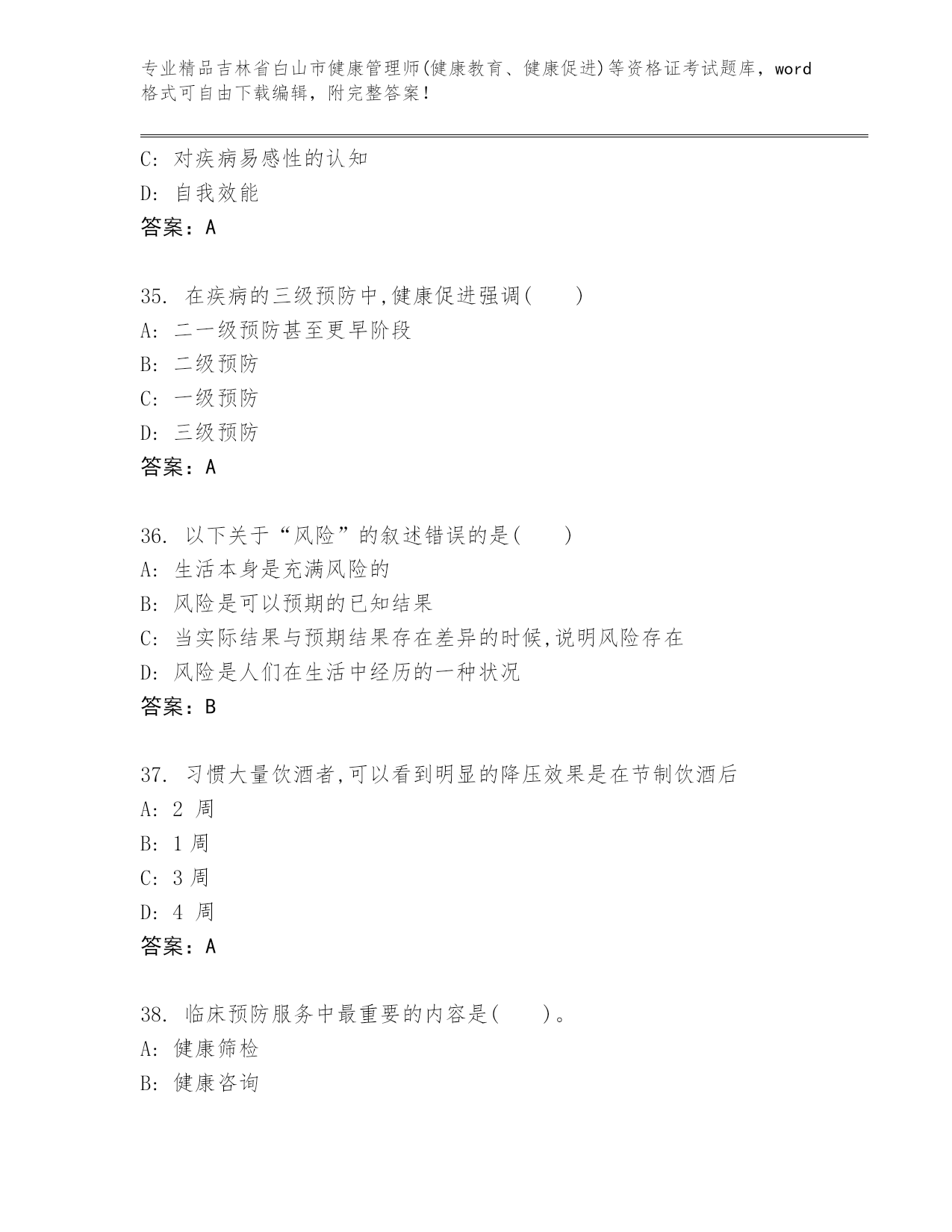 精品吉林省白山市健康管理师(健康教育、健康促进)等资格证考试大全含答案【预热题】