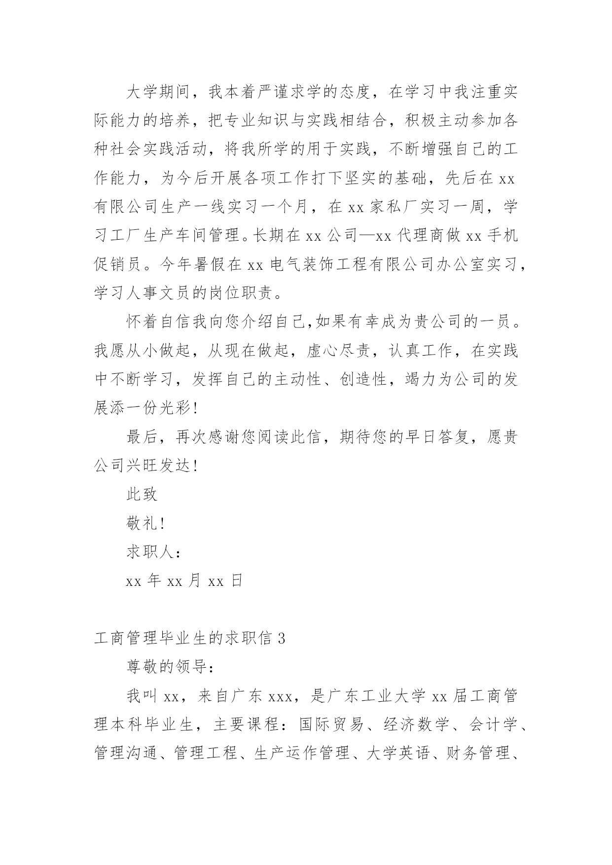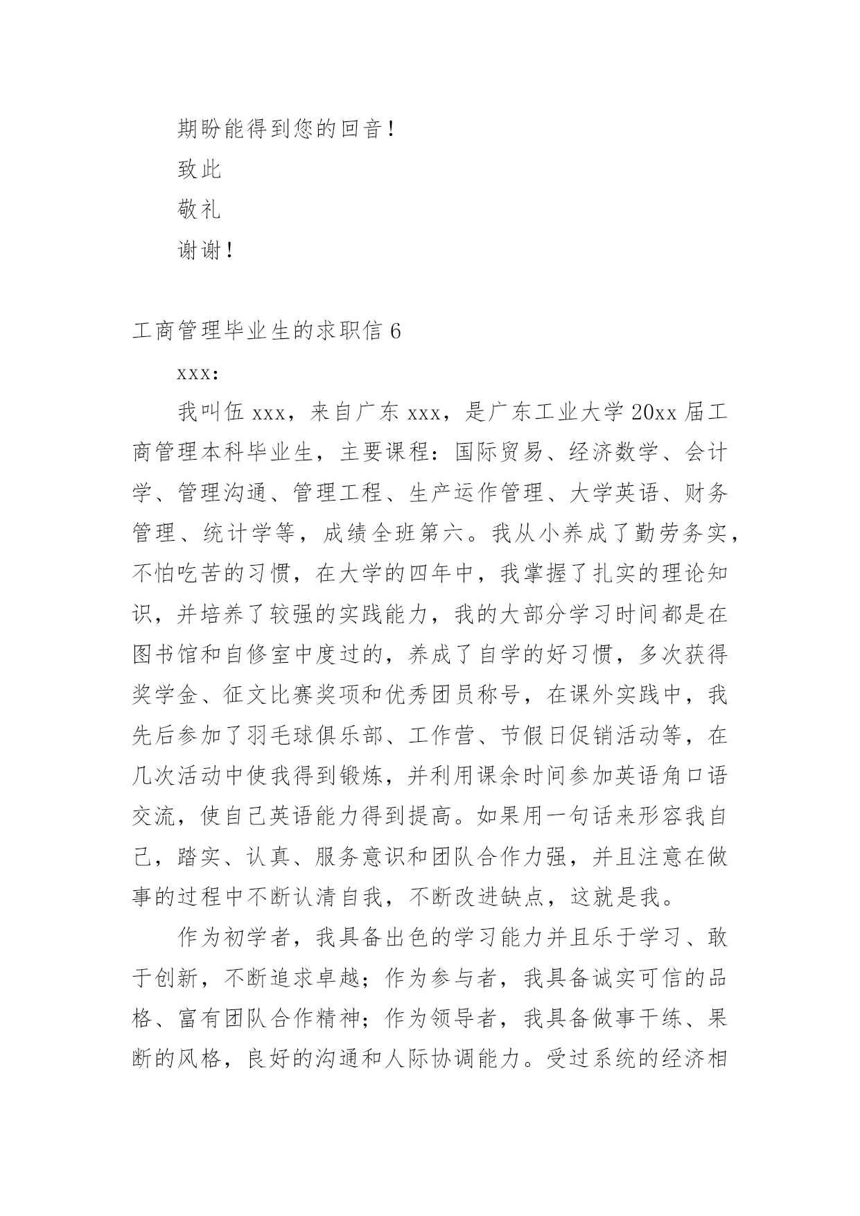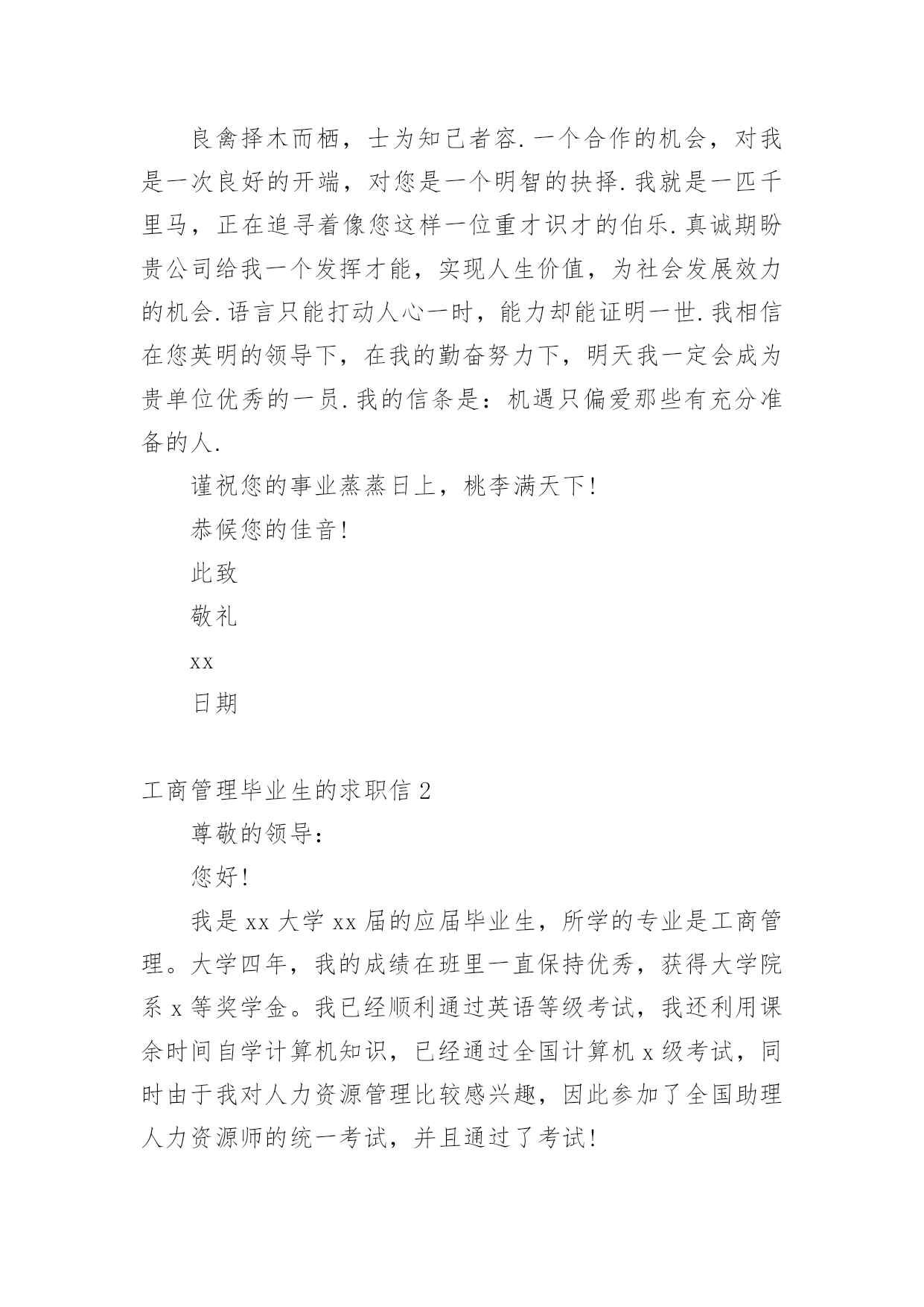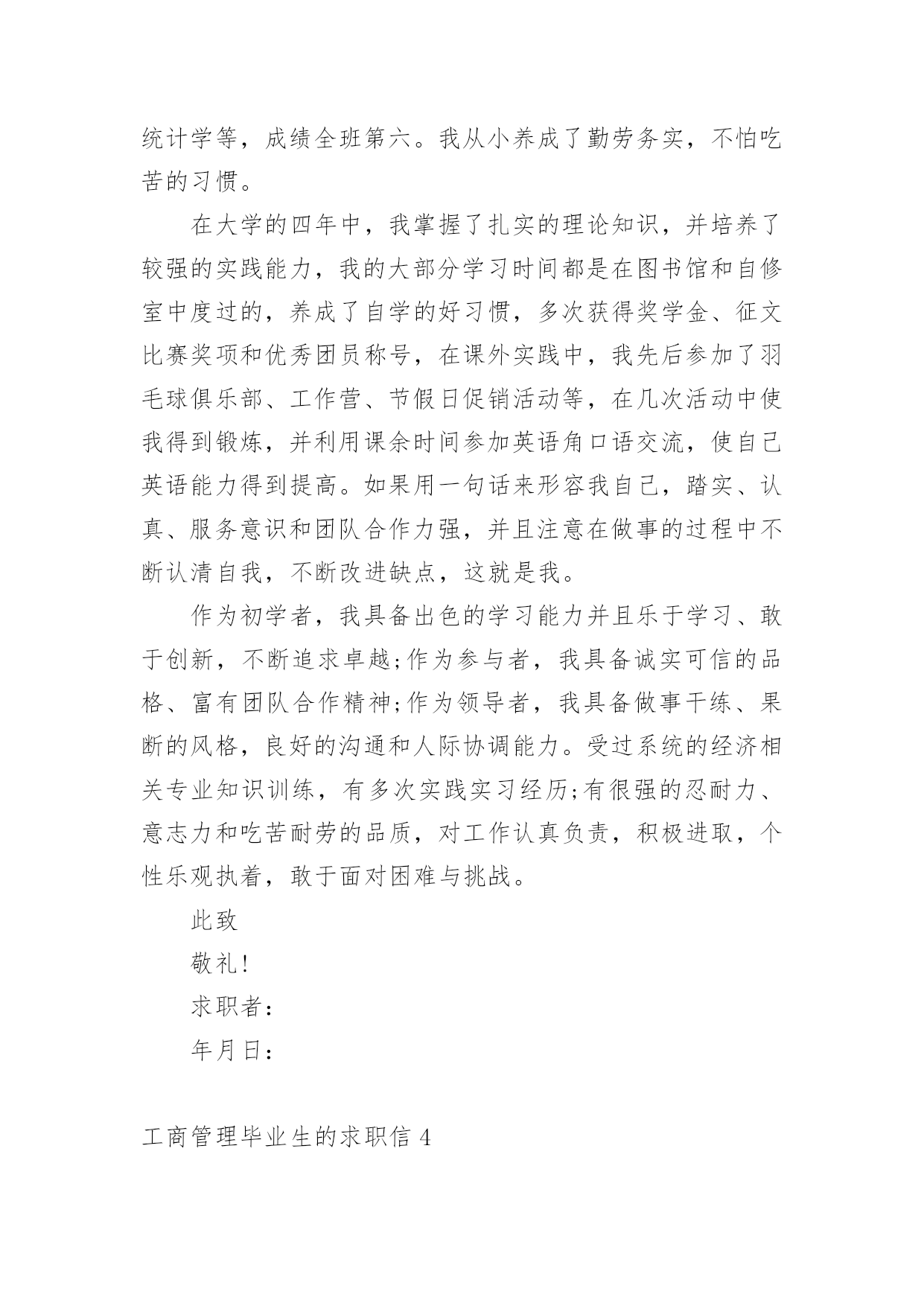 工商管理毕业生的求职信时光飞逝,时间在慢慢推演,前方等待着我们的将是新的工作机会和挑战,是时候静下心来写一封求职信了哦。求职信要怎么写?想必这让大家都很苦恼吧,以下是小编整理的工商管理毕业生的求职信,希望能够帮助到大家。工商管理毕业生的求职信1尊敬的领导:您好!感谢您利用宝贵时间关注我的求职信!我叫xx,今年22岁,身高一米八零,将于20xx年7月毕业于长春税务学院,为人忠诚老实、可靠;会电脑日常操作,在学生时多次获奖,并积极参加院校组织的各项活动,有着良好的生活作风和高度的组织记纪律性,意识觉悟较高,能够很好的贯彻执行命令,团队意识强,工作作风硬,不怕吃苦,敢于争先.工作责任心强,乐于助人,对上级赋予的任务积极性高、善于好学,对属于自己的工作能吃苦耐劳,有一定的基层管理经验.我学的专业是工商企业管理,但我并不拘泥于专业所限,对各行各业都充满了信心和热爱.当然,在工作之余,我最喜欢做的,就是看书和体育锻炼了.我喜欢看一些励志类的书籍,喜欢闲暇之余进行篮球,足球等球类活动!我认为,工作没有好的身体条件做后盾不行,没有灵活的头脑更是不可以!良禽择木而栖,士为知己者容.一个合作的机会,对我是一次良好的开端,对您是一个明智的抉择.我就是一匹千里马,正在追寻着像您这样一位重才识才的伯乐.真诚期盼贵公司给我一个发挥才能,实现人生价值,为社会发展效力的机会.语言只能打动人心一时,能力却能证明一世.我相信在您英明的领导下,在我的勤奋努力下,明天我一定会成为贵单位优秀的一员.我的信条是:机遇只偏爱那些有充分准备的人.谨祝您的事业蒸蒸日上,桃李满天下!恭候您的佳音!此致敬礼xx日期工商管理毕业生的求职信2尊敬的领导:您好!我是xx大学xx届的应届毕业生,所学的专业是工商管理。大学四年,我的成绩在班里一直保持优秀,获得大学院系x等奖学金。我已经顺利通过英语等级考试,我还利用课余时间自学计算机知识,已经通过全国计算机x级考试,同时由于我对人力资源管理比较感兴趣,因此参加了全国助理人力资源师的统一考试,并且通过了考试!大学期间,我本着严谨求学的态度,在学习中我注重实际能力的培养,把专业知识与实践相结合,积极主动参加各种社会实践活动,将我所学的用于实践,不断增强自己的工作能力,为今后开展各项工作打下坚实的基础,先后在xx有限公司生产一线实习一个月,在xx家私厂实习一周,学习工厂生产车间管理。长期在xx公司—xx代理商做xx手机促销员。今年暑假在xx电气装饰工程有限公司办公室实习,学习人事文员的岗位职责。怀着自信我向您介绍自己,如果有幸成为贵公司的一员。我愿从小做起,从现在做起,虚心尽责,认真工作,在实践中不断学习,发挥自己的主动性、创造性,竭力为公司的发展添一份光彩!最后,再次感谢您阅读此信,期待您的早日答复,愿贵公司兴旺发达!此致敬礼!求职人:xx年xx月xx日工商管理毕业生的求职信3尊敬的领导:我叫xx,来自广东xxx,是广东工业大学xx届工商管理本科毕业生,主要课程:国际贸易、经济数学、会计学、管理沟通、管理工程、生产运作管理、大学英语、财务管理、统计学等,成绩全班第六。我从小养成了勤劳务实,不怕吃苦的习惯。在大学的四年中,我掌握了扎实的理论知识,并培养了较强的实践能力,我的大部分学习时间都是在图书馆和自修室中度过的,养成了自学的好习惯,多次获得奖学金、征文比赛奖项和优秀团员称号,在课外实践中,我先后参加了羽毛球俱乐部、工作营、节假日促销活动等,在几次活动中使我得到锻炼,并利用课余时间参加英语角口语交流,使自己英语能力得到提高。如果用一句话来形容我自己,踏实、认真、服务意识和团队合作力强,并且注意在做事的过程中不断认清自我,不断改进缺点,这就是我。作为初学者,我具备出色的学习能力并且乐于学习、敢于创新,不断追求卓越;作为参与者,我具备诚实可信的品格、富有团队合作精神;作为领导者,我具备做事干练、果断的风格,良好的沟通和人际协调能力。受过系统的经济相关专业知识训练,有多次实践实习经历;有很强的忍耐力、意志力和吃苦耐劳的品质,对工作认真负责,积极进取,个性乐观执着,敢于面对困难与挑战。此致敬礼!求职者:年月日:工商管理毕业生的求职信4尊敬的XX公司领导:我叫XX,来自XX,是XX工业大学20xx届工商管理本科毕业生,主要课程:国际贸易、经济数学、会计学、管理沟通、管理工程、生产运作管理、大学英语、财务管理、统计学等,成绩全班第六。我从小养成了勤劳务实,不怕吃苦的习惯,在大学的四年中,我掌握了扎实的理论知识,并培养了较强的实践能力,我的大部分学习时间都是在图书馆和自修室中度过的,养成了自学的好习惯,多次获得奖学金、征文比赛奖项和优秀团员称号,在课外实践中,我先后参加了羽毛球俱乐部、工作营、节假日促销活动等,在几次活动中使我得到锻炼,并利用课余时间参加