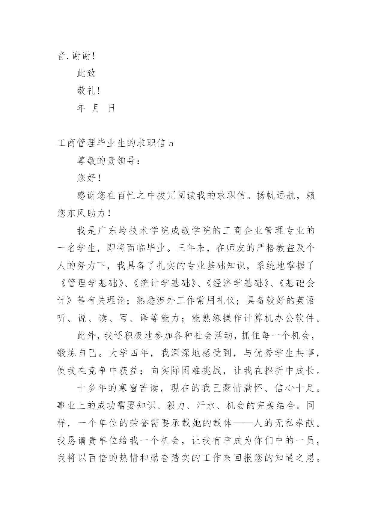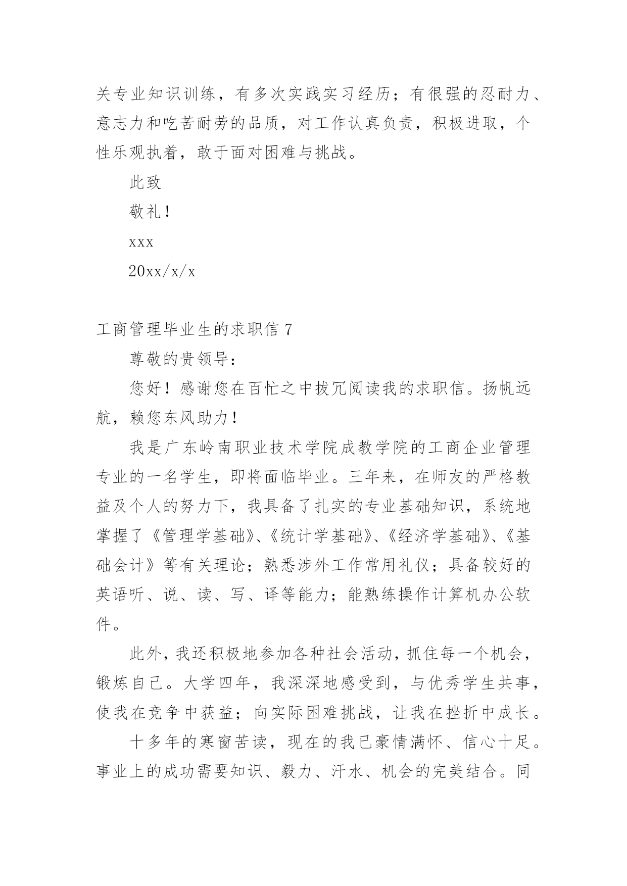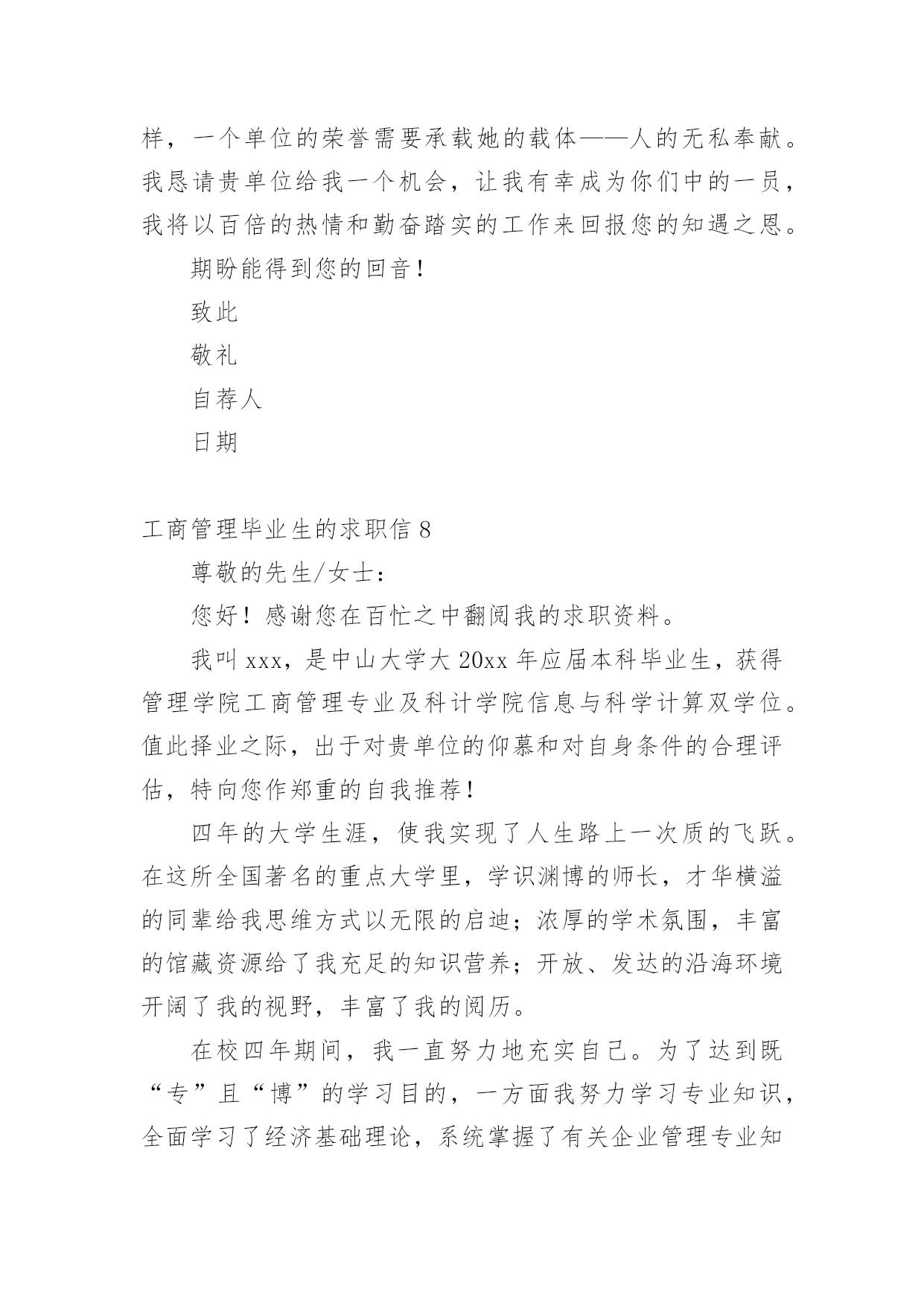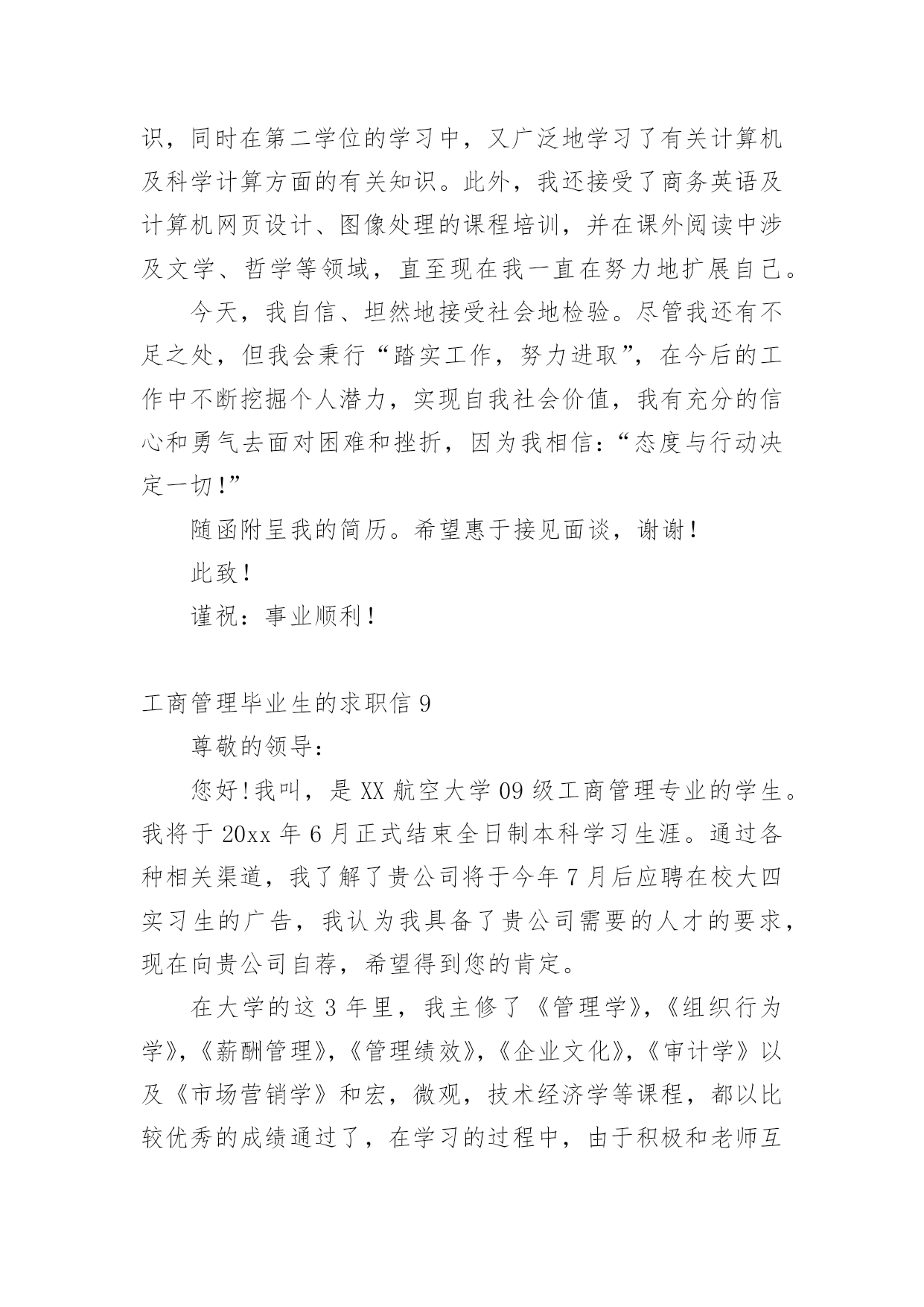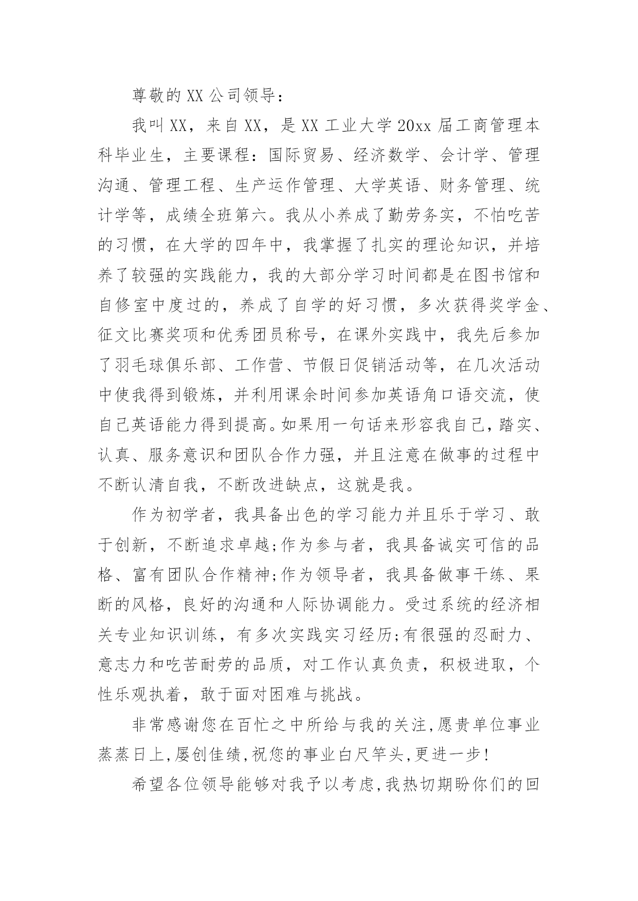 工商管理毕业生的求职信时光飞逝,时间在慢慢推演,前方等待着我们的将是新的工作机会和挑战,是时候静下心来写一封求职信了哦。求职信要怎么写?想必这让大家都很苦恼吧,以下是小编整理的工商管理毕业生的求职信,希望能够帮助到大家。工商管理毕业生的求职信1尊敬的领导:您好!感谢您利用宝贵时间关注我的求职信!我叫xx,今年22岁,身高一米八零,将于20xx年7月毕业于长春税务学院,为人忠诚老实、可靠;会电脑日常操作,在学生时多次获奖,并积极参加院校组织的各项活动,有着良好的生活作风和高度的组织记纪律性,意识觉悟较高,能够很好的贯彻执行命令,团队意识强,工作作风硬,不怕吃苦,敢于争先.工作责任心强,乐于助人,对上级赋予的任务积极性高、善于好学,对属于自己的工作能吃苦耐劳,有一定的基层管理经验.我学的专业是工商企业管理,但我并不拘泥于专业所限,对各行各业都充满了信心和热爱.当然,在工作之余,我最喜欢做的,就是看书和体育锻炼了.我喜欢看一些励志类的书籍,喜欢闲暇之余进行篮球,足球等球类活动!我认为,工作没有好的身体条件做后盾不行,没有灵活的头脑更是不可以!良禽择木而栖,士为知己者容.一个合作的机会,对我是一次良好的开端,对您是一个明智的抉择.我就是一匹千里马,正在追寻着像您这样一位重才识才的伯乐.真诚期盼贵公司给我一个发挥才能,实现人生价值,为社会发展效力的机会.语言只能打动人心一时,能力却能证明一世.我相信在您英明的领导下,在我的勤奋努力下,明天我一定会成为贵单位优秀的一员.我的信条是:机遇只偏爱那些有充分准备的人.谨祝您的事业蒸蒸日上,桃李满天下!恭候您的佳音!此致敬礼xx日期工商管理毕业生的求职信2尊敬的领导:您好!我是xx大学xx届的应届毕业生,所学的专业是工商管理。大学四年,我的成绩在班里一直保持优秀,获得大学院系x等奖学金。我已经顺利通过英语等级考试,我还利用课余时间自学计算机知识,已经通过全国计算机x级考试,同时由于我对人力资源管理比较感兴趣,因此参加了全国助理人力资源师的统一考试,并且通过了考试!大学期间,我本着严谨求学的态度,在学习中我注重实际能力的培养,把专业知识与实践相结合,积极主动参加各种社会实践活动,将我所学的用于实践,不断增强自己的工作能力,为今后开展各项工作打下坚实的基础,先后在xx有限公司生产一线实习一个月,在xx家私厂实习一周,学习工厂生产车间管理。长期在xx公司—xx代理商做xx手机促销员。今年暑假在xx电气装饰工程有限公司办公室实习,学习人事文员的岗位职责。怀着自信我向您介绍自己,如果有幸成为贵公司的一员。我愿从小做起,从现在做起,虚心尽责,认真工作,在实践中不断学习,发挥自己的主动性、创造性,竭力为公司的发展添一份光彩!最后,再次感谢您阅读此信,期待您的早日答复,愿贵公司兴旺发达!此致敬礼!求职人:xx年xx月xx日工商管理毕业生的求职信3尊敬的领导:我叫xx,来自广东xxx,是广东工业大学xx届工商管理本科毕业生,主要课程:国际贸易、经济数学、会计学、管理沟通、管理工程、生产运作管理、大学英语、财务管理、统计学等,成绩全班第六。我从小养成了勤劳务实,不怕吃苦的习惯。在大学的四年中,我掌握了扎实的理论知识,并培养了较强的实践能力,我的大部分学习时间都是在图书馆和自修室中度过的,养成了自学的好习惯,多次获得奖学金、征文比赛奖项和优秀团员称号,在课外实践中,我先后参加了羽毛球俱乐部、工作营、节假日促销活动等,在几次活动中使我得到锻炼,并利用课余时间参加英语角口语交流,使自己英语能力得到提高。如果用一句话来形容我自己,踏实、认真、服务意识和团队合作力强,并且注意在做事的过程中不断认清自我,不断改进缺点,这就是我。作为初学者,我具备出色的学习能力并且乐于学习、敢于创新,不断追求卓越;作为参与者,我具备诚实可信的品格、富有团队合作精神;作为领导者,我具备做事干练、果断的风格,良好的沟通和人际协调能力。受过系统的经济相关专业知识训练,有多次实践实习经历;有很强的忍耐力、意志力和吃苦耐劳的品质,对工作认真负责,积极进取,个性乐观执着,敢于面对困难与挑战。此致敬礼!求职者:年月日:工商管理毕业生的求职信4尊敬的XX公司领导:我叫XX,来自XX,是XX工业大学20xx届工商管理本科毕业生,主要课程:国际贸易、经济数学、会计学、管理沟通、管理工程、生产运作管理、大学英语、财务管理、统计学等,成绩全班第六。我从小养成了勤劳务实,不怕吃苦的习惯,在大学的四年中,我掌握了扎实的理论知识,并培养了较强的实践能力,我的大部分学习时间都是在图书馆和自修室中度过的,养成了自学的好习惯,多次获得奖学金、征文比赛奖项和优秀团员称号,在课外实践中,我先后参加了羽毛球俱乐部、工作营、节假日促销活动等,在几次活动中使我得到锻炼,并利用课余时间参加