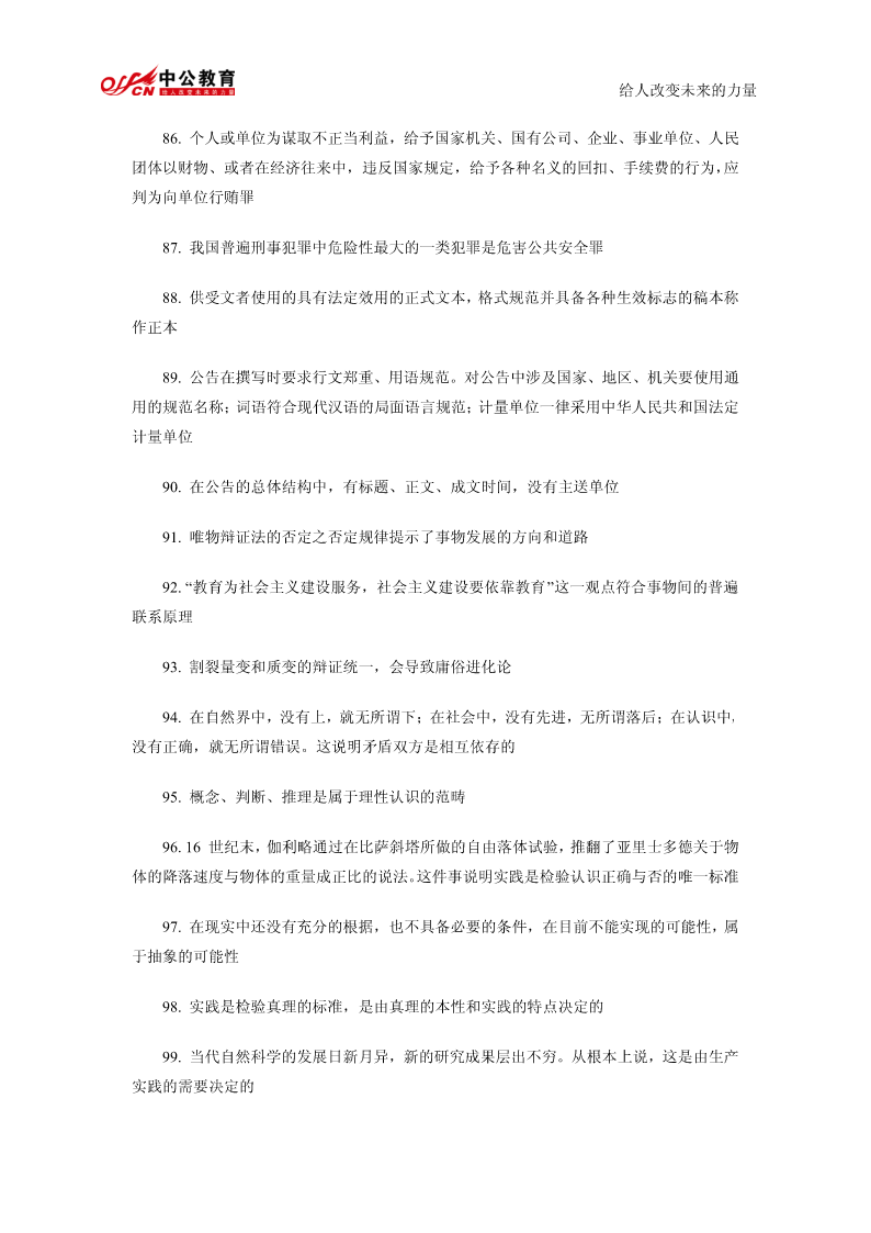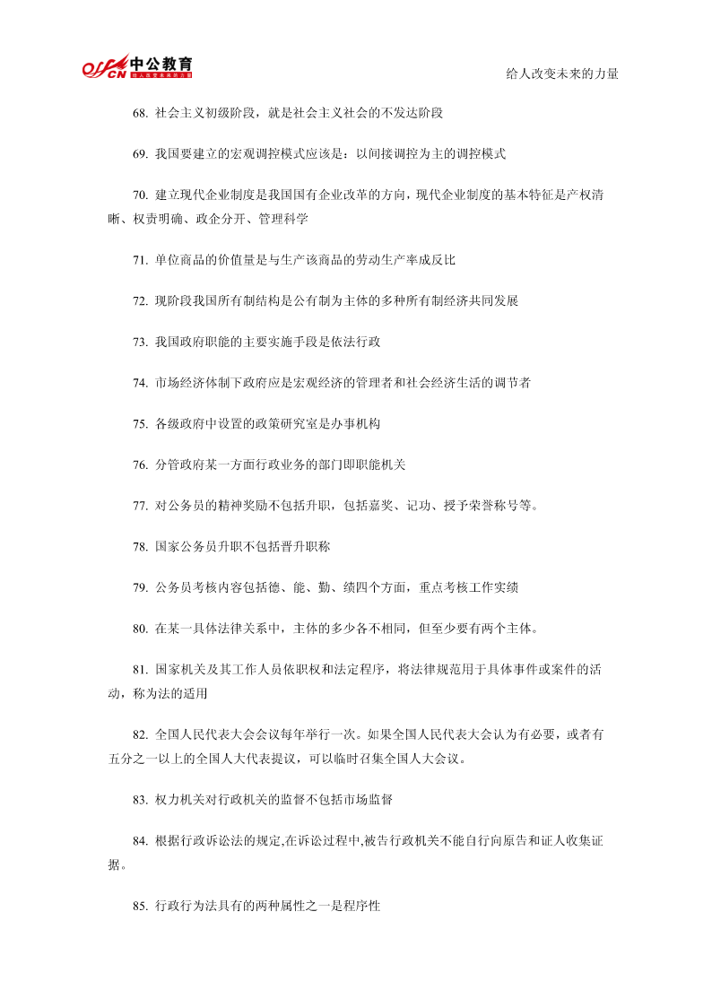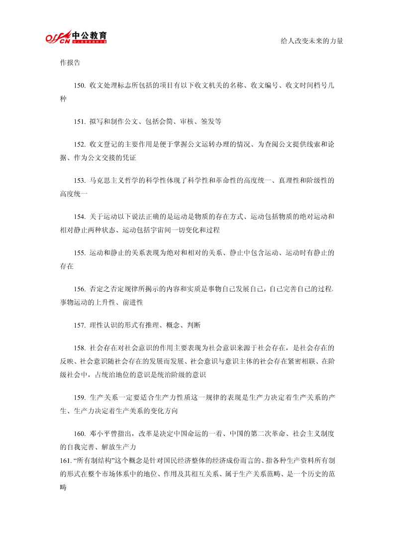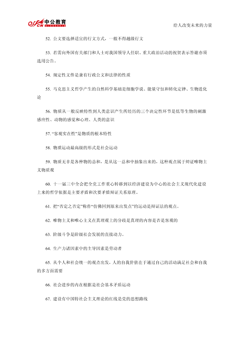 给人改变未来的力量公共基础知识精髓要点总结1.我国政权组织形式是人民代表大会制。2.行政许可是行政机关的批准行为。3.行政行为以受法律规范拘束的程度为标准,可以分为两类羁束行政行为与自由裁量行政行为。4.在诉讼期间的最后六个月内,因不可抗力或者其他障碍不能行使请求权的,诉讼时效中止。5.书写公文中的成文日期应使用汉字。6.规定用于依照有关法律规定发布行政法规和规章。7.以上请示事项当否,请即批复。8.命令不属于规定性文件,属于规定性文件的有规定、条例、办法。9.由机关领导对发文稿批注核准发出的意见并签署姓名及日期的活动,是发文处理中的签发。10.一切唯心主义哲学认为世界的本原是意识的。11.“静”的者,观点动之是认静也为静止是运动的特殊状态12.运动的主体是物质13.质变是事物根本性质的变化14.马克思主义哲学认为否定是辩证的否定。15.“离开革,而不以命实。”革命践的理论理论为指是空南的洞的实践理论是盲目的实践这段话强调的是要坚持理论和实践相结合的原则16.历史唯物主义的任务在于揭示社会发展的一般规律给人改变未来的力量17.社会进步的内在根据是社会基本矛盾运动18.在社会主义建设新时期,中国共产党完成指导思想拨乱反正的标志是党的十一届六中全会通过《关于建国以来党的若干历史问题的决议》19.邓小平对党的思想路线的贡献在于强调解放思想20.党的十四大把社会主义初级阶段理论作为社会主义发展阶段问题进行了新的论述,成为邓小平理论的重要基础。21.我国企业改革的目标是建立现代企业制度22.建立社会主义市场经济体制,就是要使市场在国家宏观调控下对生产力的配置起基础性作用23.当社会总需求大于社会总供给时,一般不宜采取松的货币政策24.劳动力市场是劳动力资源的交易和分配的场所25.根据现代企业制度的基本特征,企业拥有包括国家在内的出资者投资形成资产的全部法人财产权26.社会主义经济在资源的配置方面,最为有效的体制是社会主义市场经济体制27.社会保障体系的核心内容是:社会保险。28.“两手抓,两手都要硬”是社会主义精神文明建设的战略方针29.社会主义要消灭贫穷,这是由社会主义的本质决定的。30.我国政府职能的实施主体是各级人民政府。31.国家公务员享有的权利提出申诉和控告32.公务员若对降职处理不服,申请复议或申诉必须在接到降职决定之日起30日之内33.对公务员的物质奖励不包括奖章,包括奖金、奖品、工资晋级给人改变未来的力量34.按国家公务员领导职务序列,行政领导者可分为10个职务等次名称和相对应的13个级别。35.现代行政领导个体素质要求全面具备德、才、学、识、体。36.一般监督和专门监督构成行政系统的内部监督。37.集体决策已成为科学决策理论中的一项基本原则。38.日常工作中经常需要解决的一般性问题的决策是程序性决策39.立法监督的最基本形式是听取和审议政府工作报告40.情报信息系统是行政决策组织中的“神经系统”。41.现行行政决策体制通常由行政决策中枢系统、行政决策咨询系统、行政决策审批控制系统和行政决策领导系统四部分构成。42.在特殊情况下,国家可以成为法律关系的主体。43.“公民”这一概念是法律概念44.人民检察院对行政案件的审理的主要监督方式是抗诉45.行政诉讼的原告和被告是恒定的46.行政监督的对象是行政相对方47.刑法学是研究刑法及其所规定的犯罪和刑罚的科学。48.经营权是经营者对其经营的财产的一种占有、利用和收益的权利49.下列人员中不属于第一顺序继承人的兄弟姐妹,属于第一顺序继承人的有配偶、父母、子女50.行为人没有约定或法定的义务,为避免他人利益受损失而进行管理或服务所实施的行为是无因管理51.公文中的词语应含义确切给人改变未来的力量52.公文要选择适宜的行文方式,一般不得越级行文53.若需向外国有关部门和人士对我国领导人任职、重大政治活动的祝贺表示答谢亦须选用公告。54.规定性文件是兼有行政公文和法律的性质55.马克思主义哲学产生的自然科学基础是细胞学说、能量守恒和转化定律、生物进化论56.物质从一般反映特性到人类意识产生所经历的三个决定性环节是低等生物的刺激感应性、动物的感觉和心理、人类的意识57.“客观实在性”是物质的根本特性58.物质运动最高级的形式是社会运动59.物质无非是各种物的总和,是从这一总和中抽象出来的,这种观点属于辩证唯物主义物质观60.十一届三中全会把全党工作重心转移到以经济建设为中心的社会主义现代化建设上来的