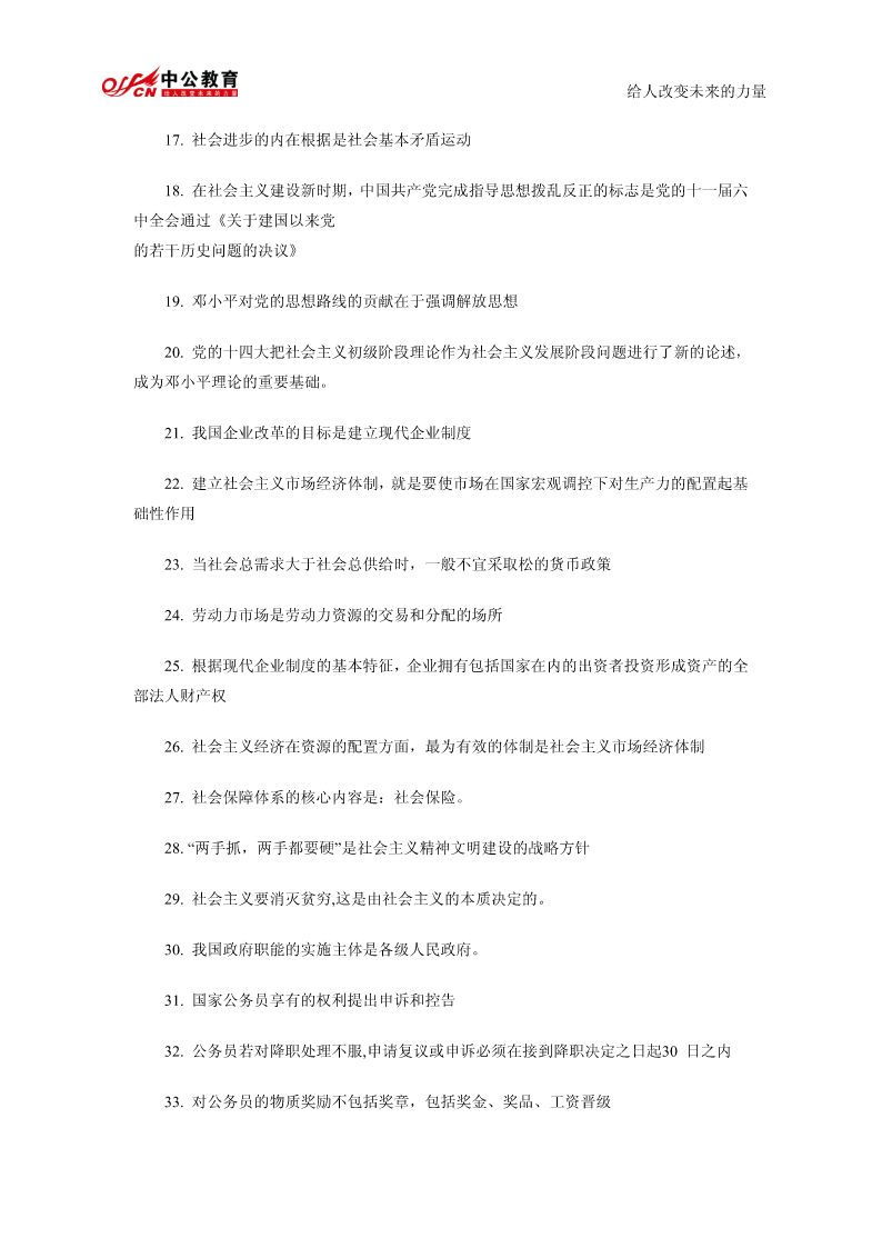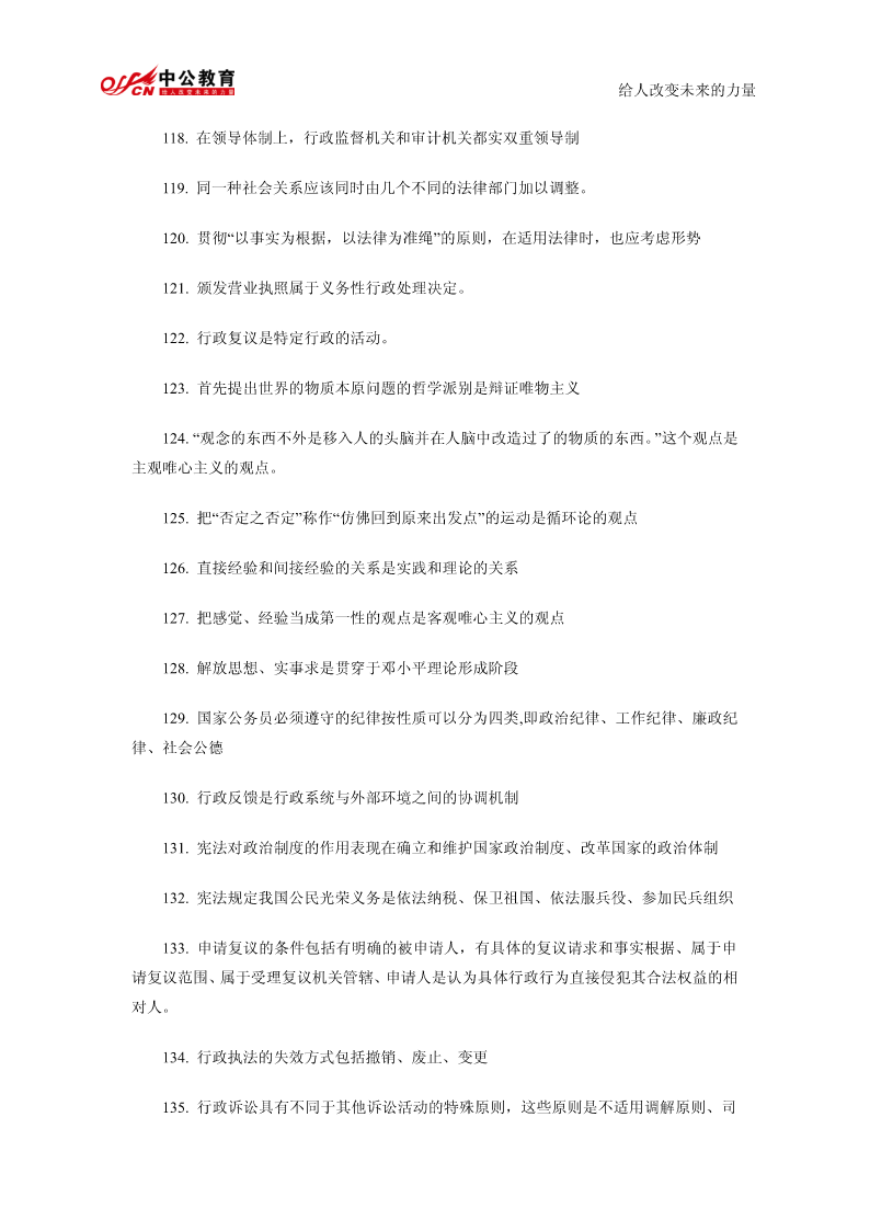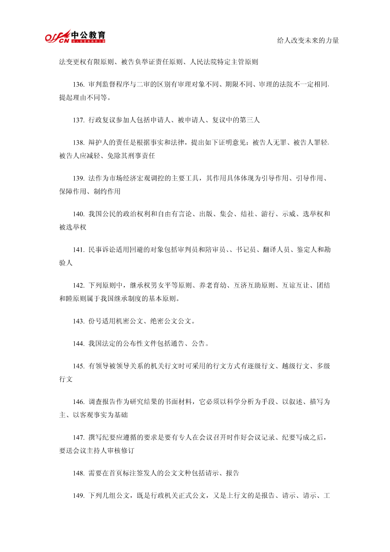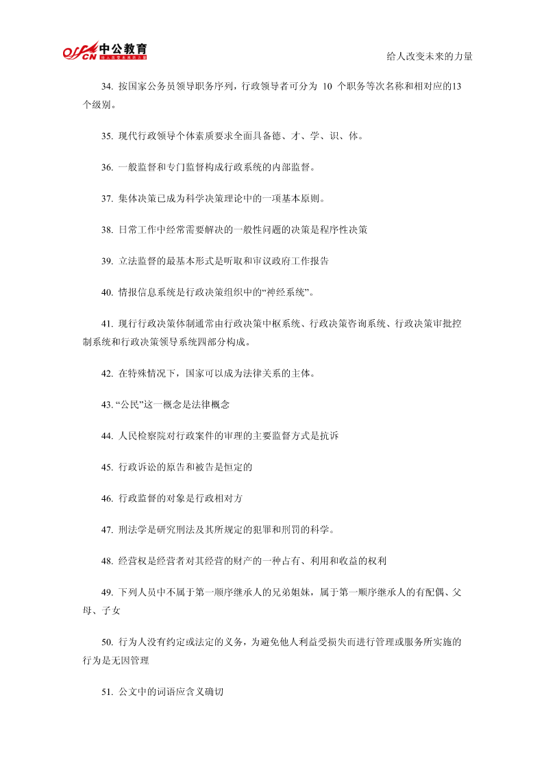 给人改变未来的力量公共基础知识精髓要点总结1.我国政权组织形式是人民代表大会制。2.行政许可是行政机关的批准行为。3.行政行为以受法律规范拘束的程度为标准,可以分为两类羁束行政行为与自由裁量行政行为。4.在诉讼期间的最后六个月内,因不可抗力或者其他障碍不能行使请求权的,诉讼时效中止。5.书写公文中的成文日期应使用汉字。6.规定用于依照有关法律规定发布行政法规和规章。7.以上请示事项当否,请即批复。8.命令不属于规定性文件,属于规定性文件的有规定、条例、办法。9.由机关领导对发文稿批注核准发出的意见并签署姓名及日期的活动,是发文处理中的签发。10.一切唯心主义哲学认为世界的本原是意识的。11.“静”的者,观点动之是认静也为静止是运动的特殊状态12.运动的主体是物质13.质变是事物根本性质的变化14.马克思主义哲学认为否定是辩证的否定。15.“离开革,而不以命实。”革命践的理论理论为指是空南的洞的实践理论是盲目的实践这段话强调的是要坚持理论和实践相结合的原则16.历史唯物主义的任务在于揭示社会发展的一般规律给人改变未来的力量17.社会进步的内在根据是社会基本矛盾运动18.在社会主义建设新时期,中国共产党完成指导思想拨乱反正的标志是党的十一届六中全会通过《关于建国以来党的若干历史问题的决议》19.邓小平对党的思想路线的贡献在于强调解放思想20.党的十四大把社会主义初级阶段理论作为社会主义发展阶段问题进行了新的论述,成为邓小平理论的重要基础。21.我国企业改革的目标是建立现代企业制度22.建立社会主义市场经济体制,就是要使市场在国家宏观调控下对生产力的配置起基础性作用23.当社会总需求大于社会总供给时,一般不宜采取松的货币政策24.劳动力市场是劳动力资源的交易和分配的场所25.根据现代企业制度的基本特征,企业拥有包括国家在内的出资者投资形成资产的全部法人财产权26.社会主义经济在资源的配置方面,最为有效的体制是社会主义市场经济体制27.社会保障体系的核心内容是:社会保险。28.“两手抓,两手都要硬”是社会主义精神文明建设的战略方针29.社会主义要消灭贫穷,这是由社会主义的本质决定的。30.我国政府职能的实施主体是各级人民政府。31.国家公务员享有的权利提出申诉和控告32.公务员若对降职处理不服,申请复议或申诉必须在接到降职决定之日起30日之内33.对公务员的物质奖励不包括奖章,包括奖金、奖品、工资晋级给人改变未来的力量34.按国家公务员领导职务序列,行政领导者可分为10个职务等次名称和相对应的13个级别。35.现代行政领导个体素质要求全面具备德、才、学、识、体。36.一般监督和专门监督构成行政系统的内部监督。37.集体决策已成为科学决策理论中的一项基本原则。38.日常工作中经常需要解决的一般性问题的决策是程序性决策39.立法监督的最基本形式是听取和审议政府工作报告40.情报信息系统是行政决策组织中的“神经系统”。41.现行行政决策体制通常由行政决策中枢系统、行政决策咨询系统、行政决策审批控制系统和行政决策领导系统四部分构成。42.在特殊情况下,国家可以成为法律关系的主体。43.“公民”这一概念是法律概念44.人民检察院对行政案件的审理的主要监督方式是抗诉45.行政诉讼的原告和被告是恒定的46.行政监督的对象是行政相对方47.刑法学是研究刑法及其所规定的犯罪和刑罚的科学。48.经营权是经营者对其经营的财产的一种占有、利用和收益的权利49.下列人员中不属于第一顺序继承人的兄弟姐妹,属于第一顺序继承人的有配偶、父母、子女50.行为人没有约定或法定的义务,为避免他人利益受损失而进行管理或服务所实施的行为是无因管理51.公文中的词语应含义确切给人改变未来的力量52.公文要选择适宜的行文方式,一般不得越级行文53.若需向外国有关部门和人士对我国领导人任职、重大政治活动的祝贺表示答谢亦须选用公告。54.规定性文件是兼有行政公文和法律的性质55.马克思主义哲学产生的自然科学基础是细胞学说、能量守恒和转化定律、生物进化论56.物质从一般反映特性到人类意识产生所经历的三个决定性环节是低等生物的刺激感应性、动物的感觉和心理、人类的意识57.“客观实在性”是物质的根本特性58.物质运动最高级的形式是社会运动59.物质无非是各种物的总和,是从这一总和中抽象出来的,这种观点属于辩证唯物主义物质观60.十一届三中全会把全党工作重心转移到以经济建设为中心的社会主义现代化建设上来的