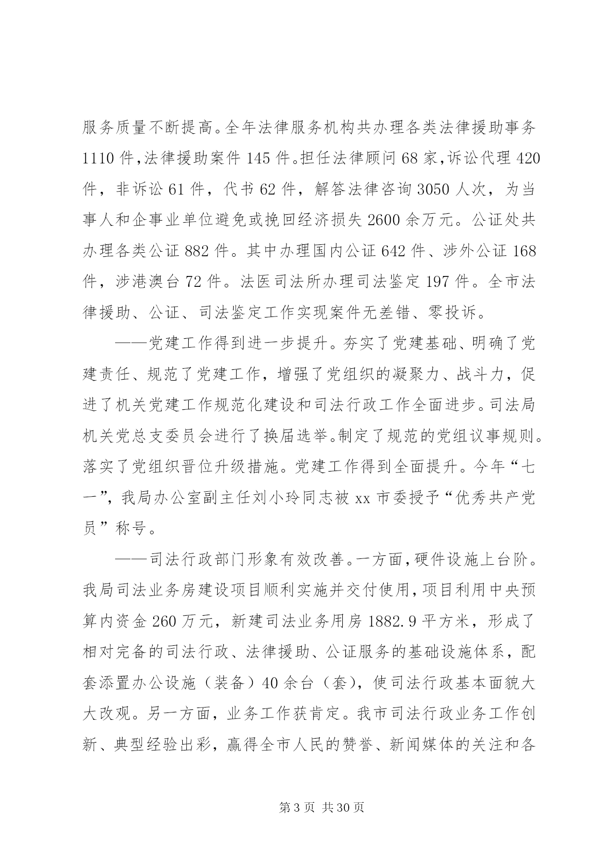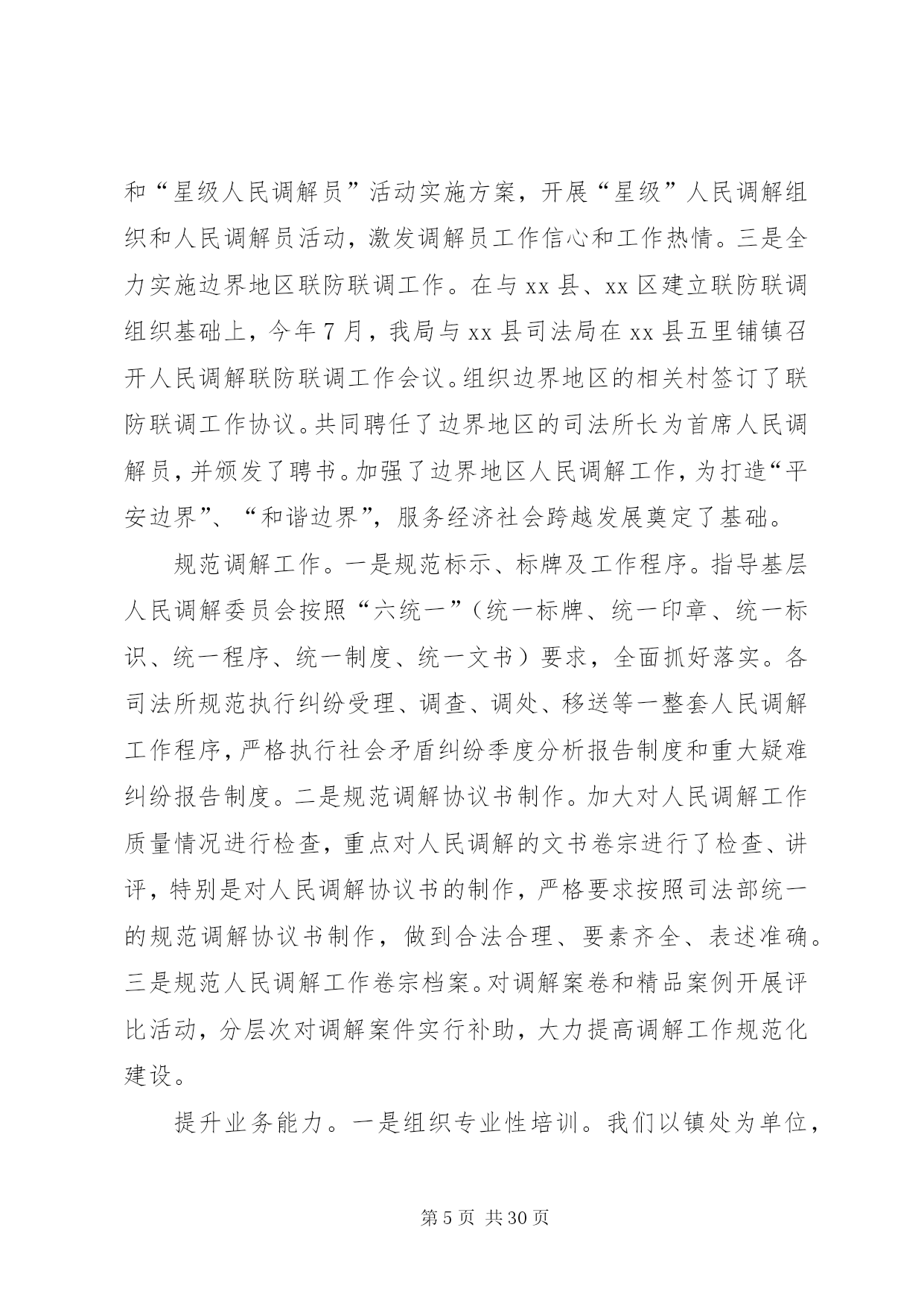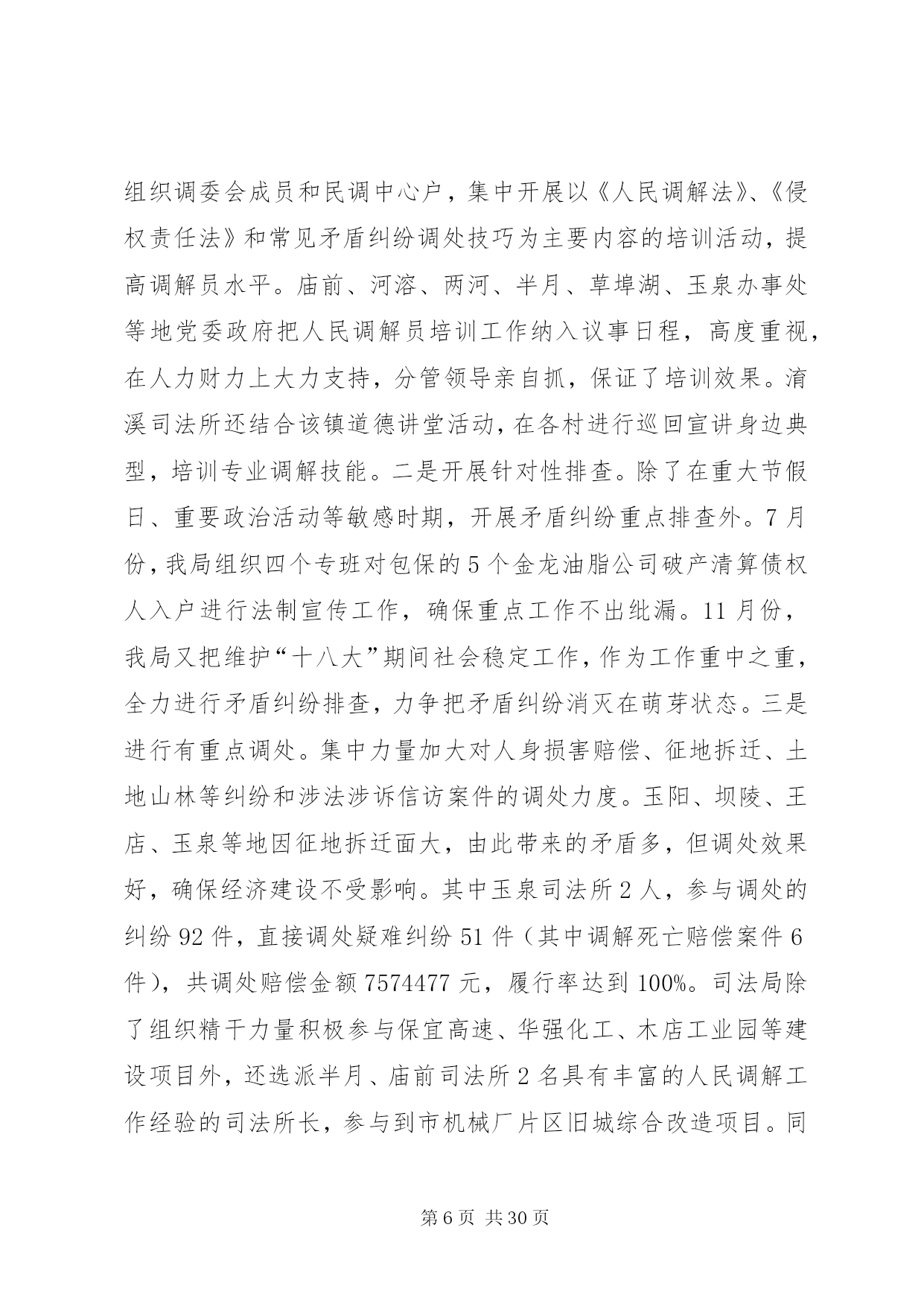 第PAGE\*Arabic\*MERGEFORMAT30页共NUMPAGES\*MERGEFORMAT30页市司法局工作总结20**年,我局紧紧围绕市委、市政府提出的“争宜昌前三、争全省十强”奋斗目标,以服务当阳跨越式发展为第一要务,以“平安当阳建设年”活动为抓手,以“喜迎十八大、争创新业绩、推进新跨越”主题实践活动为统领,以深化三项重点工作为着力点,以更高标准、更高要求、更大作为,奋力推动司法行政各项工作实现了新跨越。一、20**年工作取得的成绩——人民调解工作成效显著。组织网络体系有效覆盖。法务网格工程整体推进,边界地区联防联调不断延伸,使人民调解工作形成纵向到底的工作网络和横向到边的无缝对接。全市已建立法务网格指导中心10个、法务网格工作站173个、划分网格1087个。已与xx县、xx区及xx市xx县联合聘请首席人民调解员9名,组织边界村签署联防联调协议10份。一年来,全市共开展各类矛盾纠纷排查955次。共调处各类矛盾纠纷2284件(其中民调中心户调解838件),调解成功2235件,成功率达97.8%。涉案金额2553.92万元。司法所人员共调处各类纠纷439件,人均调处19件。防止民间纠纷可能引起的自杀6件、防止民间纠纷可能引起的民转刑42件91人次、防止群体性上访93件1380人次、防止群体性械斗9件161人,人民调解工作“第一道防线”作用得到充分发挥。——普法依法治理工作有序推进。“六五”普法顺利启动实施。我市领导干部带头学法,市委中心组全年专题安排3场法律法规学习讲座。专门外聘专家教授为我市各级领导干部集中授课。全市公务员、学生、企事业单位职工、城乡居民共计30多万名普法对象积极投身普法学习,全市累积发放普法书籍、宣传资料10万余册。普法依法治理活动丰富多彩。全市以“平安当阳建设年”活动为核心的各类法制宣传教育活动在各地有效开展,吸引了广大市民的热心参与。法制宣传实施不断完善,各镇(办事处)基本达到了“五个一”的标准:即每个镇(办事处)建立一个法律咨询站、每个行政村和社区建立一个法制宣传栏、每个湾子屋场明确一个法律宣传中心户(民调中心户)、为每个农户赠送一本法律书、每户培养一个法律明白人。学法、用法、守法、依法办事意识显著增强。——社区矫正安置帮教工作不断规范。学习教育和劳动基地建设取得新进展,多方协调机制逐步建立。安置帮教工作形成常态化。矫正人员和帮教对象无重新犯罪现象。从2007年12月开始至今,我市共接收社区矫正人员933人,期满解教619人,现在册314人。今年共接收矫正人员204人。安置帮教五年在册1138人,其中2008年225人、2009年250人、2010年221人、2011年247人、2012年195人。——法律服务和法律援助质效双增。律师和法律服务人员监管不断规范,法律援助案件数量不断上升,服务质量不断提高。全年法律服务机构共办理各类法律援助事务1110件,法律援助案件145件。担任法律顾问68家,诉讼代理420件,非诉讼61件,代书62件,解答法律咨询3050人次,为当事人和企事业单位避免或挽回经济损失2600余万元。公证处共办理各类公证882件。其中办理国内公证642件、涉外公证168件,涉港澳台72件。法医司法所办理司法鉴定197件。全市法律援助、公证、司法鉴定工作实现案件无差错、零投诉。——党建工作得到进一步提升。夯实了党建基础、明确了党建责任、规范了党建工作,增强了党组织的凝聚力、战斗力,促进了机关党建工作规范化建设和司法行政工作全面进步。司法局机关党总支委员会进行了换届选举。制定了规范的党组议事规则。落实了党组织晋位升级措施。党建工作得到全面提升。今年“七一”,我局办公室副主任刘小玲同志被xx市委授予“优秀共产党员”称号。——司法行政部门形象有效改善。一方面,硬件设施上台阶。我局司法业务房建设项目顺利实施并交付使用,项目利用中央预算内资金260万元,新建司法业务用房1882.9平方米,形成了相对完备的司法行政、法律援助、公证服务的基础设施体系,配套添置办公设施(装备)40余台(套),使司法行政基本面貌大大改观。另一方面,业务工作获肯定。我市司法行政业务工作创新、典型经验出彩,赢得全市人民的赞誉、新闻媒体的关注和各级领导的高度肯定。人民日报、法制日报、湖北日报等8家中央、省、市新闻媒体联合组团,对我市人民调解“三级中心五级网络”及基层人民调解委员会经验做法进行专题采访;两河镇赵闸村调解主任张青山,先后入围全省“十大金牌人民调解员”和“十大法治人物”评选,其典型事迹得到了广大农民和上级组织的一致好评。今年,玉泉司法所被司法部授予“全国模范司法所”,庙前镇人民调解委员会被省人民调解领导小组表彰为“百佳人民调解委员会”,我局作为xx市唯一一家司法局被XX省司法厅表