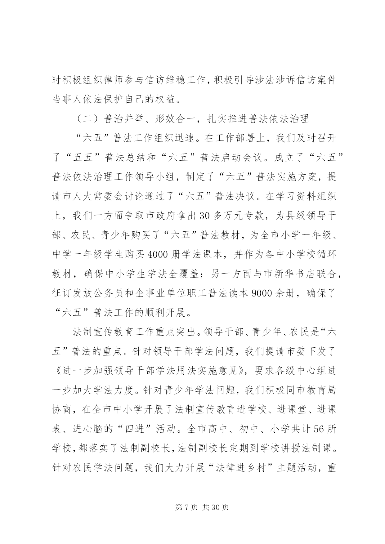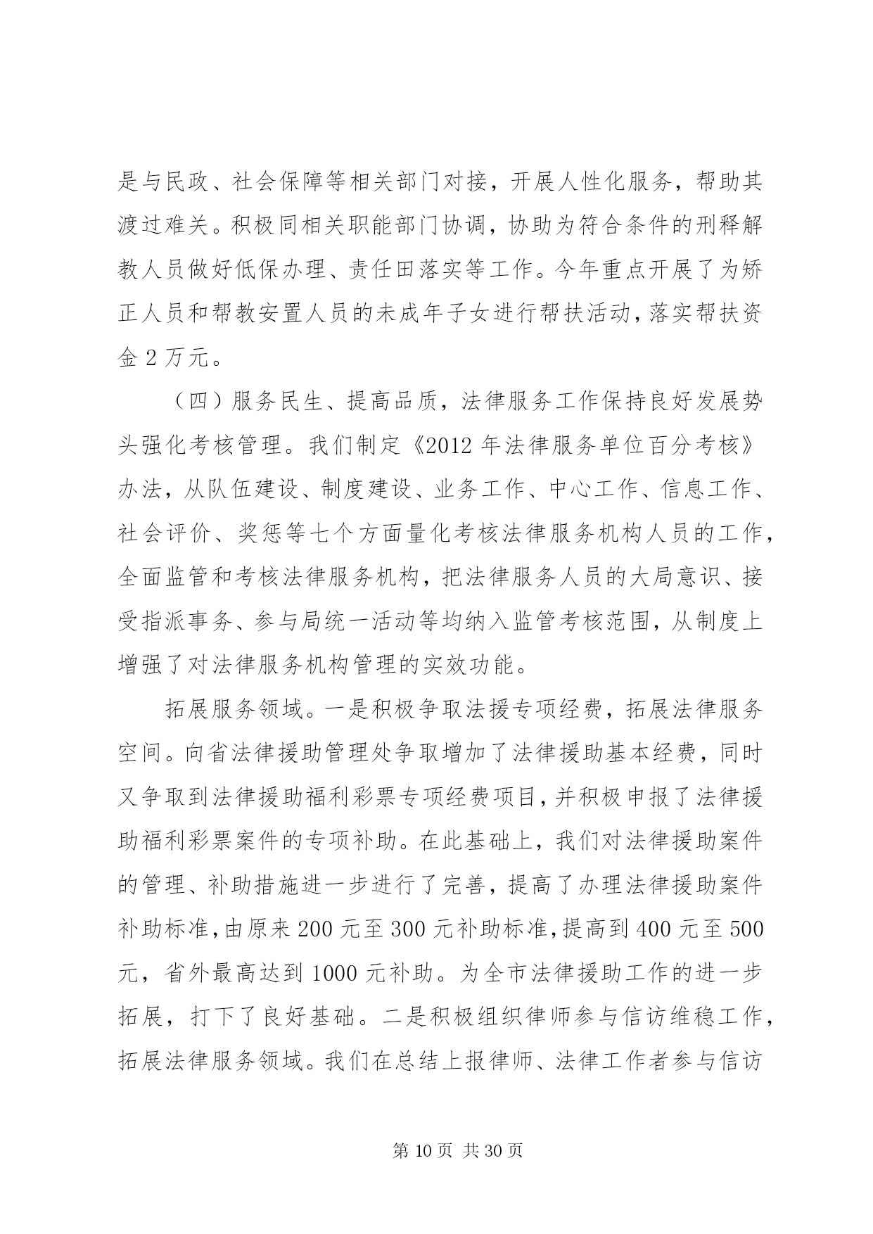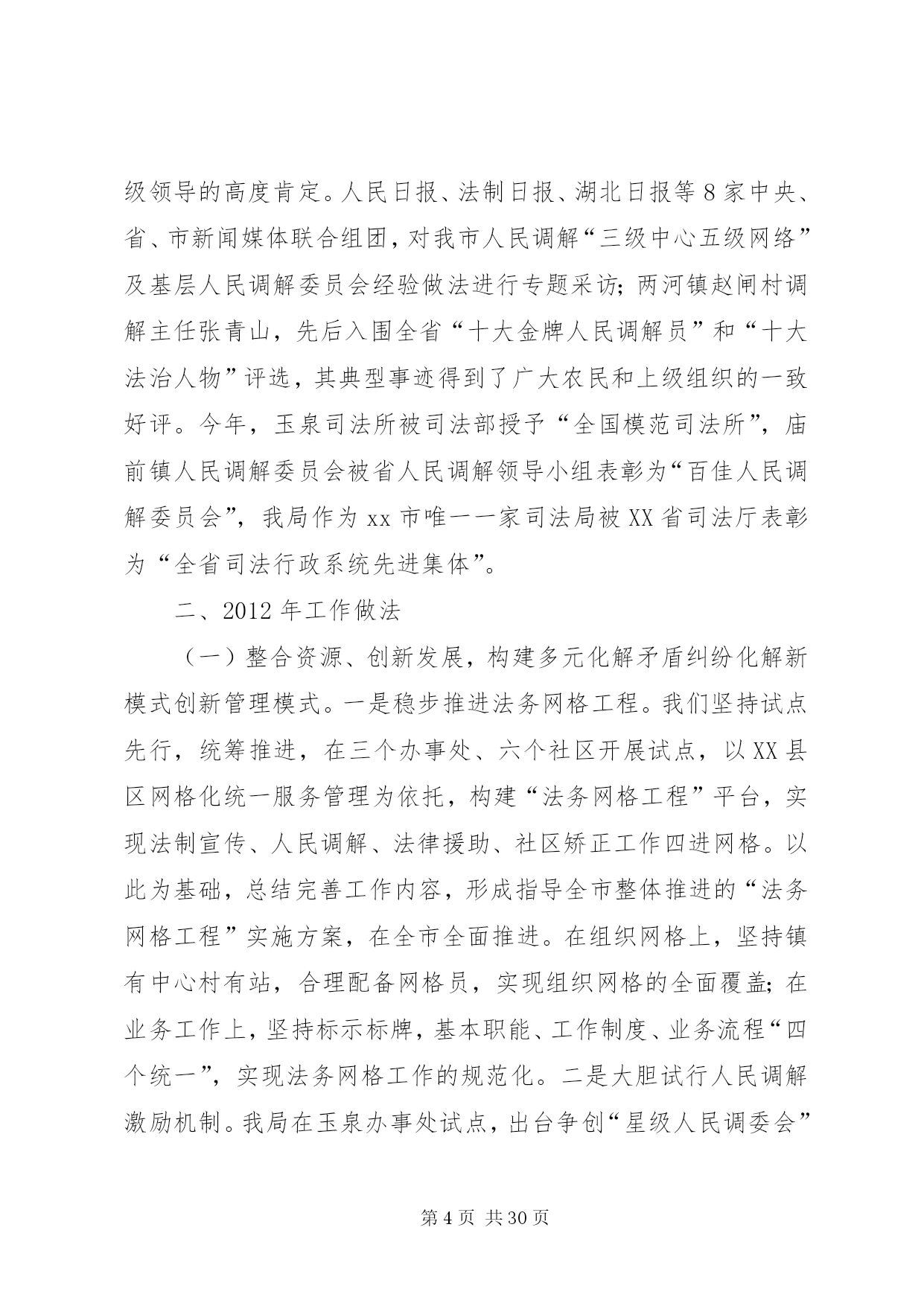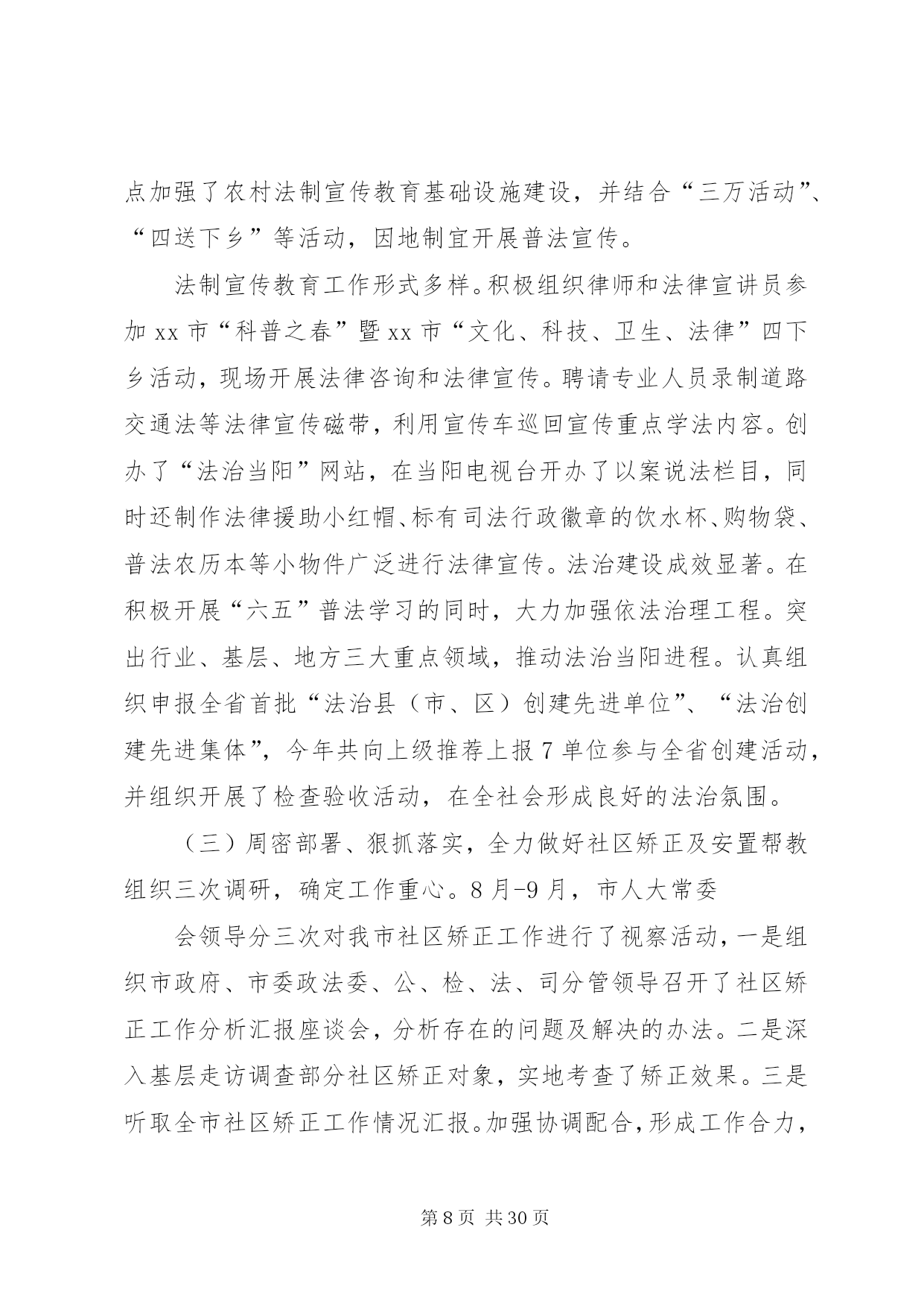 第PAGE\*Arabic\*MERGEFORMAT30页共NUMPAGES\*MERGEFORMAT30页市司法局工作总结20**年,我局紧紧围绕市委、市政府提出的“争宜昌前三、争全省十强”奋斗目标,以服务当阳跨越式发展为第一要务,以“平安当阳建设年”活动为抓手,以“喜迎十八大、争创新业绩、推进新跨越”主题实践活动为统领,以深化三项重点工作为着力点,以更高标准、更高要求、更大作为,奋力推动司法行政各项工作实现了新跨越。一、20**年工作取得的成绩——人民调解工作成效显著。组织网络体系有效覆盖。法务网格工程整体推进,边界地区联防联调不断延伸,使人民调解工作形成纵向到底的工作网络和横向到边的无缝对接。全市已建立法务网格指导中心10个、法务网格工作站173个、划分网格1087个。已与xx县、xx区及xx市xx县联合聘请首席人民调解员9名,组织边界村签署联防联调协议10份。一年来,全市共开展各类矛盾纠纷排查955次。共调处各类矛盾纠纷2284件(其中民调中心户调解838件),调解成功2235件,成功率达97.8%。涉案金额2553.92万元。司法所人员共调处各类纠纷439件,人均调处19件。防止民间纠纷可能引起的自杀6件、防止民间纠纷可能引起的民转刑42件91人次、防止群体性上访93件1380人次、防止群体性械斗9件161人,人民调解工作“第一道防线”作用得到充分发挥。——普法依法治理工作有序推进。“六五”普法顺利启动实施。我市领导干部带头学法,市委中心组全年专题安排3场法律法规学习讲座。专门外聘专家教授为我市各级领导干部集中授课。全市公务员、学生、企事业单位职工、城乡居民共计30多万名普法对象积极投身普法学习,全市累积发放普法书籍、宣传资料10万余册。普法依法治理活动丰富多彩。全市以“平安当阳建设年”活动为核心的各类法制宣传教育活动在各地有效开展,吸引了广大市民的热心参与。法制宣传实施不断完善,各镇(办事处)基本达到了“五个一”的标准:即每个镇(办事处)建立一个法律咨询站、每个行政村和社区建立一个法制宣传栏、每个湾子屋场明确一个法律宣传中心户(民调中心户)、为每个农户赠送一本法律书、每户培养一个法律明白人。学法、用法、守法、依法办事意识显著增强。——社区矫正安置帮教工作不断规范。学习教育和劳动基地建设取得新进展,多方协调机制逐步建立。安置帮教工作形成常态化。矫正人员和帮教对象无重新犯罪现象。从2007年12月开始至今,我市共接收社区矫正人员933人,期满解教619人,现在册314人。今年共接收矫正人员204人。安置帮教五年在册1138人,其中2008年225人、2009年250人、2010年221人、2011年247人、2012年195人。——法律服务和法律援助质效双增。律师和法律服务人员监管不断规范,法律援助案件数量不断上升,服务质量不断提高。全年法律服务机构共办理各类法律援助事务1110件,法律援助案件145件。担任法律顾问68家,诉讼代理420件,非诉讼61件,代书62件,解答法律咨询3050人次,为当事人和企事业单位避免或挽回经济损失2600余万元。公证处共办理各类公证882件。其中办理国内公证642件、涉外公证168件,涉港澳台72件。法医司法所办理司法鉴定197件。全市法律援助、公证、司法鉴定工作实现案件无差错、零投诉。——党建工作得到进一步提升。夯实了党建基础、明确了党建责任、规范了党建工作,增强了党组织的凝聚力、战斗力,促进了机关党建工作规范化建设和司法行政工作全面进步。司法局机关党总支委员会进行了换届选举。制定了规范的党组议事规则。落实了党组织晋位升级措施。党建工作得到全面提升。今年“七一”,我局办公室副主任刘小玲同志被xx市委授予“优秀共产党员”称号。——司法行政部门形象有效改善。一方面,硬件设施上台阶。我局司法业务房建设项目顺利实施并交付使用,项目利用中央预算内资金260万元,新建司法业务用房1882.9平方米,形成了相对完备的司法行政、法律援助、公证服务的基础设施体系,配套添置办公设施(装备)40余台(套),使司法行政基本面貌大大改观。另一方面,业务工作获肯定。我市司法行政业务工作创新、典型经验出彩,赢得全市人民的赞誉、新闻媒体的关注和各级领导的高度肯定。人民日报、法制日报、湖北日报等8家中央、省、市新闻媒体联合组团,对我市人民调解“三级中心五级网络”及基层人民调解委员会经验做法进行专题采访;两河镇赵闸村调解主任张青山,先后入围全省“十大金牌人民调解员”和“十大法治人物”评选,其典型事迹得到了广大农民和上级组织的一致好评。今年,玉泉司法所被司法部授予“全国模范司法所”,庙前镇人民调解委员会被省人民调解领导小组表彰为“百佳人民调解委员会”,我局作为xx市唯一一家司法局被XX省司法厅表