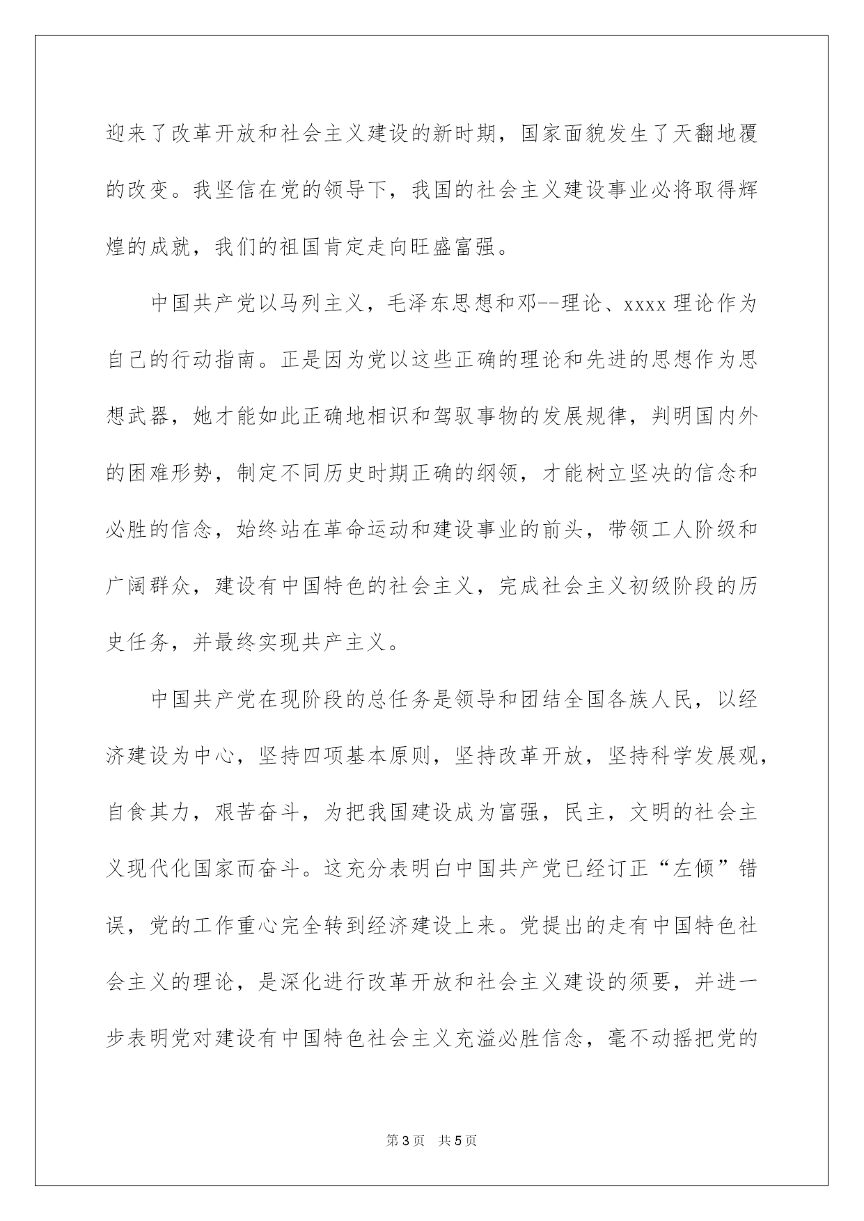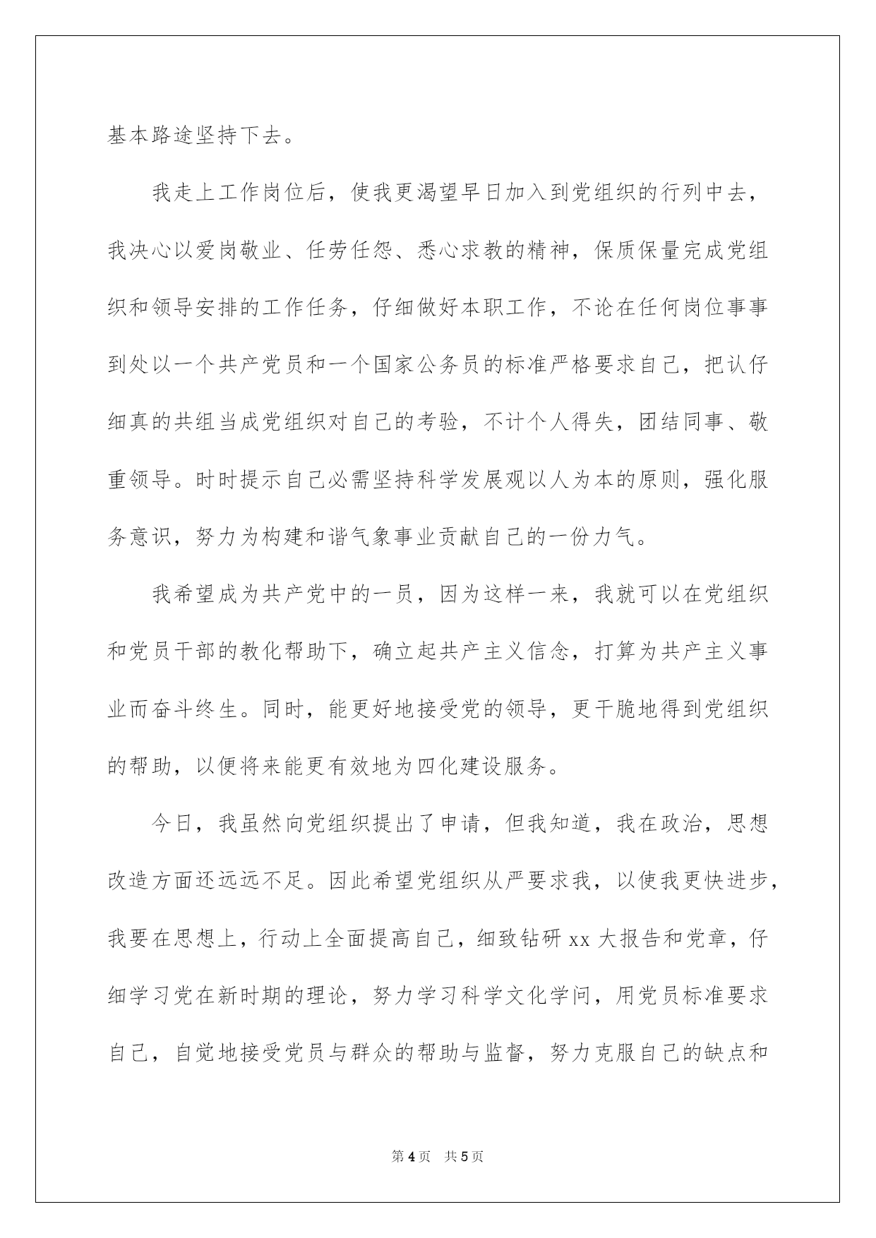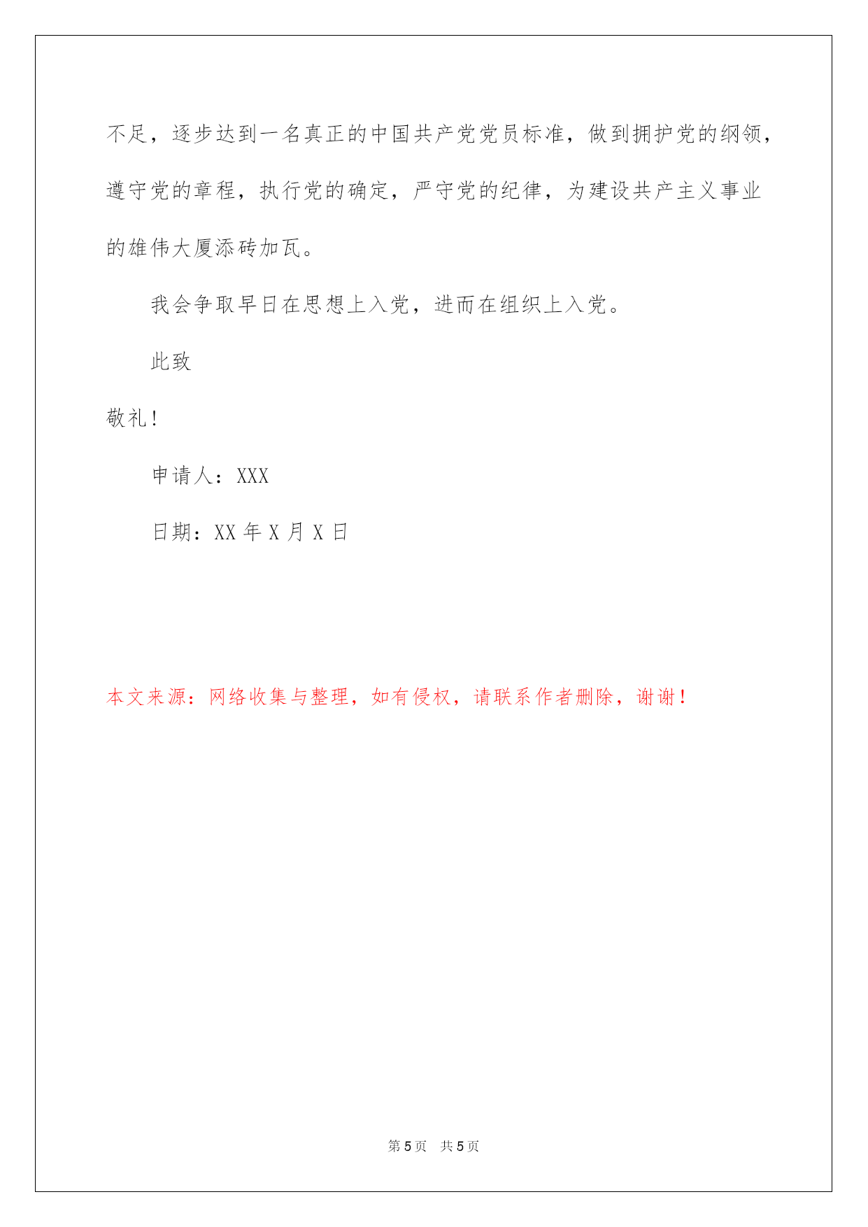 第PAGE\*Arabic\*MERGEFORMAT5页共NUMPAGES\*Arabic\*MERGEFORMAT5页第PAGE\*MERGEFORMAT5页共NUMPAGES\*MERGEFORMAT5页第PAGE\*MERGEFORMAT5页共NUMPAGES\*MERGEFORMAT5页第PAGE\*MERGEFORMAT5页共NUMPAGES\*MERGEFORMAT5页第PAGE\*MERGEFORMAT5页共NUMPAGES\*MERGEFORMAT5页第PAGE\*MERGEFORMAT5页共NUMPAGES\*MERGEFORMAT5页第PAGE\*MERGEFORMAT5页共NUMPAGES\*MERGEFORMAT5页第PAGE\*MERGEFORMAT5页共NUMPAGES\*MERGEFORMAT5页第PAGE\*MERGEFORMAT5页共NUMPAGES\*MERGEFORMAT5页第PAGE\*MERGEFORMAT5页共NUMPAGES\*MERGEFORMAT5页第PAGE\*MERGEFORMAT5页共NUMPAGES\*MERGEFORMAT5页2022基层公务员入党申请书基层公务员2022年入党申请书范例敬重的党组织:我怀着无比真诚的心情,向党组织提出,我申请加入中国共产党,因为在我这二十多年的人生历程中,使我逐步相识到:中国共产党是宏大、光荣、正确的党,使中国工人阶级先锋队,使中国各族人民利益的忠实代表。是中国社会主义事业的领导核心。党的最终目的是实现共产主义的社会制度。我们党是已马列主义、毛泽东思想和邓--理论为指导思想的。正如党的xx大报告所提出的那样:中国共产党是全国各族人民的领导核心。党的领导地位是有党的工人阶级先锋队性质确定的,是经过长期斗争考验形成的。历史把重大责任给予我们党,人民对我们党寄予厚望,党领导人民在二十世纪写下了光辉篇章,也肯定能在二十一世纪写下心得光辉篇章。人民生活会更加华蜜,祖国更加旺盛昌盛,人民更加充溢信念。尽管在我们的前进道路上还有很多困难和艰辛,但我坚信:只要我们认仔细真地落实和践行科学发展观,不断完善和修正前进思路,一个旺盛富强、高度民主、高度文明的社会主义现代化国家必将矗立于世界民学族习之网林。为此我要全身心地投入到我们宏大祖国的现代化建设事业中。加入到共产主义的宏大事业行业中去,为我们宏大祖国的腾飞崛起、为中华民族的`强大而贡献自己的沧海一粟。通过学习,我进一步相识到入党不是一个短暂的行为,必需经过长期不懈的努力,做到从思想上、行动上真正入党。入党是我人生的奋斗目标,加入中国共产党才能使自己得以不断提高和发展,也才能为自己进一步做好工作、服务社会供应更广袤的空间。中国共产党又是中国社会主义建设的核心。在中国革命每一个时期,党英勇地担负起领导革命的任务。以中国共产党为代表的共产党人,把马克思主义的普遍真理同中国革命的详细实践相结合带领人民群众推倒三座大山,建立人民民主专政的新中国,开拓了中华民族奋勉图强的新纪元。单就这个成就,就是任何一个政党无法比拟的。新中国成立后,党又领导全国各族人民完成社会主义改造,进行大规模的社会主义建设,使一个备受欺辱的半封建半殖民地国家一跃成为在国际舞台上占有举足轻重地位的社会主义国家。党的十一届三中全会以后,确定把工作重心转移到经济建设上,党又带领全国人民迎来了改革开放和社会主义建设的新时期,国家面貌发生了天翻地覆的改变。我坚信在党的领导下,我国的社会主义建设事业必将取得辉煌的成就,我们的祖国肯定走向旺盛富强。中国共产党以马列主义,毛泽东思想和邓--理论、xxxx理论作为自己的行动指南。正是因为党以这些正确的理论和先进的思想作为思想武器,她才能如此正确地相识和驾驭事物的发展规律,判明国内外的困难形势,制定不同历史时期正确的纲领,才能树立坚决的信念和必胜的信念,始终站在革命运动和建设事业的前头,带领工人阶级和广阔群众,建设有中国特色的社会主义,完成社会主义初级阶段的历史任务,并最终实现共产主义。中国共产党在现阶段的总任务是领导和团结全国各族人民,以经济建设为中心,坚持四项基本原则,坚持改革开放,坚持科学发展观,自食其力,艰苦奋斗,为把我国建设成为富强,民主,文明的社会主义现代化国家而奋斗。这充分表明白中国共产党已经订正“左倾”错误,党的工作重心完全转到经济建设上来。党提出的走有中国特色社会主义的理论,是深化进行改革开放和社会主义建设的须要,并进一步表明党对建设有中国特色社会主义充溢必胜信念,毫不动摇把党的基本路途坚持下去。我走上工作岗位后,使我更渴望早日加入到党组
