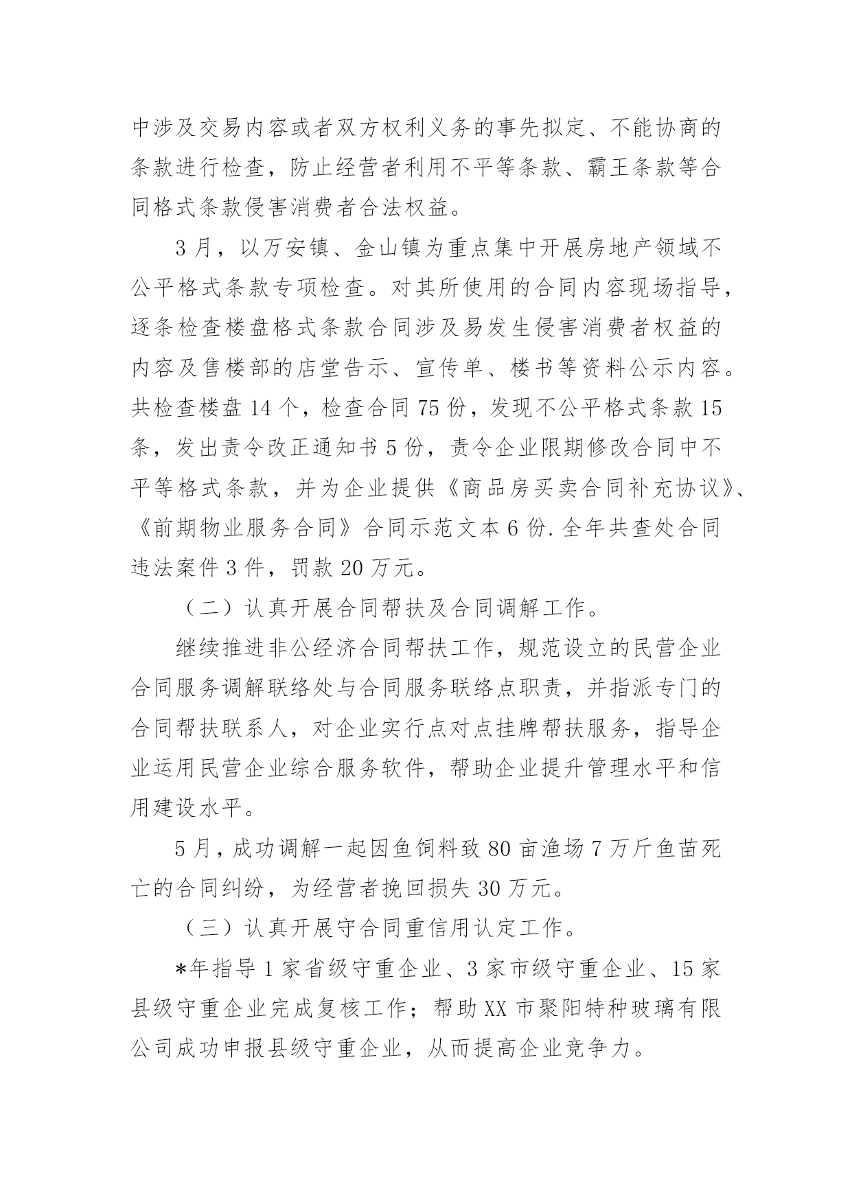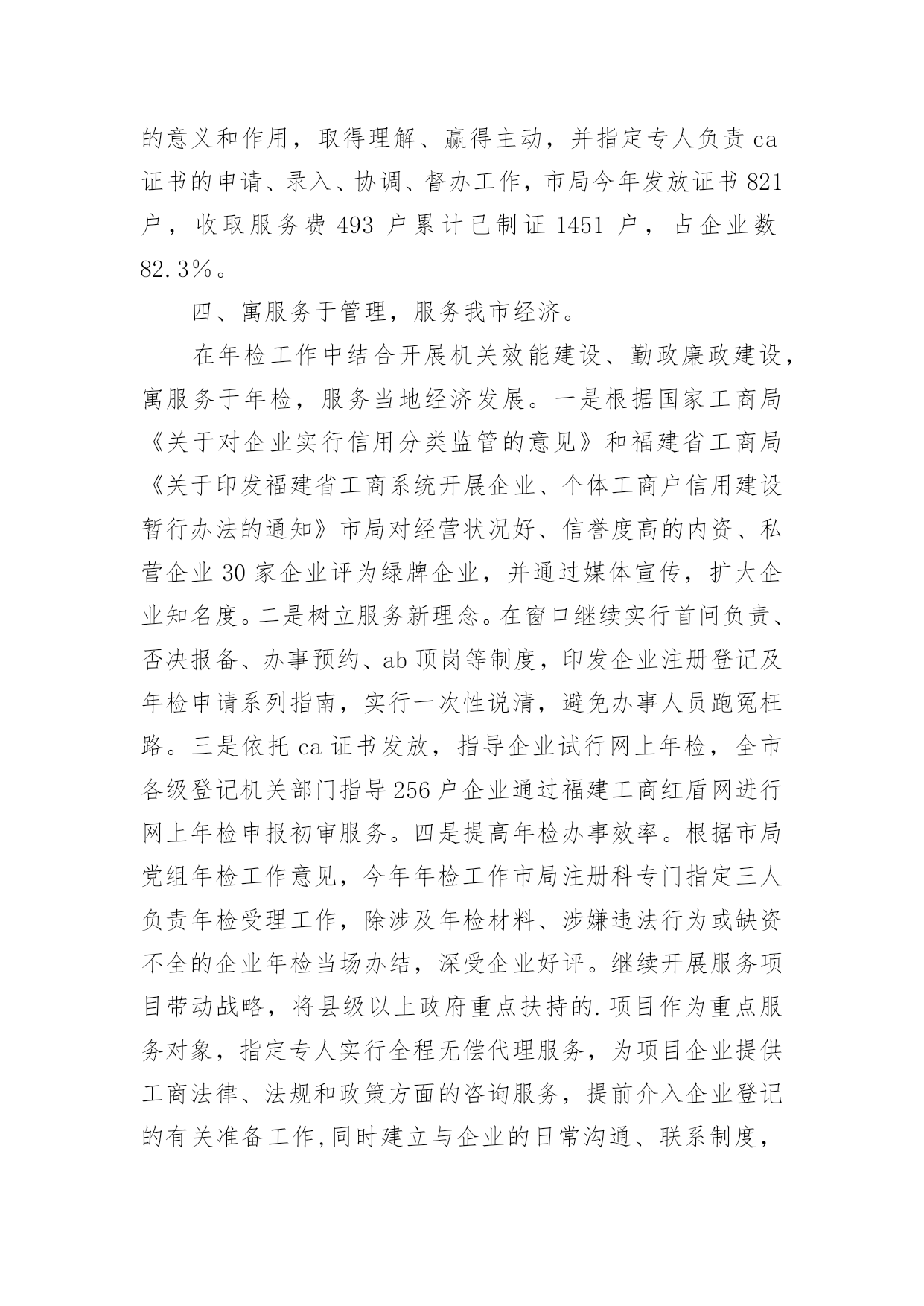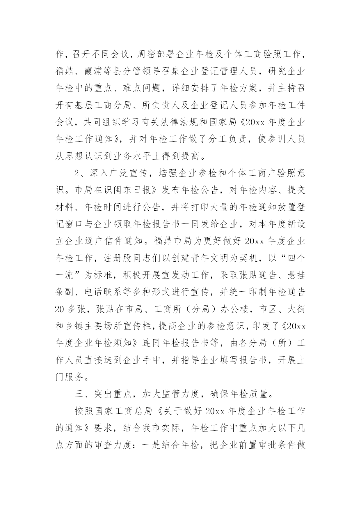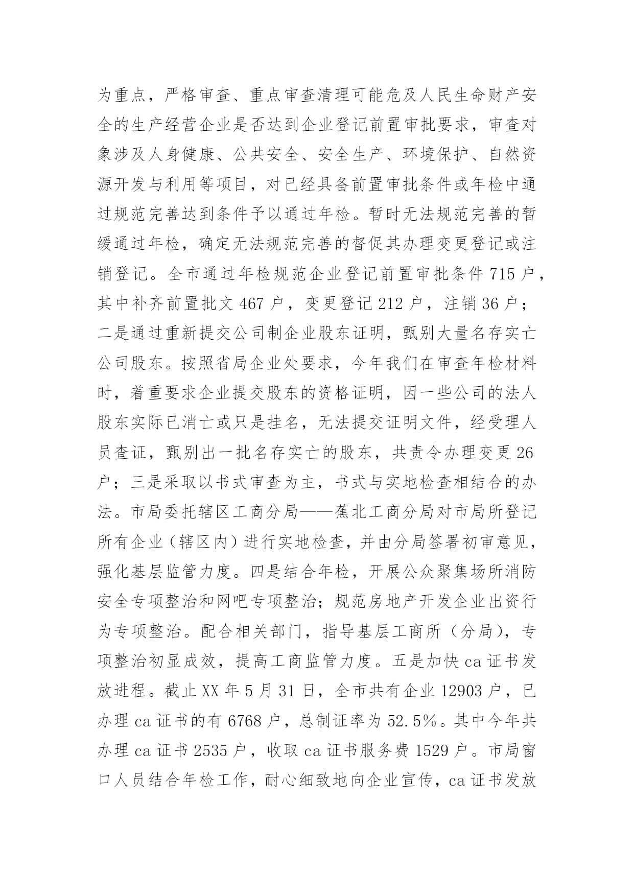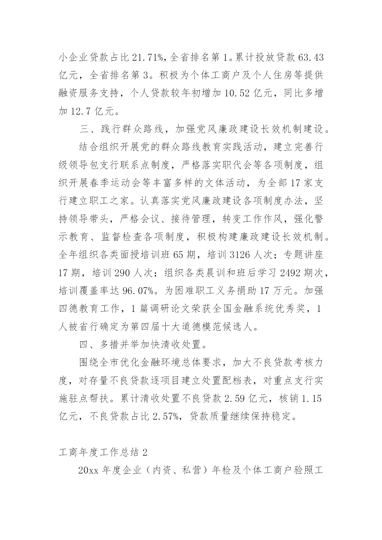 工商年度工作总结总结是事后对某一阶段的学习、工作或其完成情况加以回顾和分析的一种书面材料,它能够使头脑更加清醒,目标更加明确,因此我们要做好归纳,写好总结。但是总结有什么要求呢?以下是小编帮大家整理的工商年度工作总结,仅供参考,欢迎大家阅读。工商年度工作总结1今年以来,我行认真贯彻落实市委市政府决策部署,不断加大信贷投放力度,人民币各项贷款较年初增加31亿元,增量位居全省第7位,完成市政府下达我行年度任务的.103%。主要做了以下几项工作:一、持续加大骨干企业及重点项目信贷投放力度。1、发放项目贷款15个,金额24.3亿元。其中3个新农村建设项目贷款8.85亿元,4个全市招商引资重点客户项目贷款8.2亿元,8个技改项目贷款10.09亿元。2、投放房地产项目5个,金额8.6亿元。3、增加流动资金贷款8.73亿元。4、办理银行承兑汇票47.78亿元。二、积极服务中小微企业发展。精简业务审批程序,提高业务办理效率;积极探索担保方式创新,拓宽融资渠道。小企业贷款余额57.19亿元,全省排名第2;有贷户646户,较年初净增30户,户数全省排名第3、净增排名第1;小企业贷款占比21.71%,全省排名第1。累计投放贷款63.43亿元,全省排名第3。积极为个体工商户及个人住房等提供融资服务支持,个人贷款较年初增加10.52亿元,同比多增加12.7亿元。三、践行群众路线,加强党风廉政建设长效机制建设。结合组织开展党的群众路线教育实践活动,建立完善行级领导包支行联系点制度,严格落实职代会等各项制度,组织开展春季运动会等丰富多样的文体活动,为全部17家支行建立职工之家。认真落实党风廉政建设各项制度办法,坚持领导带头,严格会议、接待管理,转变工作作风,强化警示教育、监督检查各项制度,积极构建廉政建设长效机制。全年组织各类面授培训班65期,培训3126人次;专题讲座17期,培训290人次;组织各类晨训和班后学习2492期次,培训覆盖率达96.07%。为困难职工义务捐助17万元。加强四德教育工作,1篇调研论文荣获全国金融系统优秀奖,1人被省行确定为第四届十大道德模范候选人。四、多措并举加快清收处置。围绕全市优化金融环境总体要求,加大不良贷款考核力度,对存量不良贷款逐项目建立处置配档表,对重点支行实施驻点帮扶。累计清收处置不良贷款2.59亿元,核销1.15亿元,不良贷款占比2.57%,贷款质量继续保持稳定。工商年度工作总结220xx年度企业(内资、私营)年检及个体工商户验照工作,我市各级登记主管部门,严格按照国家工商总局和省局业务处的要求,结合我市的实际情况,精心组织,周密部署,突出重点,强化监管,确保质量,使20xx年度企业年检及个体工商户验照工作圆满结束,现将有关情况总结如下:一、基本情况:1、20xx年度我市内资企业应检企业6684户,其中法人2342户,营业4342户,截止20xx年5月25日,实检企业3593户,其中法人1512户,营业20xx户,注销企业163户,参检率56%,合格率100%,实检企业注册资本(金)到位率98%,年检中被定为b级企业26户。2、20xx年度应验照个体工商户48896户,截止5月25日,实际验照30171户,验照率61.7%;个人独资企业应检1518户,实检986户,参检率65%;合伙企业应检770户,实检539户,参检率61.7%;私营有限公司应检2680户,实检1853,参检率63.8%实检企业,注册资本429365万元,实收资本6887592万元,注册资本到位率122%。二、主要作法1、周密部署,充分做好年检前各项准备工作,针对去年年检工作存在问题和今年年检工作的实际问题,市局注册科组织全体干部认真学习国家工商总局的《关于做好20xx年度年检工作的通知》及省局企业处和个私处的年检通知文件,明确重点,提高认识,并对今年年检可能遇到新的问题部署周密对策,制定了全市年检工作意见和措施,转发各县(市、区)工商局。各县(市、区)领导都十分重视年检工作,召开不同会议,周密部署企业年检及个体工商验照工作,福鼎、霞浦等县分管领导召集企业登记管理人员,研究企业年检中的重点、难点问题,详细安排了年检方案,并主持召开有基层工商分局、所负责人及企业登记人员参加年检工件会议,共同组织学习有关法律法规和国家局《20xx年度企业年检工作通知》,并对年检工作做了分工负责,使参训人员从思想认识到业务水平上得到提高。2、深入广泛宣传,培强企业参检和个体工商户验照意识。市局在识闽东日报》发布年检公告,对年检内容、提交材料、年检时间进行公告,并将打印大量的年检通知放置登记窗口与企业领取年检报告书一同发给企业,对本年度新设立企业逐户信件通知。福鼎市局为更好做好20xx年度企业年检工作,注册股同志们以创建青年文明为契机,以“四个一流”为标准,积极开