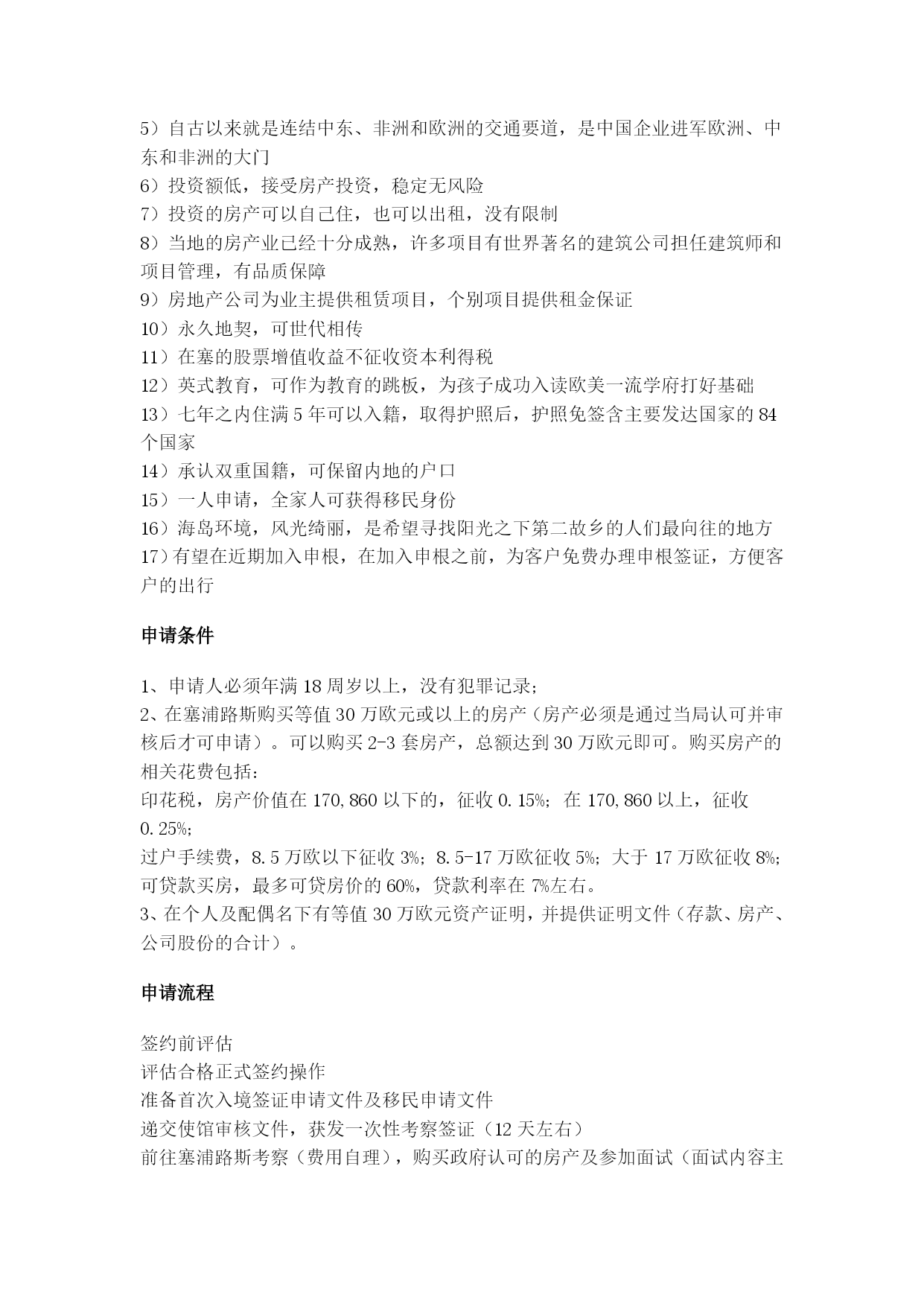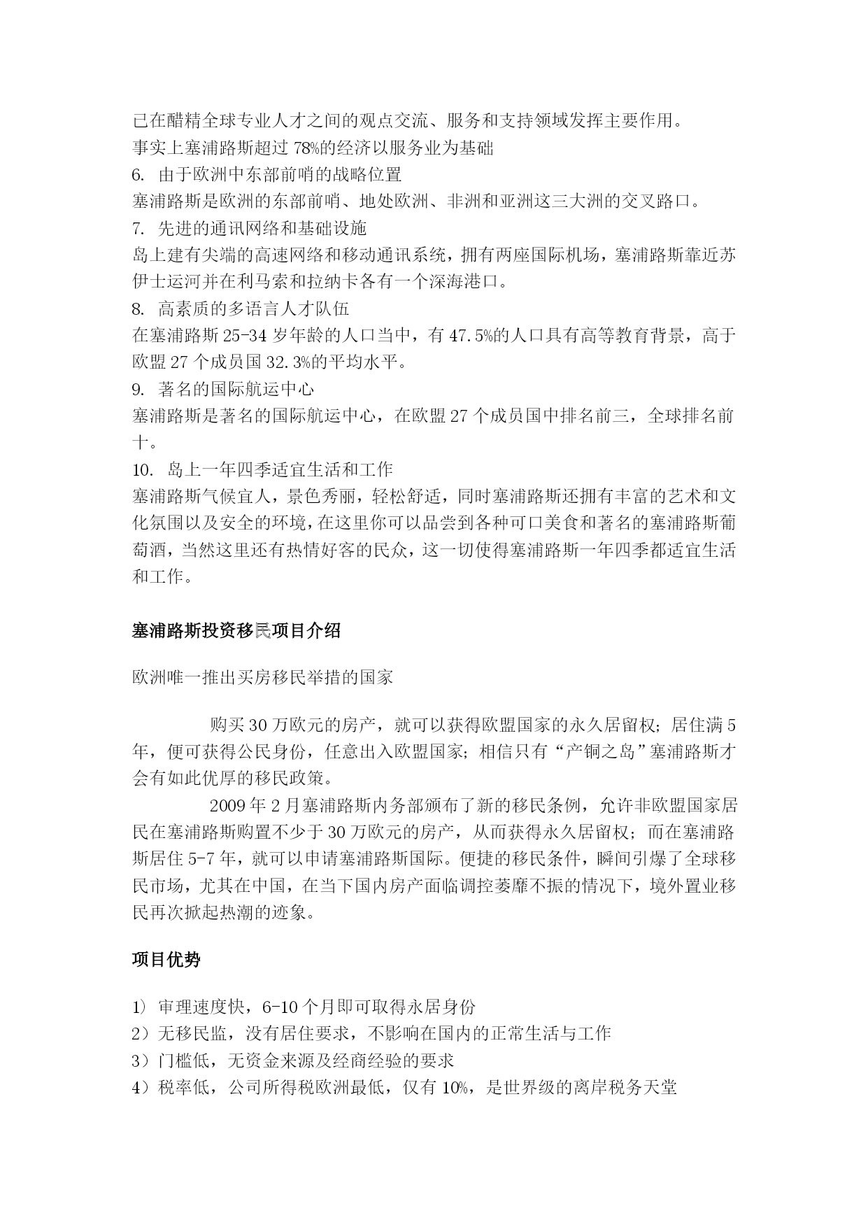 塞浦路斯投资移民发布时间:2012-8-5HYPERLINK"http://www.360yimin.com"www.360yimin.com出国|移民|留学|签证|出国劳务|出国旅游一站式出国服务平台【360出国网】国家介绍塞浦路斯,希腊语意为“产铜之岛”,是位于地中海最东面的一个岛国,它与希腊、土耳其、叙利亚、黎巴嫩、以色列、埃及隔海相望,自古以来就是连结中东、非洲和欧洲的交通要道,现代人把它比喻为“东地中海不沉的航空母舰”。塞浦路斯东西长241公里,南北宽97公里,面积9251平方公里(1974年塞希腊、土耳其两族分裂后,希族和土族分别占据领土的60%和37%,另有3%属于英国的两个主权基地),为地中海第三大岛,是女神维纳斯的故乡。为什么在塞浦路斯进行投资?1.欧洲联盟和欧洲货币联盟成员国塞浦路斯于2004年5月成为欧盟27个成员国之一,2008年1月成为欧洲货币联盟成员国。2.拥有欧盟中最低的企业所得税率,并已与多个国家签订避免双重征税协定塞浦路斯的且也所得税率为10%,是欧盟国家中最低的分红收入,海外常设机构收益和出售证劵所得收益征税。对从塞浦路斯支付的分红、利息和特许权使用费不征收预提税塞浦路斯已与45个国家完成避免双重征税的签订3.宏观经济稳定,经济表现良好塞浦路斯的实际GDP增长率远高于欧盟27个成员的平均增长率,也高于欧元区国家的平均增长率。4.外国直接投资业绩2009年,塞浦路斯工吸引了40.22亿欧元的外国直接投资,2007年和2008年的数据分别为16.26亿和27.65亿欧元。(塞浦路斯中央银行)从长期来看,塞浦路斯的外国直接投资将保持增长态势,同时塞浦路斯也有潜力吸引到更多的外国直接投资。5.高效的法律、会计和银行服务塞浦路斯已认识达信息和知识是在未来全球经济中保持可持续发展的推动力,并已在醋精全球专业人才之间的观点交流、服务和支持领域发挥主要作用。事实上塞浦路斯超过78%的经济以服务业为基础6.由于欧洲中东部前哨的战略位置塞浦路斯是欧洲的东部前哨、地处欧洲、非洲和亚洲这三大洲的交叉路口。7.先进的通讯网络和基础设施岛上建有尖端的高速网络和移动通讯系统,拥有两座国际机场,塞浦路斯靠近苏伊士运河并在利马索和拉纳卡各有一个深海港口。8.高素质的多语言人才队伍在塞浦路斯25-34岁年龄的人口当中,有47.5%的人口具有高等教育背景,高于欧盟27个成员国32.3%的平均水平。9.著名的国际航运中心塞浦路斯是著名的国际航运中心,在欧盟27个成员国中排名前三,全球排名前十。10.岛上一年四季适宜生活和工作塞浦路斯气候宜人,景色秀丽,轻松舒适,同时塞浦路斯还拥有丰富的艺术和文化氛围以及安全的环境,在这里你可以品尝到各种可口美食和著名的塞浦路斯葡萄酒,当然这里还有热情好客的民众,这一切使得塞浦路斯一年四季都适宜生活和工作。塞浦路斯投资移民项目介绍欧洲唯一推出买房移民举措的国家购买30万欧元的房产,就可以获得欧盟国家的永久居留权;居住满5年,便可获得公民身份,任意出入欧盟国家;相信只有“产铜之岛”塞浦路斯才会有如此优厚的移民政策。2009年2月塞浦路斯内务部颁布了新的移民条例,允许非欧盟国家居民在塞浦路斯购置不少于30万欧元的房产,从而获得永久居留权;而在塞浦路斯居住5-7年,就可以申请塞浦路斯国际。便捷的移民条件,瞬间引爆了全球移民市场,尤其在中国,在当下国内房产面临调控萎靡不振的情况下,境外置业移民再次掀起热潮的迹象。项目优势1)审理速度快,6-10个月即可取得永居身份2)无移民监,没有居住要求,不影响在国内的正常生活与工作3)门槛低,无资金来源及经商经验的要求4)税率低,公司所得税欧洲最低,仅有10%,是世界级的离岸税务天堂5)自古以来就是连结中东、非洲和欧洲的交通要道,是中国企业进军欧洲、中东和非洲的大门6)投资额低,接受房产投资,稳定无风险7)投资的房产可以自己住,也可以出租,没有限制8)当地的房产业已经十分成熟,许多项目有世界著名的建筑公司担任建筑师和项目管理,有品质保障9)房地产公司为业主提供租赁项目,个别项目提供租金保证10)永久地契,可世代相传11)在塞的股票增值收益不征收资本利得税12)英式教育,可作为教育的跳板,为孩子成功入读欧美一流学府打好基础13)七年之内住满5年可以入籍,取得护照后,护照免签含主要发达国家的84个国家14)承认双重国籍,可保留内地的户口15)一人申请,全家人可获得移民身份16)海岛环境,风光绮丽,是希望寻找阳光之下第二故乡的人们最向往的地方17)有望在近期加入申根,在加入申根之前,为客户免费办理申根签证,方便客户的出行申请条件1、申请人必须年满18周岁以上,没有犯罪记录;2、在塞浦路斯购买等值30万欧元或以上的房产(房产必须是通过当局认可并审核后