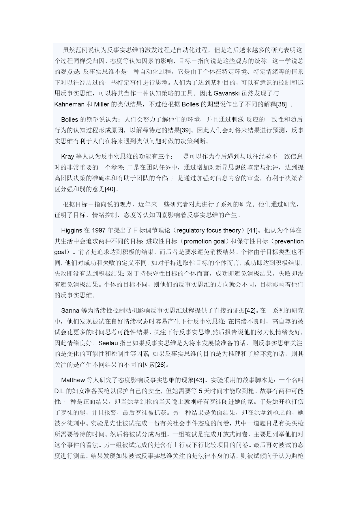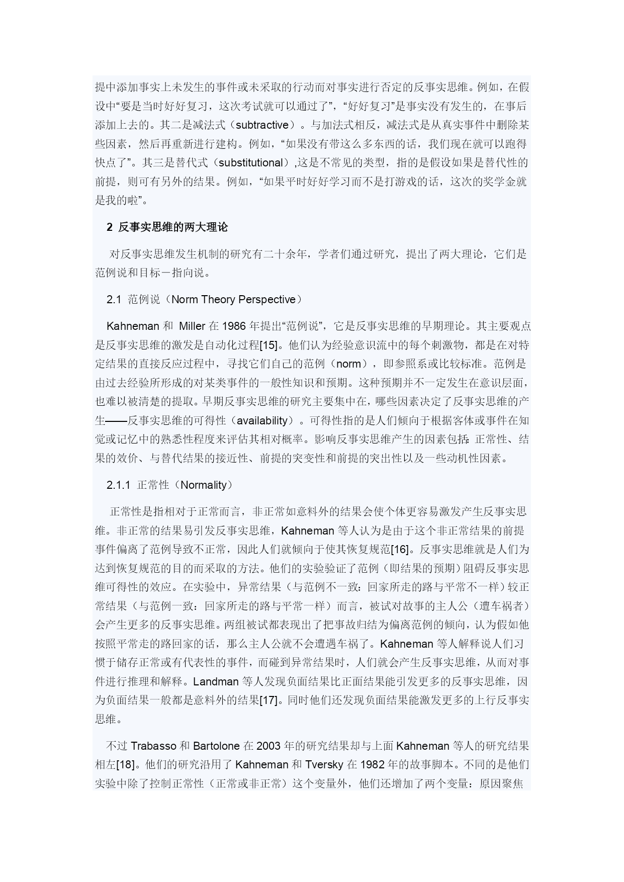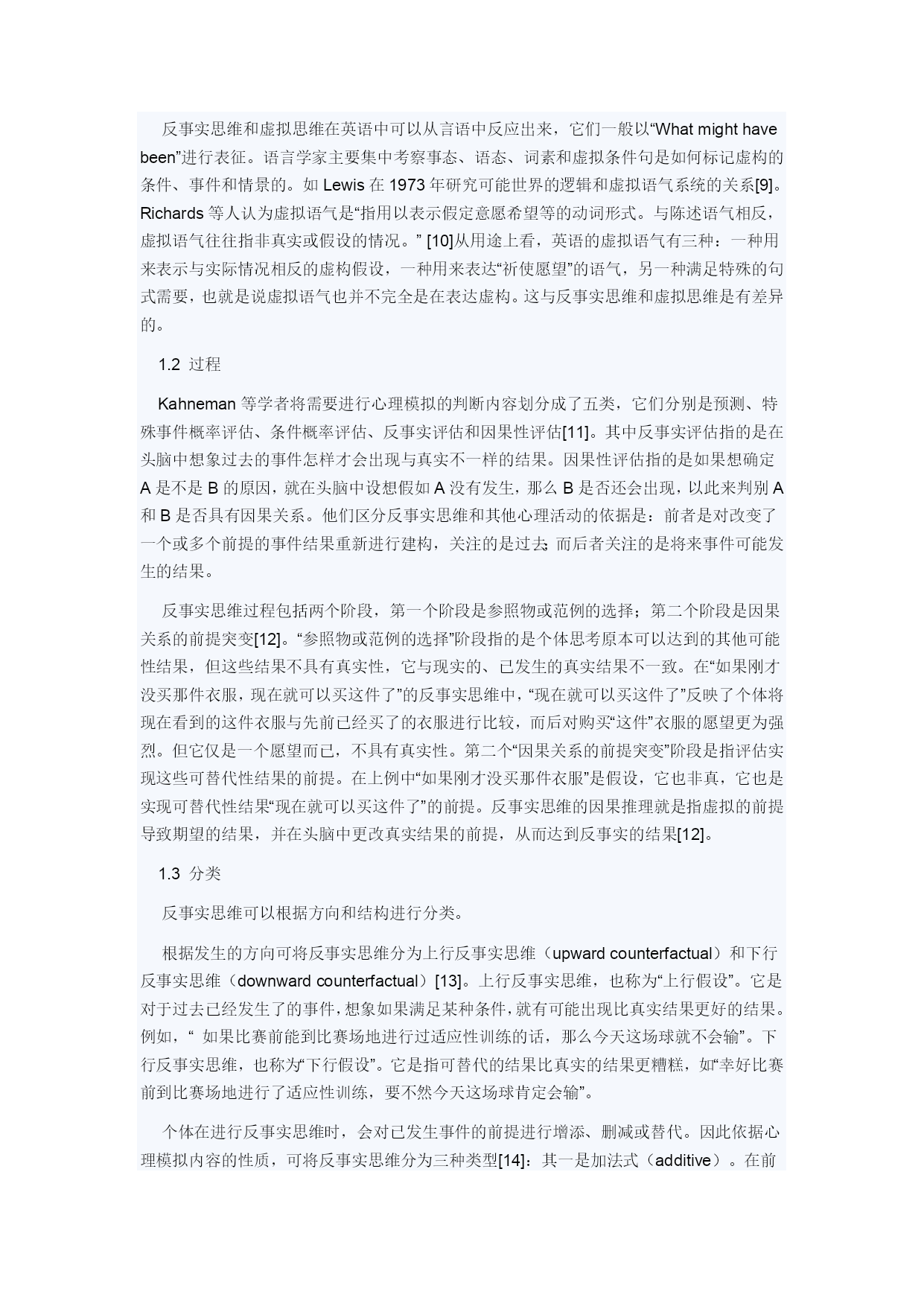 反事实思维两大理论:范例说和目标-指向说摘要】反事实思维是个体对不真实的条件或可能性进行替换的一种思维过程。该文通过综合国外许多研究者的研究成果,探讨了反事实思维的定义、分类以及反事实思维的两大理论:范例说和目标-指向说。范例说认为反事实思维的激发是自动化过程,影响反事实思维产生的因素包括:正常性、结果的效价、与替代结果的接近性、前提的突变性和前提的突出性。目标-指向说则认为反事实思维的激发过程同样受目标、情绪控制、态度等认知因素的影响。【关键词】反事实思维,范例说,目标-指向说。反事实思维(counterfactualthinking)是美国著名心理学家、诺贝尔经济学奖获得者Kahneman和他的同事Tversky在1982年发表的一篇名为“模拟式启发(Thesimulationheuristic)”的论文时首次提出的[1]。它是基于人类是非理性假设的前提下提出的[2]。反事实思维是对过去已经发生过的事件,之后进行判断和决策后的一种心理模拟(mentalsimulation)。心理模拟过程可被视为有意识的再激活储存在记忆中实施过的行为[3]。个体产生心理模拟,是为了建立与周围环境的联系,重新回忆过去的经历,从中提取愉快或有价值的信息[4]。反事实思维通常是在头脑中对已经发生了的事件进行否定,然后表征原本可能发生但现实并未发生的心理活动。它在头脑中一般是以反事实条件句的形式出现。反事实条件句(counterfactualconditionals)也叫“虚拟蕴涵命题”,它具有“如果……,那么……”的形式。例如:“如果刚才没买那件衣服,现在就可以买这件了。”一个反事实思维包括两个部分:虚假的前提(“如果刚才没买那件衣服”)和虚假的结论(“现在就可以买这件了”)[5]。本文拟探讨这一领域提出至今的研究成果和最新进展情况。1反事实思维的概念及分类1.1定义反事实的字面意思就是与事实相反,而“反事实”在被Kahneman等学者定义为过去结果不真实的替换式。反事实思维就是撤销已经发生过的事件,而假设其他未发生的可能性情况的一种思维过程。在汉语中,与反事实思维意思相近的词语有虚拟思维、假设思维。因此国内学者张结海、朱正才将counterfactualthinking翻译成“假设思维”[6],蒋勇将其翻译成“虚拟思维”[7]。《现代汉语词典》对“虚拟”、“假设”的解释为“不符合或不一定符合事实的、假设的、虚拟语气。”虚拟思维是人们虚构想象世界时所进行的思维活动。艺术创造和科学研究都离不开虚拟、假设思维。虽然与“反事实思维”一样,它们均是指与现实不一致,但是虚拟思维、假设思维是泛指所有与现实不相符的思维,更多的是含有想象和创造的成分。而反事实思维强调的是过去已经发生了的事件,个体对其进行心理模拟和替换,目的是预测、推理、进行因果归因,它能帮助人们明确目的,改善行为。因此本文作者认为将counterfactualthinking翻译为“反事实思维”是更贴切、更符合其科学含义的。此外,英文单词“prefactual”与“counterfactual”有对应关系,我们暂且将其翻译成“前事实”[8]。与“反事实”强调过去已经发生事件不同的是,“前事实”关注的是未来还未发生的事件,个体只是事先进行假想。如“如果我彩票中奖,则我会去买栋别墅”,是个体设想将来可能发生的事。反事实思维和虚拟思维在英语中可以从言语中反应出来,它们一般以“Whatmighthavebeen”进行表征。语言学家主要集中考察事态、语态、词素和虚拟条件句是如何标记虚构的条件、事件和情景的。如Lewis在1973年研究可能世界的逻辑和虚拟语气系统的关系[9]。Richards等人认为虚拟语气是“指用以表示假定意愿希望等的动词形式。与陈述语气相反,虚拟语气往往指非真实或假设的情况。”[10]从用途上看,英语的虚拟语气有三种:一种用来表示与实际情况相反的虚构假设,一种用来表达“祈使愿望”的语气,另一种满足特殊的句式需要,也就是说虚拟语气也并不完全是在表达虚构。这与反事实思维和虚拟思维是有差异的。1.2过程Kahneman等学者将需要进行心理模拟的判断内容划分成了五类,它们分别是预测、特殊事件概率评估、条件概率评估、反事实评估和因果性评估[11]。其中反事实评估指的是在头脑中想象过去的事件怎样才会出现与真实不一样的结果。因果性评估指的是如果想确定A是不是B的原因,就在头脑中设想假如A没有发生,那么B是否还会出现,以此来判别A和B是否具有因果关系。他们区分反事实思维和其他心理活动的依据是:前者是对改变了一个或多个前提的事件结果重新进行建构,关注的是过去;而后者关注的是将来事件可能发生的结果。反事实思维过程包括两个阶段,第一个阶段是参照物或范例的选择;第二个阶段是因果关系的前提
