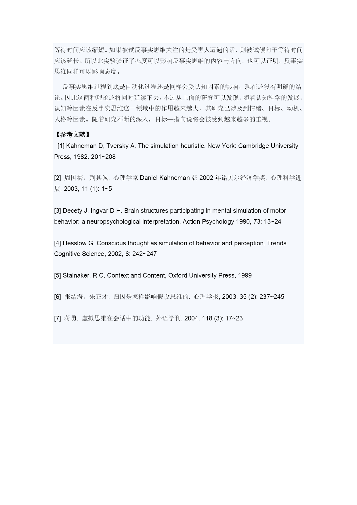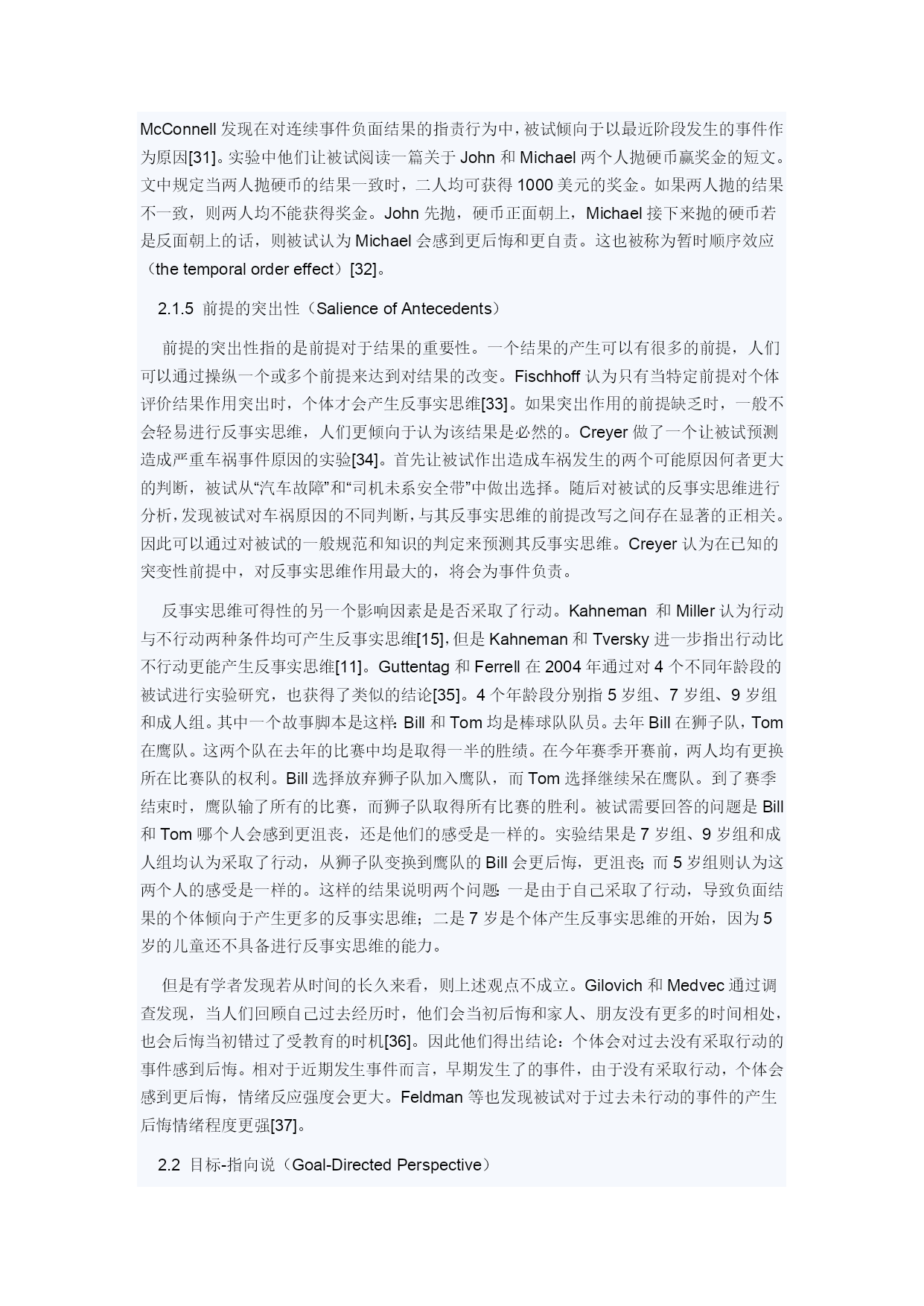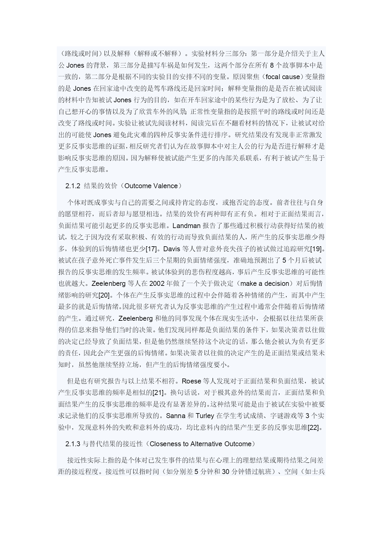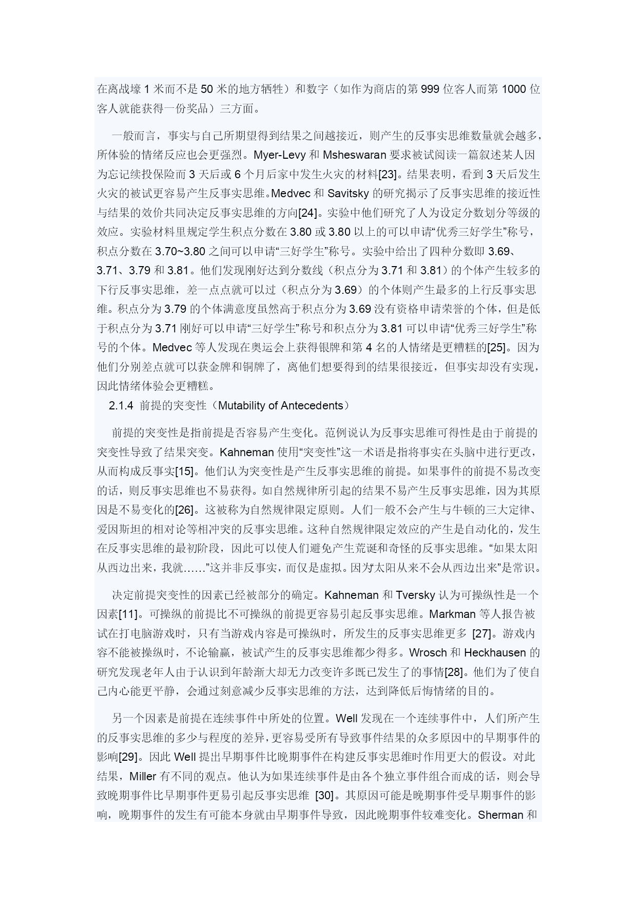 反事实思维两大理论:范例说和目标-指向说摘要】反事实思维是个体对不真实的条件或可能性进行替换的一种思维过程。该文通过综合国外许多研究者的研究成果,探讨了反事实思维的定义、分类以及反事实思维的两大理论:范例说和目标-指向说。范例说认为反事实思维的激发是自动化过程,影响反事实思维产生的因素包括:正常性、结果的效价、与替代结果的接近性、前提的突变性和前提的突出性。目标-指向说则认为反事实思维的激发过程同样受目标、情绪控制、态度等认知因素的影响。【关键词】反事实思维,范例说,目标-指向说。反事实思维(counterfactualthinking)是美国著名心理学家、诺贝尔经济学奖获得者Kahneman和他的同事Tversky在1982年发表的一篇名为“模拟式启发(Thesimulationheuristic)”的论文时首次提出的[1]。它是基于人类是非理性假设的前提下提出的[2]。反事实思维是对过去已经发生过的事件,之后进行判断和决策后的一种心理模拟(mentalsimulation)。心理模拟过程可被视为有意识的再激活储存在记忆中实施过的行为[3]。个体产生心理模拟,是为了建立与周围环境的联系,重新回忆过去的经历,从中提取愉快或有价值的信息[4]。反事实思维通常是在头脑中对已经发生了的事件进行否定,然后表征原本可能发生但现实并未发生的心理活动。它在头脑中一般是以反事实条件句的形式出现。反事实条件句(counterfactualconditionals)也叫“虚拟蕴涵命题”,它具有“如果……,那么……”的形式。例如:“如果刚才没买那件衣服,现在就可以买这件了。”一个反事实思维包括两个部分:虚假的前提(“如果刚才没买那件衣服”)和虚假的结论(“现在就可以买这件了”)[5]。本文拟探讨这一领域提出至今的研究成果和最新进展情况。1反事实思维的概念及分类1.1定义反事实的字面意思就是与事实相反,而“反事实”在被Kahneman等学者定义为过去结果不真实的替换式。反事实思维就是撤销已经发生过的事件,而假设其他未发生的可能性情况的一种思维过程。在汉语中,与反事实思维意思相近的词语有虚拟思维、假设思维。因此国内学者张结海、朱正才将counterfactualthinking翻译成“假设思维”[6],蒋勇将其翻译成“虚拟思维”[7]。《现代汉语词典》对“虚拟”、“假设”的解释为“不符合或不一定符合事实的、假设的、虚拟语气。”虚拟思维是人们虚构想象世界时所进行的思维活动。艺术创造和科学研究都离不开虚拟、假设思维。虽然与“反事实思维”一样,它们均是指与现实不一致,但是虚拟思维、假设思维是泛指所有与现实不相符的思维,更多的是含有想象和创造的成分。而反事实思维强调的是过去已经发生了的事件,个体对其进行心理模拟和替换,目的是预测、推理、进行因果归因,它能帮助人们明确目的,改善行为。因此本文作者认为将counterfactualthinking翻译为“反事实思维”是更贴切、更符合其科学含义的。此外,英文单词“prefactual”与“counterfactual”有对应关系,我们暂且将其翻译成“前事实”[8]。与“反事实”强调过去已经发生事件不同的是,“前事实”关注的是未来还未发生的事件,个体只是事先进行假想。如“如果我彩票中奖,则我会去买栋别墅”,是个体设想将来可能发生的事。反事实思维和虚拟思维在英语中可以从言语中反应出来,它们一般以“Whatmighthavebeen”进行表征。语言学家主要集中考察事态、语态、词素和虚拟条件句是如何标记虚构的条件、事件和情景的。如Lewis在1973年研究可能世界的逻辑和虚拟语气系统的关系[9]。Richards等人认为虚拟语气是“指用以表示假定意愿希望等的动词形式。与陈述语气相反,虚拟语气往往指非真实或假设的情况。”[10]从用途上看,英语的虚拟语气有三种:一种用来表示与实际情况相反的虚构假设,一种用来表达“祈使愿望”的语气,另一种满足特殊的句式需要,也就是说虚拟语气也并不完全是在表达虚构。这与反事实思维和虚拟思维是有差异的。1.2过程Kahneman等学者将需要进行心理模拟的判断内容划分成了五类,它们分别是预测、特殊事件概率评估、条件概率评估、反事实评估和因果性评估[11]。其中反事实评估指的是在头脑中想象过去的事件怎样才会出现与真实不一样的结果。因果性评估指的是如果想确定A是不是B的原因,就在头脑中设想假如A没有发生,那么B是否还会出现,以此来判别A和B是否具有因果关系。他们区分反事实思维和其他心理活动的依据是:前者是对改变了一个或多个前提的事件结果重新进行建构,关注的是过去;而后者关注的是将来事件可能发生的结果。反事实思维过程包括两个阶段,第一个阶段是参照物或范例的选择;第二个阶段是因果关系的前提