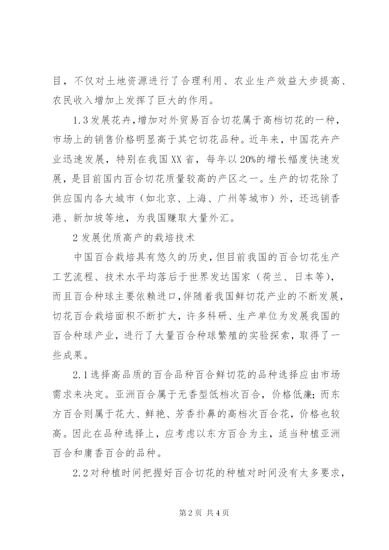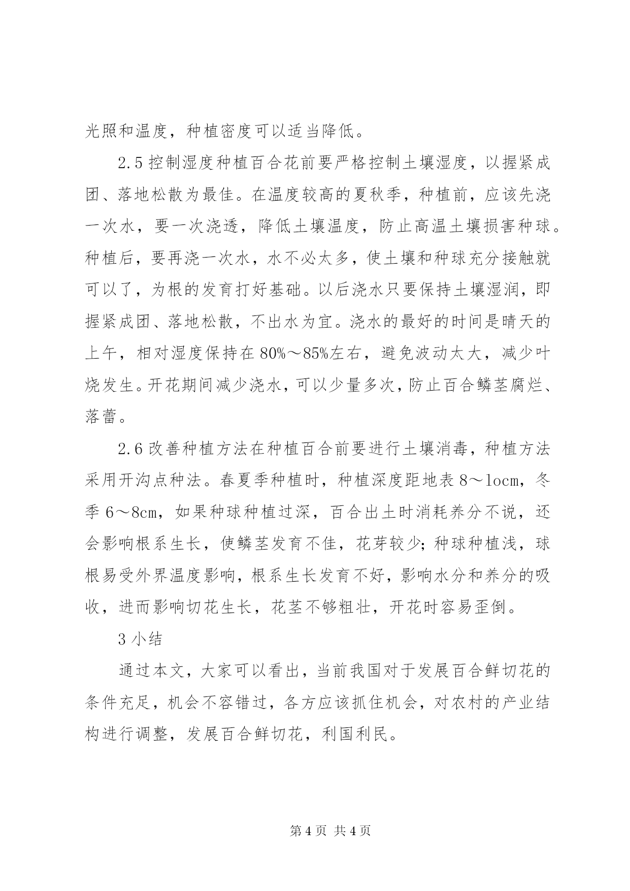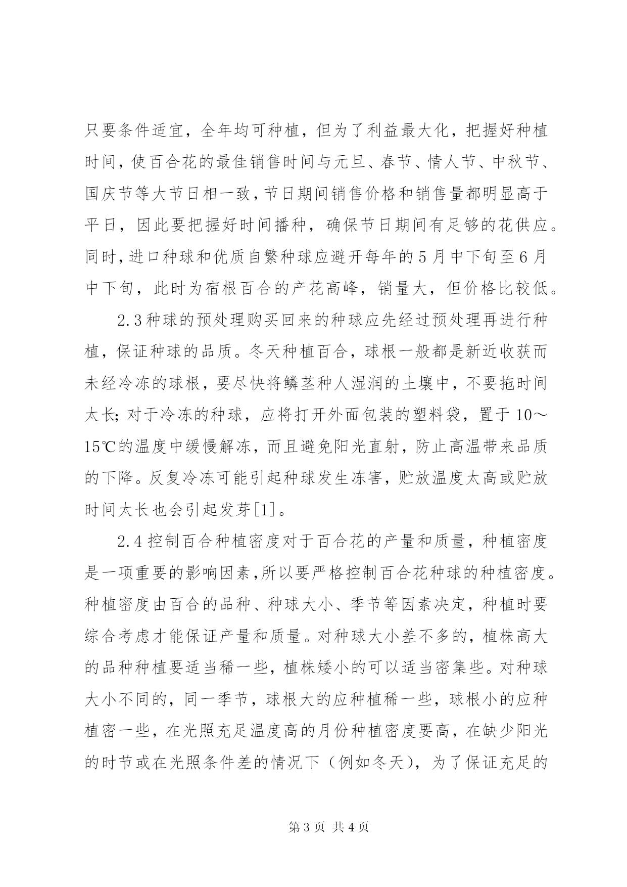 第PAGE\*Arabic\*MERGEFORMAT4页共NUMPAGES\*MERGEFORMAT4页切花百合栽培技术经验总结摘要。百合花种类繁多,花朵大,颜色鲜艳,深受大家喜爱。近年来,随着花卉市场的不断扩大,百合花对提高农民收入,改善国民生活有很大的作用。本文就百合鲜切花的开发前景和栽培优质高产百合技术进行简单介绍。关键词:百合鲜切花;花卉栽培技术;优质高产在中国百合具有百年好合、美好家庭、甜蜜爱情等含意,有深深祝福的意义,而且因其花朵大,颜色鲜艳,花姿妖娆,是深受大家喜爱的花种之一。特别适合用作切花、盆花和园林布景,深受人们的喜爱。百合花种类繁多,大约有90多种,主要分布在北半球的温带和寒带地区,少数种类分布在热带高海拔山区。我国是拥有百合种类最多的国家,据调查约有46种、18个变种,占世界百合总数的一半以上,其中有36个变种为中国特有种,是百合花的发布地。1开发前景1.1生活所需随着中国经济持续快速发展,国民生活水平不断提高,人们对生活品质的要求越来越高,人们文化素质的提高和消费需求多元化,对花卉的需求也越来越大。1.2农业产业结构调整近几年,随着产能过剩,农业产业结构急需调整,花卉业可以重点开发。当前,有很多地区的农村已经对产业结构进行了调整,百合切花的生产已成为重要的发展项目,不仅对土地资源进行了合理利用、农业生产效益大步提高、农民收入增加上发挥了巨大的作用。1.3发展花卉,增加对外贸易百合切花属于高档切花的一种,市场上的销售价格明显高于其它切花品种。近年来,中国花卉产业迅速发展,特别在我国XX省,每年以20%的增长幅度快速发展,是目前国内百合切花质量较高的产区之一。生产的切花除了供应国内各大城市(如北京、上海、广州等城市)外,还远销香港、新加坡等地,为我国赚取大量外汇。2发展优质高产的栽培技术中国百合栽培具有悠久的历史,但目前我国的百合切花生产工艺流程、技术水平均落后于世界发达国家(荷兰、日本等),而且百合种球主要依赖进口,伴随着我国鲜切花产业的不断发展,切花百合栽培面积不断扩大,许多科研、生产单位为发展我国的百合种球产业,进行了大量百合种球繁殖的实验探索,取得了一些成果。2.1选择高品质的百合品种百合鲜切花的品种选择应由市场需求来决定。亚洲百合属于无香型低档次百合,价格低廉;而东方百合则属于花大、鲜艳、芳香扑鼻的高档次百合花,价格也较高。因此在品种选择上,应考虑以东方百合为主,适当种植亚洲百合和庸香百合的品种。2.2对种植时间把握好百合切花的种植对时间没有太多要求,只要条件适宜,全年均可种植,但为了利益最大化,把握好种植时间,使百合花的最佳销售时间与元旦、春节、情人节、中秋节、国庆节等大节日相一致,节日期间销售价格和销售量都明显高于平日,因此要把握好时间播种,确保节日期间有足够的花供应。同时,进口种球和优质自繁种球应避开每年的5月中下旬至6月中下旬,此时为宿根百合的产花高峰,销量大,但价格比较低。2.3种球的预处理购买回来的种球应先经过预处理再进行种植,保证种球的品质。冬天种植百合,球根一般都是新近收获而未经冷冻的球根,要尽快将鳞茎种人湿润的土壤中,不要拖时间太长;对于冷冻的种球,应将打开外面包装的塑料袋,置于10~15℃的温度中缓慢解冻,而且避免阳光直射,防止高温带来品质的下降。反复冷冻可能引起种球发生冻害,贮放温度太高或贮放时间太长也会引起发芽[1]。2.4控制百合种植密度对于百合花的产量和质量,种植密度是一项重要的影响因素,所以要严格控制百合花种球的种植密度。种植密度由百合的品种、种球大小、季节等因素决定,种植时要综合考虑才能保证产量和质量。对种球大小差不多的,植株高大的品种种植要适当稀一些,植株矮小的可以适当密集些。对种球大小不同的,同一季节,球根大的应种植稀一些,球根小的应种植密一些,在光照充足温度高的月份种植密度要高,在缺少阳光的时节或在光照条件差的情况下(例如冬天),为了保证充足的光照和温度,种植密度可以适当降低。2.5控制湿度种植百合花前要严格控制土壤湿度,以握紧成团、落地松散为最佳。在温度较高的夏秋季,种植前,应该先浇一次水,要一次浇透,降低土壤温度,防止高温土壤损害种球。种植后,要再浇一次水,水不必太多,使土壤和种球充分接触就可以了,为根的发育打好基础。以后浇水只要保持土壤湿润,即握紧成团、落地松散,不出水为宜。浇水的最好的时间是晴天的上午,相对湿度保持在80%~85%左右,避免波动太大,减少叶烧发生。开花期间减少浇水,可以少量多次,防止百合鳞茎腐烂、落蕾。2.6改善种植方法在种植百合前要进行土壤消毒,种植方法采用开沟点种法。春夏季种植时,种植深度距地表8~locm,冬季6~8cm,如果种球种植过深,百合出土时消耗养分不说,还会影响根系生长,使鳞茎发育不佳,花芽较