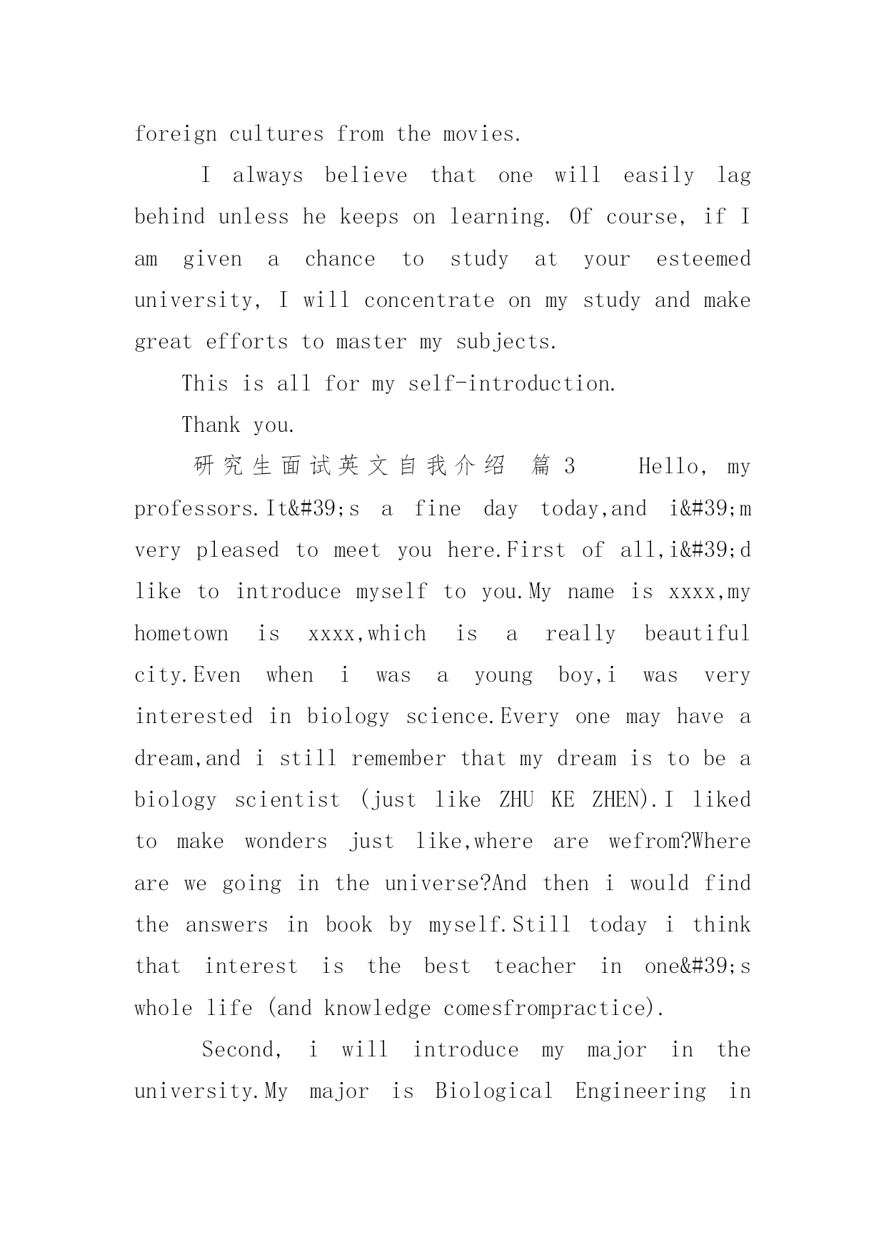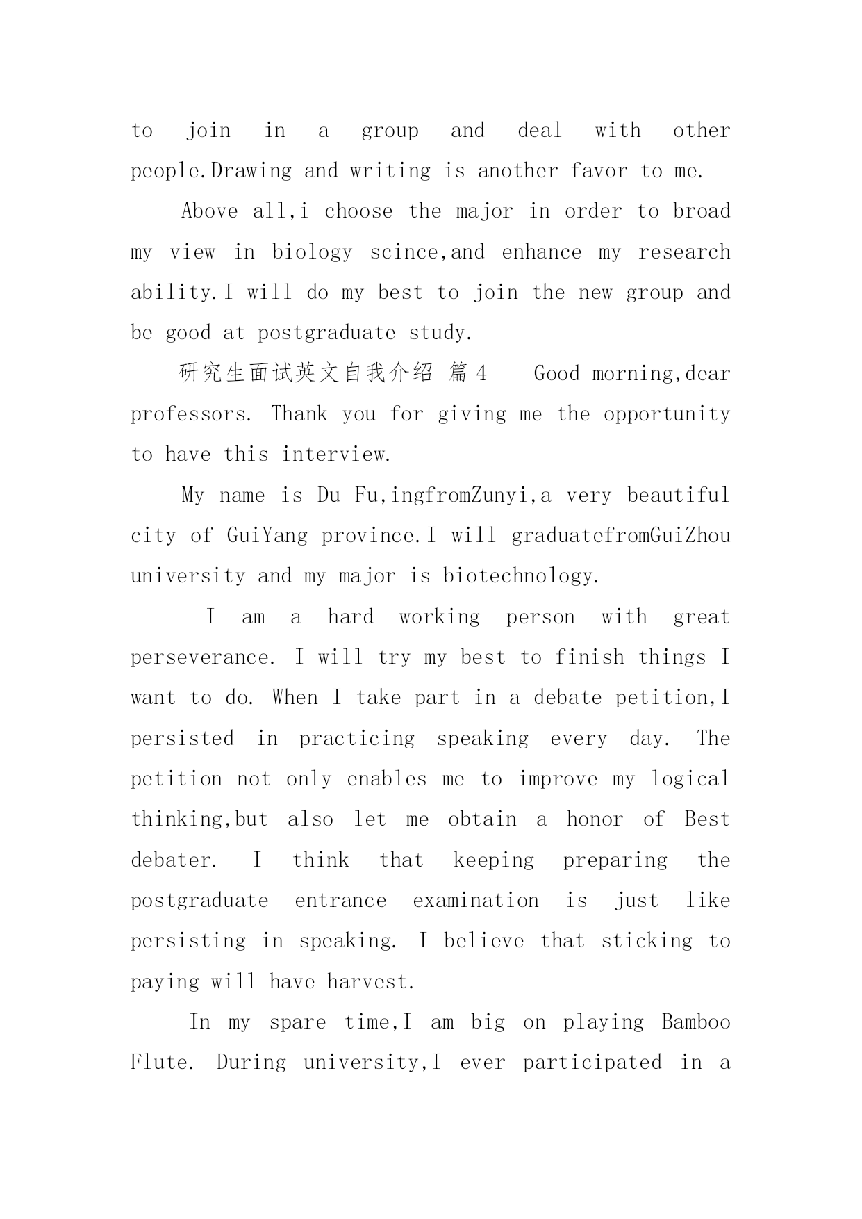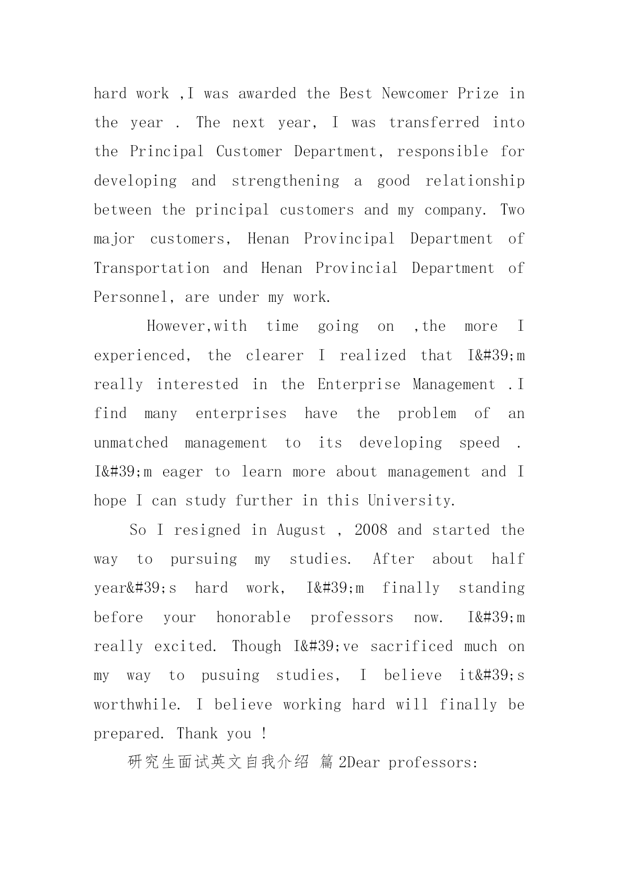 研究生面试英文自我介绍研究生面试英文自我介绍研究生考试已经在紧张的备考中了,备考固然重要,但是,面试时的'英文自我介绍也是不能忽略的。下面是小编整理的研究生面试英文自我介绍,供大家参考。研究生面试英文自我介绍篇1RespectedProfessors:Goodafternoon!I'mgreathonoredtomeetyouhere.Nowallowmetogiveabriefself-introduction.I'm,26yearsold,bornincity,Province.Intheyearof,IenteredUniversity,majoringinMachincalDesigningandProducing.Duringthose4years'study,IworkedhardandIwasalwaysactiveinvariousactivities.IgainedthefirstscholarshipforfourtimesandIjoinedtheCommunistPartyatthecollege.AftermygraduationinJune,Iworkedincompany.IgotapositionintheTechnologyDepartmentthefirstyearandIwasinvolvedinseveralinternetprojects,suchastheoneforCollegestudentRecruitmentinHenanProvinceandtheoneforComputerCenterinMathmaticsDepartmentinZhengzhouUniversity.Owningtomyhardwork,IwasawardedtheBestNewcomerPrizeintheyear.Thenextyear,IwastransferredintothePrincipalCustomerDepartment,responsiblefordevelopingandstrengtheningagoodrelationshipbetweentheprincipalcustomersandmycompany.Twomajorcustomers,HenanProvincipalDepartmentofTransportationandHenanProvincialDepartmentofPersonnel,areundermywork.However,withtimegoingon,themoreIexperienced,theclearerIrealizedthatI'mreallyinterestedintheEnterpriseManagement.Ifindmanyenterpriseshavetheproblemofanunmatchedmanagementtoitsdevelopingspeed.I'meagertolearnmoreaboutmanagementandIhopeIcanstudyfurtherinthisUniversity.SoIresignedinAugust,2008andstartedthewaytopursuingmystudies.Afterabouthalfyear'shardwork,I'mfinallystandingbeforeyourhonorableprofessorsnow.I'mreallyexcited.ThoughI'vesacrificedmuchonmywaytopusuingstudies,Ibelieveit'sworthwhile.Ibelieveworkinghardwillfinallybeprepared.Thankyou!研究生面试英文自我介绍篇2Dearprofessors:Iamgladtohavetheopportunitytohavethisinterview.MynameisAnna,comingfromChangchun,JilinProvince.AtpresentIwillgraduatefromJilinUniversitythisJune,majoringinmarketing.Iamahard-workingpersonwithgreatperseverance.Iwilltrymybesttofinishamatternomatterhowdifficultitis.Duringmycollegeyears,Ihavemadegreatprogressindifferentareas,asast