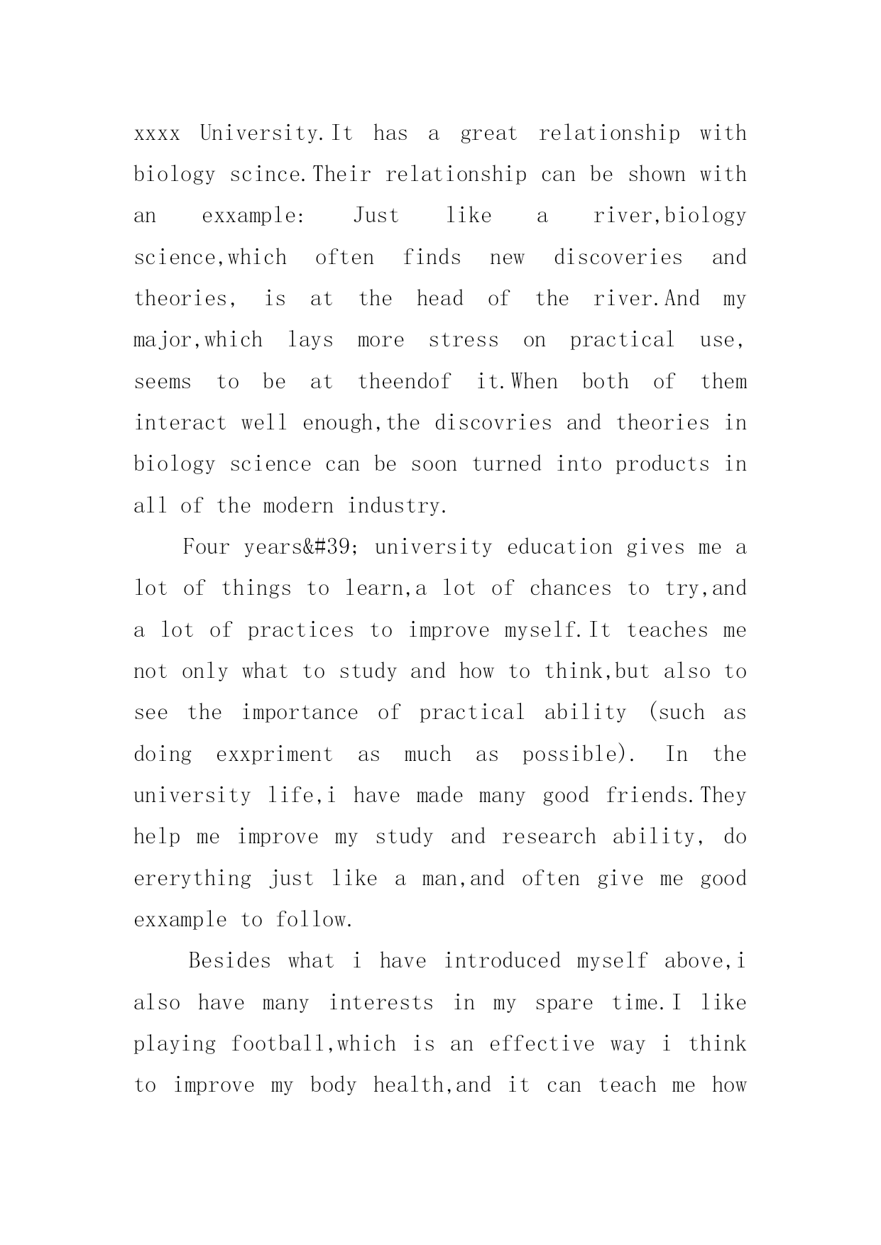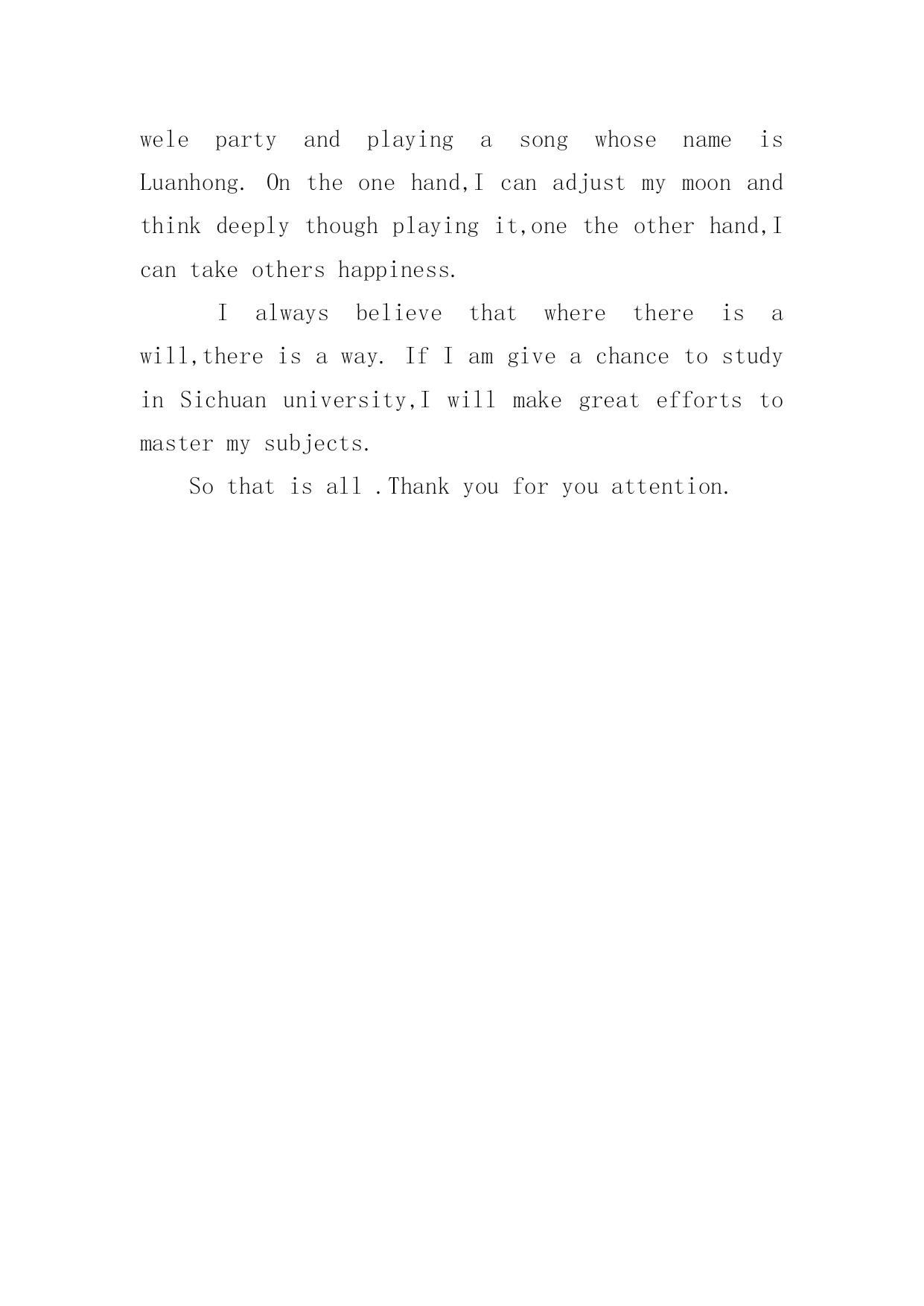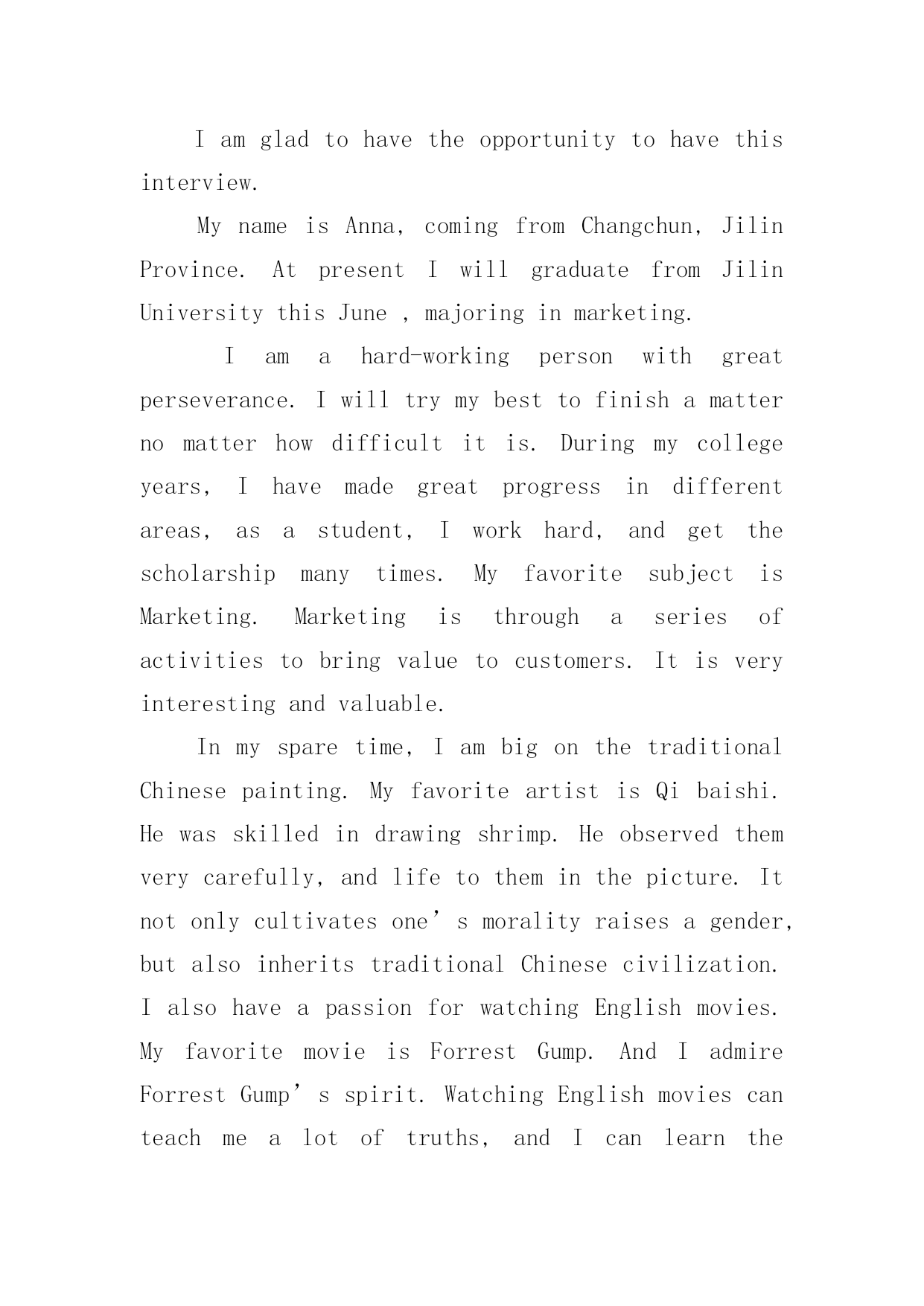 研究生面试英文自我介绍研究生面试英文自我介绍研究生考试已经在紧张的备考中了,备考固然重要,但是,面试时的'英文自我介绍也是不能忽略的。下面是小编整理的研究生面试英文自我介绍,供大家参考。研究生面试英文自我介绍篇1RespectedProfessors:Goodafternoon!I'mgreathonoredtomeetyouhere.Nowallowmetogiveabriefself-introduction.I'm,26yearsold,bornincity,Province.Intheyearof,IenteredUniversity,majoringinMachincalDesigningandProducing.Duringthose4years'study,IworkedhardandIwasalwaysactiveinvariousactivities.IgainedthefirstscholarshipforfourtimesandIjoinedtheCommunistPartyatthecollege.AftermygraduationinJune,Iworkedincompany.IgotapositionintheTechnologyDepartmentthefirstyearandIwasinvolvedinseveralinternetprojects,suchastheoneforCollegestudentRecruitmentinHenanProvinceandtheoneforComputerCenterinMathmaticsDepartmentinZhengzhouUniversity.Owningtomyhardwork,IwasawardedtheBestNewcomerPrizeintheyear.Thenextyear,IwastransferredintothePrincipalCustomerDepartment,responsiblefordevelopingandstrengtheningagoodrelationshipbetweentheprincipalcustomersandmycompany.Twomajorcustomers,HenanProvincipalDepartmentofTransportationandHenanProvincialDepartmentofPersonnel,areundermywork.However,withtimegoingon,themoreIexperienced,theclearerIrealizedthatI'mreallyinterestedintheEnterpriseManagement.Ifindmanyenterpriseshavetheproblemofanunmatchedmanagementtoitsdevelopingspeed.I'meagertolearnmoreaboutmanagementandIhopeIcanstudyfurtherinthisUniversity.SoIresignedinAugust,2008andstartedthewaytopursuingmystudies.Afterabouthalfyear'shardwork,I'mfinallystandingbeforeyourhonorableprofessorsnow.I'mreallyexcited.ThoughI'vesacrificedmuchonmywaytopusuingstudies,Ibelieveit'sworthwhile.Ibelieveworkinghardwillfinallybeprepared.Thankyou!研究生面试英文自我介绍篇2Dearprofessors:Iamgladtohavetheopportunitytohavethisinterview.MynameisAnna,comingfromChangchun,JilinProvince.AtpresentIwillgraduatefromJilinUniversitythisJune,majoringinmarketing.Iamahard-workingpersonwithgreatperseverance.Iwilltrymybesttofinishamatternomatterhowdifficultitis.Duringmycollegeyears,Ihavemadegreatprogressindifferentareas,asast