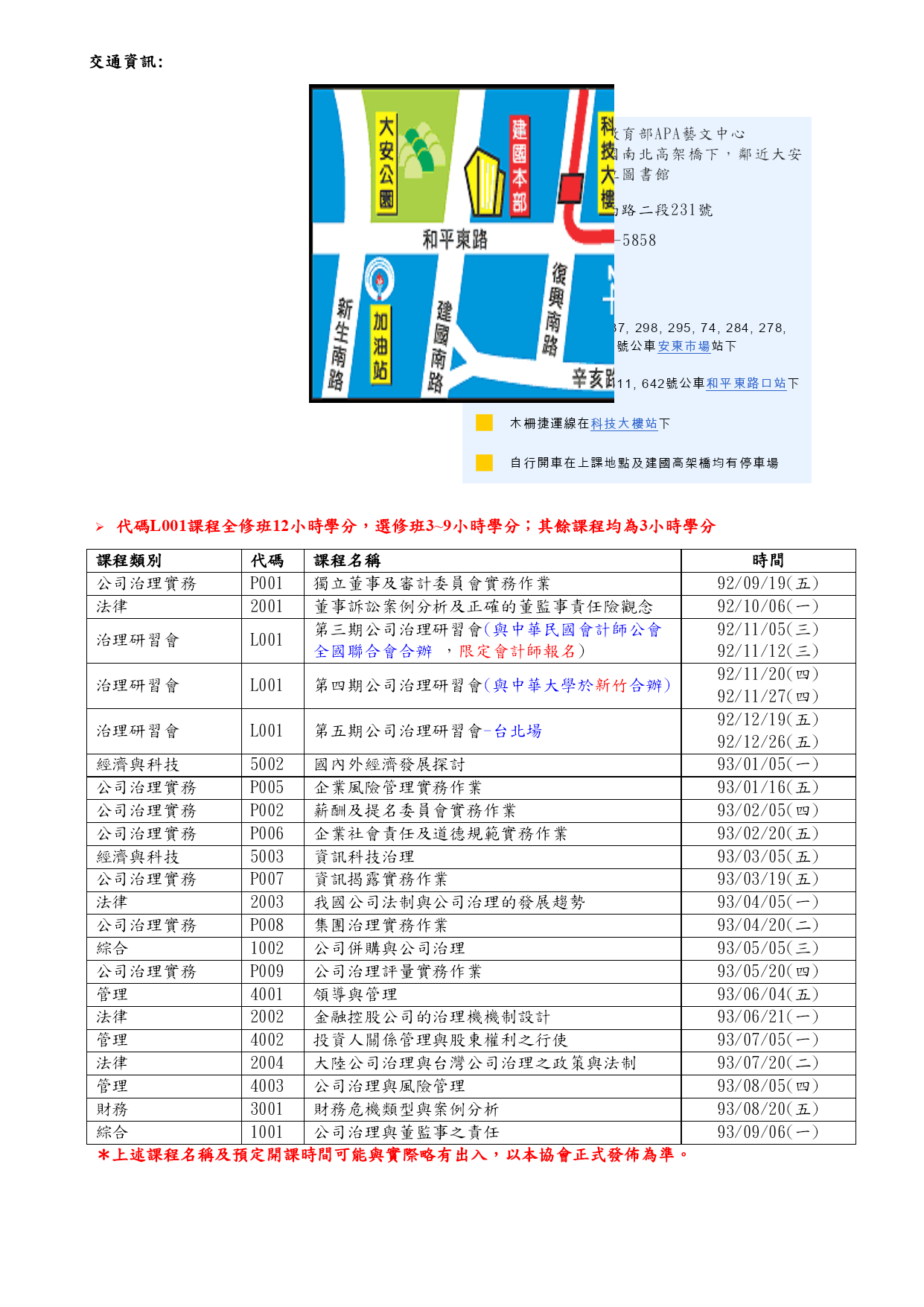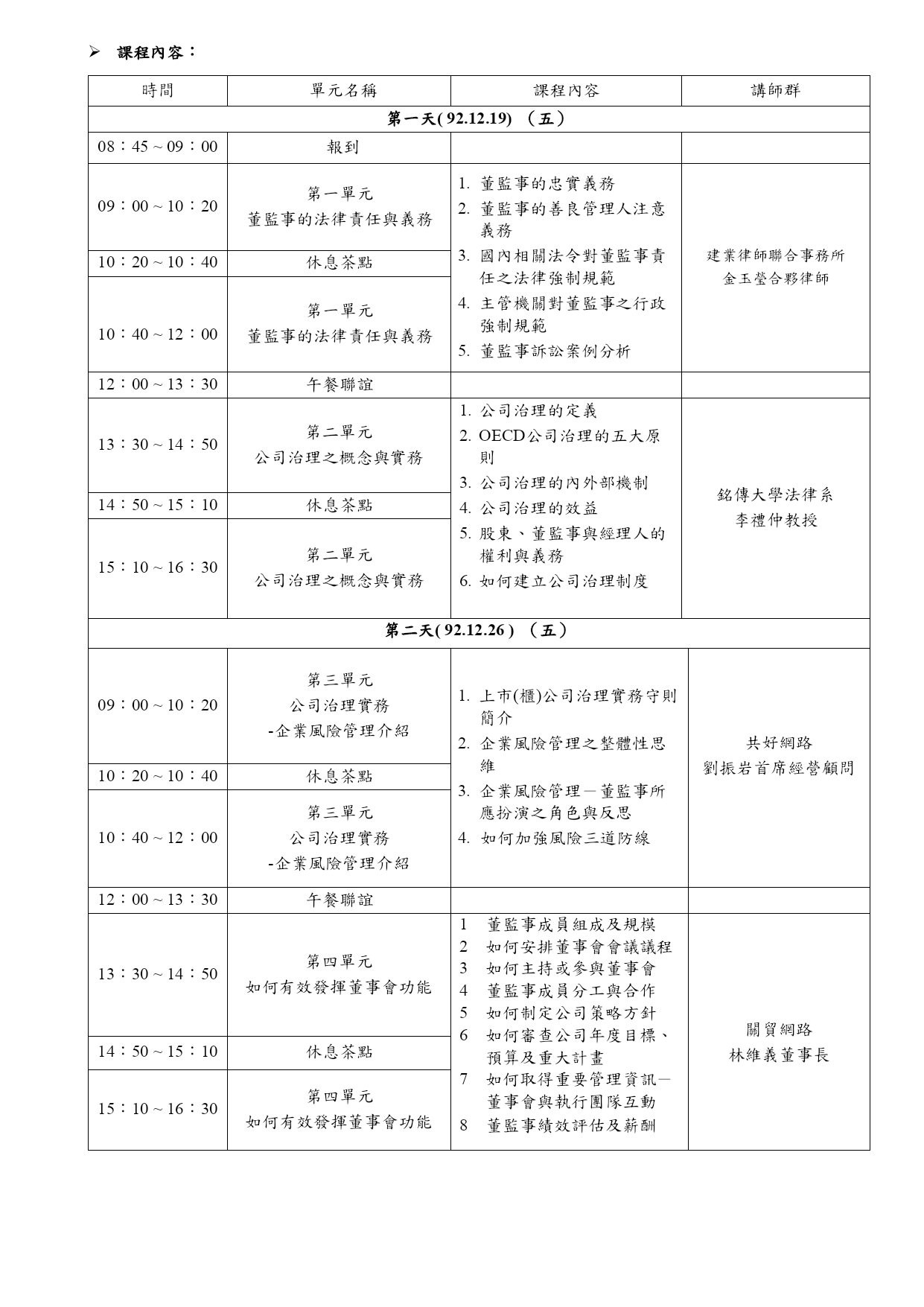 中華公司治理協會乃證期會指定為「建立董事、監察人常態進修管道」之主辦單位,為配合主管機關對董事及監察人專業知識進修規定(初任者12小時,續任者3小時),並建全及落實董監之責,提昇公司知名度與競爭力,特別規劃一系列訓練課程,會後並發放學分證明。參加對象:公民營企業董監事、公司高階主管、律師、會計師、學術界、政府機關等相關人員。上課時間:民國九十二年十二月十九日(五)與十二月二十六日(五)兩天上課地點:中國文化大學推廣教育部APA藝文中心台北市建國南路二段231號報名截止日:民國九十二年十二月十五日(一)報名費用:(含稅、講義、學分證明及餐點,另外選擇全日課者,有附午餐)全修班:非本會會員每位NT$9,000,本協會個人會員與團體會員優惠價每位NT$7,200。選修班:非本會會員每單元NT$2,500,本協會個人會員與團體會員優惠價每單元NT$2,000。主辦單位:社團法人中華公司治理協會修畢證書:參加全修班者,本協會將發給第二期公司治理研會修畢證書(12小時學分)。參加選修班者,本協將依上課時數發給學分證明(每一單元=3小時學分)。【第五期公司治理研習會報名表】12/15(一)截止報名參加者單位職稱聯絡電話E-MAIL參加場次□全修班□第一單元□第二單元□第三單元□第四單元聯絡人聯絡電話傳真號碼聯絡地址□□□發票抬頭統一編號發票地址參加類別□一般身份□個人會員或團體會員會員編號:費用/餐點元整(請於上課前完成繳費)/□素食□一般繳費方式郵局劃撥帳號19728482□劃線支票□郵局現金袋匯款:富邦銀行民生分行003-12501650100(請務必註明匯款人以便核對)*以上帳戶名稱或支票抬頭請註明:『社團法人中華公司治理協會』為確認您的報名,請檢附報名表影本及繳費收據,於92年12月15日前傳真至(02)2715-9875或電郵至HYPERLINK"mailto:vivianlin@kpmg.com.tw"mailto:vivianlin@kpmg.com.tw聯絡人:社團法人中華公司治理協會秘書處,林家安小姐,E-MAIL:HYPERLINK"mailto:vivianlin@kpmg.com.tw"vivianlin@kpmg.com.tw聯絡電話:02-2545-7535/02-2715-9999轉7115、7123、6860,傳真:02-2715-9875網址:HYPERLINK"http://www.cga.org.tw"www.cga.org.tw;聯絡地址:105台北市民生東路三段156號6樓。課程內容:時間單元名稱課程內容講師群第一天(92.12.19)(五)08:45~09:00報到09:00~10:20第一單元董監事的法律責任與義務董監事的忠實義務董監事的善良管理人注意義務國內相關法令對董監事責任之法律強制規範主管機關對董監事之行政強制規範董監事訴訟案例分析建業律師聯合事務所金玉瑩合夥律師10:20~10:40休息茶點10:40~12:00第一單元董監事的法律責任與義務12:00~13:30午餐聯誼13:30~14:50第二單元公司治理之概念與實務公司治理的定義OECD公司治理的五大原則公司治理的內外部機制公司治理的效益股東、董監事與經理人的權利與義務如何建立公司治理制度銘傳大學法律系李禮仲教授14:50~15:10休息茶點15:10~16:30第二單元公司治理之概念與實務第二天(92.12.26)(五)09:00~10:20第三單元公司治理實務-企業風險管理介紹上市(櫃)公司治理實務守則簡介企業風險管理之整體性思維企業風險管理-董監事所應扮演之角色與反思如何加強風險三道防線共好網路劉振岩首席經營顧問10:20~10:40休息茶點10:40~12:00第三單元公司治理實務-企業風險管理介紹12:00~13:30午餐聯誼13:30~14:50第四單元如何有效發揮董事會功能董監事成員組成及規模如何安排董事會會議議程如何主持或參與董事會董監事成員分工與合作如何制定公司策略方針如何審查公司年度目標、預算及重大計畫如何取得重要管理資訊-董事會與執行團隊互動董監事績效評估及薪酬關貿網路林維義董事長14:50~15:10休息茶點15:10~16:30第四單元如何有效發揮董事會功能交通資訊:中國文化大學推廣教育部APA藝文中心建國本部,地處建國南北高架橋下,鄰近大安森林公園及台北市立圖書館地址:台北市建國南路二段231號(02)2700-5858交通:■2,72,235,3,237,298,295,74,284,278,503,15,18,211號公車安東市場站下■280,290,5