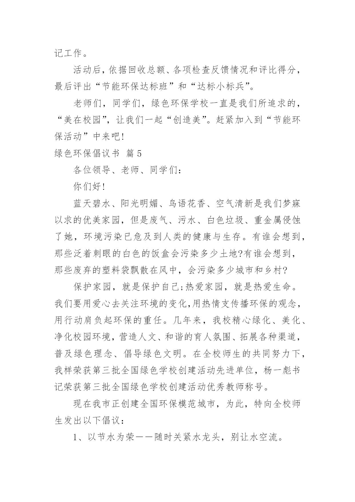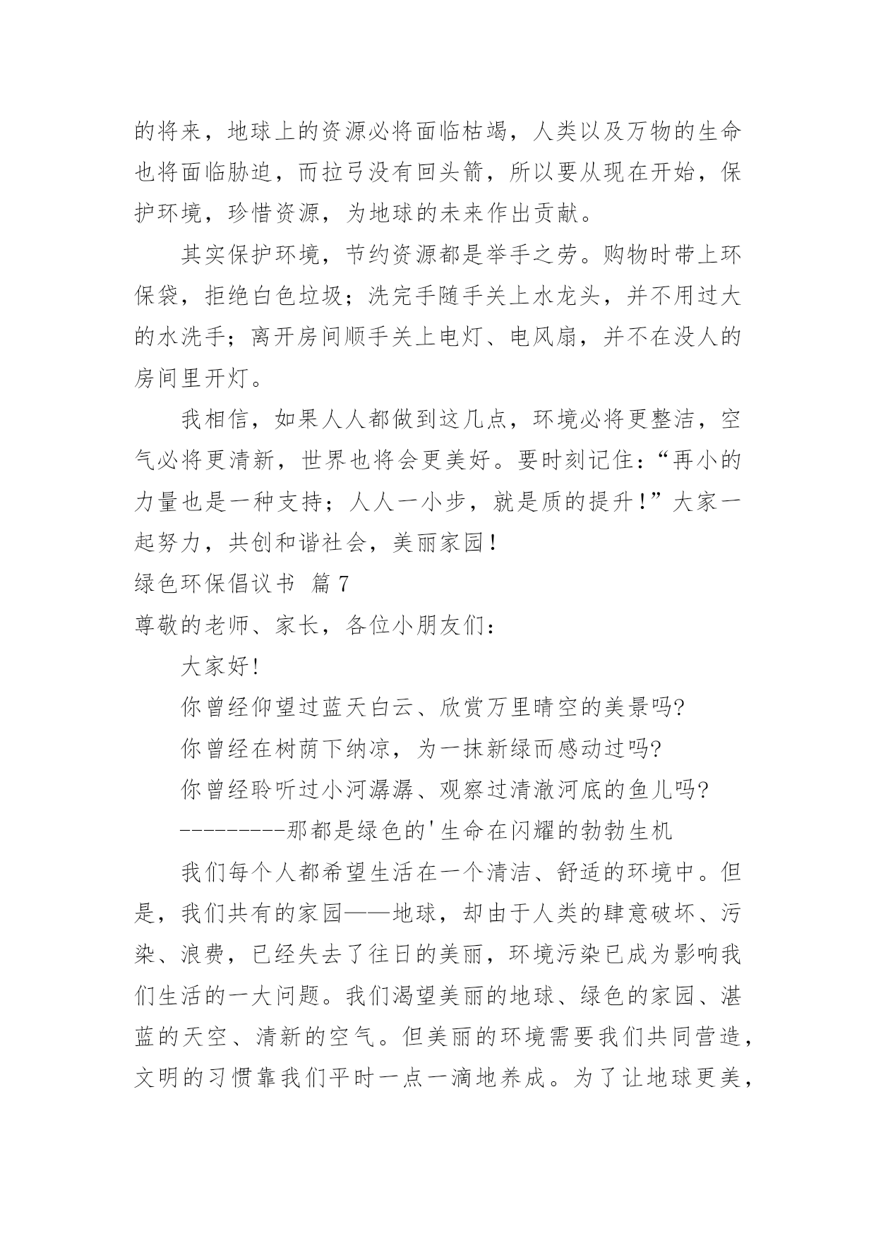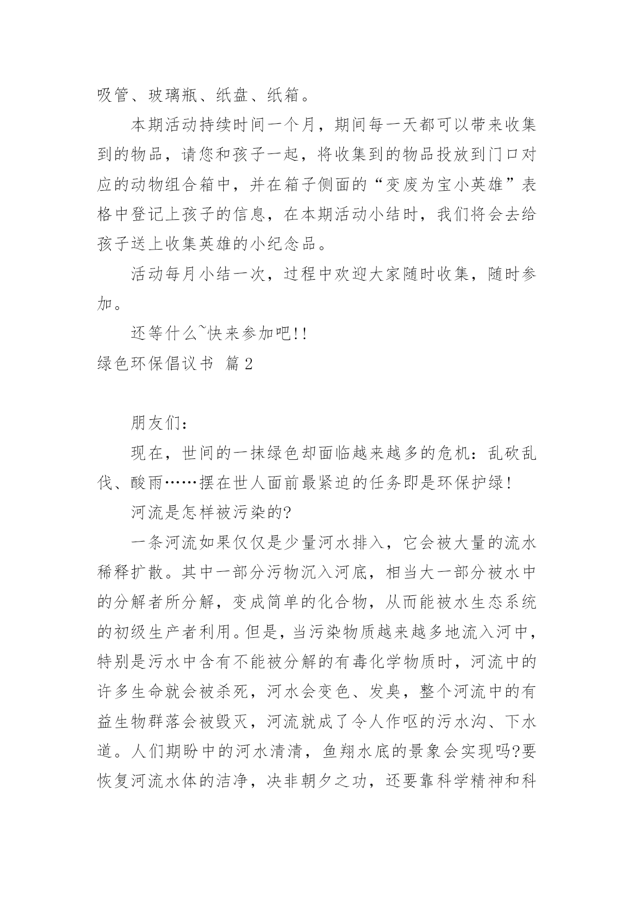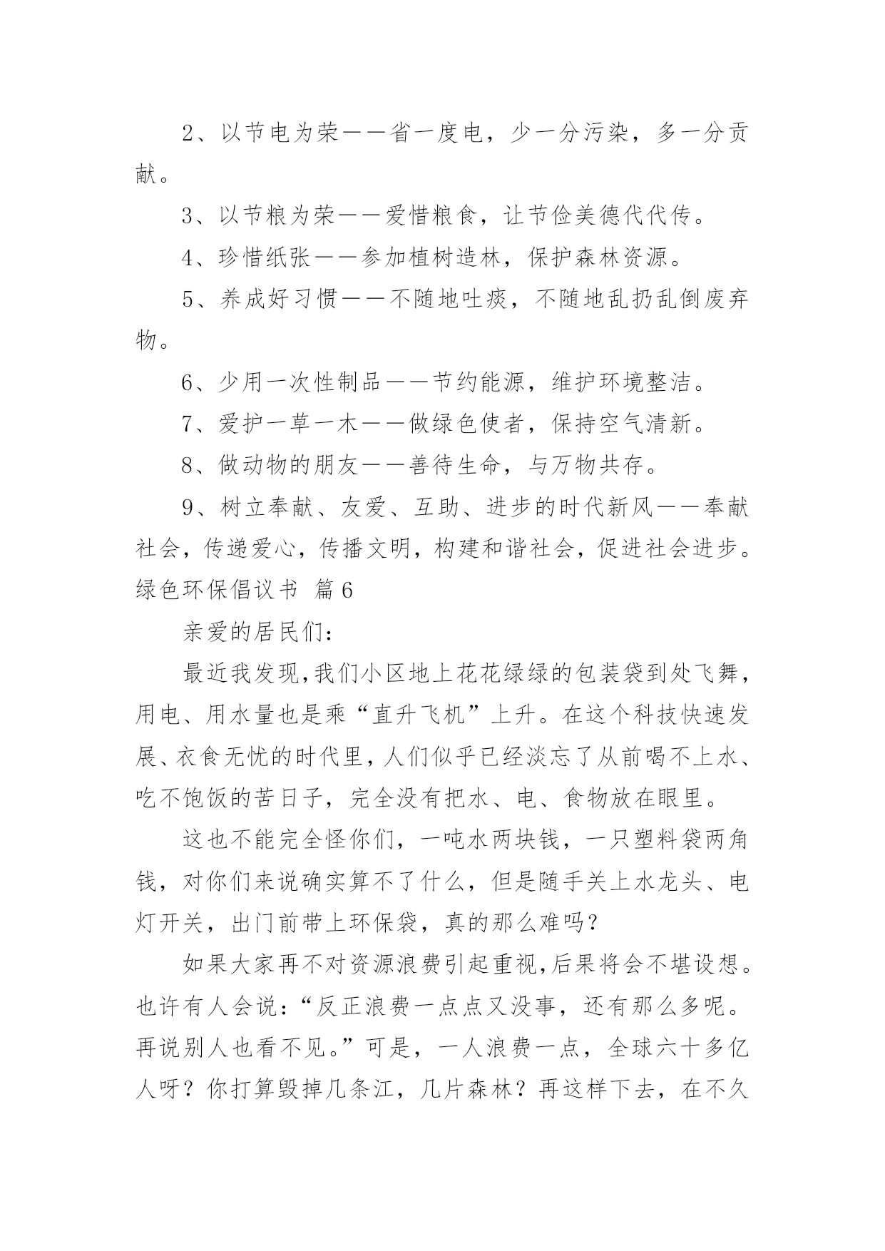 绿色环保倡议书绿色环保倡议书汇编十篇在不断进步的时代,能够利用到倡议书的场合越来越多,倡议书是由某一组织或社团拟定、就某事向社会提出建议或提议社会成员共同去做某事的书面文章。大家知道倡议书的格式吗?以下是小编为大家收集的绿色环保倡议书10篇,仅供参考,欢迎大家阅读。绿色环保倡议书篇1亲爱的小朋友,家长朋友:“废旧物品”是幼儿园的老朋友了,报纸、吸管、酸奶杯、牙膏盒、易拉罐、卫生纸筒它们活跃在幼儿园的每个角落,不管是美术活动、区角玉溪、手工创作,还是环境布置,小小的它都能发挥大大的作用。可是这些东西在家中,往往容易被忽视,不能发挥他们的“剩余价值”。因此,我们展开了这次“变废为宝总动员”的活动。对孩子们来说,废旧物品的回收再利用可以培养他们持续关注身边物品,节约生活的意识,萌发他们环境保护的意识,还可以在动手创作的过程中,提升幼儿的创造力和动手能力。所以快行动起来吧!活动参与方法:本期收集的物品是:牙膏盒、纸杯/塑料杯、饮乐多瓶、吸管、玻璃瓶、纸盘、纸箱。本期活动持续时间一个月,期间每一天都可以带来收集到的物品,请您和孩子一起,将收集到的物品投放到门口对应的动物组合箱中,并在箱子侧面的“变废为宝小英雄”表格中登记上孩子的信息,在本期活动小结时,我们将会去给孩子送上收集英雄的小纪念品。活动每月小结一次,过程中欢迎大家随时收集,随时参加。还等什么~快来参加吧!!绿色环保倡议书篇2朋友们:现在,世间的一抹绿色却面临越来越多的危机:乱砍乱伐、酸雨……摆在世人面前最紧迫的任务即是环保护绿!河流是怎样被污染的?一条河流如果仅仅是少量河水排入,它会被大量的流水稀释扩散。其中一部分污物沉入河底,相当大一部分被水中的分解者所分解,变成简单的化合物,从而能被水生态系统的初级生产者利用。但是,当污染物质越来越多地流入河中,特别是污水中含有不能被分解的有毒化学物质时,河流中的许多生命就会被杀死,河水会变色、发臭,整个河流中的有益生物群落会被毁灭,河流就成了令人作呕的污水沟、下水道。人们期盼中的河水清清,鱼翔水底的景象会实现吗?要恢复河流水体的洁净,决非朝夕之功,还要靠科学精神和科学方法继续进行系统治理。相信不久的将来,我们一定能看到美丽、清洁的河流、湖泊。电池的危害随着科学技术的日益进步,越来越多的现代化、智能化的家用电器和数码产品进入了我们的生活。遥控器、随身听、GAMEBOY和DV机等等,无不牵涉到一样既让人欢喜又让人担忧的东西——电池。小小的电池给我们生活带来欢乐的同时,也给我们环保带来了很大的麻烦,如果废旧电池随意处置,将使我们的良田变成不毛之地,清澈的河水将与我们告别,我们将生活在非常恶劣的环境中。好在政府部门已经认识到废电池的巨大危害性,采取各种措施,设立了很多的废电池回收箱,处理站,我们学生也应该积极行动起来,投入到这项有益的活动中去。塑料袋的问题因为科技的迅速发展,人们生活水平的提高,生活中出现了塑料袋,虽说它使用方便,但是却给环境带来了很多“不便”。当我们高高行行地从超市满载而归时,有没有想过那么多塑料袋将会去哪?据说,这些塑料袋并不能用火燃烧,只能埋于地下,这样也会使土质下降,所以我们尽可能不用塑料袋而改用菜篮子,既环保又无害。综上所述,环境污染对我们的健康越来越有威胁,许多呼吸道疾病也越来越多,所以,在这个污染日益严重的城市里,应该多点废电池回收站,应该每10米一个垃圾桶,应该到处都种绿色开花植物,这样我们才能以清洁的环境来迎接20xx年世博会,20xx年奥运会,20xx年残运会。以下,是我们的绿色倡议:1、所使用的废品,包括废旧电池、废啤酒瓶。凡是所能回收的东西都请回收。2、请大家自觉监督公共汽车等排放有害物质的情况。3、坚决揭发有关沿江厂向灵江排放脏水。4、不要在街道、江中等场所乱丢垃圾。5、少用塑料袋,多用环保的布袋。希望大家都能积极遵守这份倡议书,为保护与美化人类自身的家园出一份力!绿色环保倡议书篇3我们是来自于学校的学生,在新的一年中,我们渴望有一个干净环保的家园,渴望绿色、健康、卫生的社区遍地开花……各位叔叔、阿姨、同学们,让我们立即行动起来!为了保护家园的绿色,为了子孙后代,消灭污染,保护发展环境。在此,我们发出倡议:1、使用无磷洗涤剂。含磷洗涤剂使用时会使大量的磷进入城市水体,引起水质下降,水体变黑变臭。我们可以选购“无磷”洗涤剂,减少污染。2、请随手关紧水龙头,提倡一水多用。一个关不紧的水龙头一个月可以流掉1-6吨水。随水关紧水龙头,乃是举手之劳,而一水多用更是节约用水的具体表现。3、请将再生资源分类回收,注意及时回收废塑料制品。4、请少用一次性制品。一次性制品给我们带来了方便,但也浪费了大量保贵资源。“一次性”物品,我们实在消费不起了!5、请选用环保建材装修居室。很多人在住进新装修的房子后,会感到头痛、恶心
