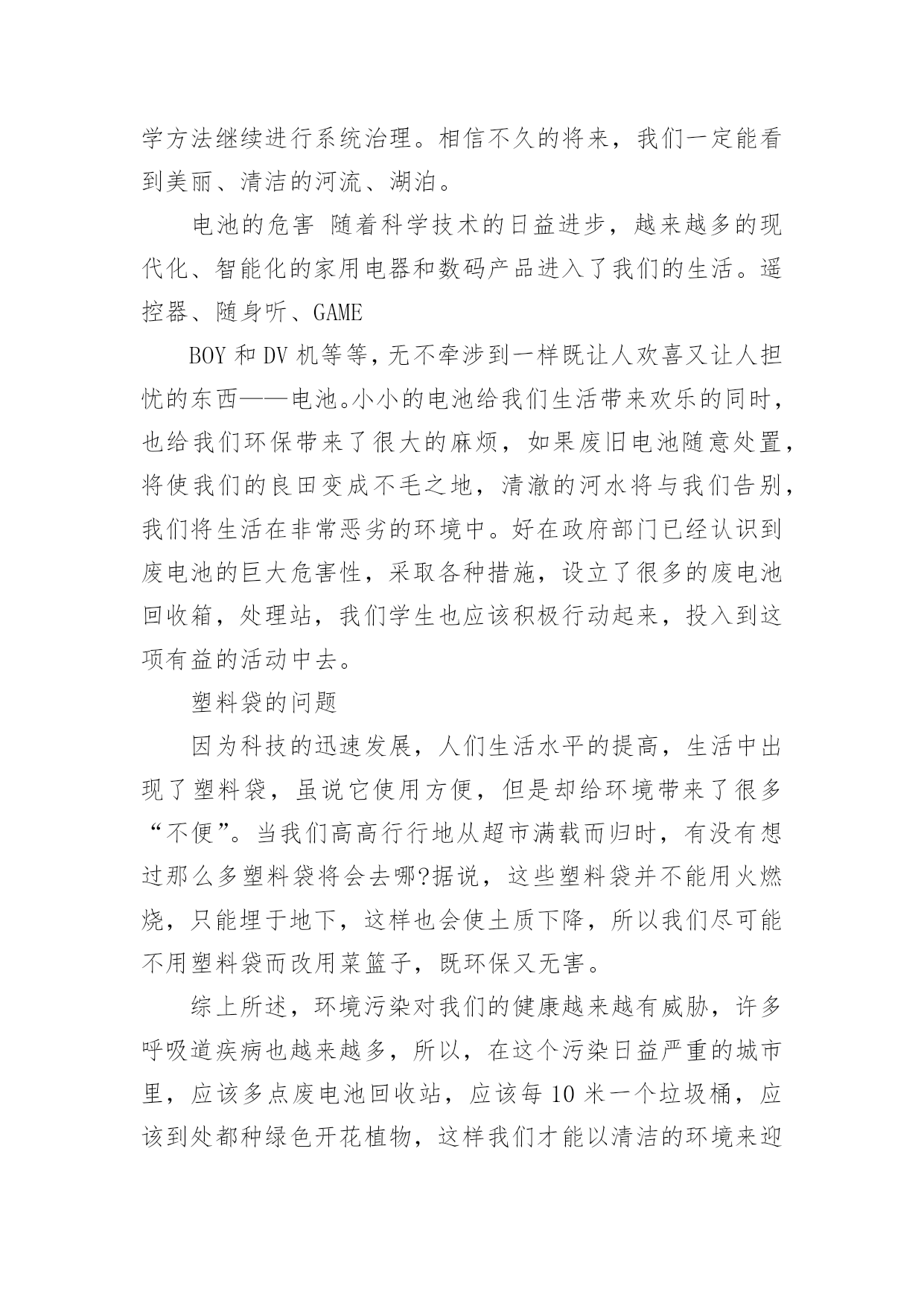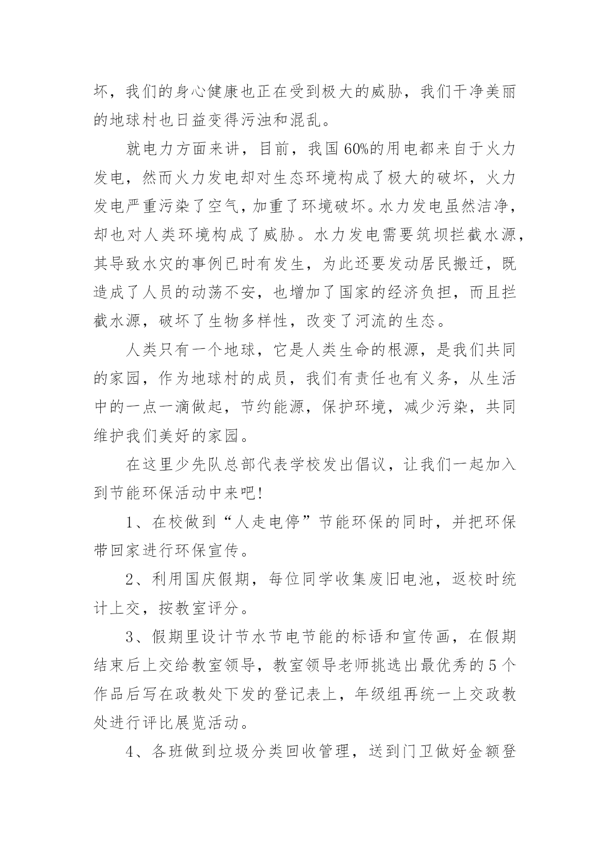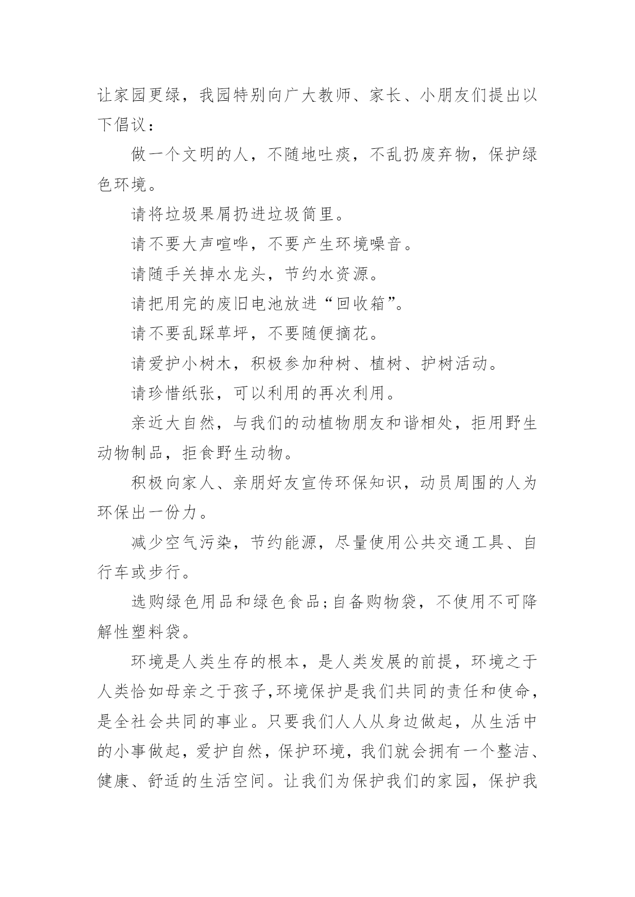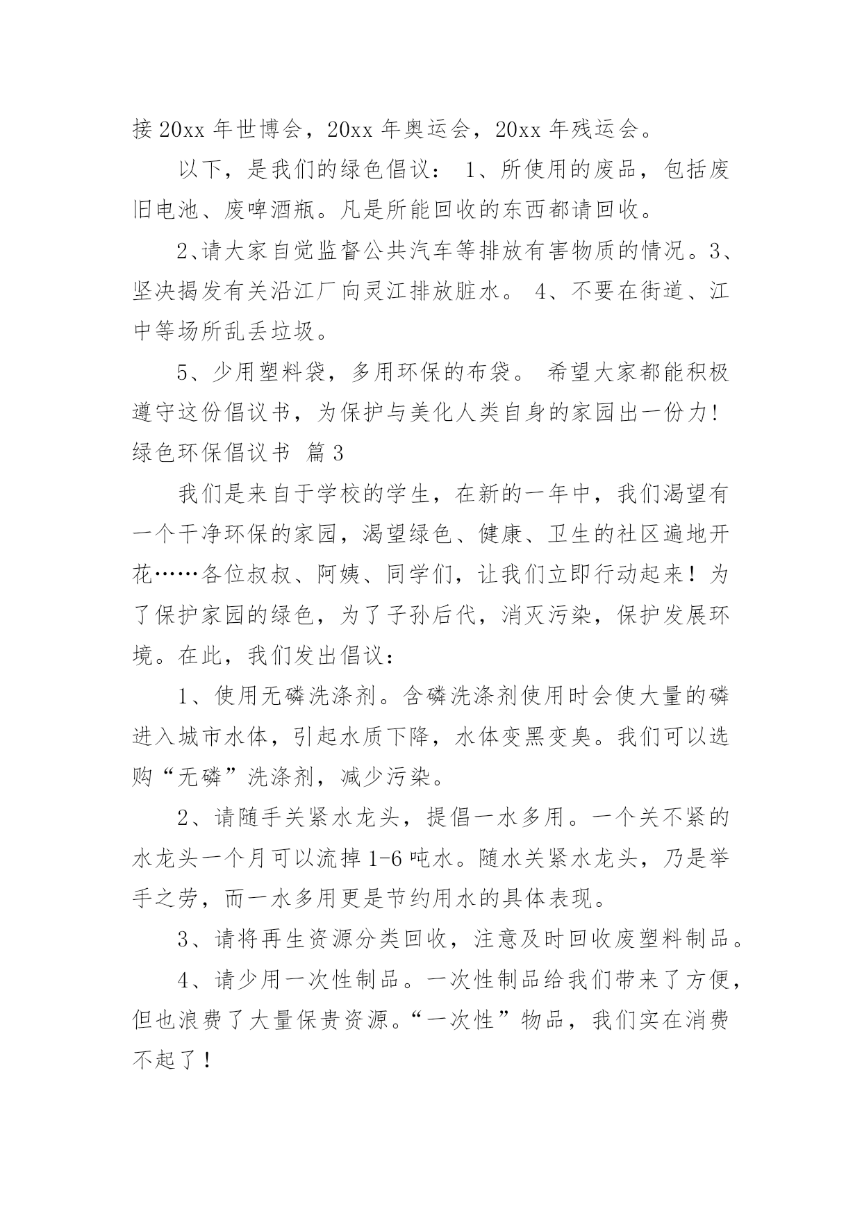 绿色环保倡议书绿色环保倡议书汇编十篇在不断进步的时代,能够利用到倡议书的场合越来越多,倡议书是由某一组织或社团拟定、就某事向社会提出建议或提议社会成员共同去做某事的书面文章。大家知道倡议书的格式吗?以下是小编为大家收集的绿色环保倡议书10篇,仅供参考,欢迎大家阅读。绿色环保倡议书篇1亲爱的小朋友,家长朋友:“废旧物品”是幼儿园的老朋友了,报纸、吸管、酸奶杯、牙膏盒、易拉罐、卫生纸筒它们活跃在幼儿园的每个角落,不管是美术活动、区角玉溪、手工创作,还是环境布置,小小的它都能发挥大大的作用。可是这些东西在家中,往往容易被忽视,不能发挥他们的“剩余价值”。因此,我们展开了这次“变废为宝总动员”的活动。对孩子们来说,废旧物品的回收再利用可以培养他们持续关注身边物品,节约生活的意识,萌发他们环境保护的意识,还可以在动手创作的过程中,提升幼儿的创造力和动手能力。所以快行动起来吧!活动参与方法:本期收集的物品是:牙膏盒、纸杯/塑料杯、饮乐多瓶、吸管、玻璃瓶、纸盘、纸箱。本期活动持续时间一个月,期间每一天都可以带来收集到的物品,请您和孩子一起,将收集到的物品投放到门口对应的动物组合箱中,并在箱子侧面的“变废为宝小英雄”表格中登记上孩子的信息,在本期活动小结时,我们将会去给孩子送上收集英雄的小纪念品。活动每月小结一次,过程中欢迎大家随时收集,随时参加。还等什么~快来参加吧!!绿色环保倡议书篇2朋友们:现在,世间的一抹绿色却面临越来越多的危机:乱砍乱伐、酸雨……摆在世人面前最紧迫的任务即是环保护绿!河流是怎样被污染的?一条河流如果仅仅是少量河水排入,它会被大量的流水稀释扩散。其中一部分污物沉入河底,相当大一部分被水中的分解者所分解,变成简单的化合物,从而能被水生态系统的初级生产者利用。但是,当污染物质越来越多地流入河中,特别是污水中含有不能被分解的有毒化学物质时,河流中的许多生命就会被杀死,河水会变色、发臭,整个河流中的有益生物群落会被毁灭,河流就成了令人作呕的污水沟、下水道。人们期盼中的河水清清,鱼翔水底的景象会实现吗?要恢复河流水体的洁净,决非朝夕之功,还要靠科学精神和科学方法继续进行系统治理。相信不久的将来,我们一定能看到美丽、清洁的河流、湖泊。电池的危害随着科学技术的日益进步,越来越多的现代化、智能化的家用电器和数码产品进入了我们的生活。遥控器、随身听、GAMEBOY和DV机等等,无不牵涉到一样既让人欢喜又让人担忧的东西——电池。小小的电池给我们生活带来欢乐的同时,也给我们环保带来了很大的麻烦,如果废旧电池随意处置,将使我们的良田变成不毛之地,清澈的河水将与我们告别,我们将生活在非常恶劣的环境中。好在政府部门已经认识到废电池的巨大危害性,采取各种措施,设立了很多的废电池回收箱,处理站,我们学生也应该积极行动起来,投入到这项有益的活动中去。塑料袋的问题因为科技的迅速发展,人们生活水平的提高,生活中出现了塑料袋,虽说它使用方便,但是却给环境带来了很多“不便”。当我们高高行行地从超市满载而归时,有没有想过那么多塑料袋将会去哪?据说,这些塑料袋并不能用火燃烧,只能埋于地下,这样也会使土质下降,所以我们尽可能不用塑料袋而改用菜篮子,既环保又无害。综上所述,环境污染对我们的健康越来越有威胁,许多呼吸道疾病也越来越多,所以,在这个污染日益严重的城市里,应该多点废电池回收站,应该每10米一个垃圾桶,应该到处都种绿色开花植物,这样我们才能以清洁的环境来迎接20xx年世博会,20xx年奥运会,20xx年残运会。以下,是我们的绿色倡议:1、所使用的废品,包括废旧电池、废啤酒瓶。凡是所能回收的东西都请回收。2、请大家自觉监督公共汽车等排放有害物质的情况。3、坚决揭发有关沿江厂向灵江排放脏水。4、不要在街道、江中等场所乱丢垃圾。5、少用塑料袋,多用环保的布袋。希望大家都能积极遵守这份倡议书,为保护与美化人类自身的家园出一份力!绿色环保倡议书篇3我们是来自于学校的学生,在新的一年中,我们渴望有一个干净环保的家园,渴望绿色、健康、卫生的社区遍地开花……各位叔叔、阿姨、同学们,让我们立即行动起来!为了保护家园的绿色,为了子孙后代,消灭污染,保护发展环境。在此,我们发出倡议:1、使用无磷洗涤剂。含磷洗涤剂使用时会使大量的磷进入城市水体,引起水质下降,水体变黑变臭。我们可以选购“无磷”洗涤剂,减少污染。2、请随手关紧水龙头,提倡一水多用。一个关不紧的水龙头一个月可以流掉1-6吨水。随水关紧水龙头,乃是举手之劳,而一水多用更是节约用水的具体表现。3、请将再生资源分类回收,注意及时回收废塑料制品。4、请少用一次性制品。一次性制品给我们带来了方便,但也浪费了大量保贵资源。“一次性”物品,我们实在消费不起了!5、请选用环保建材装修居室。很多人在住进新装修的房子后,会感到头痛、恶心