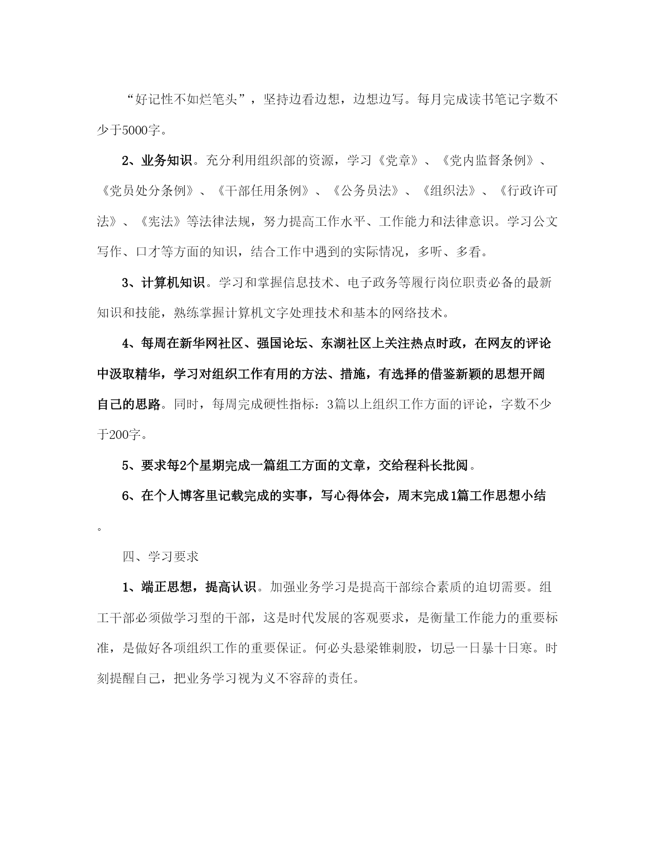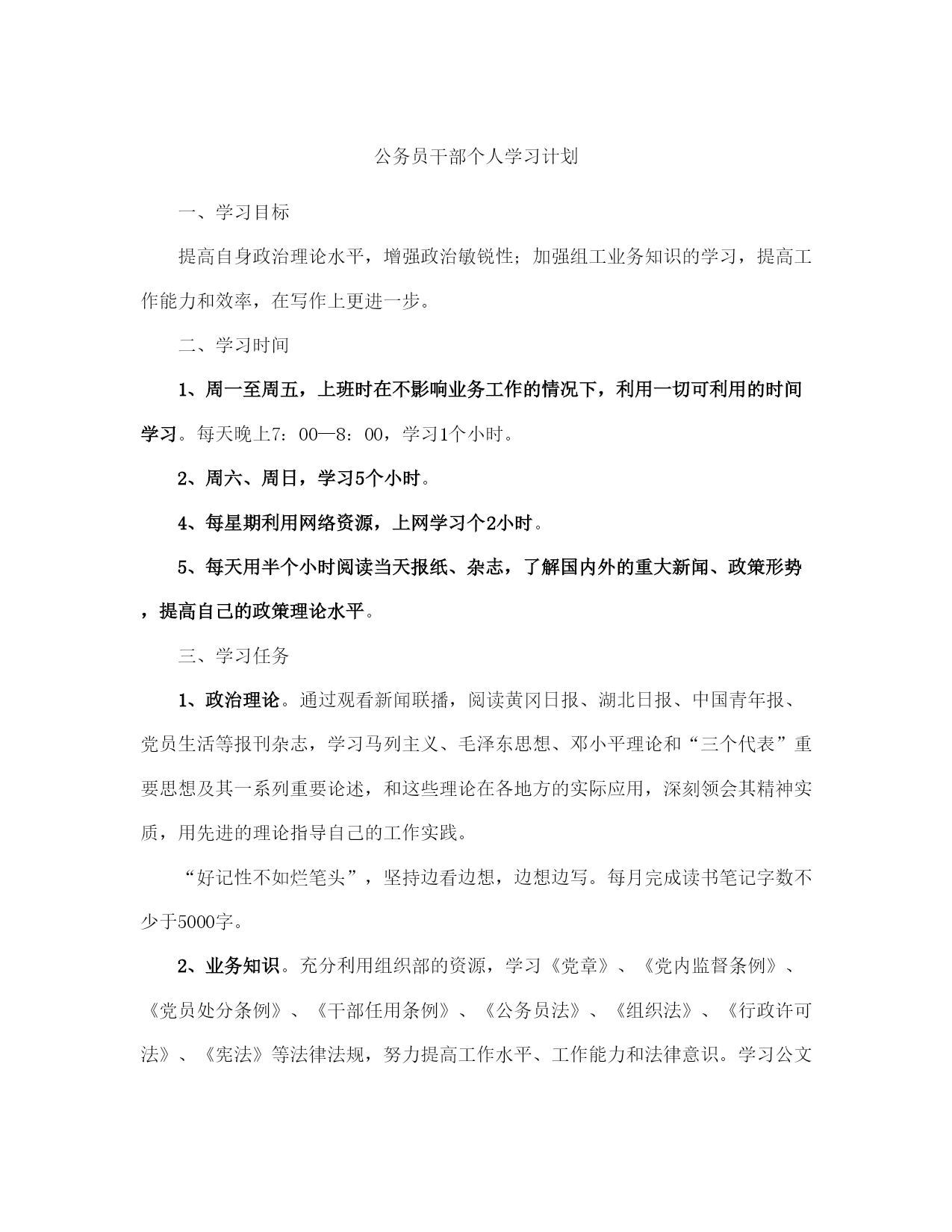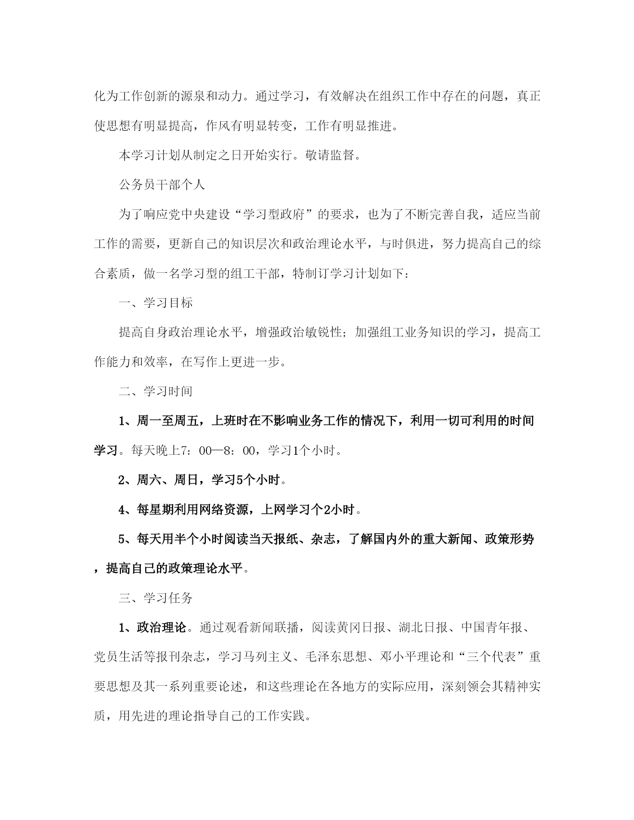 公务员干部个人学习计划范本(完整版)文档资料可直接使用,可编辑,欢迎下载公务员干部个人学习计划一、学习目标提高自身政治理论水平,增强政治敏锐性;加强组工业务知识的学习,提高工作能力和效率,在写作上更进一步。二、学习时间1、周一至周五,上班时在不影响业务工作的情况下,利用一切可利用的时间学习。每天晚上7:00—8:00,学习1个小时。2、周六、周日,学习5个小时。4、每星期利用网络资源,上网学习个2小时。5、每天用半个小时阅读当天报纸、杂志,了解国内外的重大新闻、政策形势,提高自己的政策理论水平。三、学习任务1、政治理论。通过观看新闻联播,阅读黄冈日报、湖北日报、中国青年报、党员生活等报刊杂志,学习马列主义、毛泽东思想、邓小平理论和“三个代表”重要思想及其一系列重要论述,和这些理论在各地方的实际应用,深刻领会其精神实质,用先进的理论指导自己的工作实践。“好记性不如烂笔头”,坚持边看边想,边想边写。每月完成读书笔记字数不少于5000字。2、业务知识。充分利用组织部的资源,学习《党章》、《党内监督条例》、《党员处分条例》、《干部任用条例》、《公务员法》、《组织法》、《行政许可法》、《宪法》等法律法规,努力提高工作水平、工作能力和法律意识。学习公文写作、口才等方面的知识,结合工作中遇到的实际情况,多听、多看、多写以提高公文写作的水平。3、计算机知识。学习和掌握信息技术、电子政务等履行岗位职责必备的最新知识和技能,熟练掌握计算机文字处理技术和基本的网络技术。4、每周在新华网社区、强国论坛、东湖社区上关注热点时政,在网友的评论中汲取精华,学习对组织工作有用的方法、措施,有选择的借鉴新颖的思想开阔自己的思路。同时,每周完成硬性指标:3篇以上组织工作方面的评论,字数不少于200字。5、要求每2个星期完成一篇组工方面的文章,交给程科长批阅。6、在个人博客里记载完成的实事,写心得体会,周末完成1篇工作思想小结。四、学习要求1、端正思想,提高认识。加强业务学习是提高干部综合素质的迫切需要。组工干部必须做学习型的干部,这是时代发展的客观要求,是衡量工作能力的重要标准,是做好各项组织工作的重要保证。何必头悬梁锥刺股,切忌一日暴十日寒。时刻提醒自己,把业务学习视为义不容辞的责任。2、统筹兼顾,科学安排。处理好学习与工作的关系,做到学习与工作有机统一,努力使学习工作化,工作学习化。结合工作实际,灵活的分配学习时间,确保各项学习任务得到落实。3、融会贯通,学以致用。通过不断学习业务知识来提高自身的业务水平,通过不断实践来丰富工作经验,把知识和经验的积累升华为思维模式的更新,进而转化为工作创新的源泉和动力。通过学习,有效解决在组织工作中存在的问题,真正使思想有明显提高,作风有明显转变,工作有明显推进。本学习计划从制定之日开始实行。敬请监督。公务员干部个人为了响应党中央建设“学习型政府”的要求,也为了不断完善自我,适应当前工作的需要,更新自己的知识层次和政治理论水平,与时俱进,努力提高自己的综合素质,做一名学习型的组工干部,特制订学习计划如下:一、学习目标提高自身政治理论水平,增强政治敏锐性;加强组工业务知识的学习,提高工作能力和效率,在写作上更进一步。二、学习时间1、周一至周五,上班时在不影响业务工作的情况下,利用一切可利用的时间学习。每天晚上7:00—8:00,学习1个小时。2、周六、周日,学习5个小时。4、每星期利用网络资源,上网学习个2小时。5、每天用半个小时阅读当天报纸、杂志,了解国内外的重大新闻、政策形势,提高自己的政策理论水平。三、学习任务1、政治理论。通过观看新闻联播,阅读黄冈日报、湖北日报、中国青年报、党员生活等报刊杂志,学习马列主义、毛泽东思想、邓小平理论和“三个代表”重要思想及其一系列重要论述,和这些理论在各地方的实际应用,深刻领会其精神实质,用先进的理论指导自己的工作实践。“好记性不如烂笔头”,坚持边看边想,边想边写。每月完成读书笔记字数不少于5000字。2、业务知识。充分利用组织部的资源,学习《党章》、《党内监督条例》、《党员处分条例》、《干部任用条例》、《公务员法》、《组织法》、《行政许可法》、《宪法》等法律法规,努力提高工作水平、工作能力和法律意识。学习公文写作、口才等方面的知识,结合工作中遇到的实际情况,多听、多看。3、计算机知识。学习和掌握信息技术、电子政务等履行岗位职责必备的最新知识和技能,熟练掌握计算机文字处理技术和基本的网络技术。4、每周在新华网社区、强国论坛、东湖社区上关注热点时政,在网友的评论中汲取精华,学习对组织工作有用的方法、措施,有选择的借鉴新颖的思想开阔自己的思路。同时,每周完成硬性指标:3篇以上组织工作方面的评论,字数不少于200字。