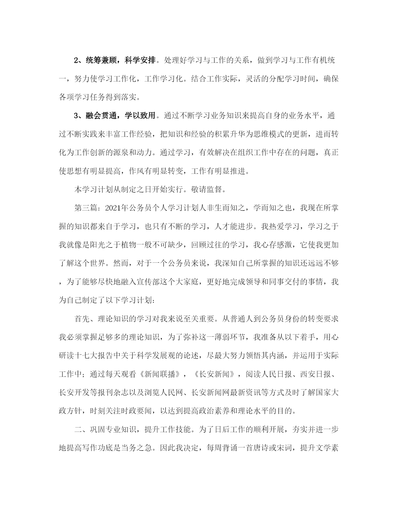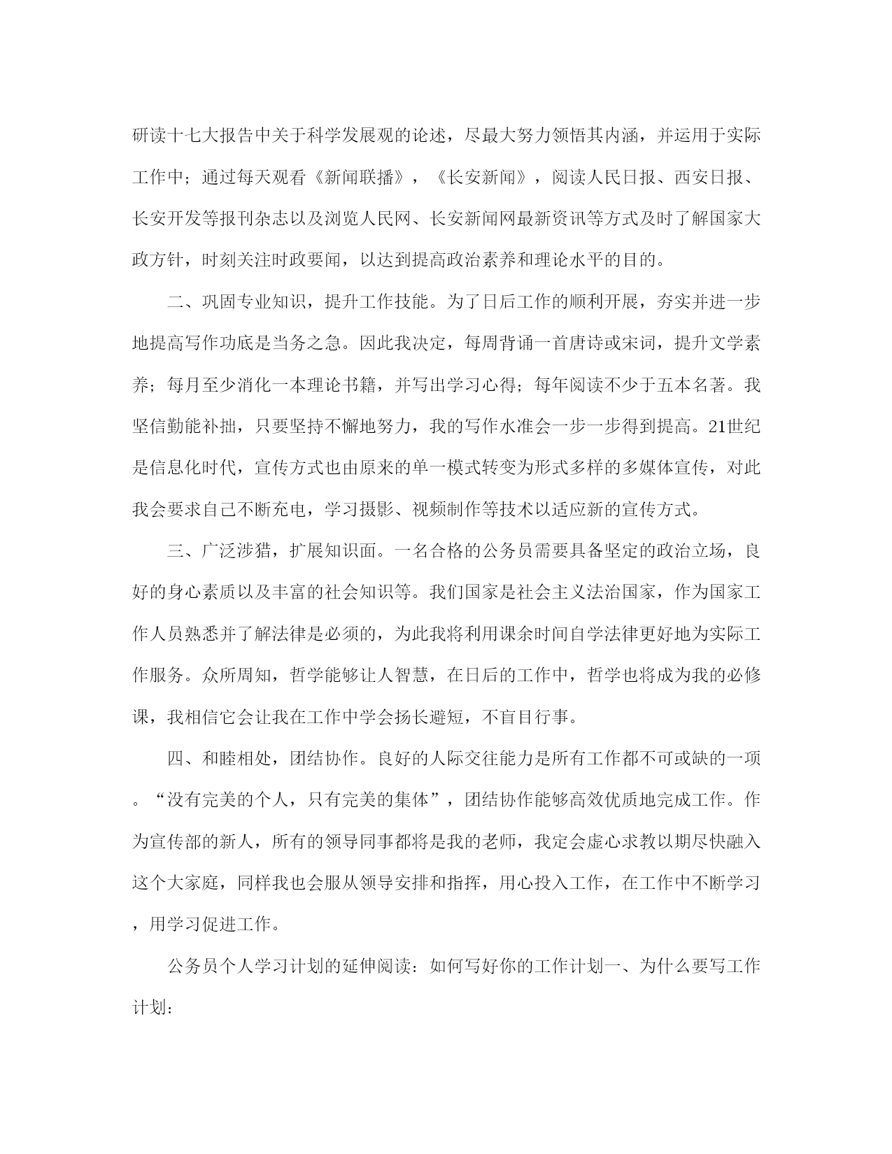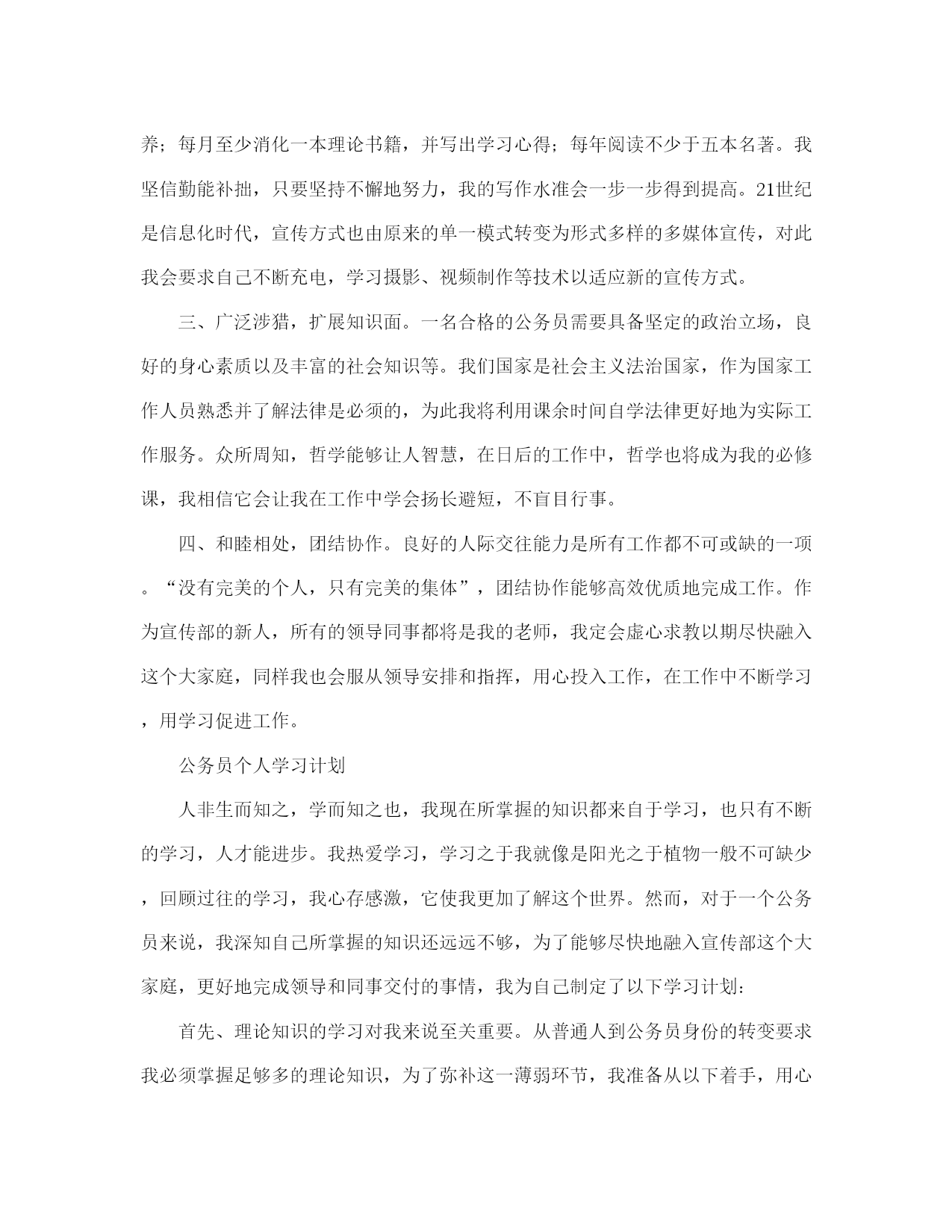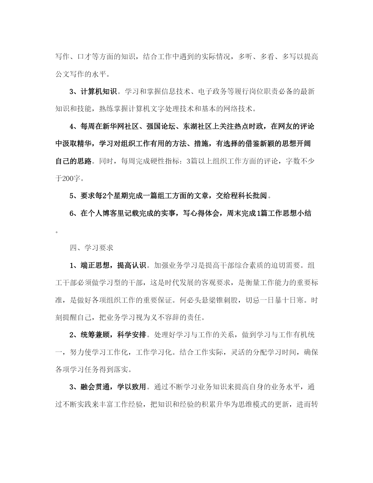 公务员干部个人学习计划范本(完整版)文档资料可直接使用,可编辑,欢迎下载公务员干部个人学习计划一、学习目标提高自身政治理论水平,增强政治敏锐性;加强组工业务知识的学习,提高工作能力和效率,在写作上更进一步。二、学习时间1、周一至周五,上班时在不影响业务工作的情况下,利用一切可利用的时间学习。每天晚上7:00—8:00,学习1个小时。2、周六、周日,学习5个小时。4、每星期利用网络资源,上网学习个2小时。5、每天用半个小时阅读当天报纸、杂志,了解国内外的重大新闻、政策形势,提高自己的政策理论水平。三、学习任务1、政治理论。通过观看新闻联播,阅读黄冈日报、湖北日报、中国青年报、党员生活等报刊杂志,学习马列主义、毛泽东思想、邓小平理论和“三个代表”重要思想及其一系列重要论述,和这些理论在各地方的实际应用,深刻领会其精神实质,用先进的理论指导自己的工作实践。“好记性不如烂笔头”,坚持边看边想,边想边写。每月完成读书笔记字数不少于5000字。2、业务知识。充分利用组织部的资源,学习《党章》、《党内监督条例》、《党员处分条例》、《干部任用条例》、《公务员法》、《组织法》、《行政许可法》、《宪法》等法律法规,努力提高工作水平、工作能力和法律意识。学习公文写作、口才等方面的知识,结合工作中遇到的实际情况,多听、多看、多写以提高公文写作的水平。3、计算机知识。学习和掌握信息技术、电子政务等履行岗位职责必备的最新知识和技能,熟练掌握计算机文字处理技术和基本的网络技术。4、每周在新华网社区、强国论坛、东湖社区上关注热点时政,在网友的评论中汲取精华,学习对组织工作有用的方法、措施,有选择的借鉴新颖的思想开阔自己的思路。同时,每周完成硬性指标:3篇以上组织工作方面的评论,字数不少于200字。5、要求每2个星期完成一篇组工方面的文章,交给程科长批阅。6、在个人博客里记载完成的实事,写心得体会,周末完成1篇工作思想小结。四、学习要求1、端正思想,提高认识。加强业务学习是提高干部综合素质的迫切需要。组工干部必须做学习型的干部,这是时代发展的客观要求,是衡量工作能力的重要标准,是做好各项组织工作的重要保证。何必头悬梁锥刺股,切忌一日暴十日寒。时刻提醒自己,把业务学习视为义不容辞的责任。2、统筹兼顾,科学安排。处理好学习与工作的关系,做到学习与工作有机统一,努力使学习工作化,工作学习化。结合工作实际,灵活的分配学习时间,确保各项学习任务得到落实。3、融会贯通,学以致用。通过不断学习业务知识来提高自身的业务水平,通过不断实践来丰富工作经验,把知识和经验的积累升华为思维模式的更新,进而转化为工作创新的源泉和动力。通过学习,有效解决在组织工作中存在的问题,真正使思想有明显提高,作风有明显转变,工作有明显推进。本学习计划从制定之日开始实行。敬请监督。公务员干部个人为了响应党中央建设“学习型政府”的要求,也为了不断完善自我,适应当前工作的需要,更新自己的知识层次和政治理论水平,与时俱进,努力提高自己的综合素质,做一名学习型的组工干部,特制订学习计划如下:一、学习目标提高自身政治理论水平,增强政治敏锐性;加强组工业务知识的学习,提高工作能力和效率,在写作上更进一步。二、学习时间1、周一至周五,上班时在不影响业务工作的情况下,利用一切可利用的时间学习。每天晚上7:00—8:00,学习1个小时。2、周六、周日,学习5个小时。4、每星期利用网络资源,上网学习个2小时。5、每天用半个小时阅读当天报纸、杂志,了解国内外的重大新闻、政策形势,提高自己的政策理论水平。三、学习任务1、政治理论。通过观看新闻联播,阅读黄冈日报、湖北日报、中国青年报、党员生活等报刊杂志,学习马列主义、毛泽东思想、邓小平理论和“三个代表”重要思想及其一系列重要论述,和这些理论在各地方的实际应用,深刻领会其精神实质,用先进的理论指导自己的工作实践。“好记性不如烂笔头”,坚持边看边想,边想边写。每月完成读书笔记字数不少于5000字。2、业务知识。充分利用组织部的资源,学习《党章》、《党内监督条例》、《党员处分条例》、《干部任用条例》、《公务员法》、《组织法》、《行政许可法》、《宪法》等法律法规,努力提高工作水平、工作能力和法律意识。学习公文写作、口才等方面的知识,结合工作中遇到的实际情况,多听、多看。3、计算机知识。学习和掌握信息技术、电子政务等履行岗位职责必备的最新知识和技能,熟练掌握计算机文字处理技术和基本的网络技术。4、每周在新华网社区、强国论坛、东湖社区上关注热点时政,在网友的评论中汲取精华,学习对组织工作有用的方法、措施,有选择的借鉴新颖的思想开阔自己的思路。同时,每周完成硬性指标:3篇以上组织工作方面的评论,字数不少于200字。