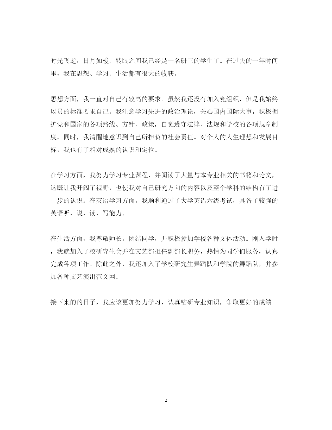 此资料由网络收集而来,如有侵权请告知上传者立即删除。资料共分享,我们负责传递知识。PAGEPAGE2研究生学年度自我总结自我总结是一种自我提升的机会,让我们能够明确知道自己缺点与不足。我们每一个人都要懂得去写去总结。下面是小编搜集整理的研究生学年度自我总结,欢迎阅读。更多资讯尽在自我总结栏目!研究生学年度自我总结本科毕业到走入研究生的教室,再由研究生的教育中走进社会,虽然短短几年,却是我人生中最大的财富,它将伴随着我的一生,渲染着我的思想,引导给我方向,传递给我力量。在进入研究生学习之前,我就暗自下定决心,要把握住任何机会锻炼自己,多积累实践经验和教训。思想上,我在本科期间已经成为了正式党员,于是在研究生学习期间不断帮助其他同学入党,无论是学习“三个代表”活动,还是党支部组织的趣味运动会,我都积极参与,争取为班争光,起表率带头作用。学习上,在LCF导师的教导下,深入研究了石家庄市科技局的基金项目——石家庄市企业自主创新能力建设研究,通过各位老师的帮助和自己的努力,项目进行有条不紊,指标设计有效,提出的对策建议切实可行。在此期间,我的学术研究水平得到了提高,经济学和管理学知识十分融洽地结合,达到了提高自我素质、深入社会实践的目的。在今后的社会生活中,会面临更大的挑战和机遇,我已经做好了准备,迎头而上。我会继续学习,不断进取,勇于开拓,直视困难,校正缺点,实现更高的社会价值。研究生学年度自我总结时光飞逝,日月如梭。转眼之间我已经是一名研三的学生了。在过去的一年时间里,我在思想、学习、生活都有很大的收获。思想方面,我一直对自己有较高的要求。虽然我还没有加入党组织,但是我始终以员的标准要求自己。我注意学习先进的政治理论,关心国内国际大事,积极拥护党和国家的各项路线、方针、政策,自觉遵守法律、法规和学校的各项规章制度。同时,我清醒地意识到自己所担负的社会责任。对个人的人生理想和发展目标,我也有了相对成熟的认识和定位。在学习方面,我努力学习专业课程,并阅读了大量与本专业相关的书籍和论文,这既让我开阔了视野,也使我对自己研究方向的内容以及整个学科的结构有了进一步的认识。在英语学习方面,我顺利通过了大学英语六级考试,具备了较强的英语听、说、读、写能力。在生活方面,我尊敬师长,团结同学,并积极参加学校各种文体活动。刚入学时,我就加入了校研究生会并在文艺部担任副部长职务,热情为同学们服务,认真完成各项工作。除此之外,我还加入了学校研究生舞蹈队和学院的舞蹈队,并参加各种文艺演出范文网。接下来的的日子,我应该更加努力学习,认真钻研专业知识,争取更好的成绩