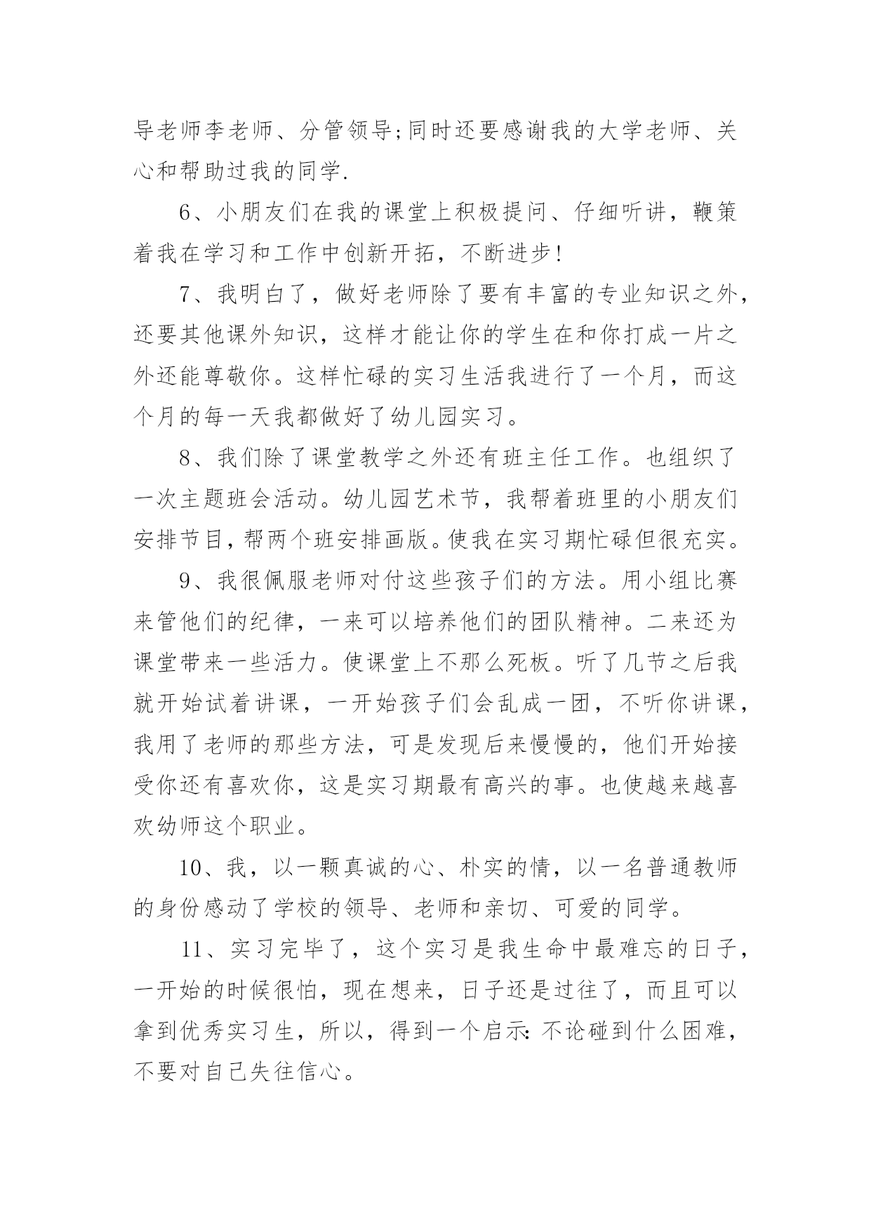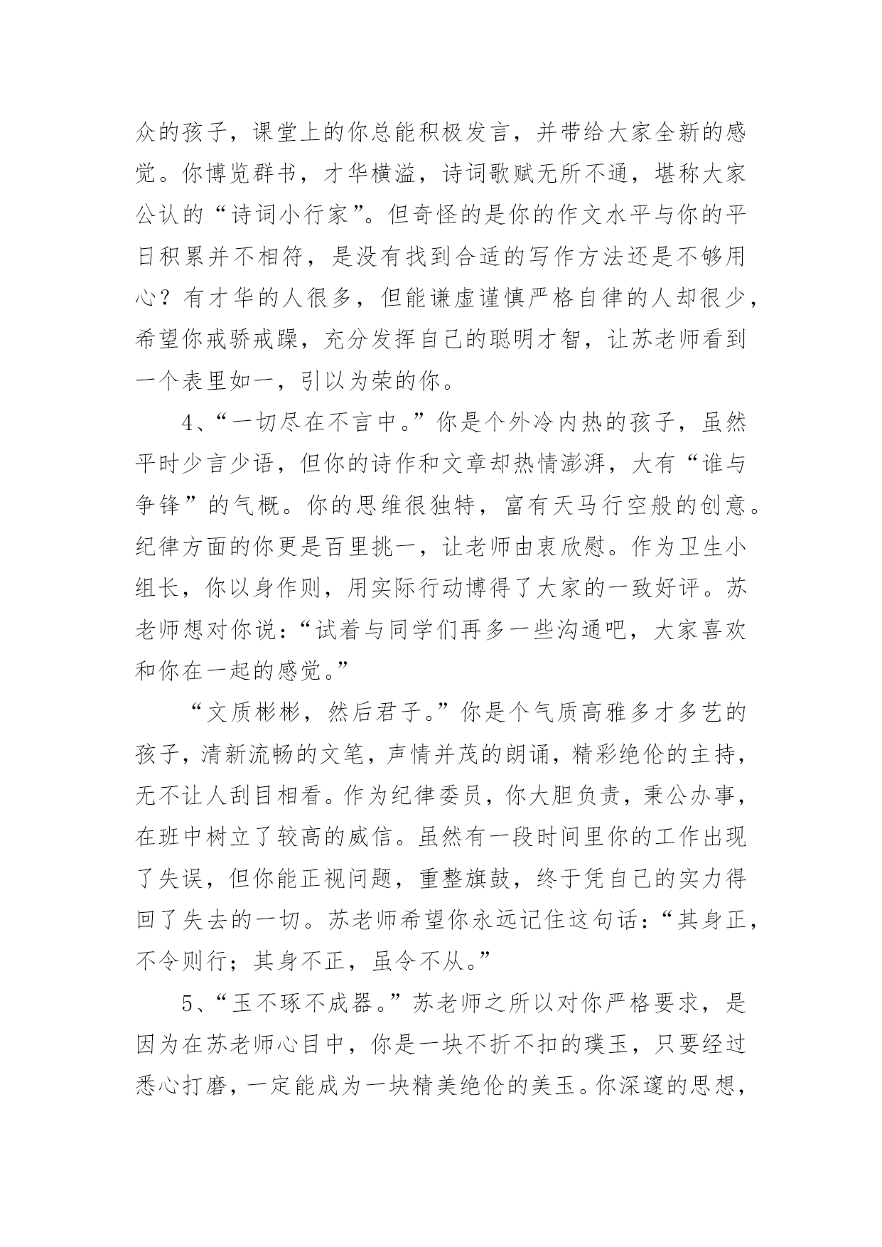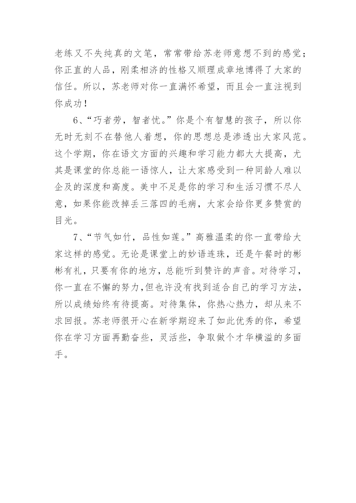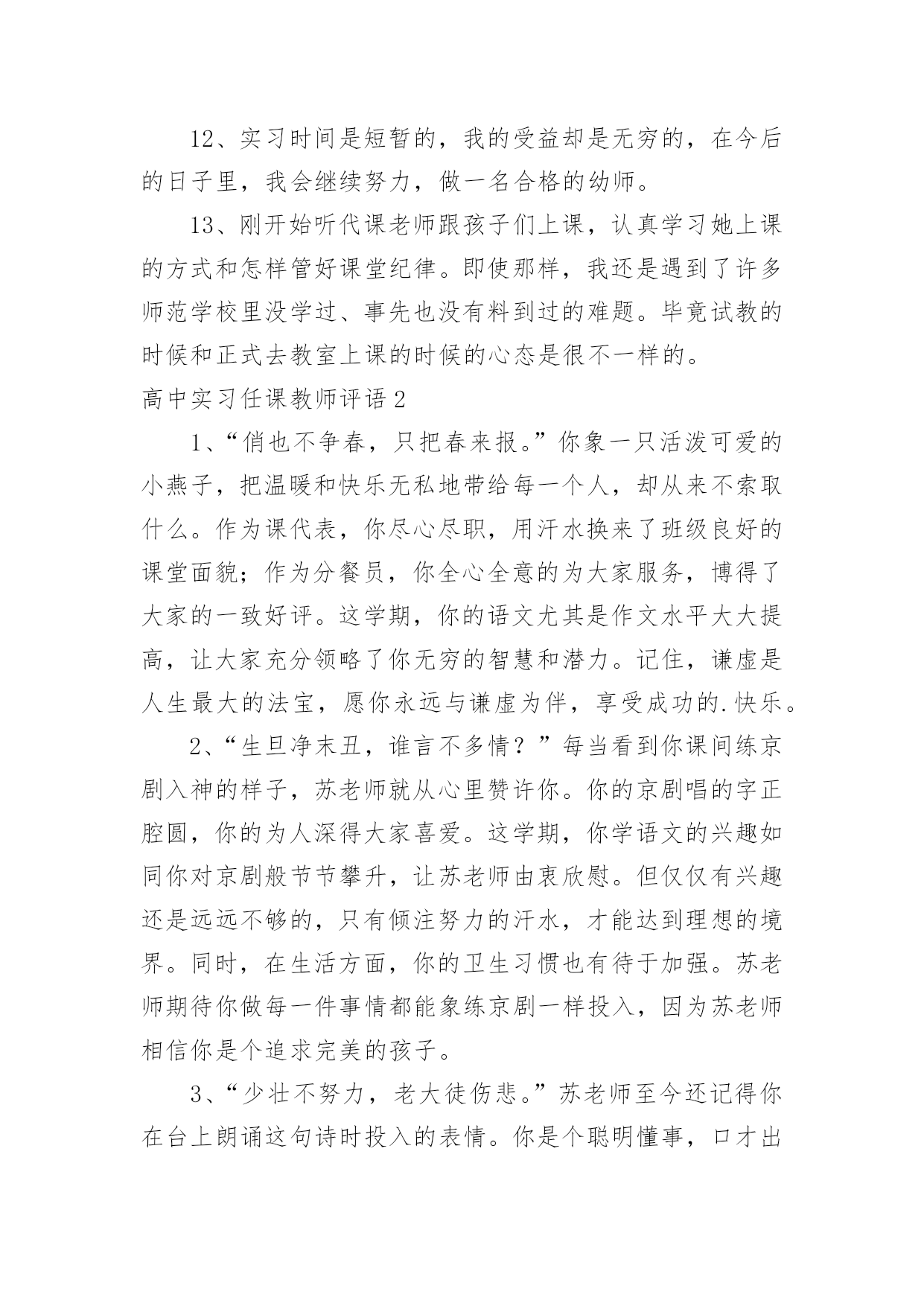 高中实习任课教师评语在生活、工作和学习中,大家总免不了要接触或使用评语吧,评语的内容包括被考评者的工作业绩、工作表现、优缺点和需努力的方向。相信许多人会觉得评语很难写吧,以下是小编为大家整理的高中实习任课教师评语,希望能够帮助到大家。高中实习任课教师评语11、这个时候才知道,其实幼师还是很好当的,只要你用正心态去对待。就在这样忙碌的实习生活里,一年也就这样过去了。这一年经历的每一天,都已在我心中留下。2、在这一个月里,我学习到许多在学校学不到的东西.也感悟到了许多,从老师们身上,我看到了园丁们散发出的耀眼光芒,给了我在实习生活带来了许多启发性思维。3、在这些天的实习中,我受益匪浅,让我有机会将理论与实践有机地结合起来。站在教育的最前线,面对一双双求知的眼睛,心中倍感任重而道远。我一定要不断努力学习,做一位勤劳的园丁,把祖国的花朵浇灌得更加艳丽。幼师实习鉴定范文4、在校期间总会认为当一名幼儿老师肯定很好玩,很轻松,但在这里我改变了这个想法,每上完一节课我都有最大的感触:想当好一名幼儿老师实在不易!5、在此,我衷心的向他们表示感谢,特别感谢我的指导老师李老师、分管领导;同时还要感谢我的大学老师、关心和帮助过我的同学.6、小朋友们在我的课堂上积极提问、仔细听讲,鞭策着我在学习和工作中创新开拓,不断进步!7、我明白了,做好老师除了要有丰富的专业知识之外,还要其他课外知识,这样才能让你的学生在和你打成一片之外还能尊敬你。这样忙碌的实习生活我进行了一个月,而这个月的每一天我都做好了幼儿园实习。8、我们除了课堂教学之外还有班主任工作。也组织了一次主题班会活动。幼儿园艺术节,我帮着班里的小朋友们安排节目,帮两个班安排画版。使我在实习期忙碌但很充实。9、我很佩服老师对付这些孩子们的方法。用小组比赛来管他们的纪律,一来可以培养他们的团队精神。二来还为课堂带来一些活力。使课堂上不那么死板。听了几节之后我就开始试着讲课,一开始孩子们会乱成一团,不听你讲课,我用了老师的那些方法,可是发现后来慢慢的,他们开始接受你还有喜欢你,这是实习期最有高兴的事。也使越来越喜欢幼师这个职业。10、我,以一颗真诚的心、朴实的情,以一名普通教师的身份感动了学校的领导、老师和亲切、可爱的同学。11、实习完毕了,这个实习是我生命中最难忘的日子,一开始的时候很怕,现在想来,日子还是过往了,而且可以拿到优秀实习生,所以,得到一个启示:不论碰到什么困难,不要对自己失往信心。12、实习时间是短暂的,我的受益却是无穷的,在今后的日子里,我会继续努力,做一名合格的幼师。13、刚开始听代课老师跟孩子们上课,认真学习她上课的方式和怎样管好课堂纪律。即使那样,我还是遇到了许多师范学校里没学过、事先也没有料到过的难题。毕竟试教的时候和正式去教室上课的时候的心态是很不一样的。高中实习任课教师评语21、“俏也不争春,只把春来报。”你象一只活泼可爱的小燕子,把温暖和快乐无私地带给每一个人,却从来不索取什么。作为课代表,你尽心尽职,用汗水换来了班级良好的课堂面貌;作为分餐员,你全心全意的为大家服务,博得了大家的一致好评。这学期,你的语文尤其是作文水平大大提高,让大家充分领略了你无穷的智慧和潜力。记住,谦虚是人生最大的法宝,愿你永远与谦虚为伴,享受成功的.快乐。2、“生旦净末丑,谁言不多情?”每当看到你课间练京剧入神的样子,苏老师就从心里赞许你。你的京剧唱的字正腔圆,你的为人深得大家喜爱。这学期,你学语文的兴趣如同你对京剧般节节攀升,让苏老师由衷欣慰。但仅仅有兴趣还是远远不够的,只有倾注努力的汗水,才能达到理想的境界。同时,在生活方面,你的卫生习惯也有待于加强。苏老师期待你做每一件事情都能象练京剧一样投入,因为苏老师相信你是个追求完美的孩子。3、“少壮不努力,老大徒伤悲。”苏老师至今还记得你在台上朗诵这句诗时投入的表情。你是个聪明懂事,口才出众的孩子,课堂上的你总能积极发言,并带给大家全新的感觉。你博览群书,才华横溢,诗词歌赋无所不通,堪称大家公认的“诗词小行家”。但奇怪的是你的作文水平与你的平日积累并不相符,是没有找到合适的写作方法还是不够用心?有才华的人很多,但能谦虚谨慎严格自律的人却很少,希望你戒骄戒躁,充分发挥自己的聪明才智,让苏老师看到一个表里如一,引以为荣的你。4、“一切尽在不言中。”你是个外冷内热的孩子,虽然平时少言少语,但你的诗作和文章却热情澎湃,大有“谁与争锋”的气概。你的思维很独特,富有天马行空般的创意。纪律方面的你更是百里挑一,让老师由衷欣慰。作为卫生小组长,你以身作则,用实际行动博得了大家的一致好评。苏老师想对你说:“试着与同学们再多一些沟通吧,大家喜欢和你在一起的感觉。”“文质彬彬,然后君子。”你是个气质高雅多才多艺的孩子,清新流畅的文笔,声情并茂的朗诵,精彩绝伦的主持,无不