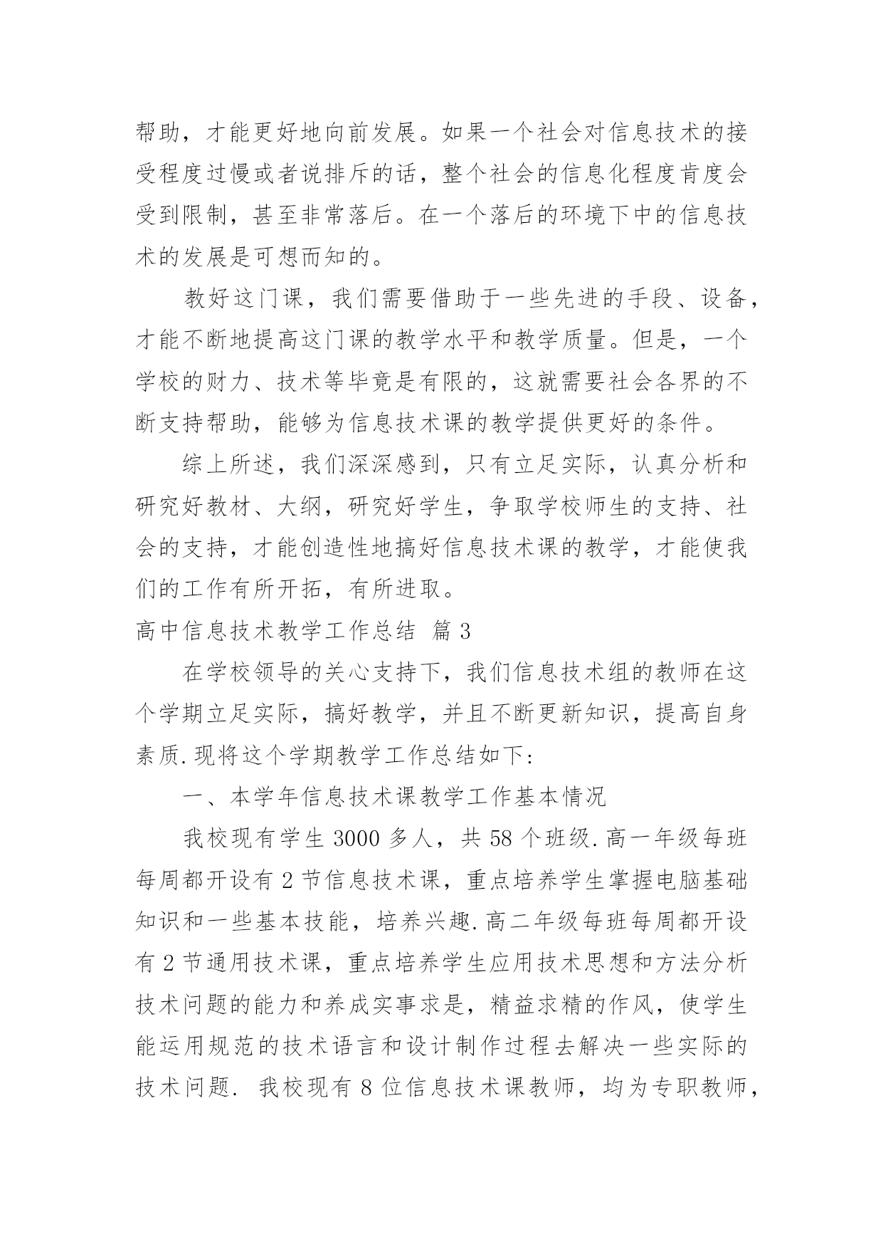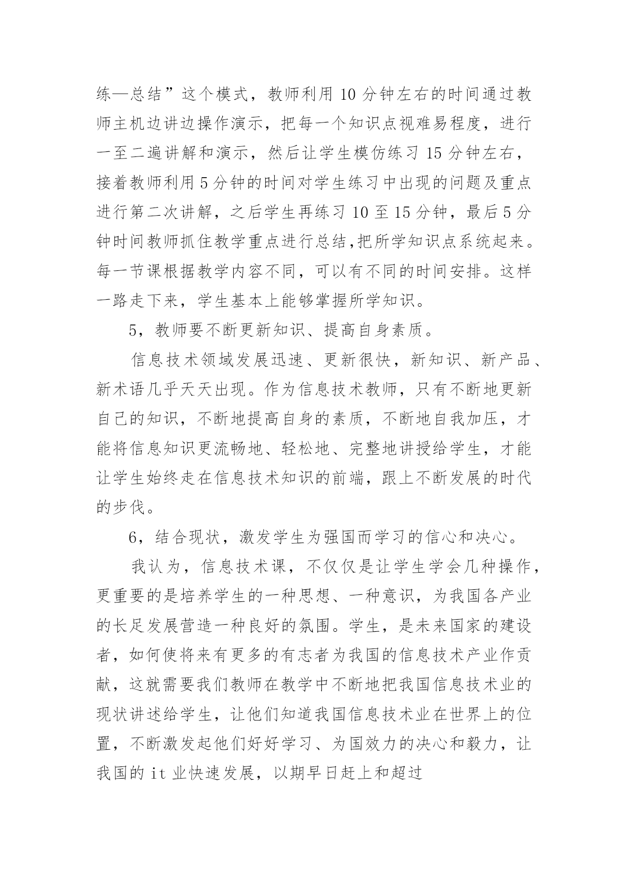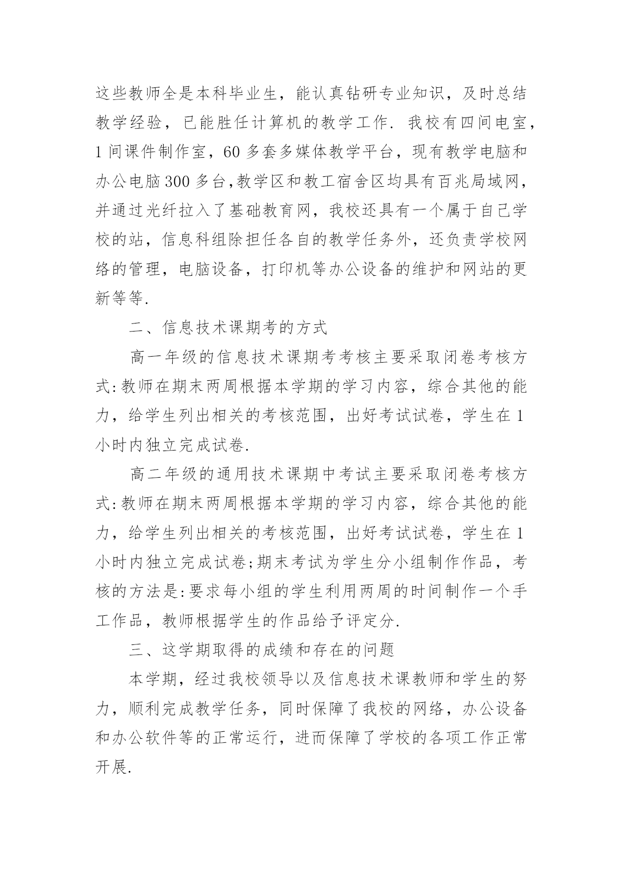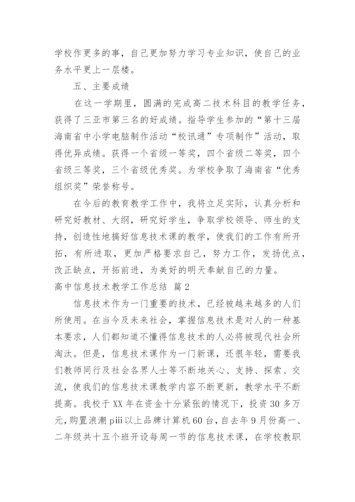 高中信息技术教学工作总结高中信息技术教学工作总结集锦5篇总结是指社会团体、企业单位和个人在自身的某一时期、某一项目或某些工作告一段落或者全部完成后进行回顾检查、分析评价,从而肯定成绩,得到经验,找出差距,得出教训和一些规律性认识的一种书面材料,它能够给人努力工作的动力,快快来写一份总结吧。那么总结要注意有什么内容呢?下面是小编精心整理的高中信息技术教学工作总结5篇,仅供参考,欢迎大家阅读。高中信息技术教学工作总结篇1本学期我担任四个班的信息技术和通用技术教学工作,尽管开始一周12节课,但通用和信息的交替教学还是让人觉得疲惫,好在期中考试后,为了更好的迎接会考,调整战略,一位老师专教信息另一位专教通用。一个学年的工作眨眼就结束了,收获不少,下面我对本学年的工作作一总结,为新学年的工作确立新的目标。一、思想认识我在思想上严于律己,严格要求自己,鞭策自己,力争思想上和工作上在同事、学生的心目中都树立起榜样的作用。积极参加学校组织的各项政治活动。一学期来,我服从学校的工作安排,配合领导和老师们做好校内外的各项工作。我相信在以后的工作学习中,我会通过自己的努力,克服缺点,取得更大的进步。我将更加努力工作,勤学苦练,使自己真正成为一个经受得起任何考验的人民教师。二、教学工作在教学工作方面,担任高二4个班级的信息技术和通用技术课,我坚持经常看电脑报、信息技术奥赛书籍等,还经常网上找一些优秀的教案课件学习,还争取机会多出外听课,从中学习别人的长处,领悟其中的教学艺术。平时还虚心请教有经验的老师。在备课过程中认真分析教材,根据教材的特点及学生的实际情况设计教案。一学期来,认真备课、上课、听课、评课,并做好课后辅导工作,广泛涉猎各种知识,形成比较完整的知识结构,严格要求学生,尊重学生,发扬教学民主,使学生学有所得,不断提高,从而不断提高自己的教学水平和思想觉悟,并顺利完成教育教学任务。三、学校工作我严格要求自己,工作实干,并能完成学校给予的各项任务。由于我们是信息技术教师,这个特殊的职业决定了我们必须还有很多的学校工作要做,我服从党和学校领导的安排,兢兢业业,完成了信息技术教研组的各项任务。在以后的工作,我将一如既往,脚踏实地,我会更加积极地配合学校领导完成各项任务,为学校的美好明天更加努力。四、考勤方面我在做好各项教育教学工作的同时,严格遵守学校的各项规章制度。处理好学校工作与个人之间的关系,一个学年里没有缺席过一次,一边完成学校的各项任务,一边准备教材和学习自己的专业知识。在新学期中,我将更加勤恳,为学校作更多的事,自己更加努力学习专业知识,使自己的业务水平更上一层楼。五、主要成绩在这一学期里,圆满的完成高二技术科目的教学任务,获得了三亚市第三名的好成绩。指导学生参加的“第十三届海南省中小学电脑制作活动“校讯通”专项制作”活动,取得优异成绩。获得一个省级一等奖,四个省级二等奖,四个省级三等奖,三个省级优秀奖。为学校争取了海南省“优秀组织奖”荣誉称号。在今后的教育教学工作中,我将立足实际,认真分析和研究好教材、大纲,研究好学生,争取学校领导、师生的支持,创造性地搞好信息技术课的教学,使我们的工作有所开拓,有所进取,更加严格要求自己,努力工作,发扬优点,改正缺点,开拓前进,为美好的明天奉献自己的力量。高中信息技术教学工作总结篇2信息技术作为一门重要的技术,已经被越来越多的人们所使用。在当今及未来社会,掌握信息技术是对人的一种基本要求,人们都知道不懂得信息技术的人必将被现代社会所淘汰。但是,信息技术课作为一门新课,还很年轻,需要我们教师同行及社会各界人士等不断地关心、支持、探索、交流,使我们的信息技术课教学内容不断更新,教学水平不断提高。我校于XX年在资金十分紧张的情况下,投资30多万元,购置浪潮pⅲ以上品牌计算机60台,自去年9月份高一、二年级共十五个班开设每周一节的信息技术课,在学校教职员工的大力支持下,取得了可喜的成绩。以下就是我在一年来的信息技术课教学中的一点感受、体会和总结。一、立足实际、搞好教学。怎样让一个从未接触过信息技术知识的学生,熟练地掌握最基本的知识,这是开始上课前首先思考的问题。也是教学研究的第一个课题。1、揭开神秘的面纱。对学生来说,信息技术课是一个陌生学科,大多学生有很大的神秘感。首先我们注意帮助学生揭开“信息技术”这个神秘的面纱,让学生沿着正确的轨道去汲取新鲜的知识。这样我们从开始的教学中首先把信息技术从“原始——>先进”的发展过程给学生讲清,让学生了解到信息技术不是才有的,而是早就存在的,只是没有明确提出。从理解简单落后的信息技术,上升到了解当今最先进的信息技术。这样学生便从思想上对什么是信息技术有了占领深刻的认识。攻破了这一难题,顺理成章地过渡到了处理信息的手段或者工具。我们也是从处理信息的`原始工具讲起,逐渐讲