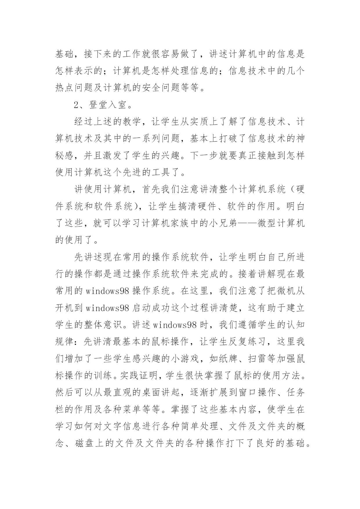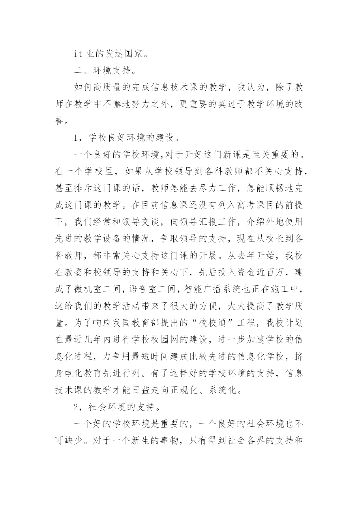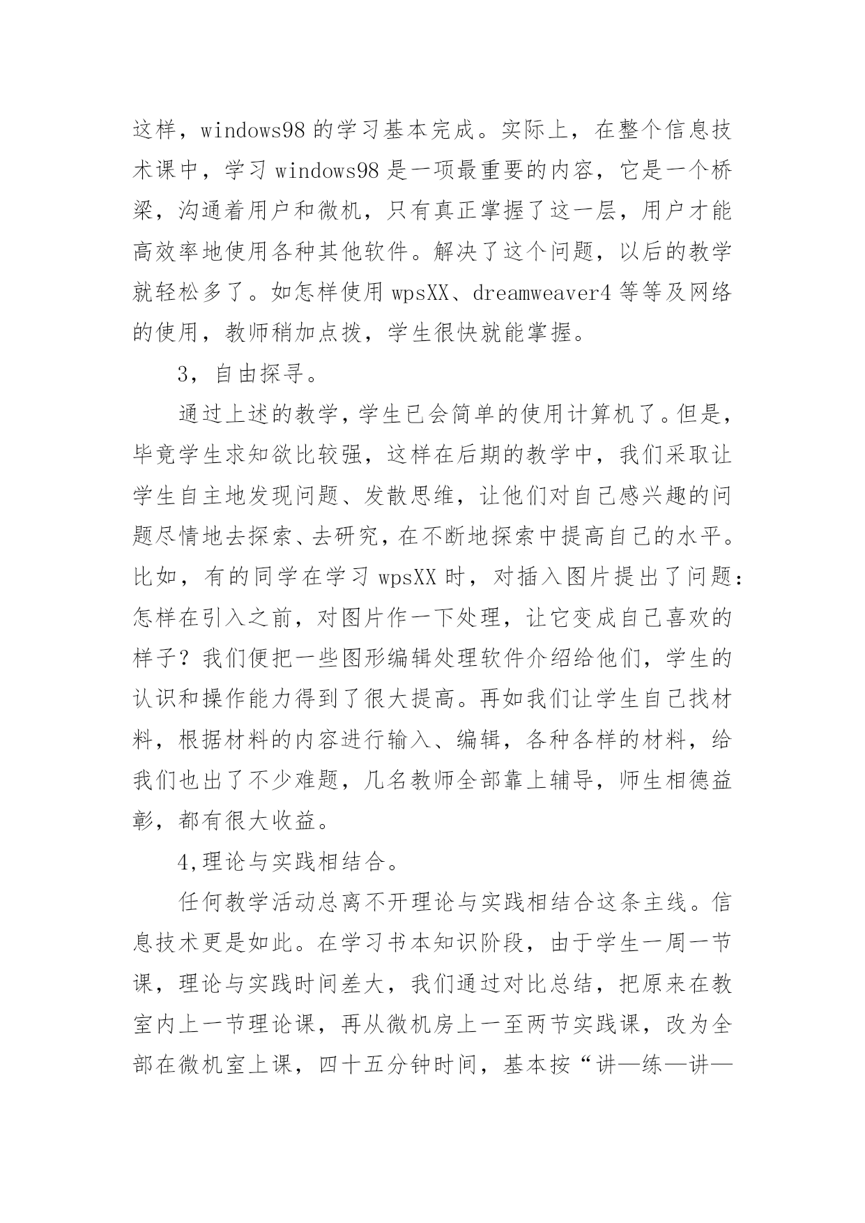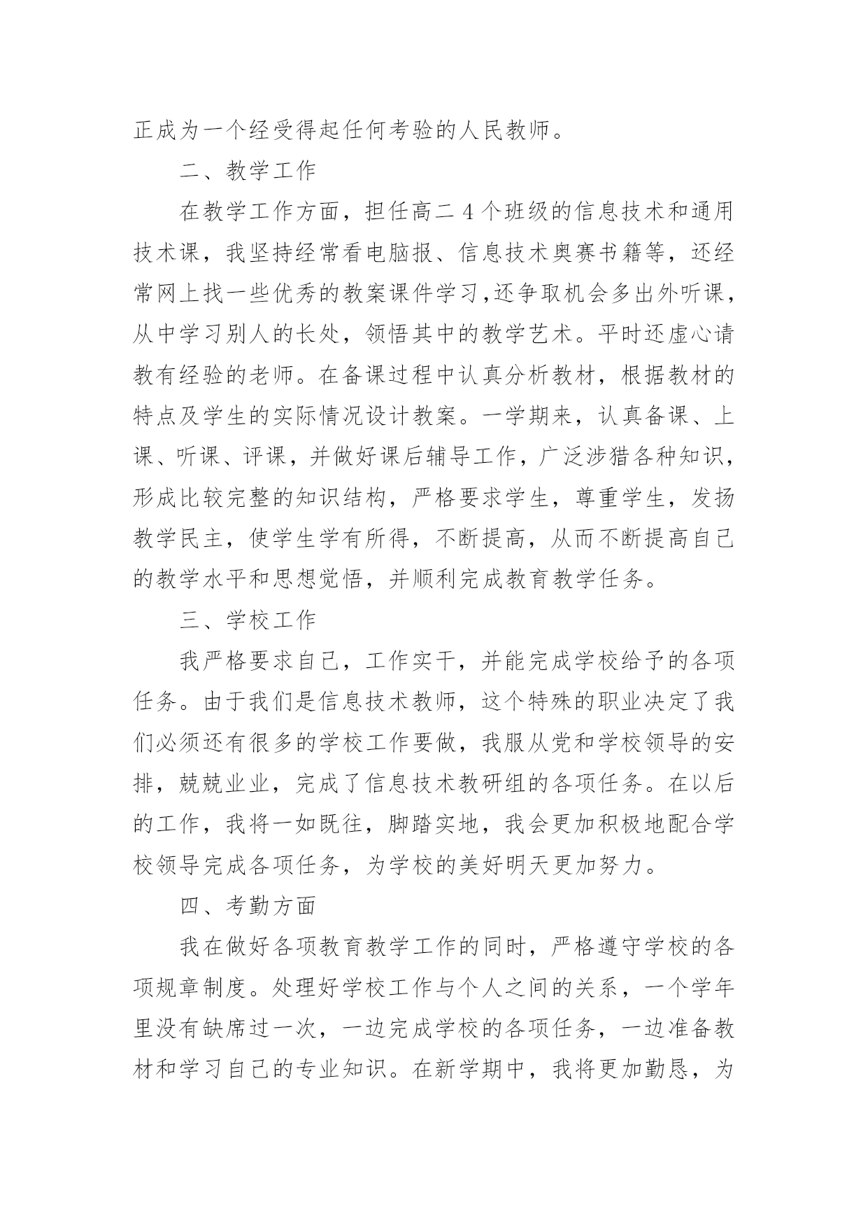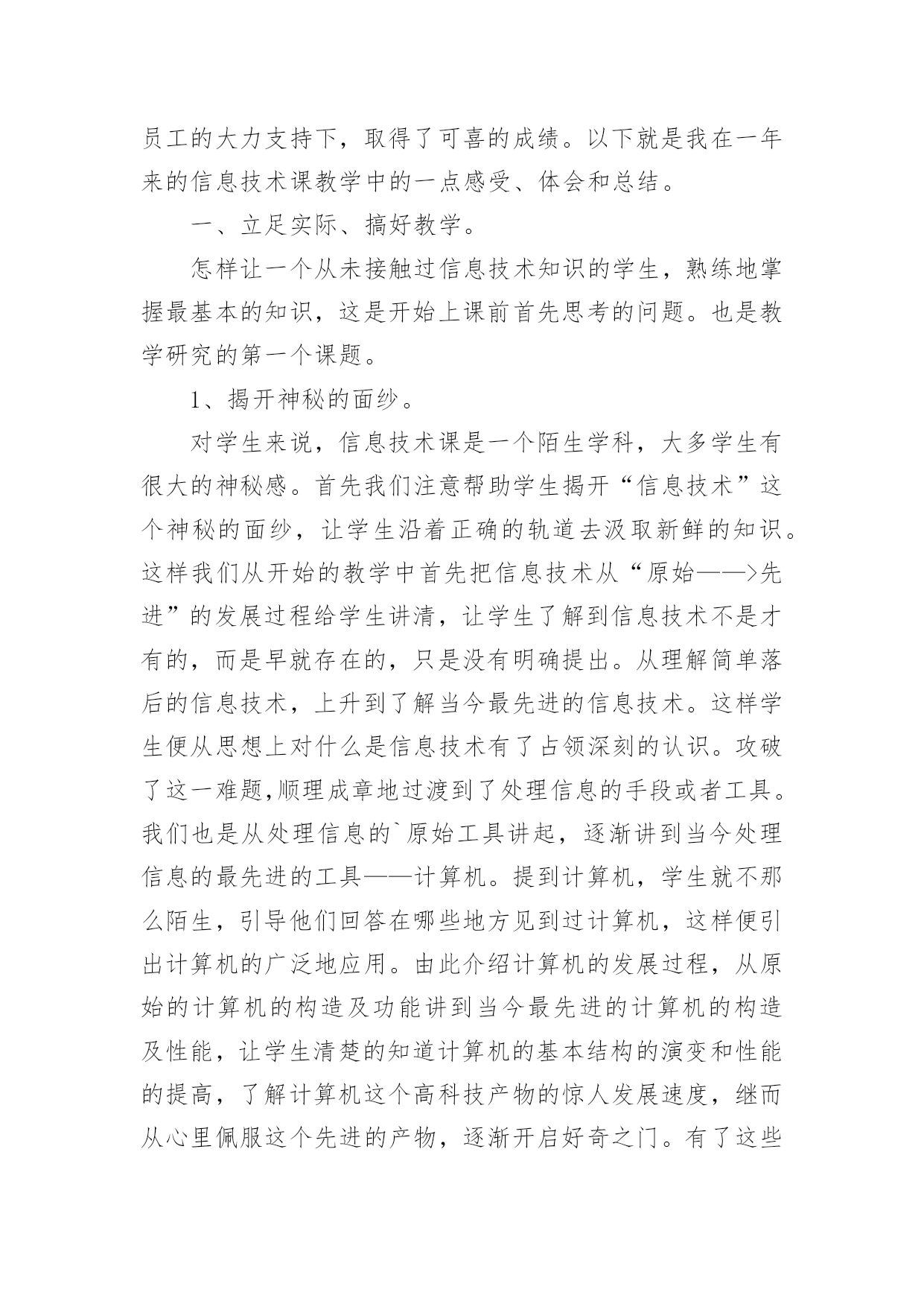 高中信息技术教学工作总结高中信息技术教学工作总结集锦5篇总结是指社会团体、企业单位和个人在自身的某一时期、某一项目或某些工作告一段落或者全部完成后进行回顾检查、分析评价,从而肯定成绩,得到经验,找出差距,得出教训和一些规律性认识的一种书面材料,它能够给人努力工作的动力,快快来写一份总结吧。那么总结要注意有什么内容呢?下面是小编精心整理的高中信息技术教学工作总结5篇,仅供参考,欢迎大家阅读。高中信息技术教学工作总结篇1本学期我担任四个班的信息技术和通用技术教学工作,尽管开始一周12节课,但通用和信息的交替教学还是让人觉得疲惫,好在期中考试后,为了更好的迎接会考,调整战略,一位老师专教信息另一位专教通用。一个学年的工作眨眼就结束了,收获不少,下面我对本学年的工作作一总结,为新学年的工作确立新的目标。一、思想认识我在思想上严于律己,严格要求自己,鞭策自己,力争思想上和工作上在同事、学生的心目中都树立起榜样的作用。积极参加学校组织的各项政治活动。一学期来,我服从学校的工作安排,配合领导和老师们做好校内外的各项工作。我相信在以后的工作学习中,我会通过自己的努力,克服缺点,取得更大的进步。我将更加努力工作,勤学苦练,使自己真正成为一个经受得起任何考验的人民教师。二、教学工作在教学工作方面,担任高二4个班级的信息技术和通用技术课,我坚持经常看电脑报、信息技术奥赛书籍等,还经常网上找一些优秀的教案课件学习,还争取机会多出外听课,从中学习别人的长处,领悟其中的教学艺术。平时还虚心请教有经验的老师。在备课过程中认真分析教材,根据教材的特点及学生的实际情况设计教案。一学期来,认真备课、上课、听课、评课,并做好课后辅导工作,广泛涉猎各种知识,形成比较完整的知识结构,严格要求学生,尊重学生,发扬教学民主,使学生学有所得,不断提高,从而不断提高自己的教学水平和思想觉悟,并顺利完成教育教学任务。三、学校工作我严格要求自己,工作实干,并能完成学校给予的各项任务。由于我们是信息技术教师,这个特殊的职业决定了我们必须还有很多的学校工作要做,我服从党和学校领导的安排,兢兢业业,完成了信息技术教研组的各项任务。在以后的工作,我将一如既往,脚踏实地,我会更加积极地配合学校领导完成各项任务,为学校的美好明天更加努力。四、考勤方面我在做好各项教育教学工作的同时,严格遵守学校的各项规章制度。处理好学校工作与个人之间的关系,一个学年里没有缺席过一次,一边完成学校的各项任务,一边准备教材和学习自己的专业知识。在新学期中,我将更加勤恳,为学校作更多的事,自己更加努力学习专业知识,使自己的业务水平更上一层楼。五、主要成绩在这一学期里,圆满的完成高二技术科目的教学任务,获得了三亚市第三名的好成绩。指导学生参加的“第十三届海南省中小学电脑制作活动“校讯通”专项制作”活动,取得优异成绩。获得一个省级一等奖,四个省级二等奖,四个省级三等奖,三个省级优秀奖。为学校争取了海南省“优秀组织奖”荣誉称号。在今后的教育教学工作中,我将立足实际,认真分析和研究好教材、大纲,研究好学生,争取学校领导、师生的支持,创造性地搞好信息技术课的教学,使我们的工作有所开拓,有所进取,更加严格要求自己,努力工作,发扬优点,改正缺点,开拓前进,为美好的明天奉献自己的力量。高中信息技术教学工作总结篇2信息技术作为一门重要的技术,已经被越来越多的人们所使用。在当今及未来社会,掌握信息技术是对人的一种基本要求,人们都知道不懂得信息技术的人必将被现代社会所淘汰。但是,信息技术课作为一门新课,还很年轻,需要我们教师同行及社会各界人士等不断地关心、支持、探索、交流,使我们的信息技术课教学内容不断更新,教学水平不断提高。我校于XX年在资金十分紧张的情况下,投资30多万元,购置浪潮pⅲ以上品牌计算机60台,自去年9月份高一、二年级共十五个班开设每周一节的信息技术课,在学校教职员工的大力支持下,取得了可喜的成绩。以下就是我在一年来的信息技术课教学中的一点感受、体会和总结。一、立足实际、搞好教学。怎样让一个从未接触过信息技术知识的学生,熟练地掌握最基本的知识,这是开始上课前首先思考的问题。也是教学研究的第一个课题。1、揭开神秘的面纱。对学生来说,信息技术课是一个陌生学科,大多学生有很大的神秘感。首先我们注意帮助学生揭开“信息技术”这个神秘的面纱,让学生沿着正确的轨道去汲取新鲜的知识。这样我们从开始的教学中首先把信息技术从“原始——>先进”的发展过程给学生讲清,让学生了解到信息技术不是才有的,而是早就存在的,只是没有明确提出。从理解简单落后的信息技术,上升到了解当今最先进的信息技术。这样学生便从思想上对什么是信息技术有了占领深刻的认识。攻破了这一难题,顺理成章地过渡到了处理信息的手段或者工具。我们也是从处理信息的`原始工具讲起,逐渐讲
