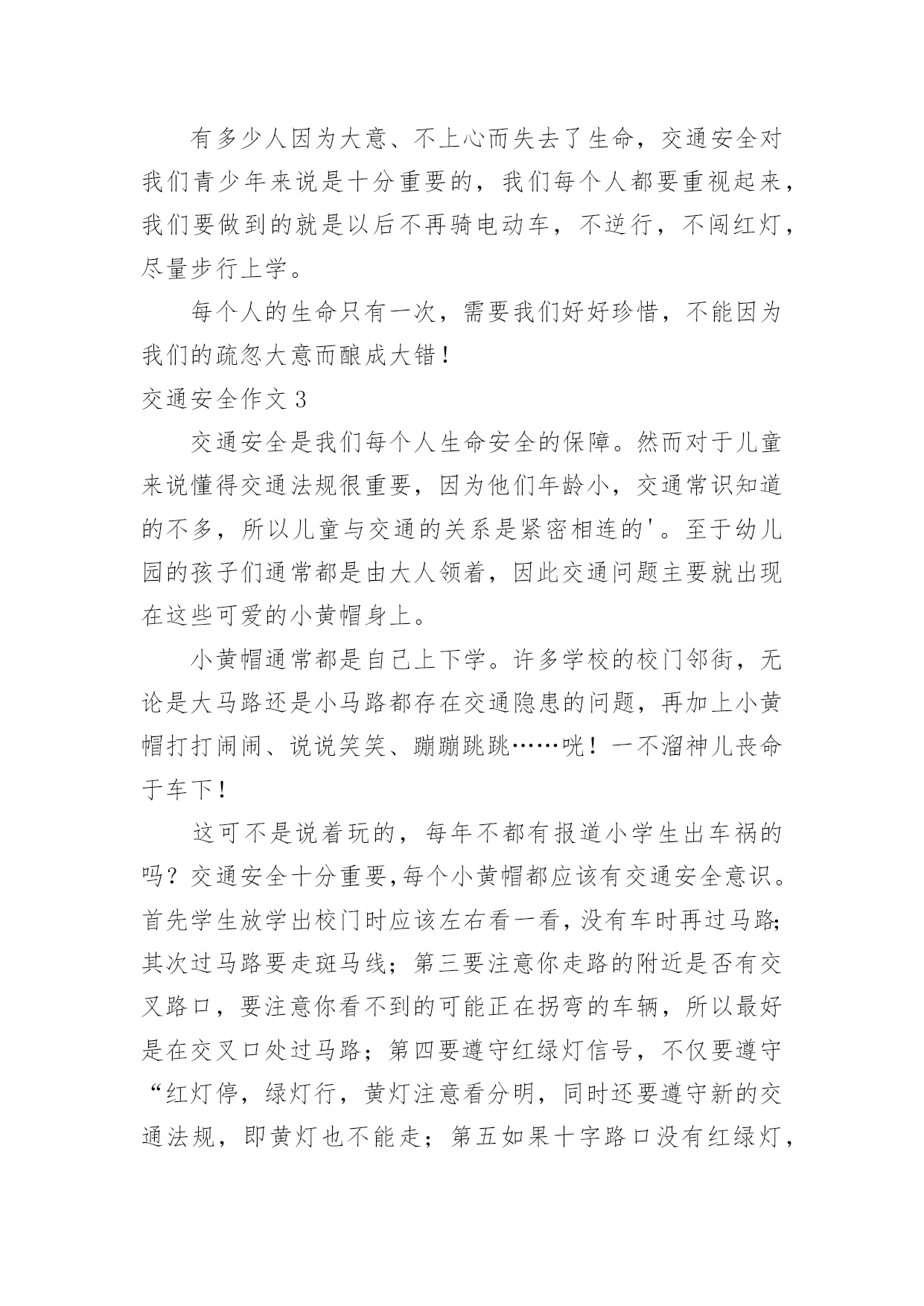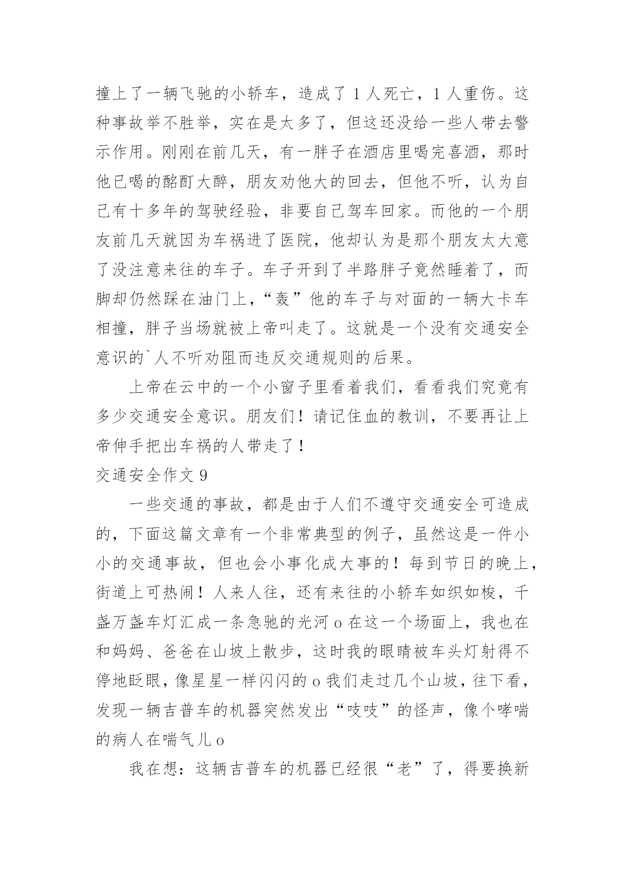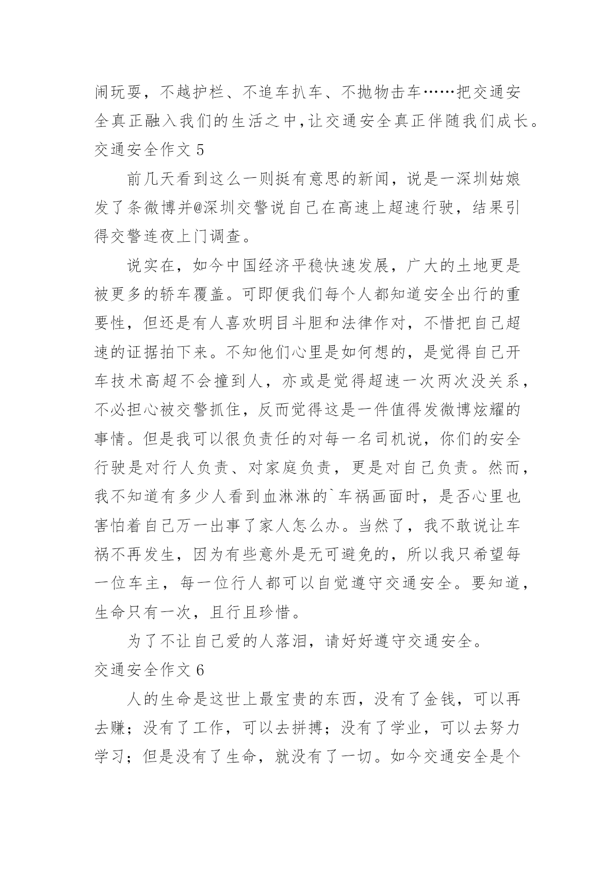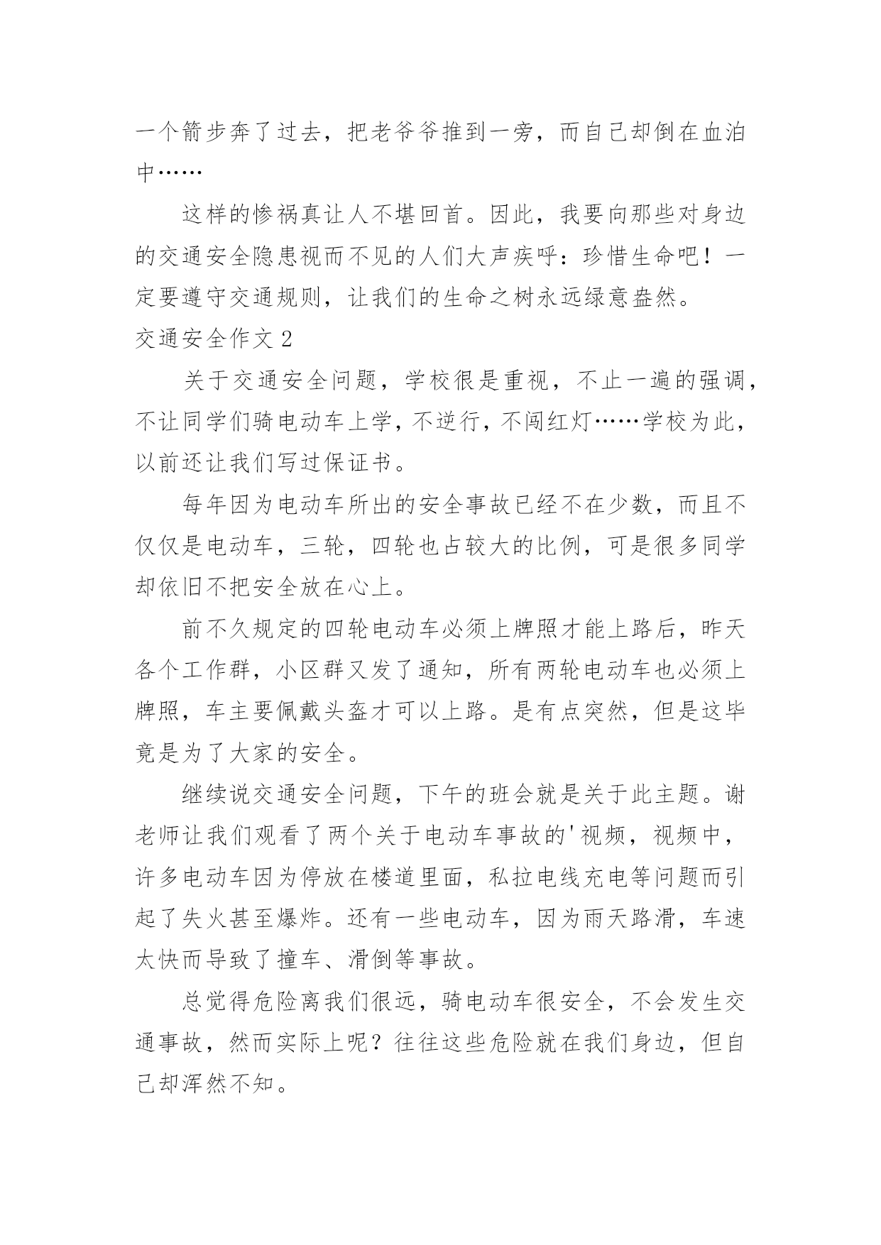 交通安全作文交通安全作文范例(15篇)在平凡的学习、工作、生活中,大家总少不了接触作文吧,借助作文人们可以实现文化交流的目的。怎么写作文才能避免踩雷呢?下面是小编精心整理的交通安全作文,仅供参考,希望能够帮助到大家。交通安全作文1大千世界,无奇不有。在这个偌大的生命摇篮里,每天都会有许许多多的生命诞生,每天都有人间奇迹问世。生命对于每个人来说,只有一次。珍惜生命我们应该从小事做起,遵守交通规则,把安全这根弦绷紧,才会避免许多令人扼腕的悲剧。作为少年儿童,我们应这样做:过马路走人横道,不乱穿马路,不在公路、铁轨边玩耍或追逐打闹……也许我们每个小朋友都知道这样做,但有的.做得还不好,特别是那些成人,那些坐骑的拥有者。马路上,汽车奔驰而过,惊心的一个急刹车,刺耳的冲撞声,抑或酿成车毁人亡的一幕,留下了多少叹息与悲伤呀!这使我不由得想起电视中见到一起事故。一位老大爷因家有乔迁之喜,拉着一大板车家具赶往新居。突然一辆大卡车飞奔过来,老大爷急如星火地横穿马路,一位警察看见了,他提高嗓门喊道:“快松开板车,趴下!”说时迟,那时快,一个箭步奔了过去,把老爷爷推到一旁,而自己却倒在血泊中……这样的惨祸真让人不堪回首。因此,我要向那些对身边的交通安全隐患视而不见的人们大声疾呼:珍惜生命吧!一定要遵守交通规则,让我们的生命之树永远绿意盎然。交通安全作文2关于交通安全问题,学校很是重视,不止一遍的强调,不让同学们骑电动车上学,不逆行,不闯红灯……学校为此,以前还让我们写过保证书。每年因为电动车所出的安全事故已经不在少数,而且不仅仅是电动车,三轮,四轮也占较大的比例,可是很多同学却依旧不把安全放在心上。前不久规定的四轮电动车必须上牌照才能上路后,昨天各个工作群,小区群又发了通知,所有两轮电动车也必须上牌照,车主要佩戴头盔才可以上路。是有点突然,但是这毕竟是为了大家的安全。继续说交通安全问题,下午的班会就是关于此主题。谢老师让我们观看了两个关于电动车事故的'视频,视频中,许多电动车因为停放在楼道里面,私拉电线充电等问题而引起了失火甚至爆炸。还有一些电动车,因为雨天路滑,车速太快而导致了撞车、滑倒等事故。总觉得危险离我们很远,骑电动车很安全,不会发生交通事故,然而实际上呢?往往这些危险就在我们身边,但自己却浑然不知。有多少人因为大意、不上心而失去了生命,交通安全对我们青少年来说是十分重要的,我们每个人都要重视起来,我们要做到的就是以后不再骑电动车,不逆行,不闯红灯,尽量步行上学。每个人的生命只有一次,需要我们好好珍惜,不能因为我们的疏忽大意而酿成大错!交通安全作文3交通安全是我们每个人生命安全的保障。然而对于儿童来说懂得交通法规很重要,因为他们年龄小,交通常识知道的不多,所以儿童与交通的关系是紧密相连的'。至于幼儿园的孩子们通常都是由大人领着,因此交通问题主要就出现在这些可爱的小黄帽身上。小黄帽通常都是自己上下学。许多学校的校门邻街,无论是大马路还是小马路都存在交通隐患的问题,再加上小黄帽打打闹闹、说说笑笑、蹦蹦跳跳……咣!一不溜神儿丧命于车下!这可不是说着玩的,每年不都有报道小学生出车祸的吗?交通安全十分重要,每个小黄帽都应该有交通安全意识。首先学生放学出校门时应该左右看一看,没有车时再过马路;其次过马路要走斑马线;第三要注意你走路的附近是否有交叉路口,要注意你看不到的可能正在拐弯的车辆,所以最好是在交叉口处过马路;第四要遵守红绿灯信号,不仅要遵守“红灯停,绿灯行,黄灯注意看分明,同时还要遵守新的交通法规,即黄灯也不能走;第五如果十字路口没有红绿灯,则要仔细看左右,在没有车时再过马路;最后我要说的是过马路时千万不能跑。只要小黄帽能注意这些,交通事故就完全可以避免。遵守交通规则是我们每个人的责任,愿我与小黄帽们能安安全全地度过每一天!交通安全作文4人的生命一去不回头,有时就因为一场小小的交通事故,而让自己葬送了美好的生命。因此,今天上午一位交警叔叔来给我们上一节交通安全教育课,让交通安全铭记在我们心中。刚上课时,交警叔叔给我们看了一些交通事故的数据。一天就超过一千人因交通事故死亡。而一年就超过大约一百万人因交通事故死亡。我想:“交通规则真的很重要啊!如果人人都遵守交通规则,那世界将会更美好。因此,我们一定要养成遵守交通规则的好习惯。”接着交警叔叔又给我们看了一些关于交通安全的知识……其中我最喜欢的是交警叔叔考我们“这是什么交通标志”的环节。我们都对答如流,有的同学说:“禁止掉头。”有的`同学说:“步行区。”有的同学说:“禁止通行。”……现在看电视、报纸上那么多人因为一场小小的交通事故,而让自己损失了美好的一切,轻则伤残,重则死亡。我觉得我们学习交通规则,不应仅仅停留在口头上,更重要的是要落实到我们的行动上。平时自觉遵守交通秩序:靠路边行走、横过道路走斑