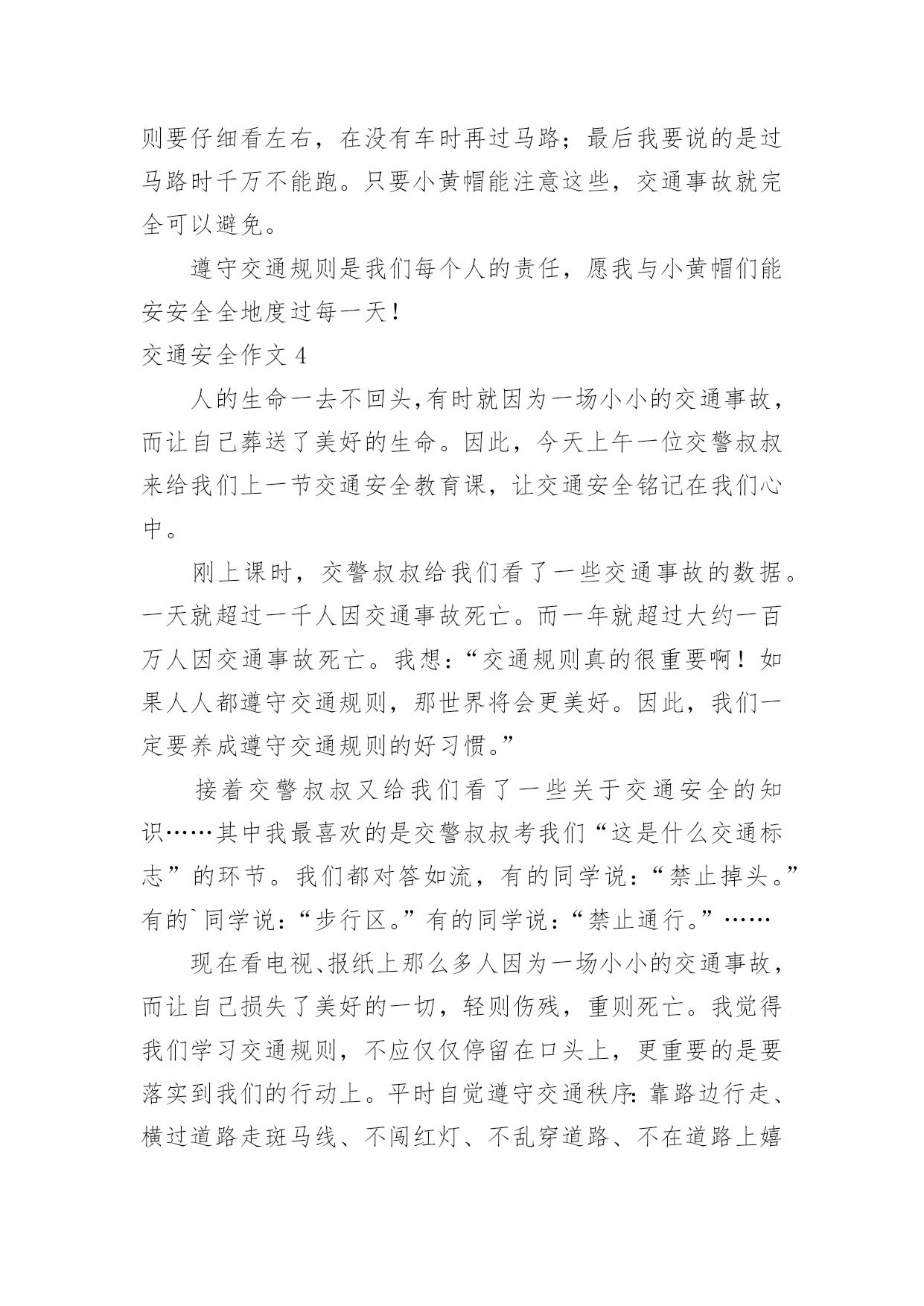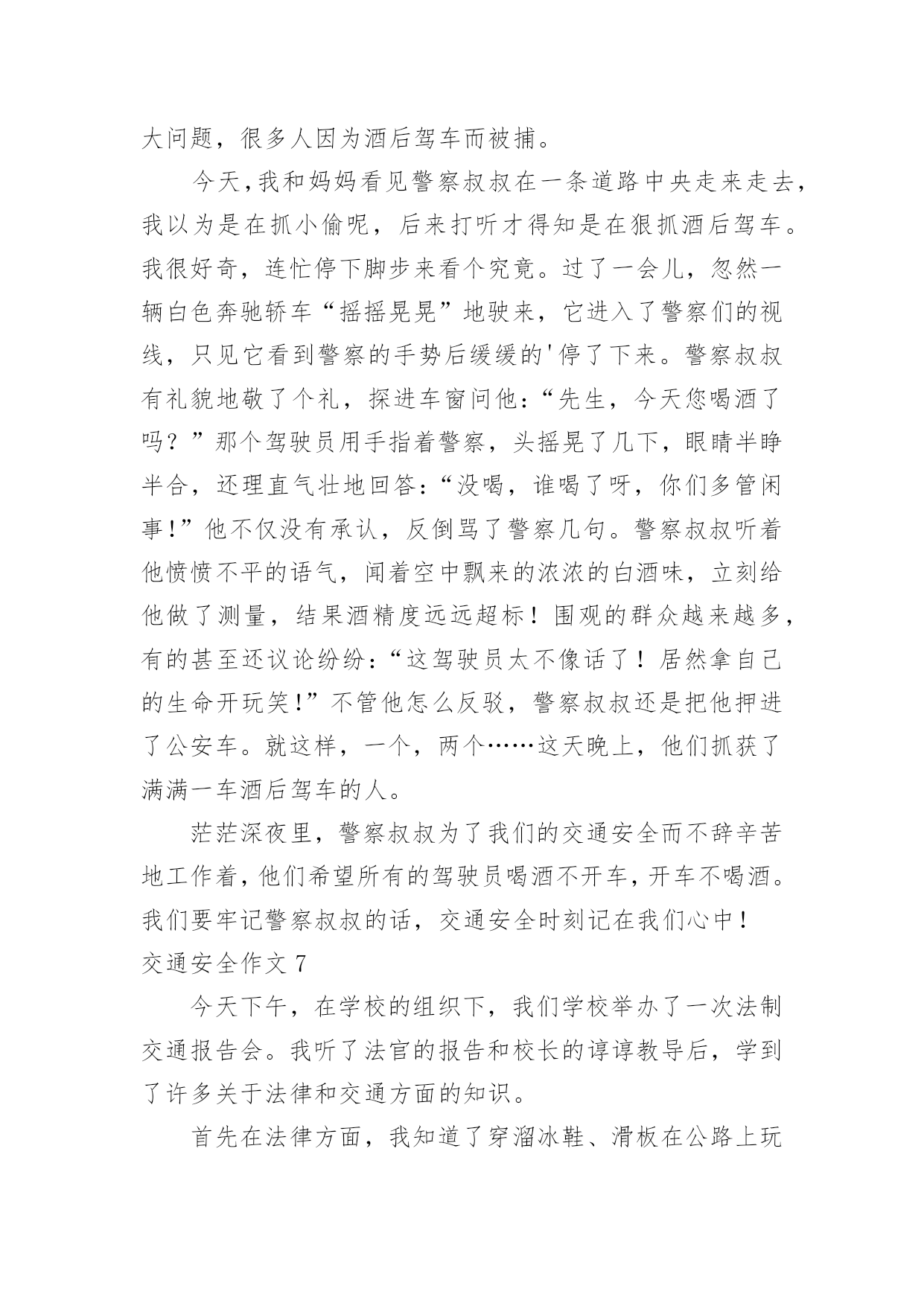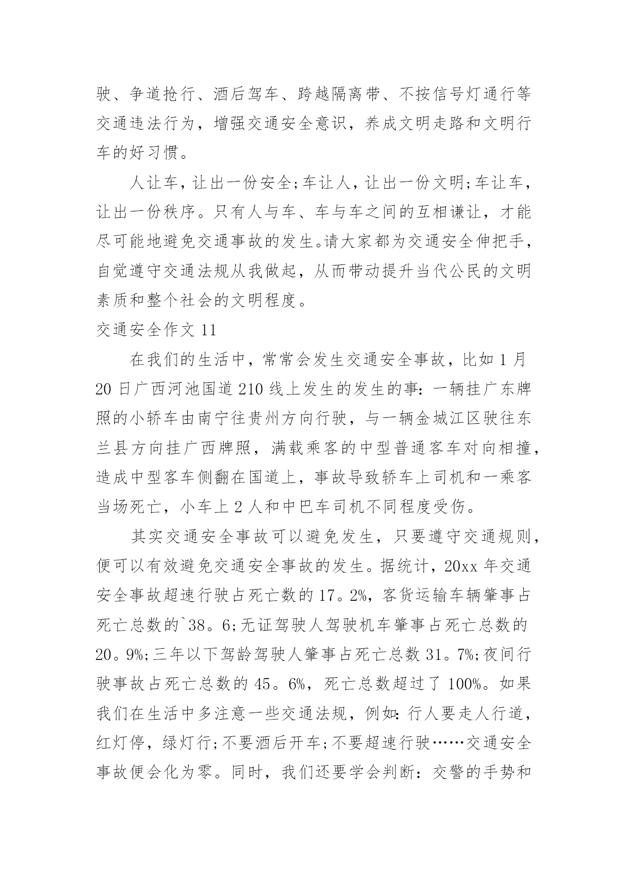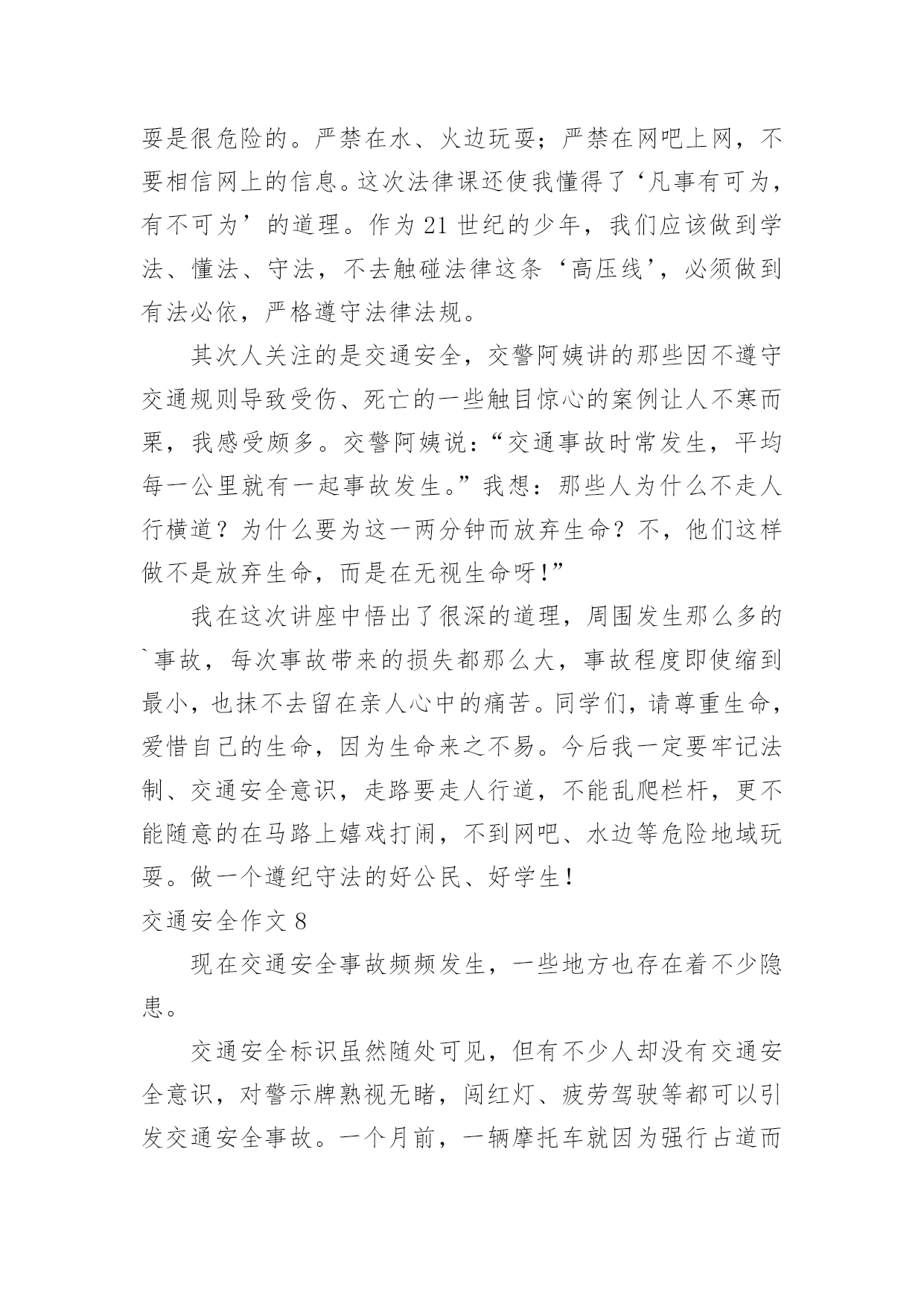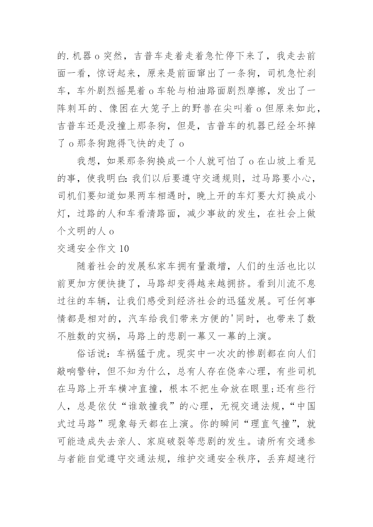 交通安全作文交通安全作文范例(15篇)在平凡的学习、工作、生活中,大家总少不了接触作文吧,借助作文人们可以实现文化交流的目的。怎么写作文才能避免踩雷呢?下面是小编精心整理的交通安全作文,仅供参考,希望能够帮助到大家。交通安全作文1大千世界,无奇不有。在这个偌大的生命摇篮里,每天都会有许许多多的生命诞生,每天都有人间奇迹问世。生命对于每个人来说,只有一次。珍惜生命我们应该从小事做起,遵守交通规则,把安全这根弦绷紧,才会避免许多令人扼腕的悲剧。作为少年儿童,我们应这样做:过马路走人横道,不乱穿马路,不在公路、铁轨边玩耍或追逐打闹……也许我们每个小朋友都知道这样做,但有的.做得还不好,特别是那些成人,那些坐骑的拥有者。马路上,汽车奔驰而过,惊心的一个急刹车,刺耳的冲撞声,抑或酿成车毁人亡的一幕,留下了多少叹息与悲伤呀!这使我不由得想起电视中见到一起事故。一位老大爷因家有乔迁之喜,拉着一大板车家具赶往新居。突然一辆大卡车飞奔过来,老大爷急如星火地横穿马路,一位警察看见了,他提高嗓门喊道:“快松开板车,趴下!”说时迟,那时快,一个箭步奔了过去,把老爷爷推到一旁,而自己却倒在血泊中……这样的惨祸真让人不堪回首。因此,我要向那些对身边的交通安全隐患视而不见的人们大声疾呼:珍惜生命吧!一定要遵守交通规则,让我们的生命之树永远绿意盎然。交通安全作文2关于交通安全问题,学校很是重视,不止一遍的强调,不让同学们骑电动车上学,不逆行,不闯红灯……学校为此,以前还让我们写过保证书。每年因为电动车所出的安全事故已经不在少数,而且不仅仅是电动车,三轮,四轮也占较大的比例,可是很多同学却依旧不把安全放在心上。前不久规定的四轮电动车必须上牌照才能上路后,昨天各个工作群,小区群又发了通知,所有两轮电动车也必须上牌照,车主要佩戴头盔才可以上路。是有点突然,但是这毕竟是为了大家的安全。继续说交通安全问题,下午的班会就是关于此主题。谢老师让我们观看了两个关于电动车事故的'视频,视频中,许多电动车因为停放在楼道里面,私拉电线充电等问题而引起了失火甚至爆炸。还有一些电动车,因为雨天路滑,车速太快而导致了撞车、滑倒等事故。总觉得危险离我们很远,骑电动车很安全,不会发生交通事故,然而实际上呢?往往这些危险就在我们身边,但自己却浑然不知。有多少人因为大意、不上心而失去了生命,交通安全对我们青少年来说是十分重要的,我们每个人都要重视起来,我们要做到的就是以后不再骑电动车,不逆行,不闯红灯,尽量步行上学。每个人的生命只有一次,需要我们好好珍惜,不能因为我们的疏忽大意而酿成大错!交通安全作文3交通安全是我们每个人生命安全的保障。然而对于儿童来说懂得交通法规很重要,因为他们年龄小,交通常识知道的不多,所以儿童与交通的关系是紧密相连的'。至于幼儿园的孩子们通常都是由大人领着,因此交通问题主要就出现在这些可爱的小黄帽身上。小黄帽通常都是自己上下学。许多学校的校门邻街,无论是大马路还是小马路都存在交通隐患的问题,再加上小黄帽打打闹闹、说说笑笑、蹦蹦跳跳……咣!一不溜神儿丧命于车下!这可不是说着玩的,每年不都有报道小学生出车祸的吗?交通安全十分重要,每个小黄帽都应该有交通安全意识。首先学生放学出校门时应该左右看一看,没有车时再过马路;其次过马路要走斑马线;第三要注意你走路的附近是否有交叉路口,要注意你看不到的可能正在拐弯的车辆,所以最好是在交叉口处过马路;第四要遵守红绿灯信号,不仅要遵守“红灯停,绿灯行,黄灯注意看分明,同时还要遵守新的交通法规,即黄灯也不能走;第五如果十字路口没有红绿灯,则要仔细看左右,在没有车时再过马路;最后我要说的是过马路时千万不能跑。只要小黄帽能注意这些,交通事故就完全可以避免。遵守交通规则是我们每个人的责任,愿我与小黄帽们能安安全全地度过每一天!交通安全作文4人的生命一去不回头,有时就因为一场小小的交通事故,而让自己葬送了美好的生命。因此,今天上午一位交警叔叔来给我们上一节交通安全教育课,让交通安全铭记在我们心中。刚上课时,交警叔叔给我们看了一些交通事故的数据。一天就超过一千人因交通事故死亡。而一年就超过大约一百万人因交通事故死亡。我想:“交通规则真的很重要啊!如果人人都遵守交通规则,那世界将会更美好。因此,我们一定要养成遵守交通规则的好习惯。”接着交警叔叔又给我们看了一些关于交通安全的知识……其中我最喜欢的是交警叔叔考我们“这是什么交通标志”的环节。我们都对答如流,有的同学说:“禁止掉头。”有的`同学说:“步行区。”有的同学说:“禁止通行。”……现在看电视、报纸上那么多人因为一场小小的交通事故,而让自己损失了美好的一切,轻则伤残,重则死亡。我觉得我们学习交通规则,不应仅仅停留在口头上,更重要的是要落实到我们的行动上。平时自觉遵守交通秩序:靠路边行走、横过道路走斑