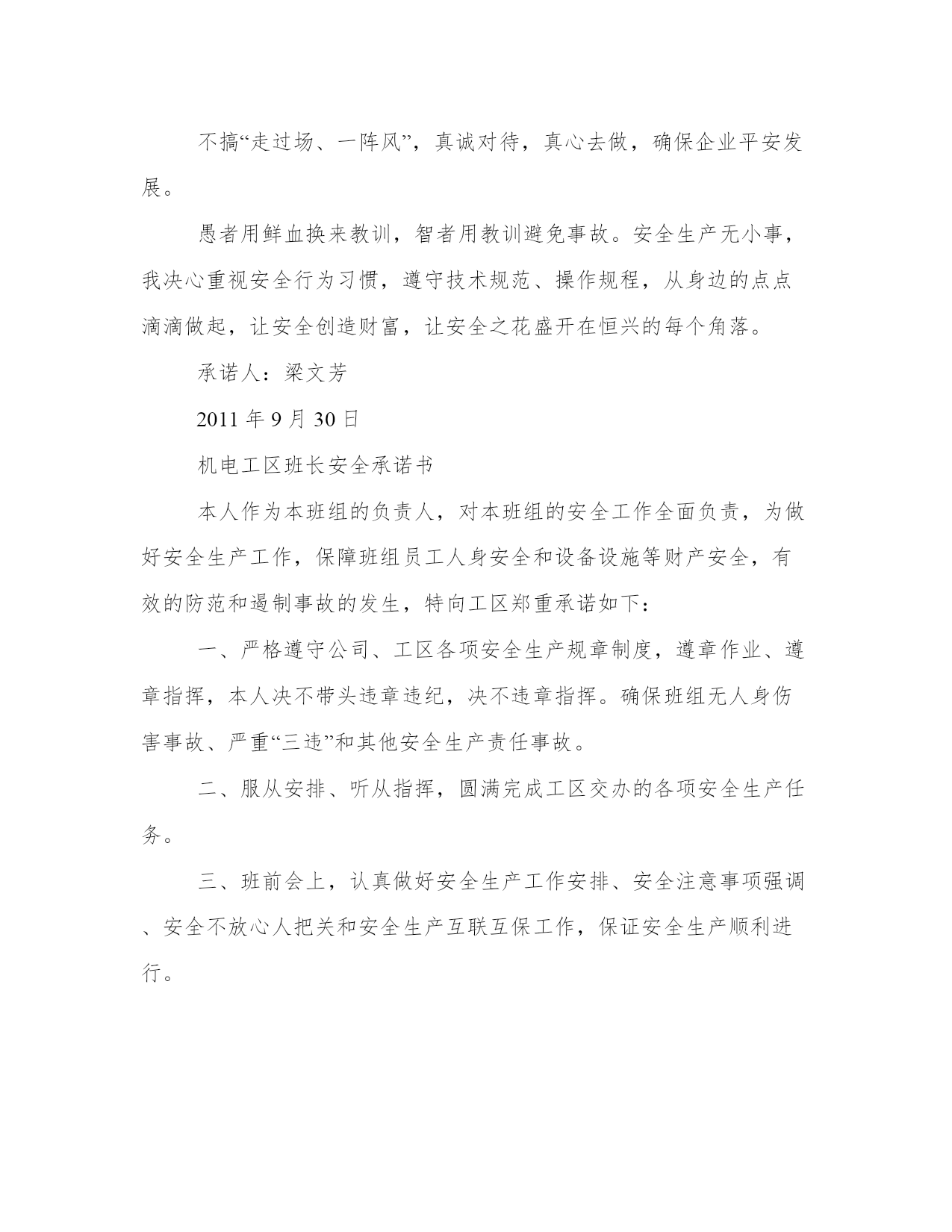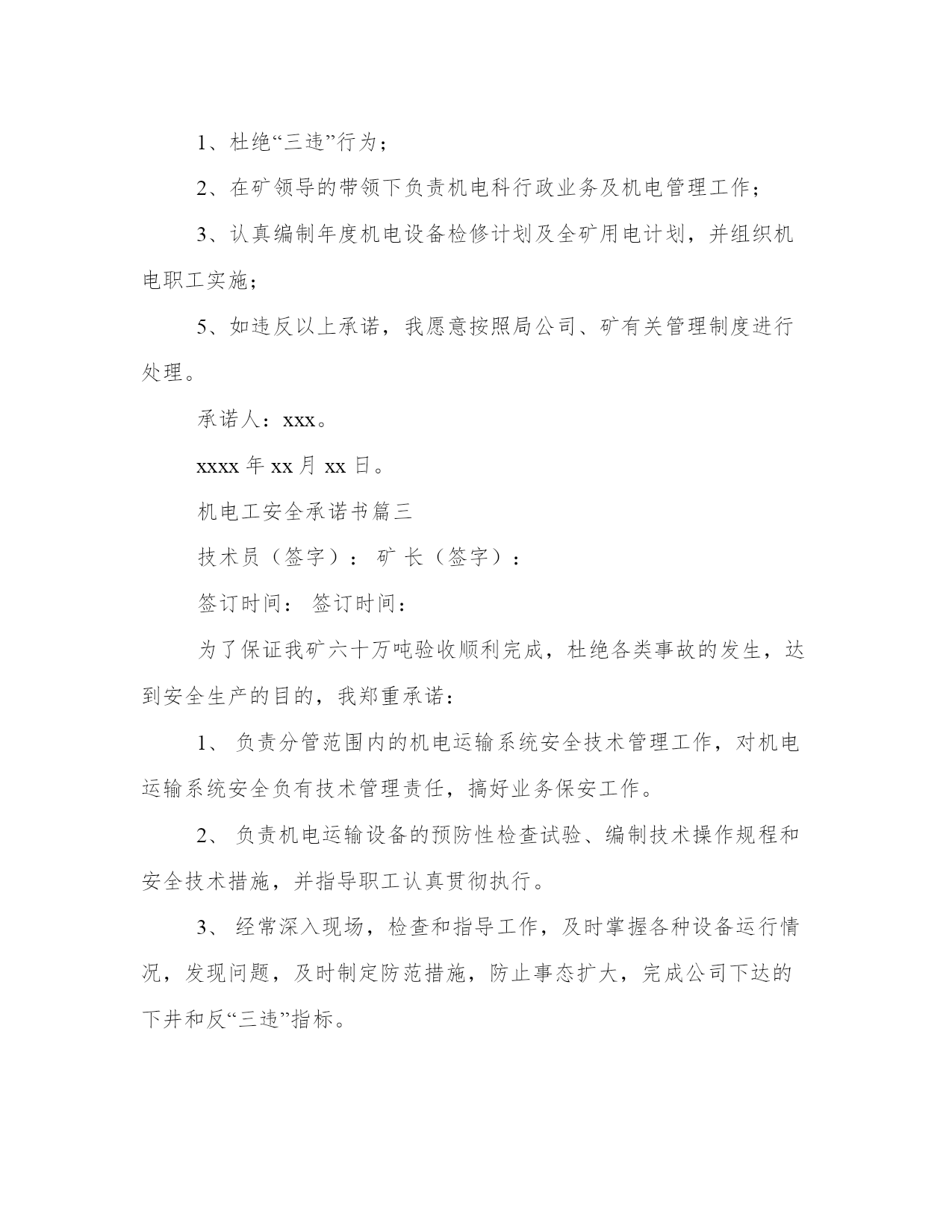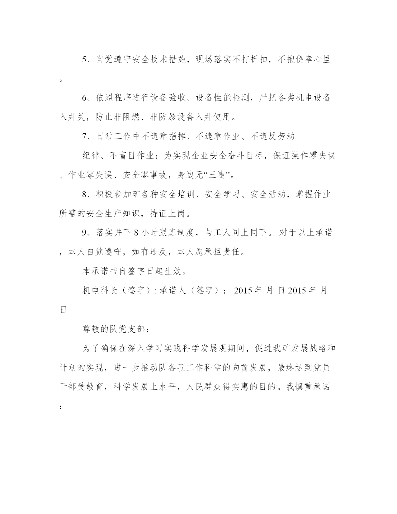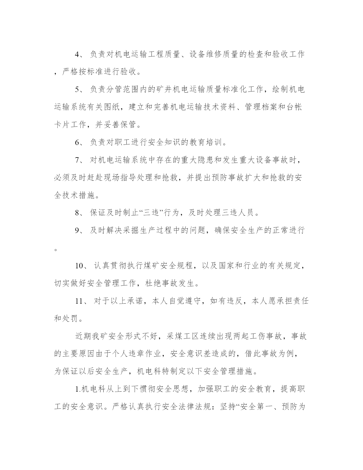 最新机电工安全承诺书(汇总8篇)在日常学习、工作或生活中,大家总少不了接触作文或者范文吧,通过文章可以把我们那些零零散散的思想,聚集在一块。范文怎么写才能发挥它最大的作用呢?这里我整理了一些优秀的范文,希望对大家有所帮助,下面我们就来了解一下吧。机电工安全承诺书篇一在国家安全监管总局颁布煤矿矿长保护矿工生命安全七条规定之际,我们要坚持“安全第一,预防为主,综合治理”的安全生产方针,积极营造“科学发展、安全发展”的浓厚安全生产氛围,促进我矿安全生产形势持续稳定发展。为做好安全生产工作的责任感和自觉性,我郑重承诺在以后的工作中将做到以下几点:1、自觉履行岗位安全责任,严格遵守国家法律、法规和公司的各项安全规章制度。2、使用中的机电设备必须符合国家相关规定,不使用淘汰设备。3、加强井下机电和所有提升设备维护保养及检修工作,确保井下机电和所有提升设备台台完好,安全可靠。4、做好本队机电、运输的安全管理工作,督促机电、运输质量标准化,组织机电和提升运输隐患排查治理工作,发现隐患及时处理,做到不安全不运行。5、自觉遵守安全技术措施,现场落实不打折扣,不抱侥幸心里。6、依照程序进行设备验收、设备性能检测,严把各类机电设备入井关,防止非阻燃、非防暴设备入井使用。7、日常工作中不违章指挥、不违章作业、不违反劳动纪律、不盲目作业;为实现企业安全奋斗目标,保证操作零失误、作业零失误、安全零事故,身边无“三违”。8、积极参加矿各种安全培训、安全学习、安全活动,掌握作业所需的安全生产知识,持证上岗。9、落实井下8小时跟班制度,与工人同上同下。对于以上承诺,本人自觉遵守,如有违反,本人愿承担责任。本承诺书自签字日起生效。机电科长(签字):承诺人(签字):2015年月日2015年月日尊敬的队党支部:为了确保在深入学习实践科学发展观期间,促进我矿发展战略和计划的实现,进一步推动队各项工作科学的向前发展,最终达到党员干部受教育,科学发展上水平,人民群众得实惠的目的。我慎重承诺:1、认真贯彻执行党的安全第一方针、政策和有关法律、法规,认真深入的学习科学发展观理论知识,用科学发展观彻底洗脑,在队长的统一领导下,全面负责好机电设备安全运行及检查、检修工作。2、严格执行矿及本队学习实践活动领导小组指定的规定动作,并积极地去开展自选动作;抓好设备管理制度的贯彻落实,杜绝违章作业。3、理论联系实际,经常深入生产一线,了解掌握现场情况,调查影响生产的瓶颈问题并同相关领导分析解决的`方案、措施,及时督促解决突出的问题。4、在跟值班时,全面负责本队机电设备的安全运行,组织开好班前会,坚持班前安全预想,及时协调解决好设备存在的重大隐患及生产过程中的电器设备故障,做好动态隐患的处理,做到不安全不生产。5、积极参加矿上和队上组织的学习、宣传活动、专题辅导报告等;协助其他队干组织机电各工种的学习、培训工作。6、工作中以身作则,遵章守纪,做到模范作用。党支部:承诺人:机电工安全承诺书篇二矿长:我是东笋煤矿机电科主办,在20xx年安全生产工作中,我作出以下承诺:1、杜绝“三违”行为;2、在矿领导的带领下负责机电科行政业务及机电管理工作;3、认真编制年度机电设备检修计划及全矿用电计划,并组织机电职工实施;5、如违反以上承诺,我愿意按照局公司、矿有关管理制度进行处理。承诺人:xxx。xxxx年xx月xx日。机电工安全承诺书篇三技术员(签字):矿长(签字):签订时间:签订时间:为了保证我矿六十万吨验收顺利完成,杜绝各类事故的发生,达到安全生产的目的,我郑重承诺:1、负责分管范围内的机电运输系统安全技术管理工作,对机电运输系统安全负有技术管理责任,搞好业务保安工作。2、负责机电运输设备的预防性检查试验、编制技术操作规程和安全技术措施,并指导职工认真贯彻执行。3、经常深入现场,检查和指导工作,及时掌握各种设备运行情况,发现问题,及时制定防范措施,防止事态扩大,完成公司下达的下井和反“三违”指标。4、负责对机电运输工程质量、设备维修质量的检查和验收工作,严格按标准进行验收。5、负责分管范围内的矿井机电运输质量标准化工作,绘制机电运输系统有关图纸,建立和完善机电运输技术资料、管理档案和台帐卡片工作,并妥善保管。6、负责对职工进行安全知识的教育培训。7、对机电运输系统中存在的重大隐患和发生重大设备事故时,必须及时赶赴现场指导处理和抢救,并提出预防事故扩大和抢救的安全技术措施。8、保证及时制止“三违”行为,及时处理三违人员。9、及时解决采掘生产过程中的问题,确保安全生产的正常进行。10、认真贯彻执行煤矿安全规程,以及国家和行业的有关规定,切实做好安全管理工作,杜绝事故发生。11、对于以上承诺,本人自觉遵守,如有
